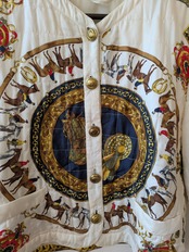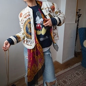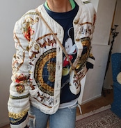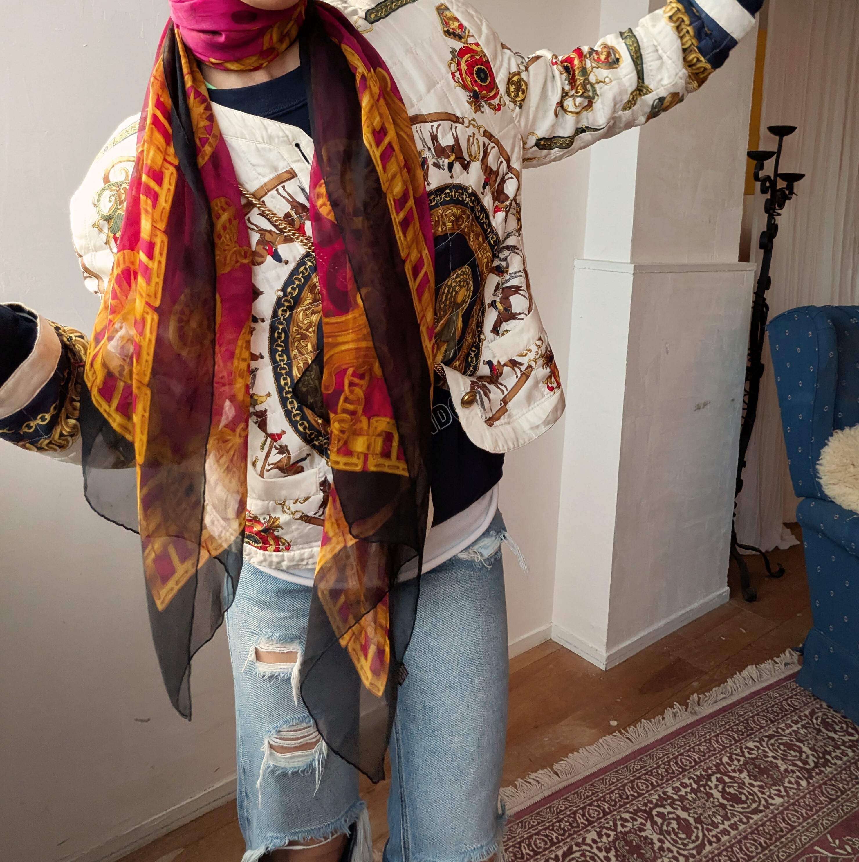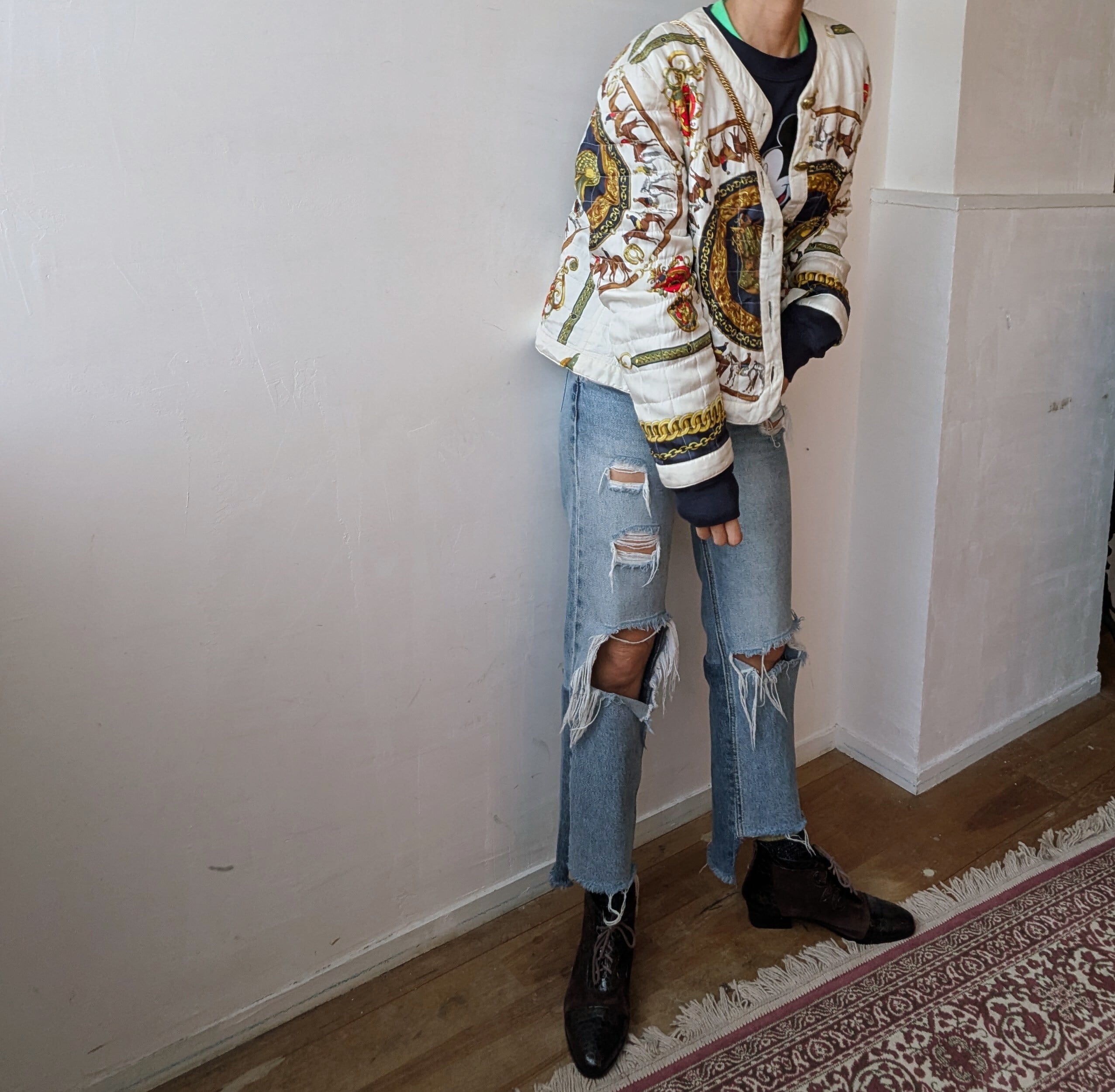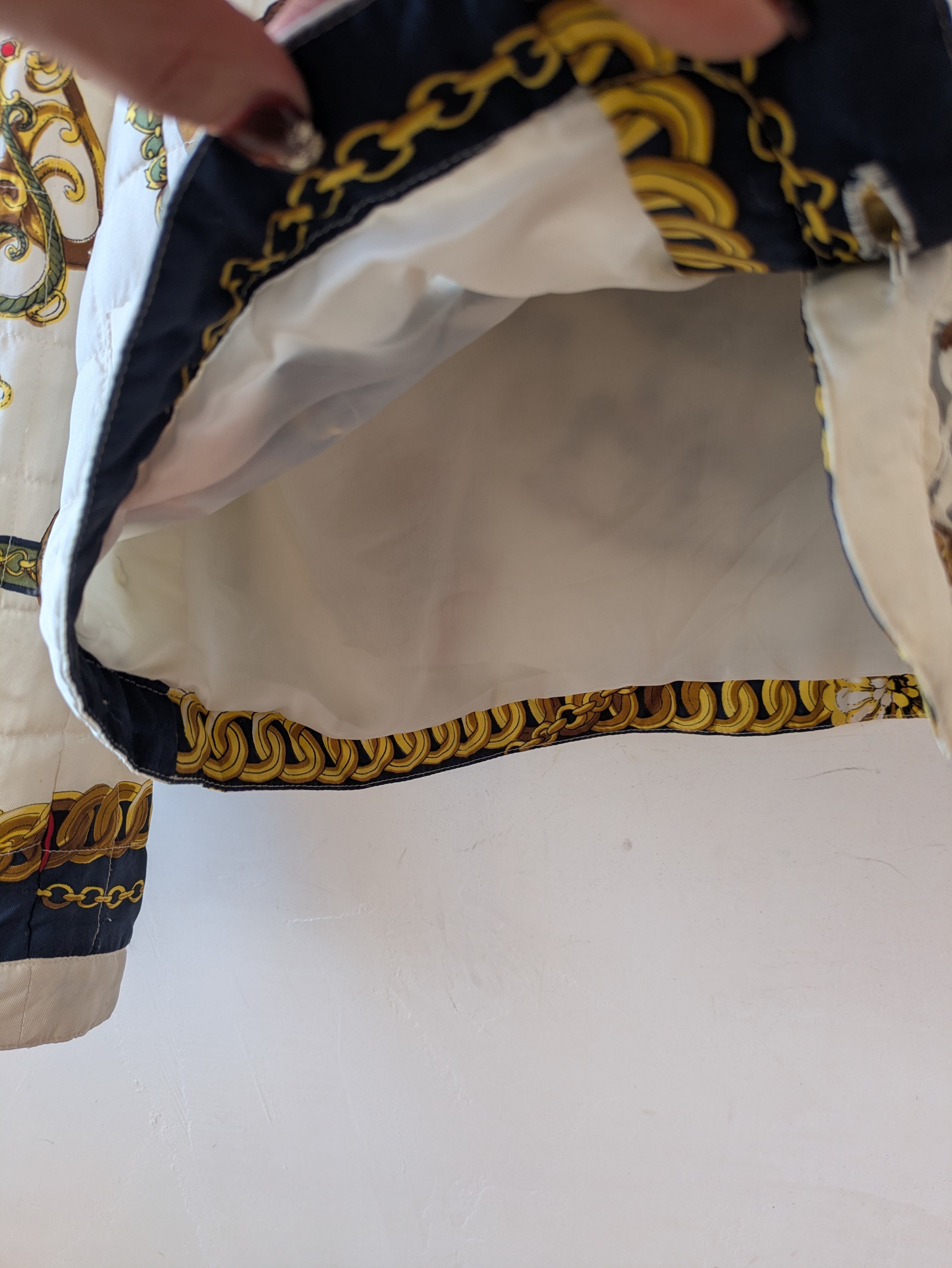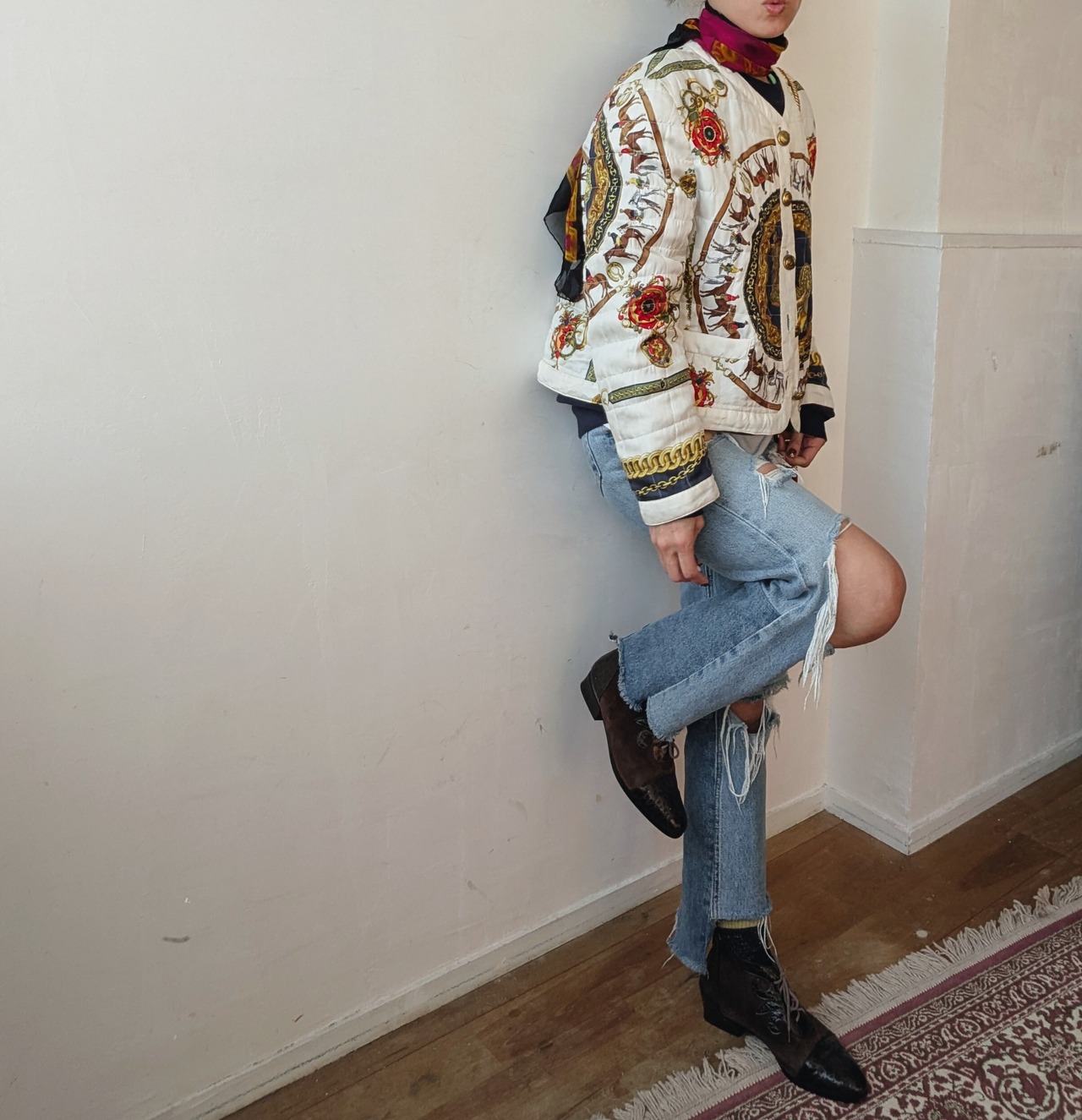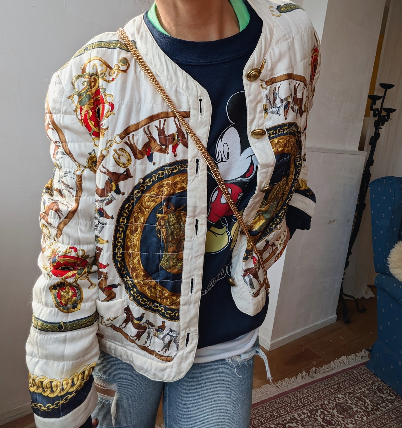 レトロなスカーフデザインが素敵なライトキルティングジャケット。