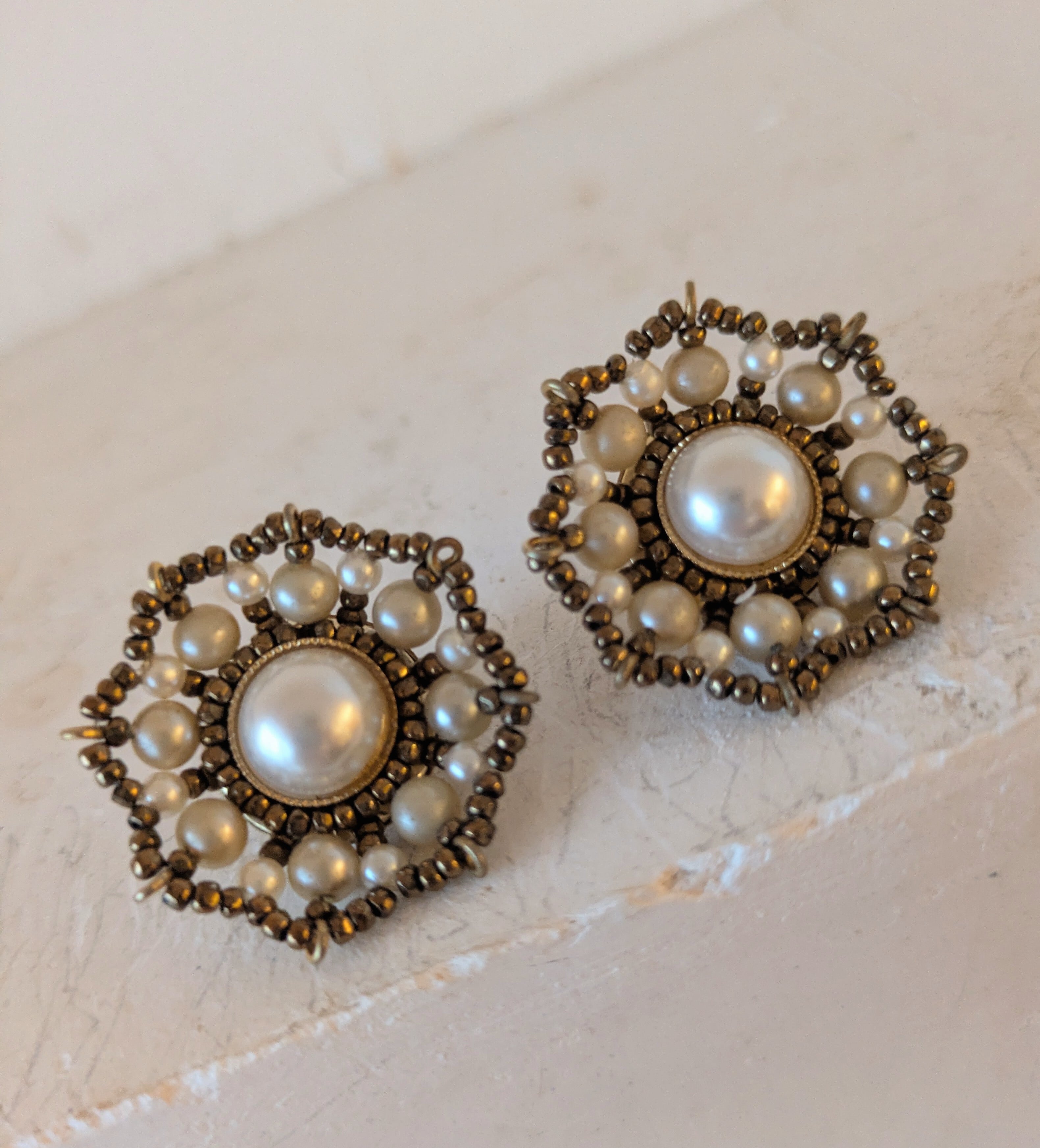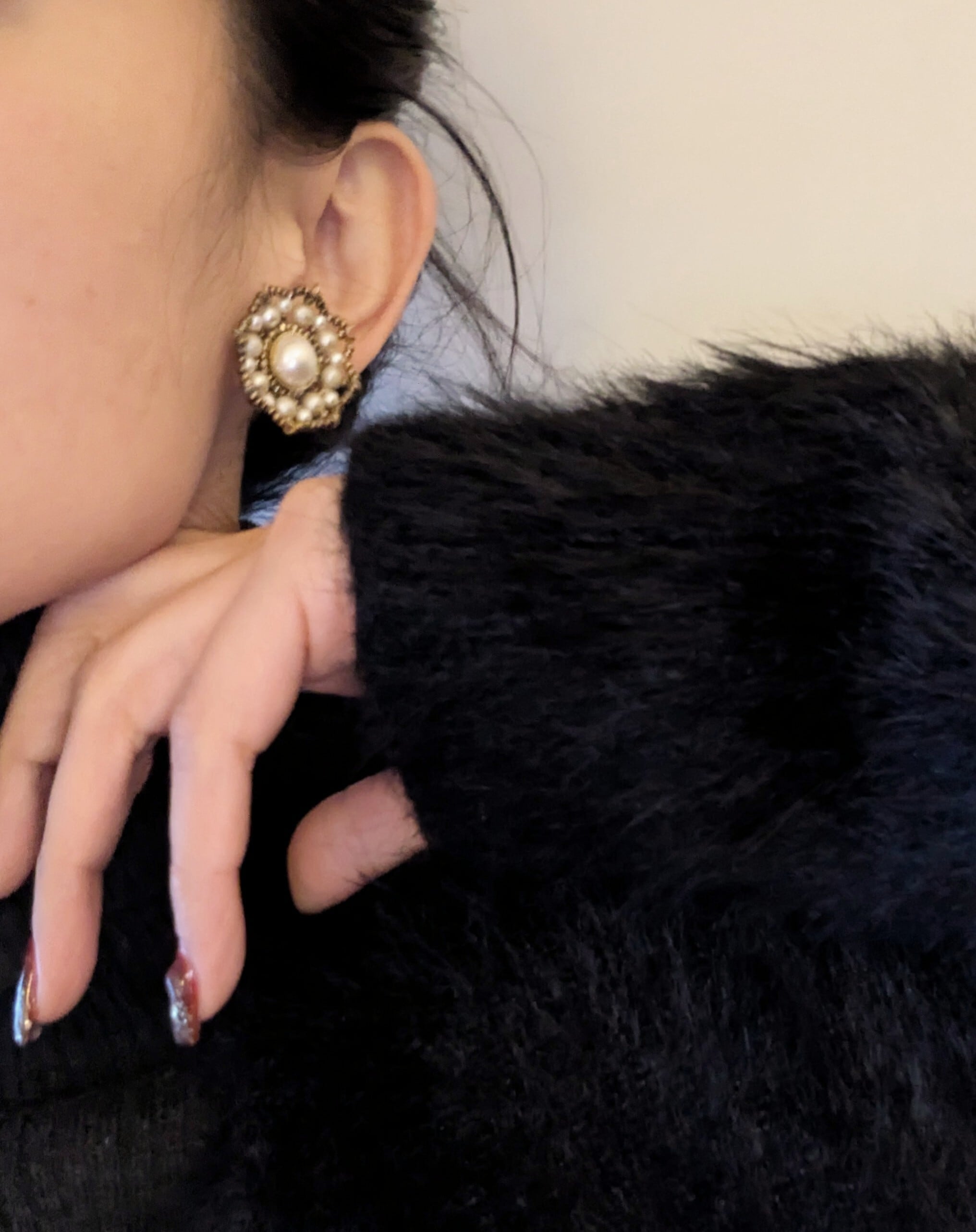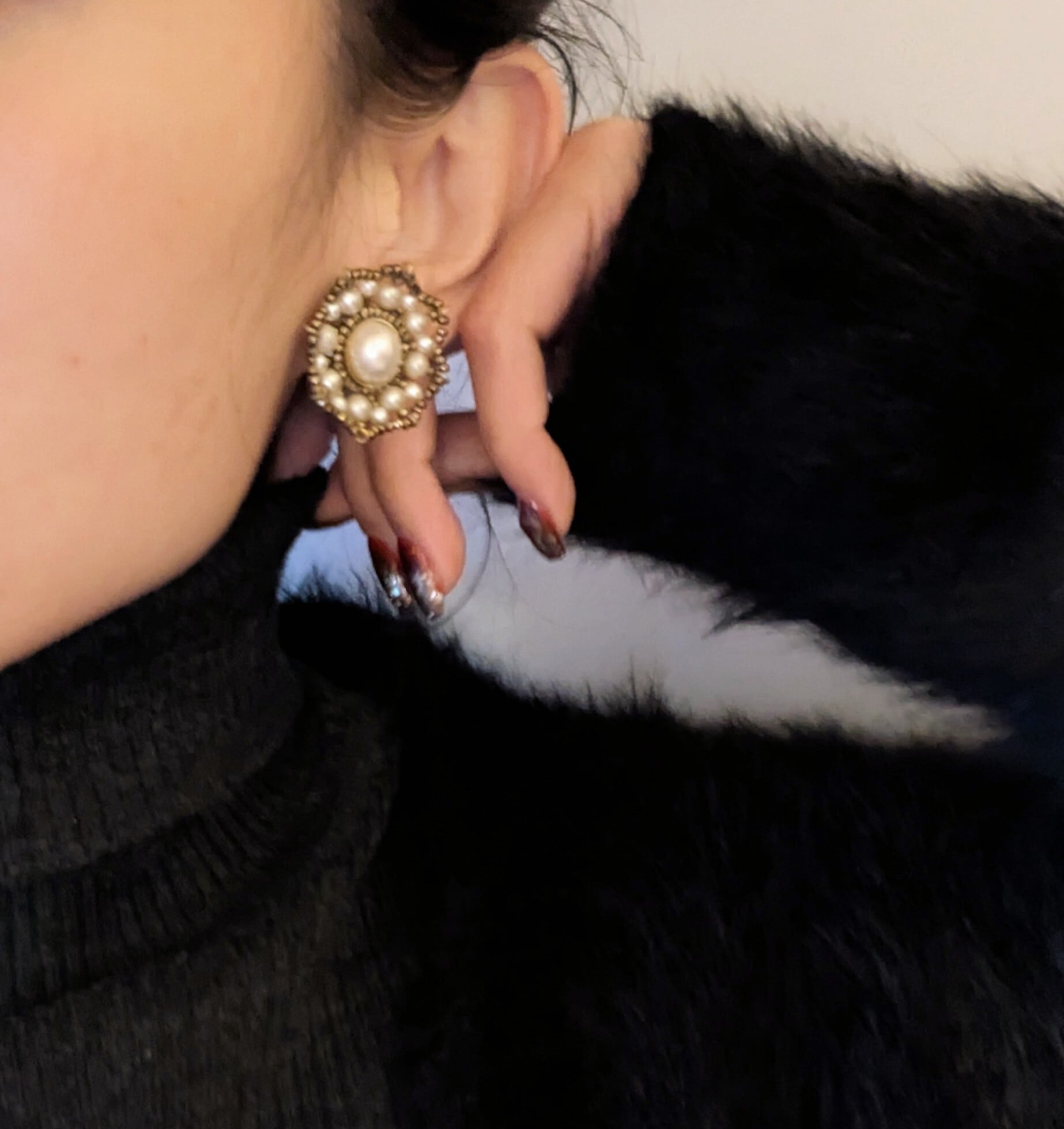 エレガントな雰囲気を醸し出すヴィンテージパールとビーズのイヤリングです。繊細なデザインで、ビーズの輝きが耳元を華やかに演出してくれます。カジュアルな装いや、普段使いにはもちろん、特別な日のコーディネートにもぴったりです。