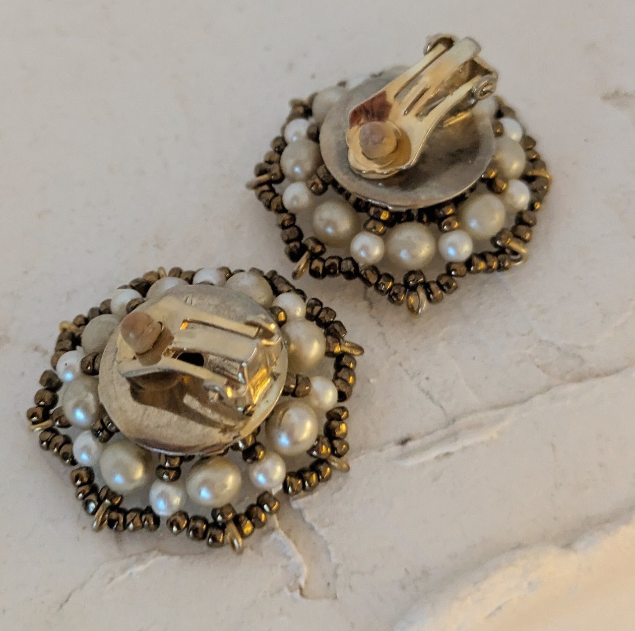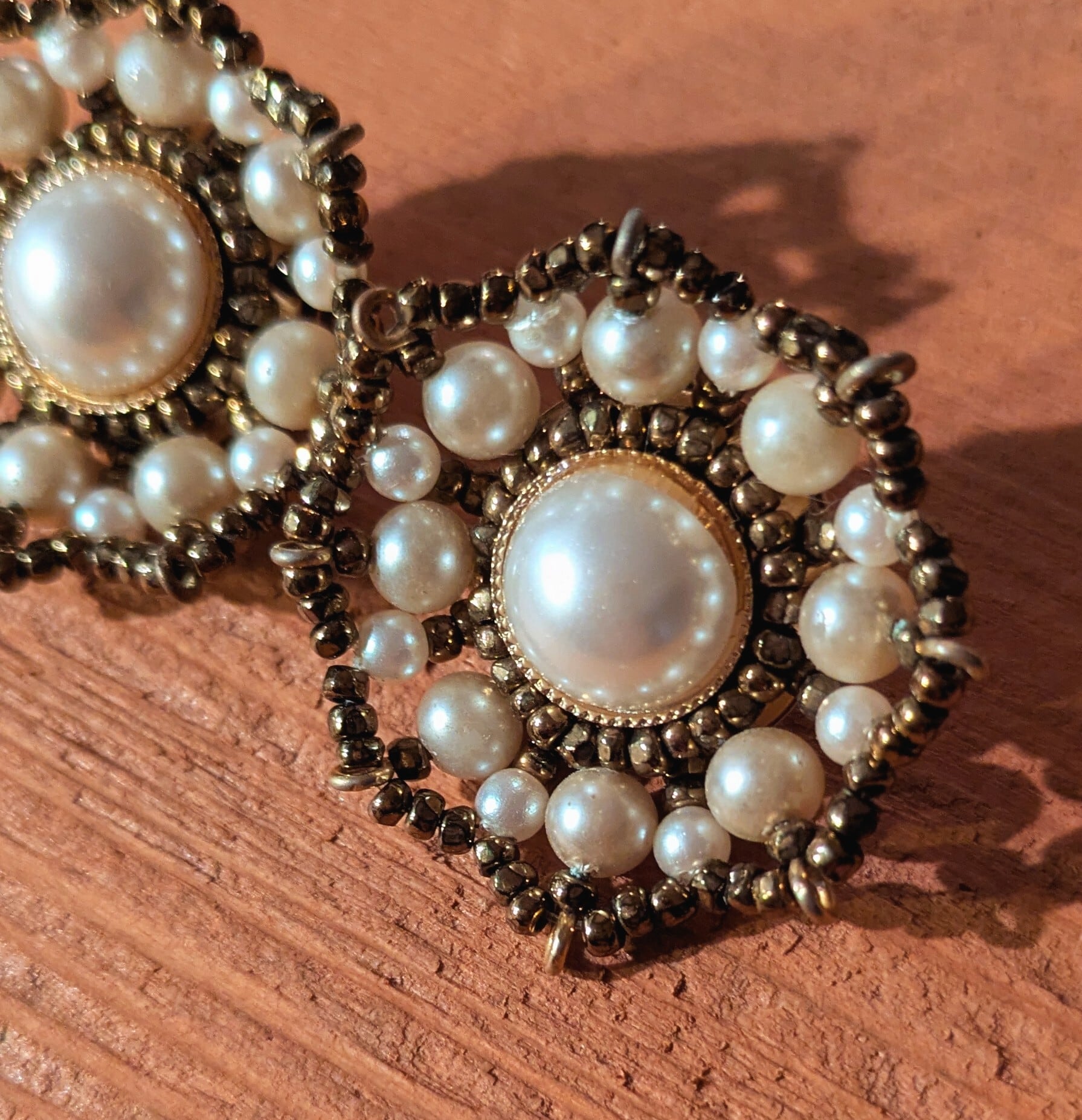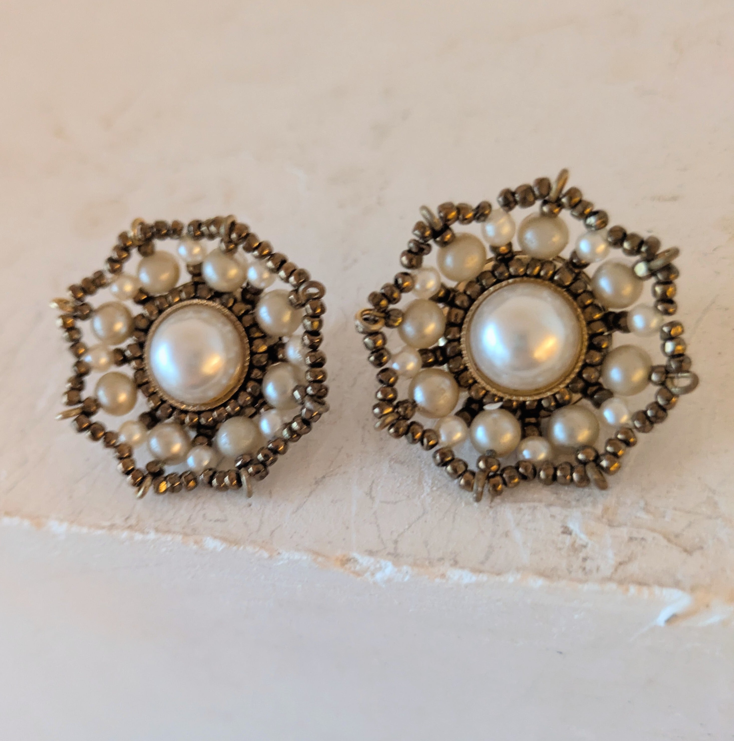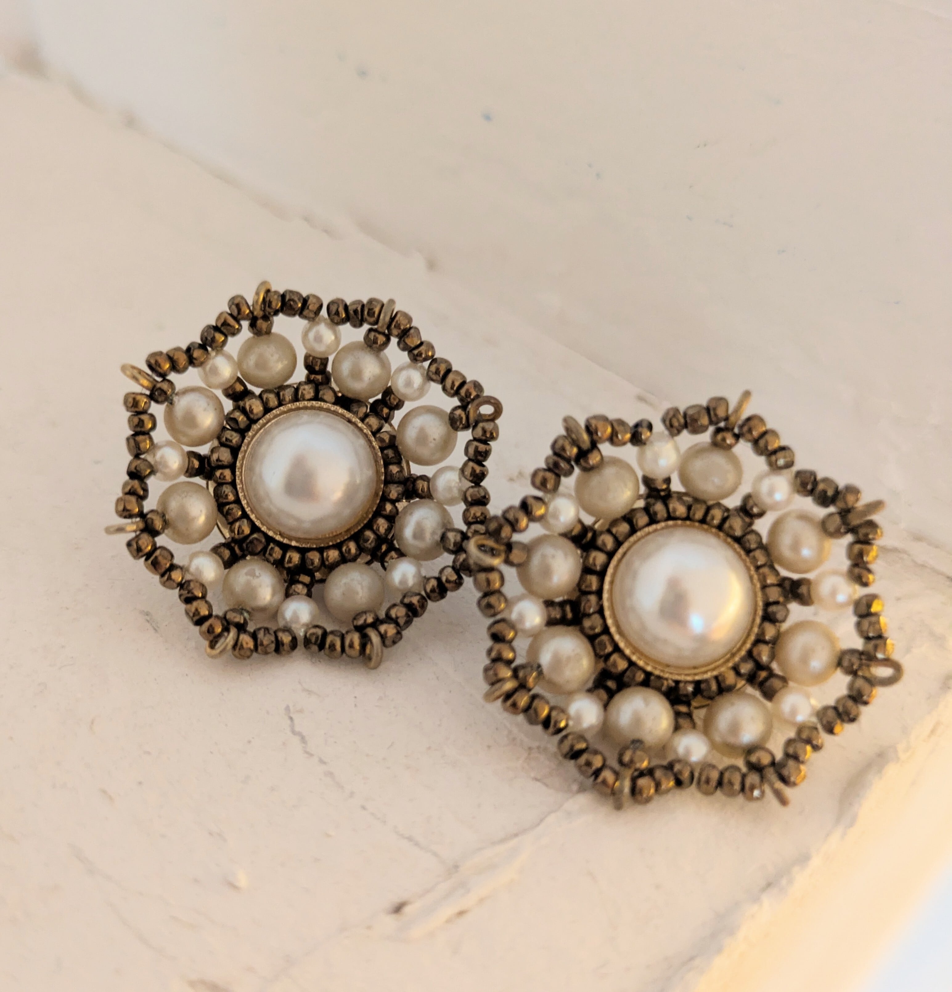 エレガントな雰囲気を醸し出すヴィンテージパールとビーズのイヤリングです。繊細なデザインで、ビーズの輝きが耳元を華やかに演出してくれます。カジュアルな装いや、普段使いにはもちろん、特別な日のコーディネートにもぴったりです。