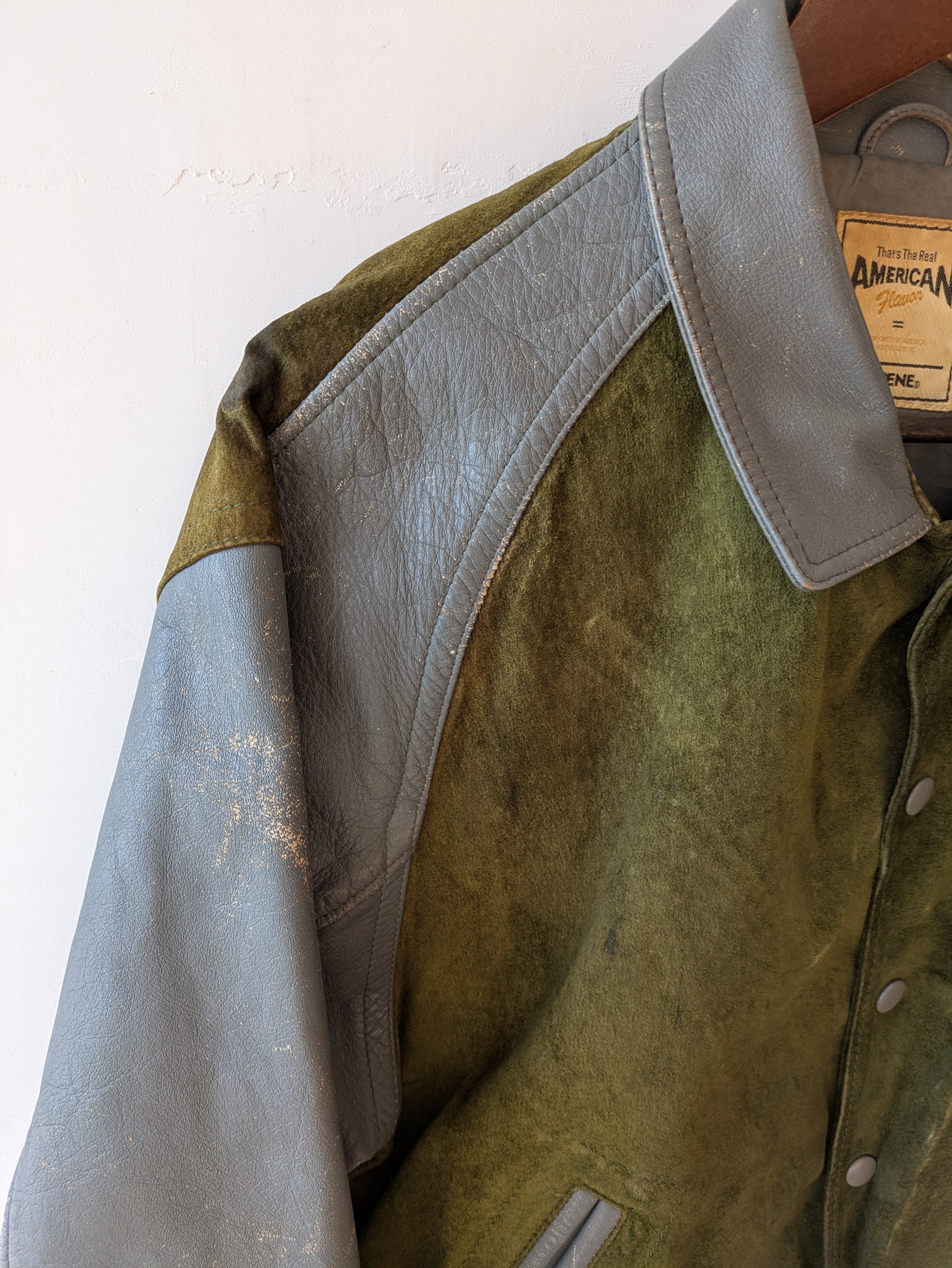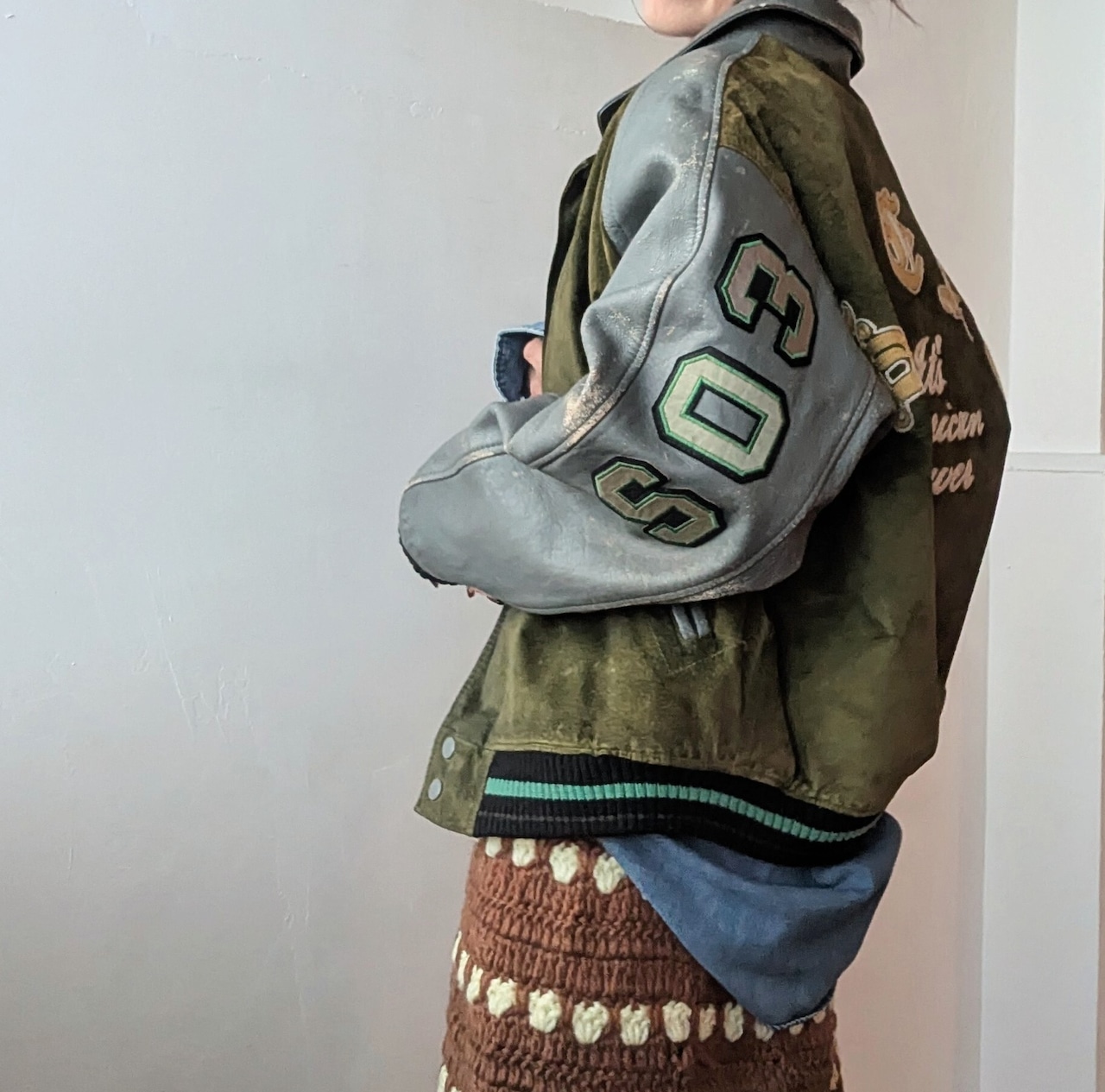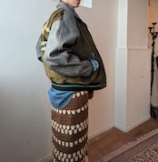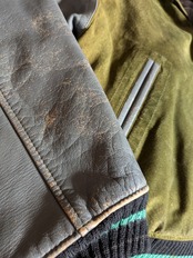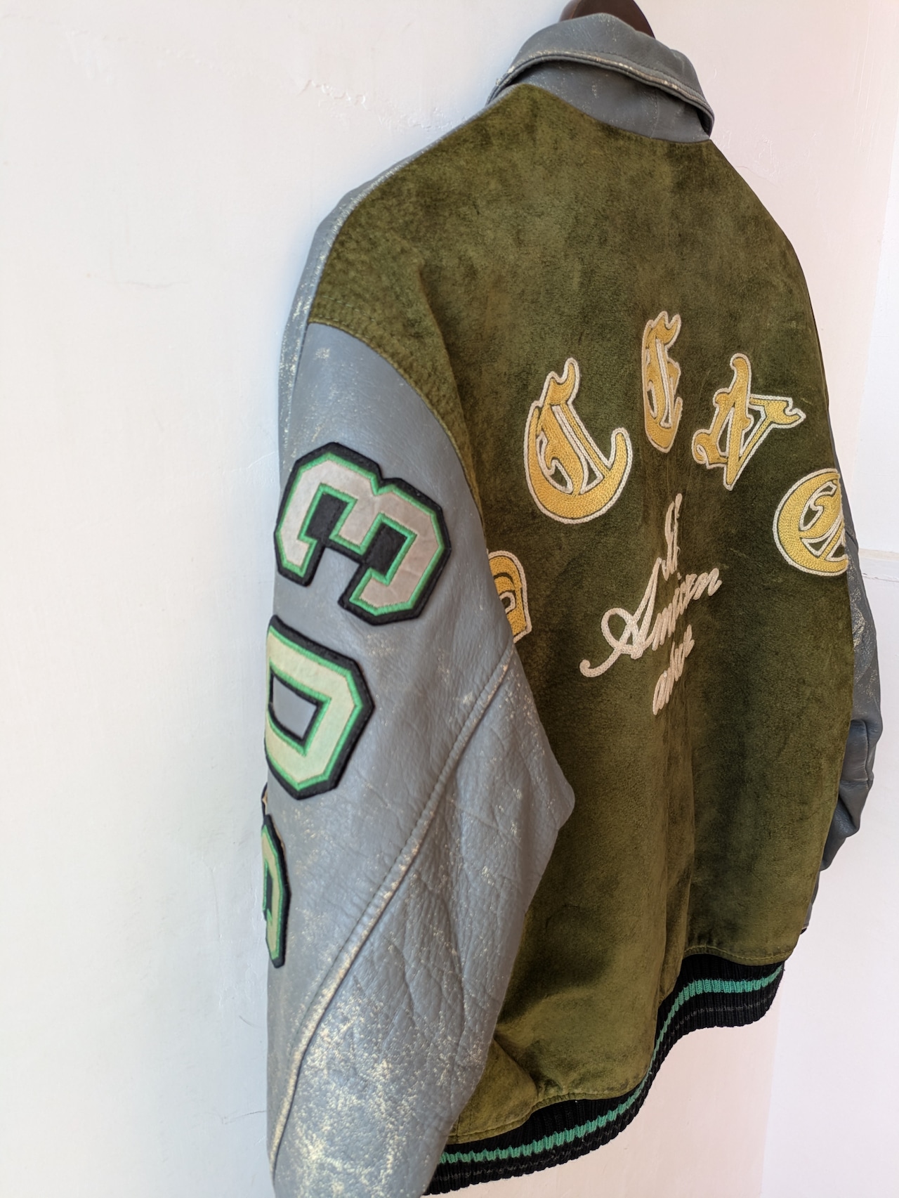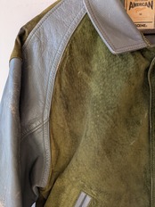 カーキ×ブルーグレーカラーの組み合わせ、大きめのワッペン、2種類のレザーの切り返しデザインや、vintageならではダメージが唯一無二のかっこよさ!のスタジアムジャンパー。