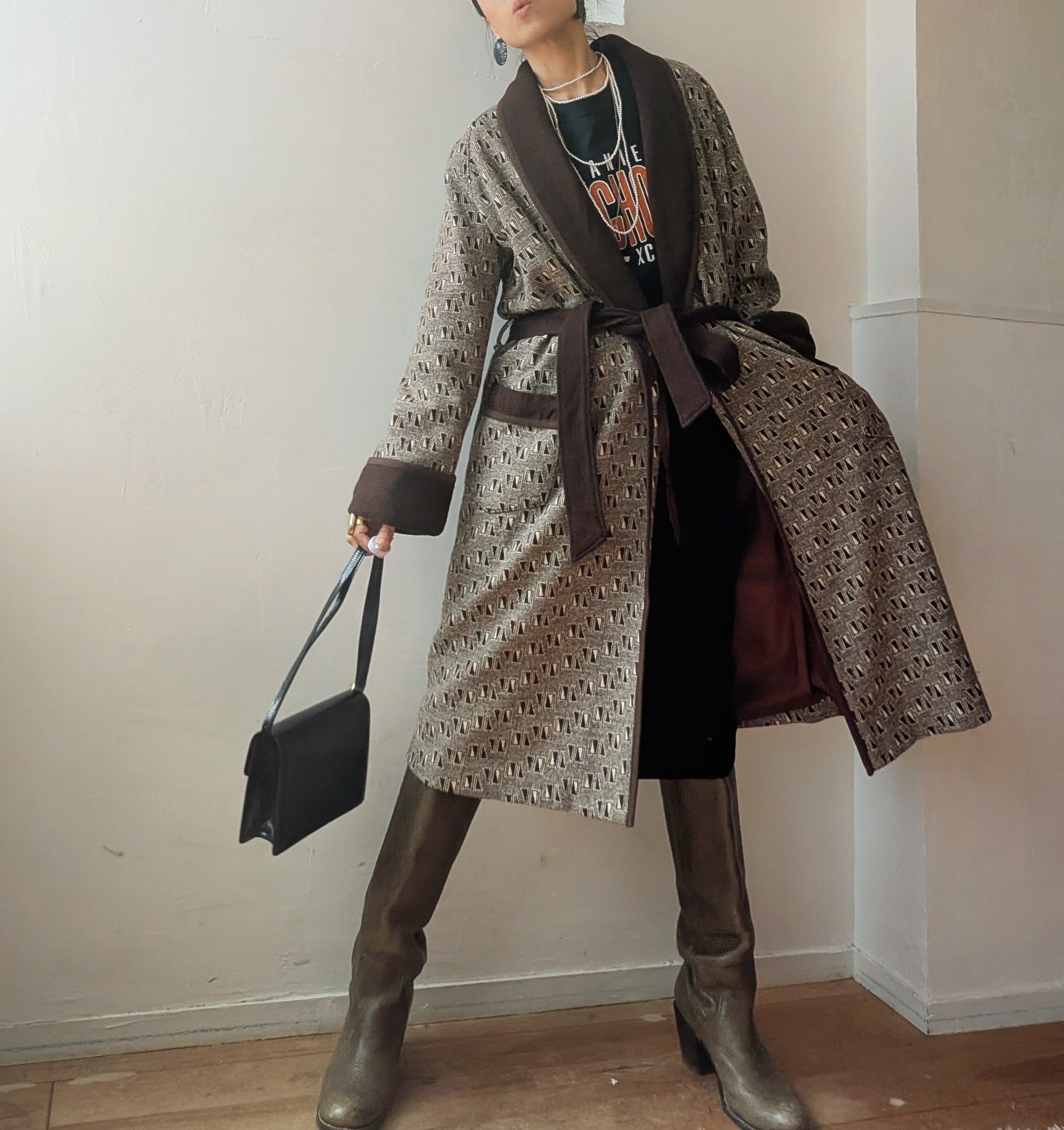 80年代のクラシックなデザインが魅力のウールガウンコートです。柔らかで温かみのあるウール素材を使用し、寒い季節でも快適に過ごせます。シンプルながらも洗練されたシルエットが、どんなスタイルにも合わせやすく、