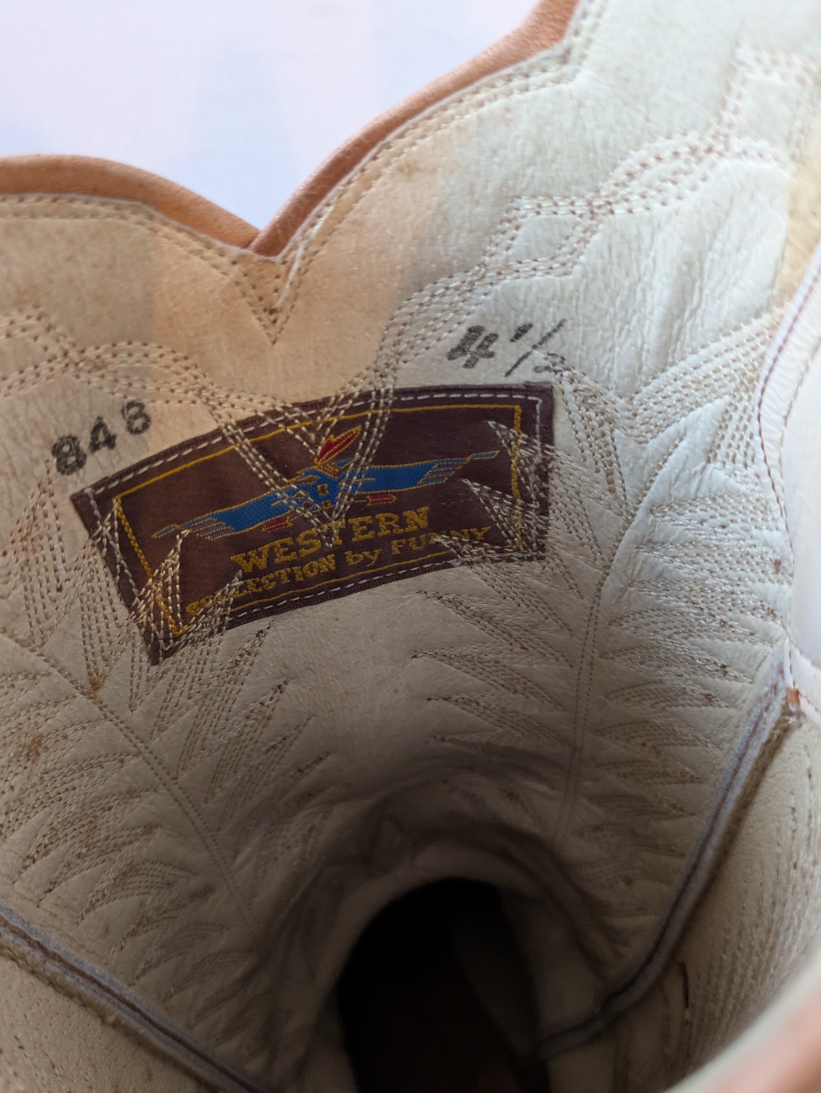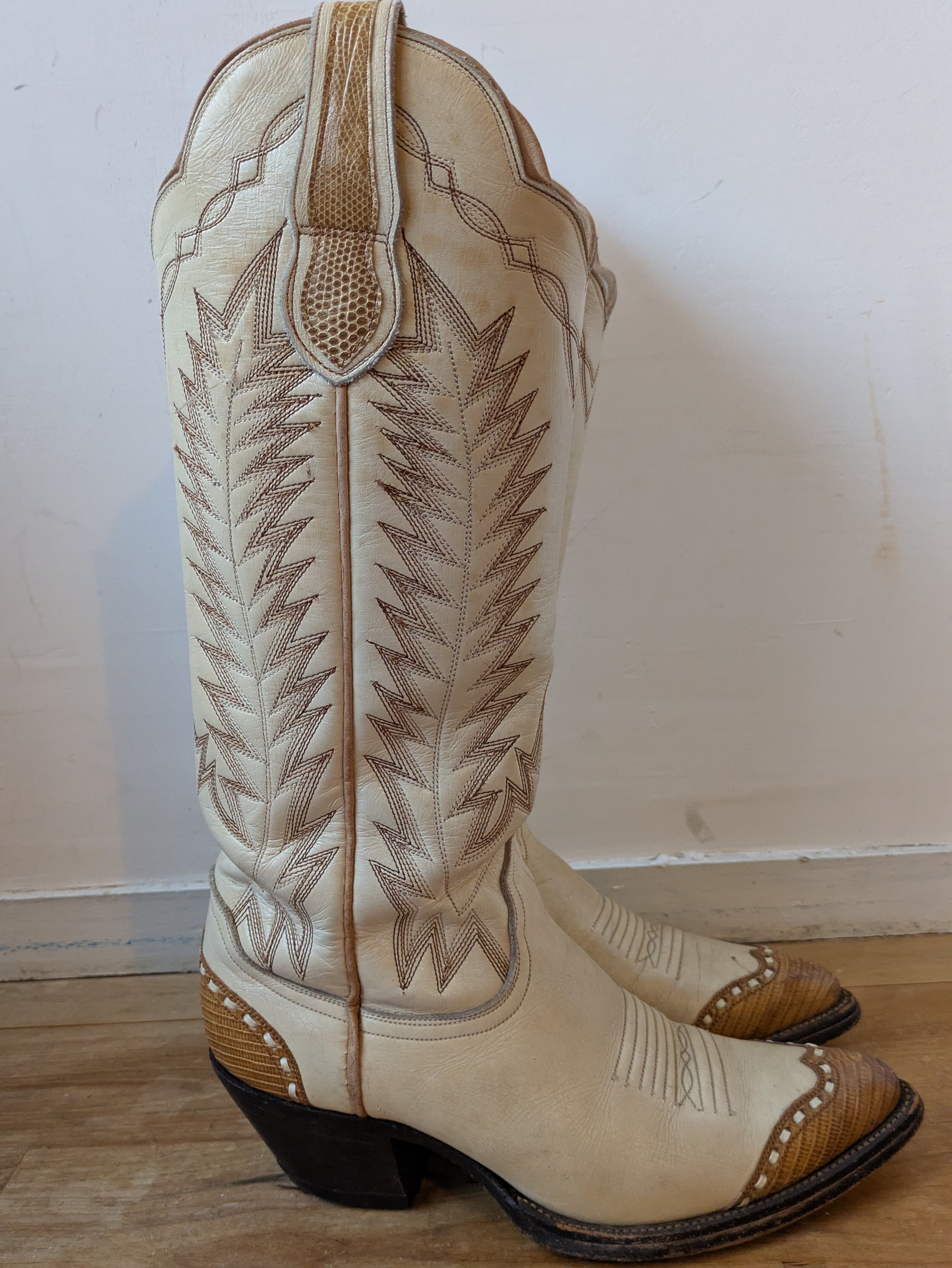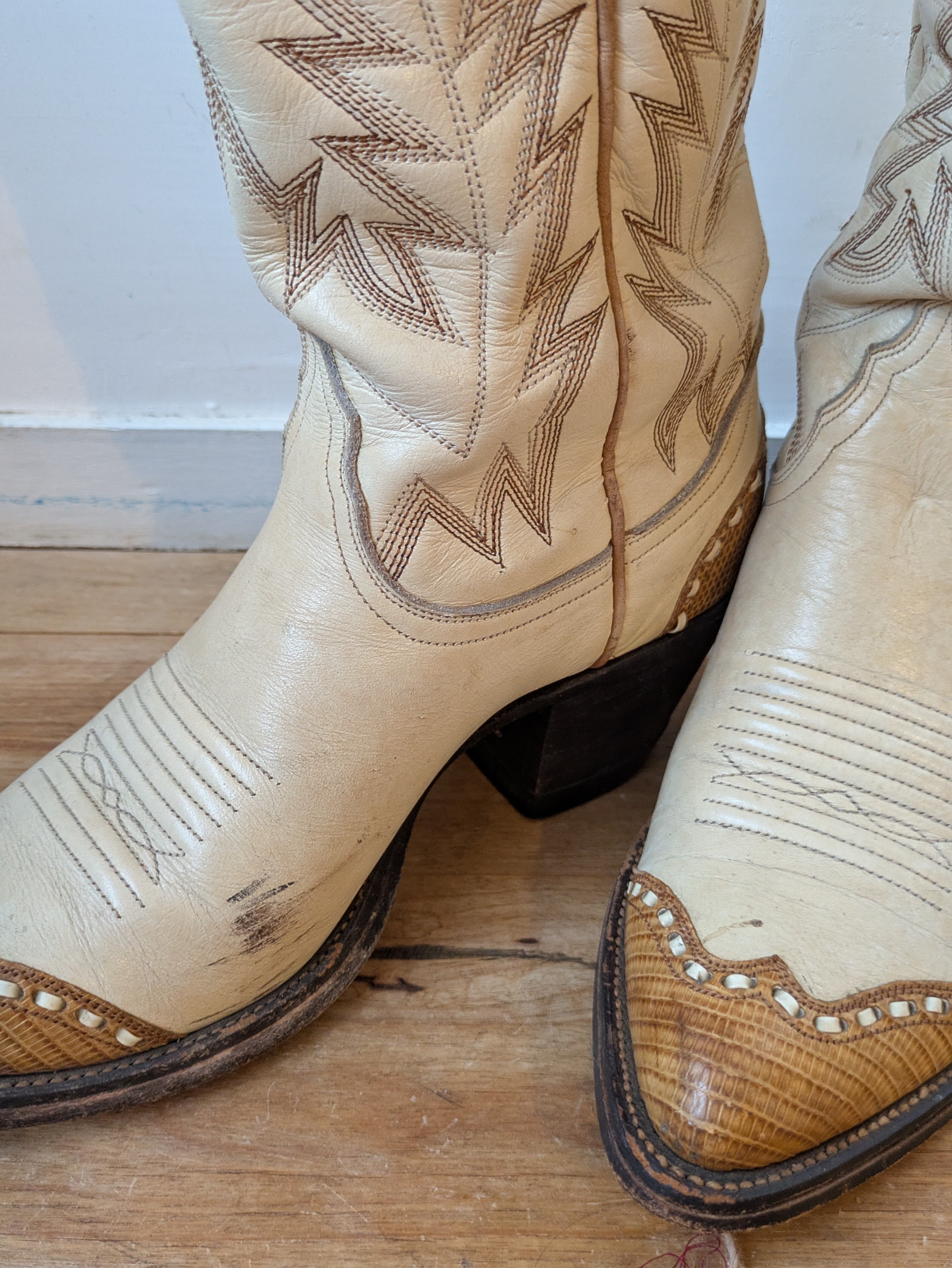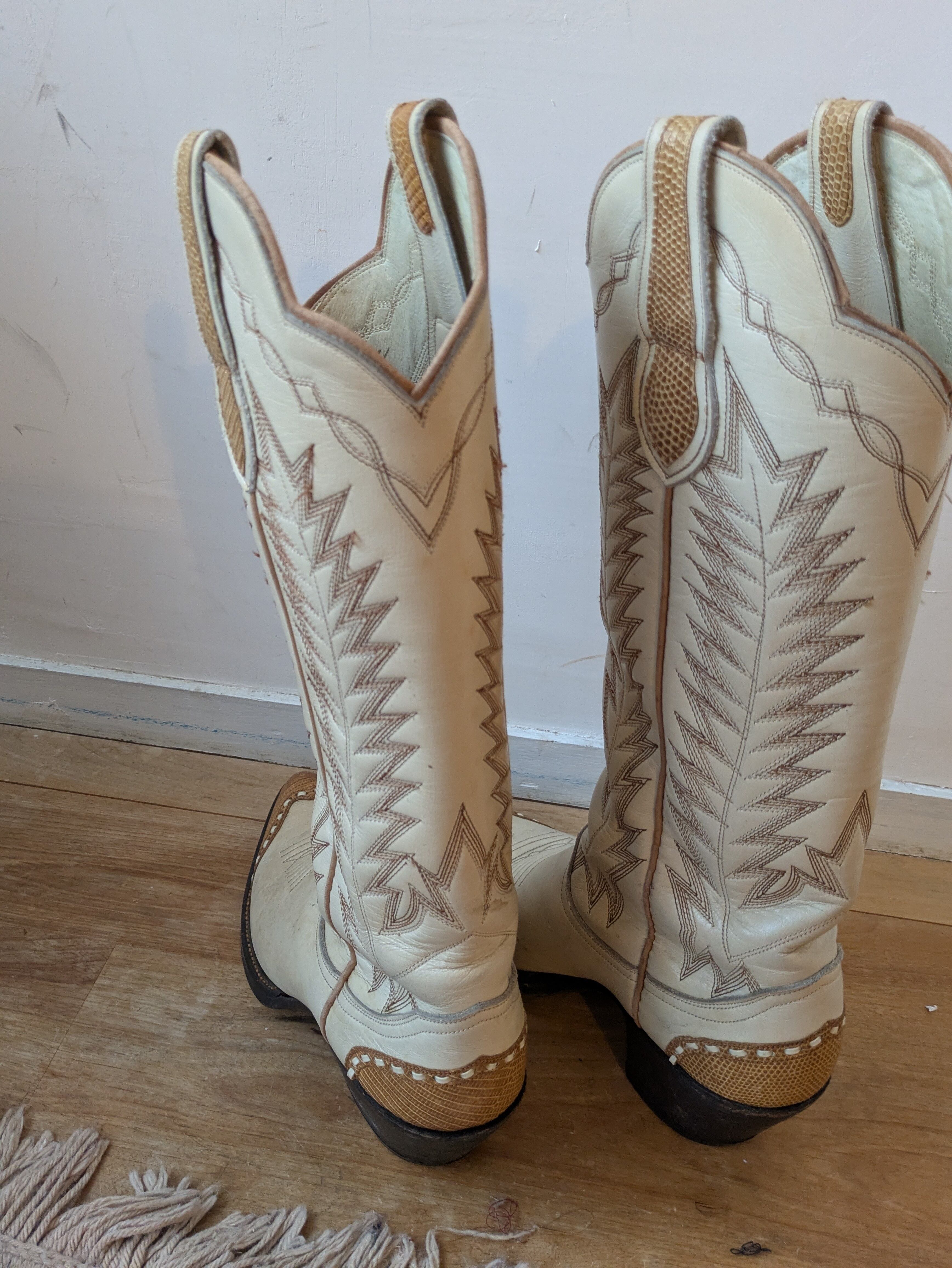 ライトベージュの明るいカラーにパイソンとレザーのコンビネーションや刺繍が可愛いウエスタンブーツ