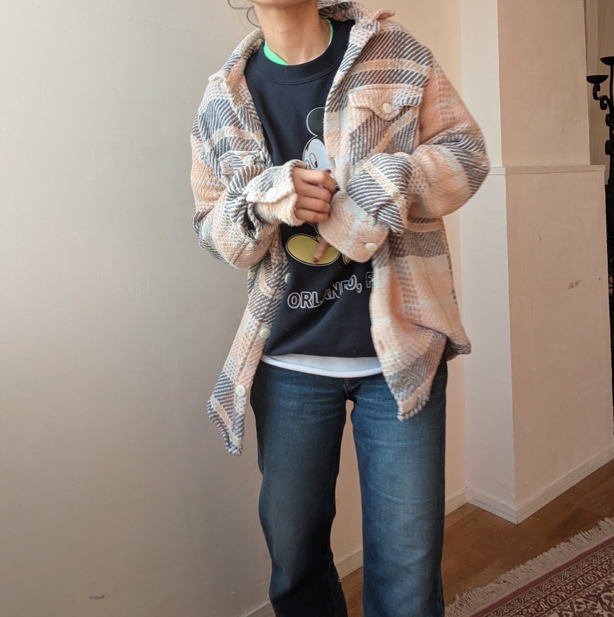 淡いカラーが可愛らしく、大人の女性のカジュアルスタイルにおすすめのシャツジャケットです