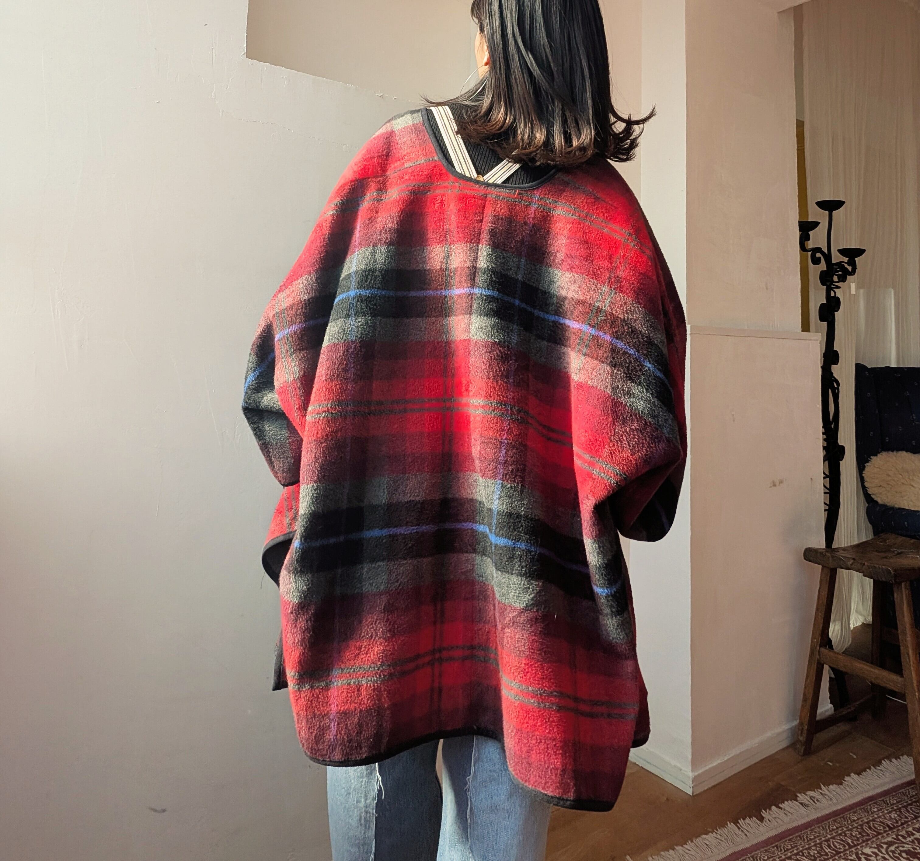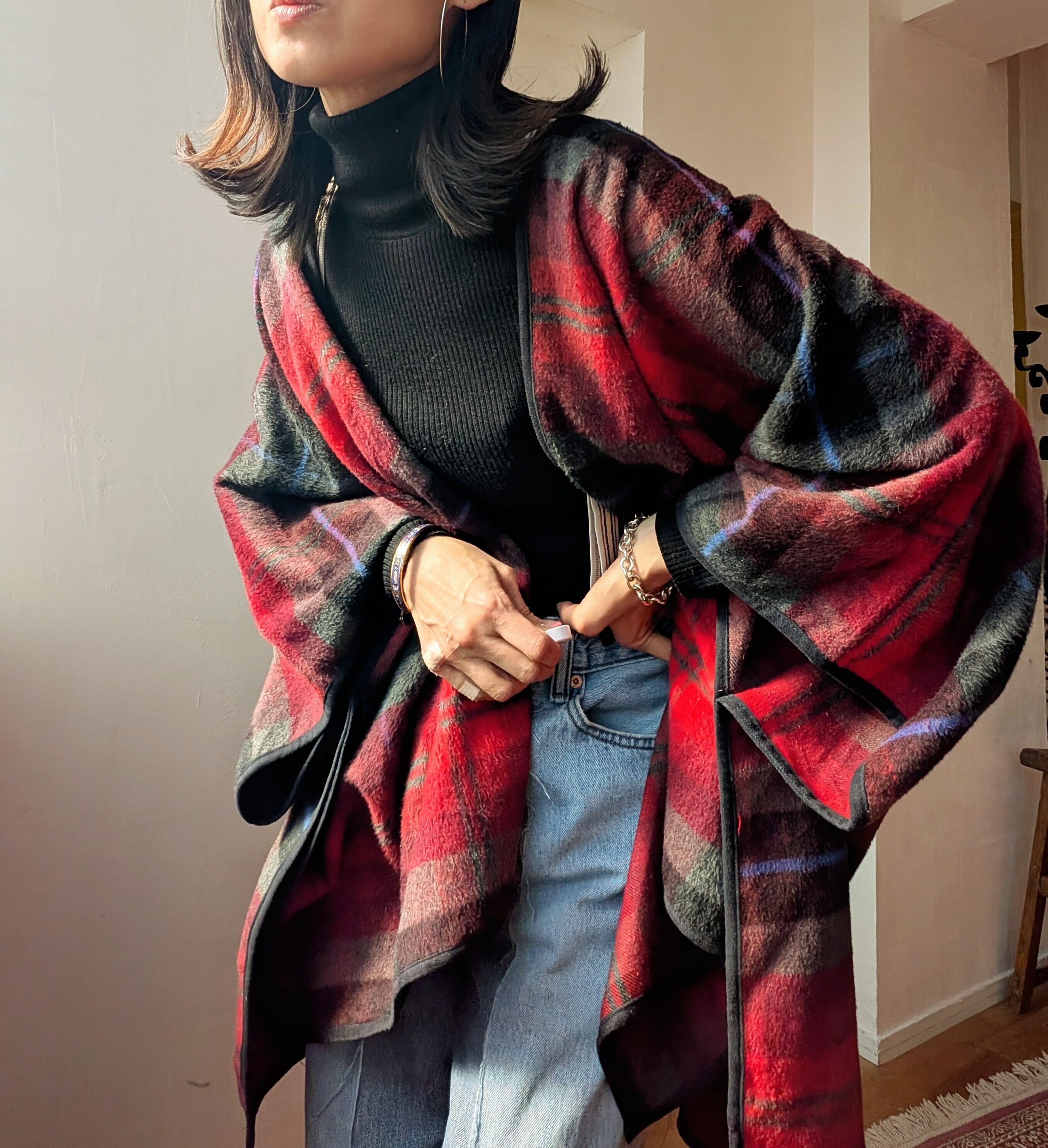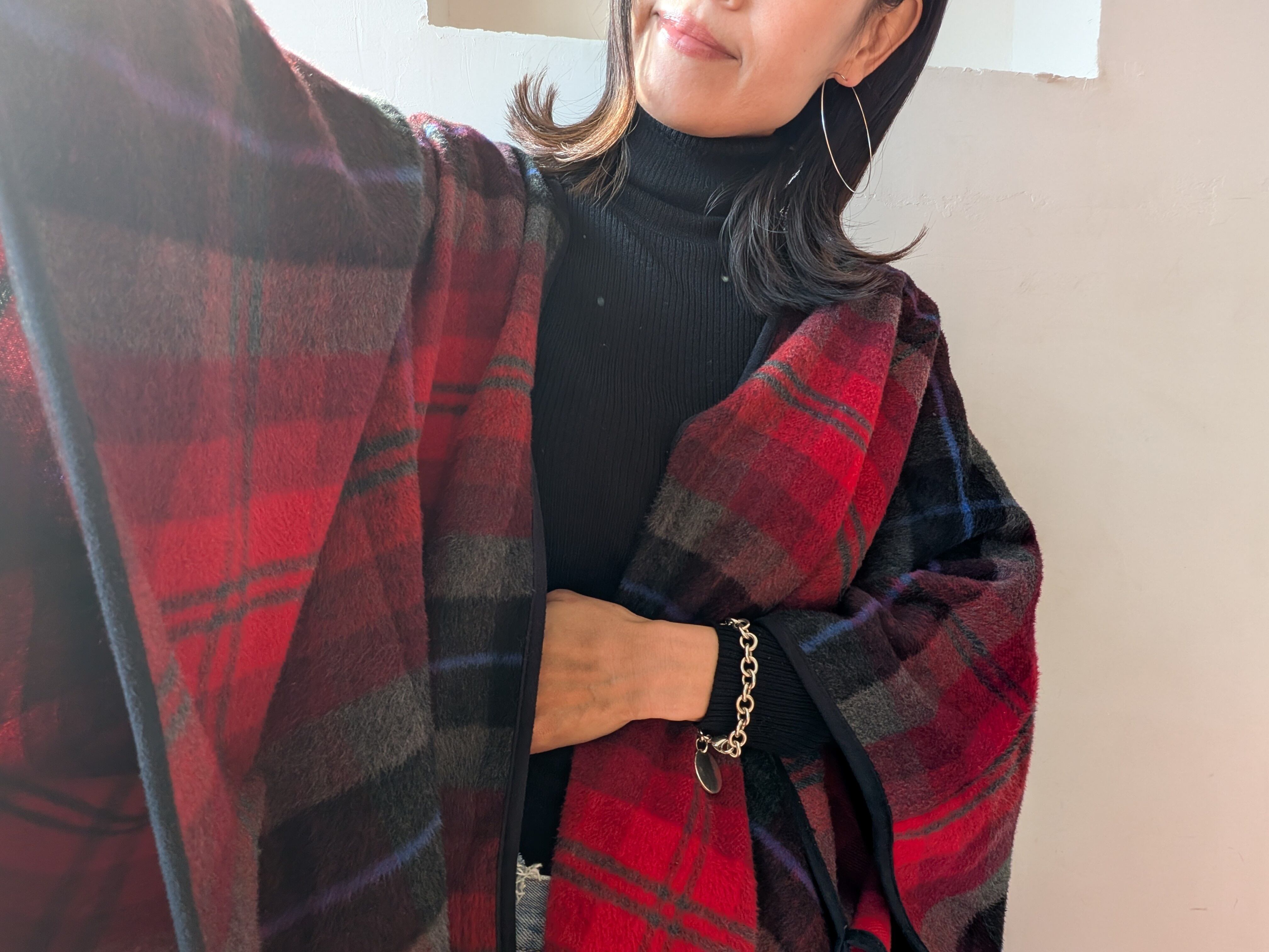 赤いタータンチェック柄が可愛らしい、ポンチョのようなストールのようなシルエットが素敵なカーディガンです。