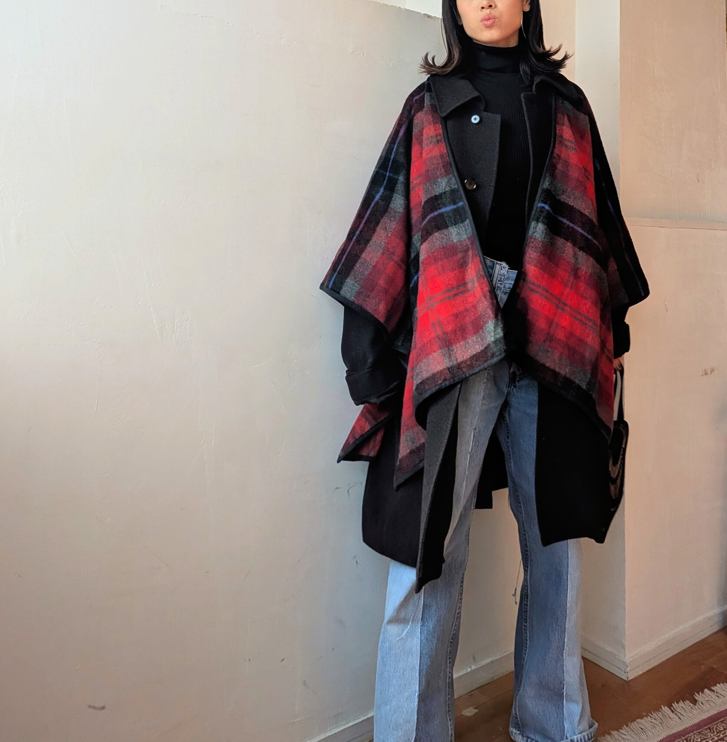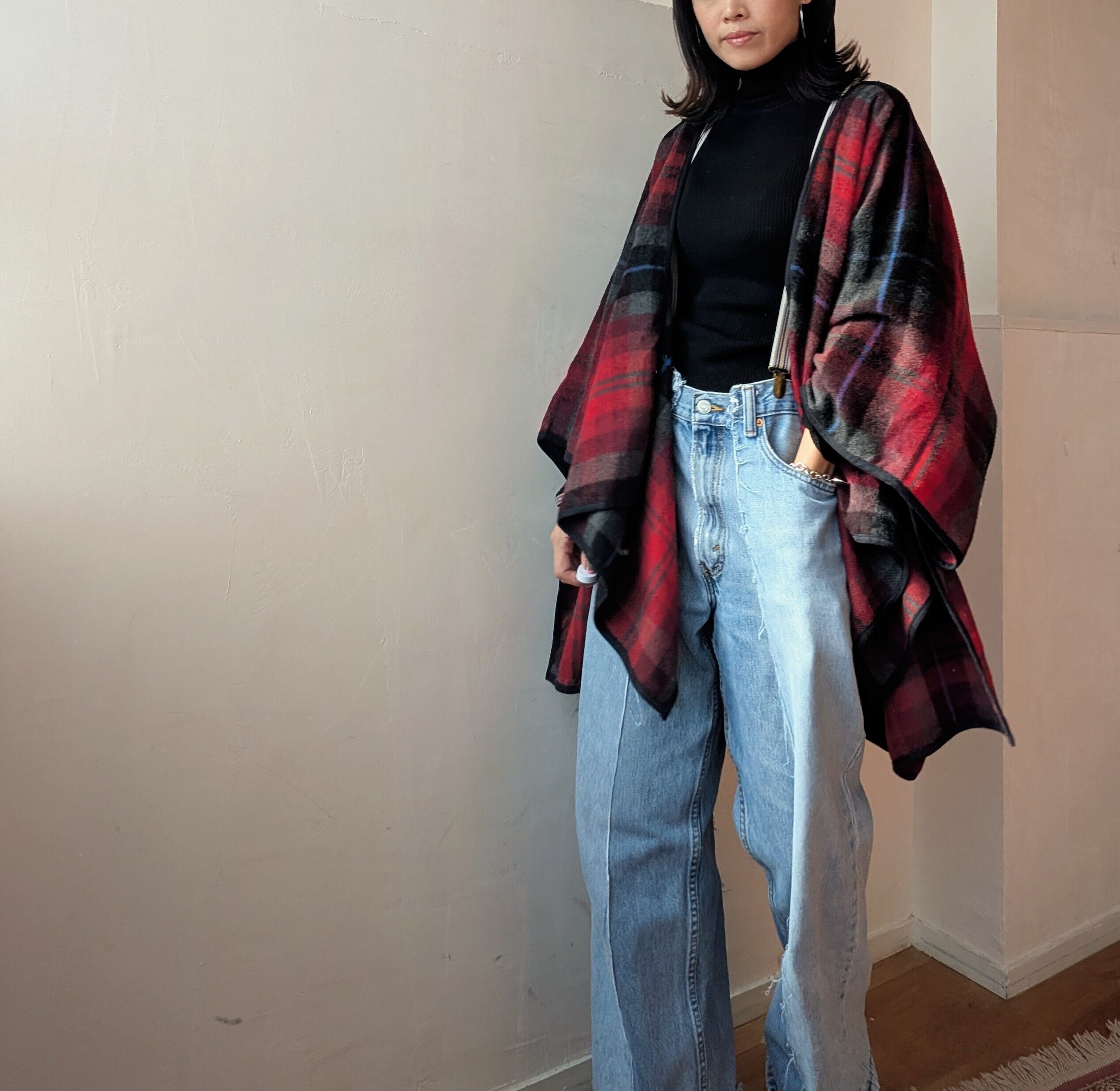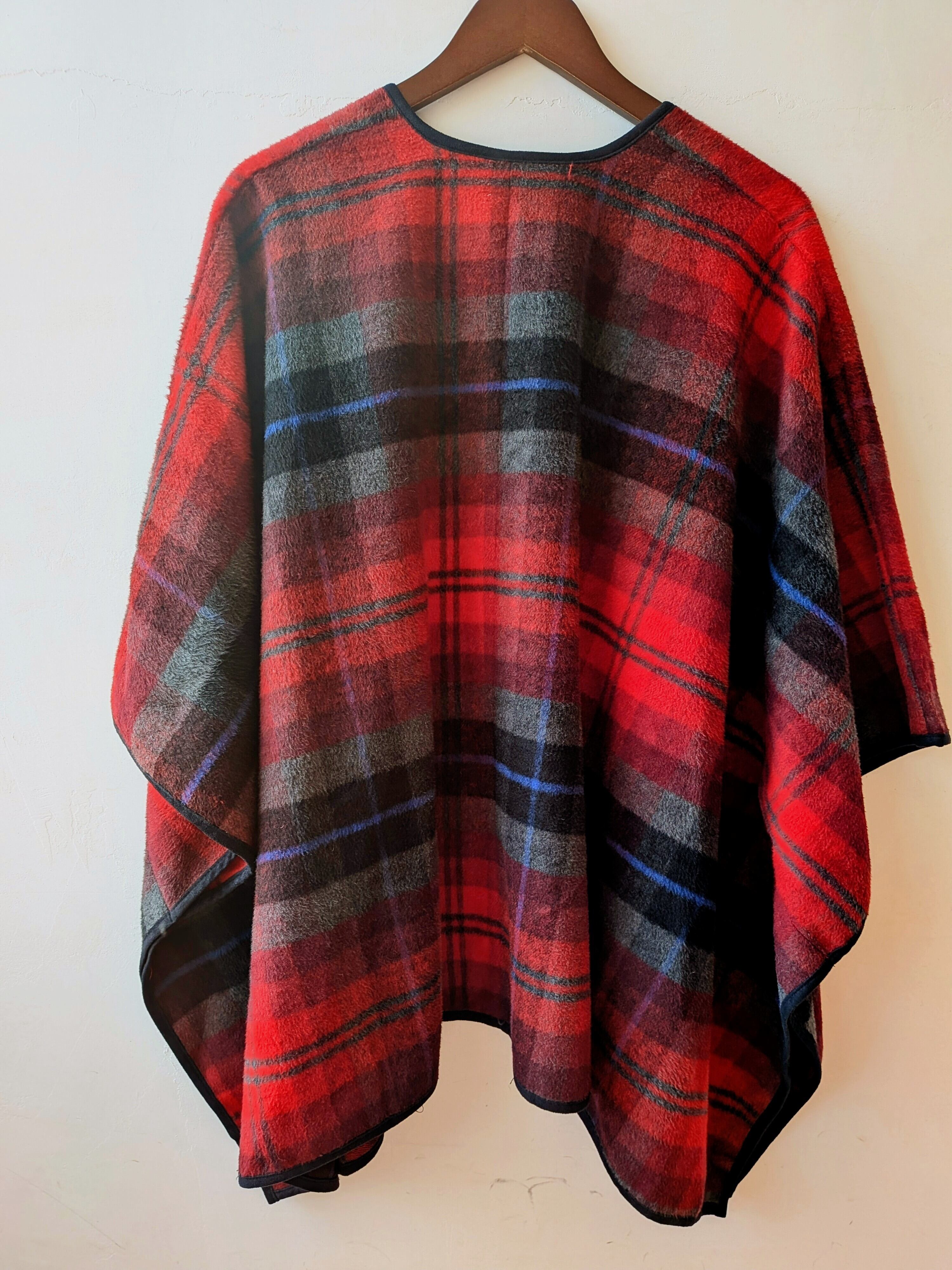 赤いタータンチェック柄が可愛らしい、ポンチョのようなストールのようなシルエットが素敵なカーディガンです。