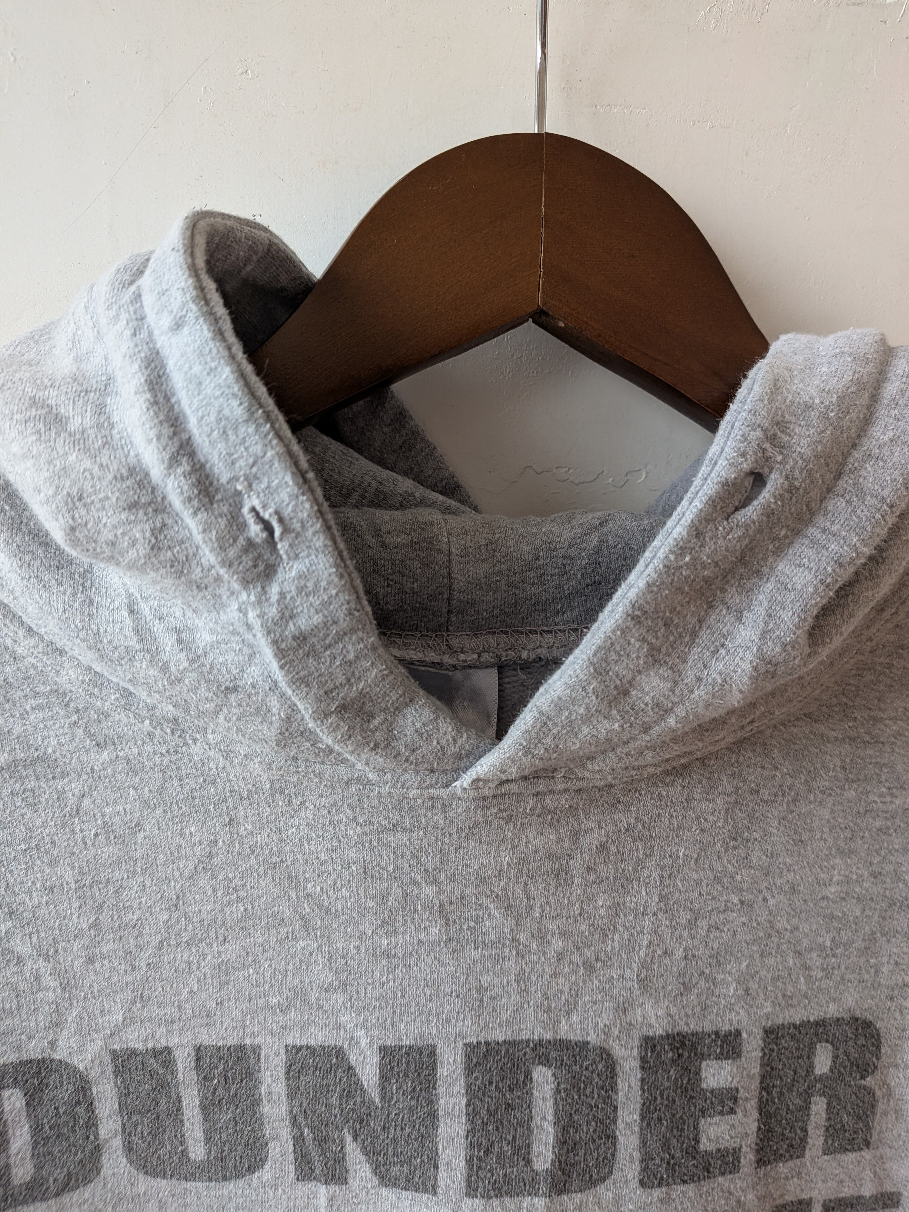 ライトグレーのボディに褪せたブラックロゴがシンプルでvintage感のあるフーディーです。