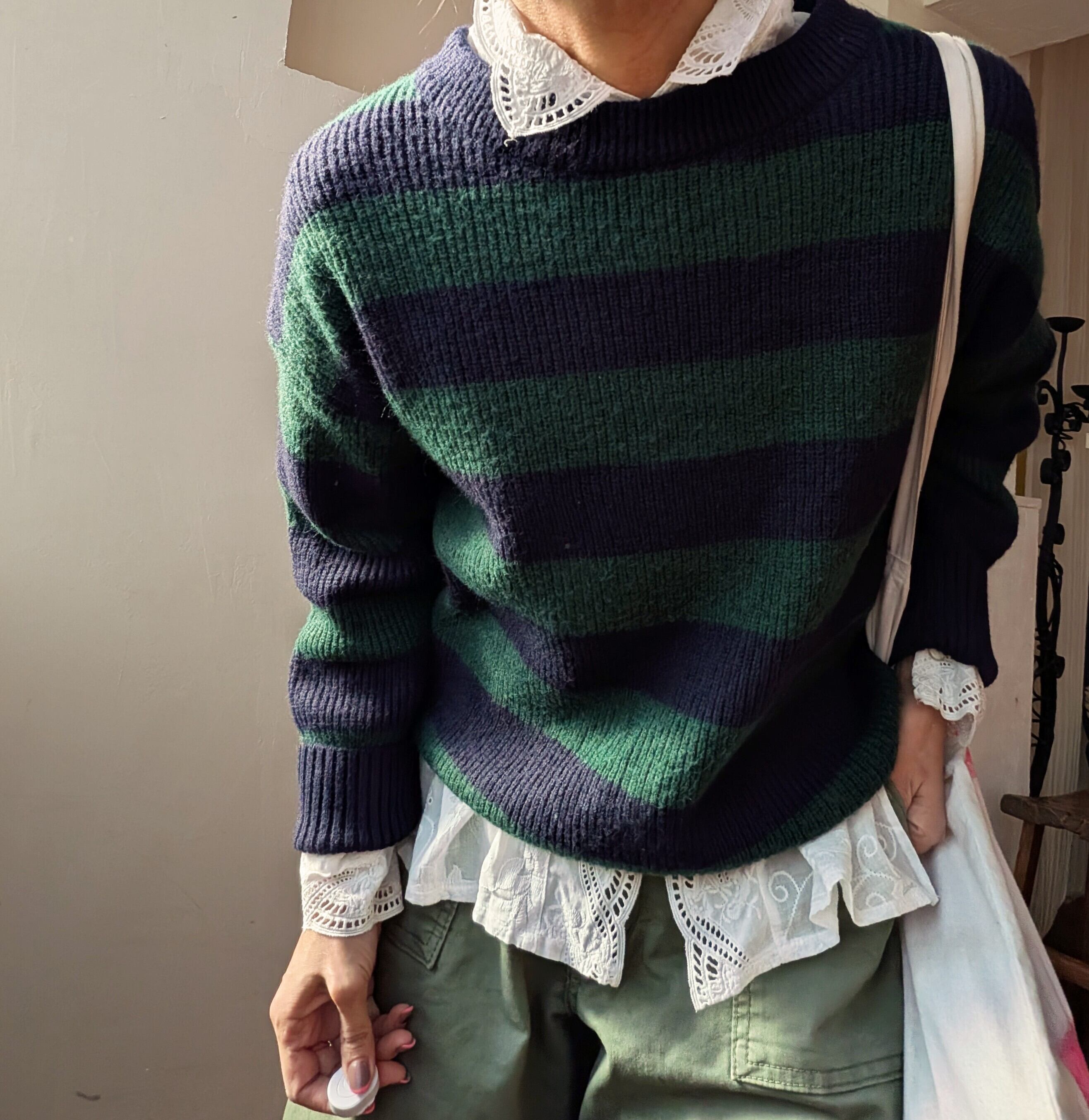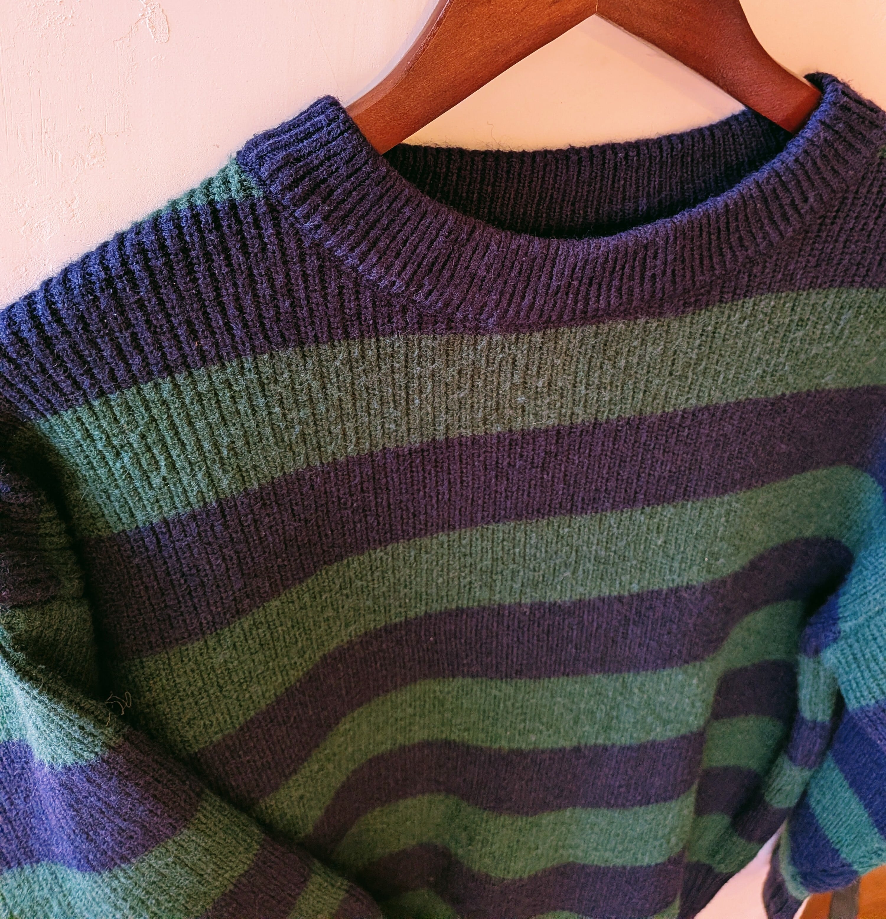 柔らかなウール素材とラウンドネックが、寒い季節も暖かく、落ちついたカラーのボーダー柄が大人カジュアルなコーデにぴったりなニット。