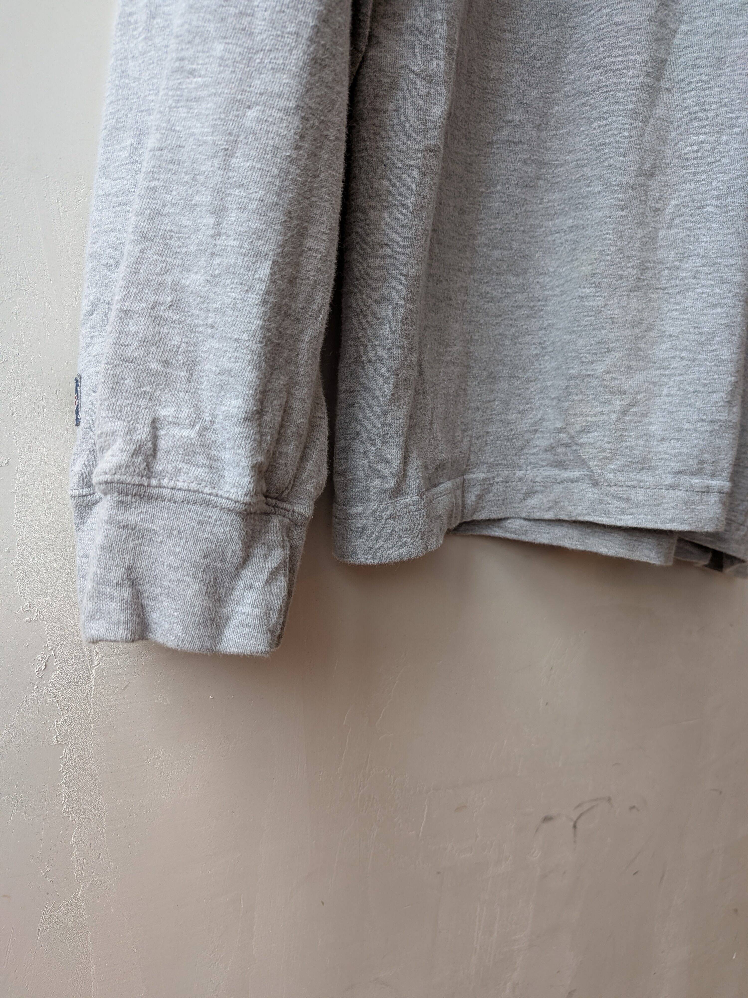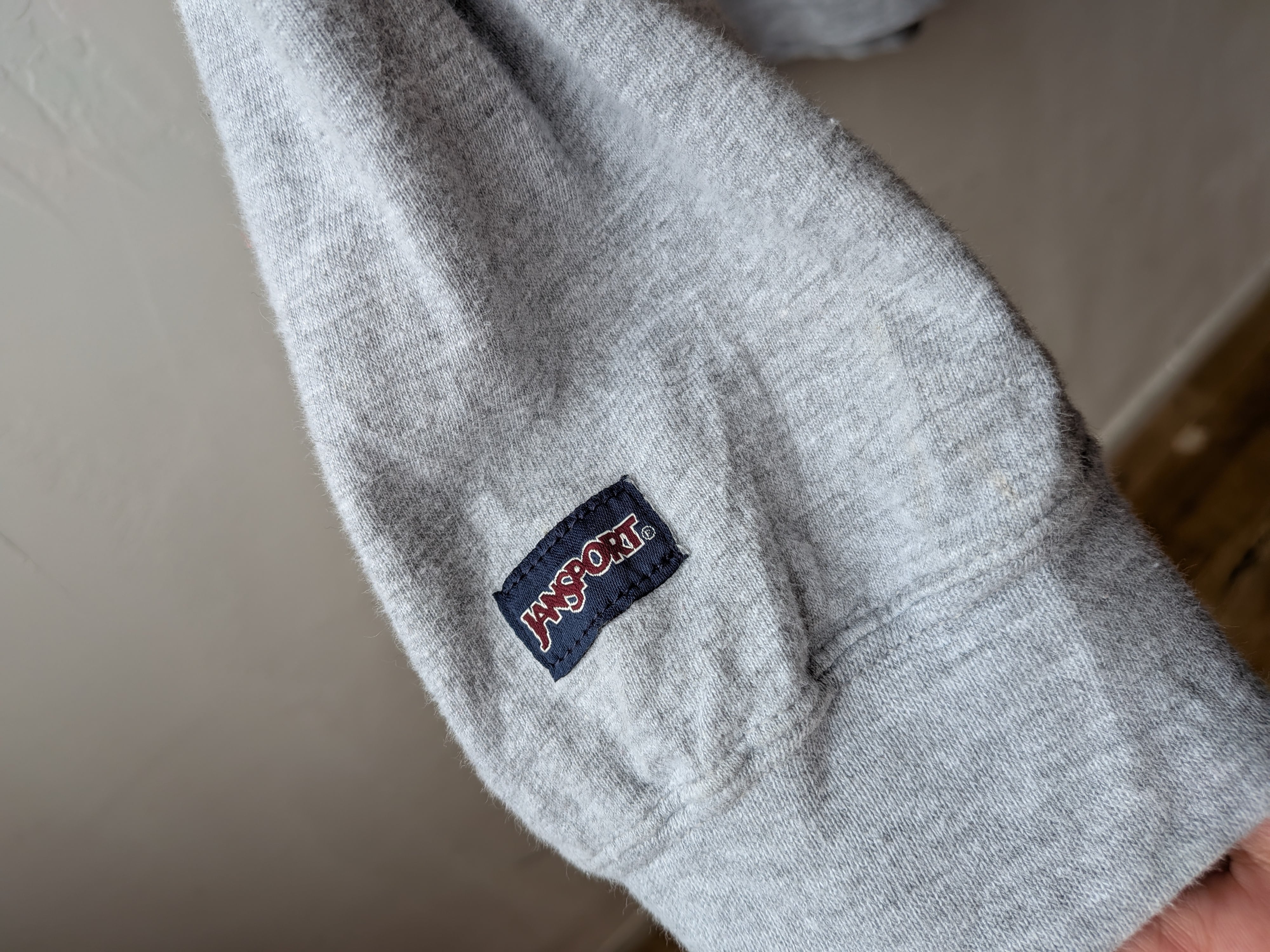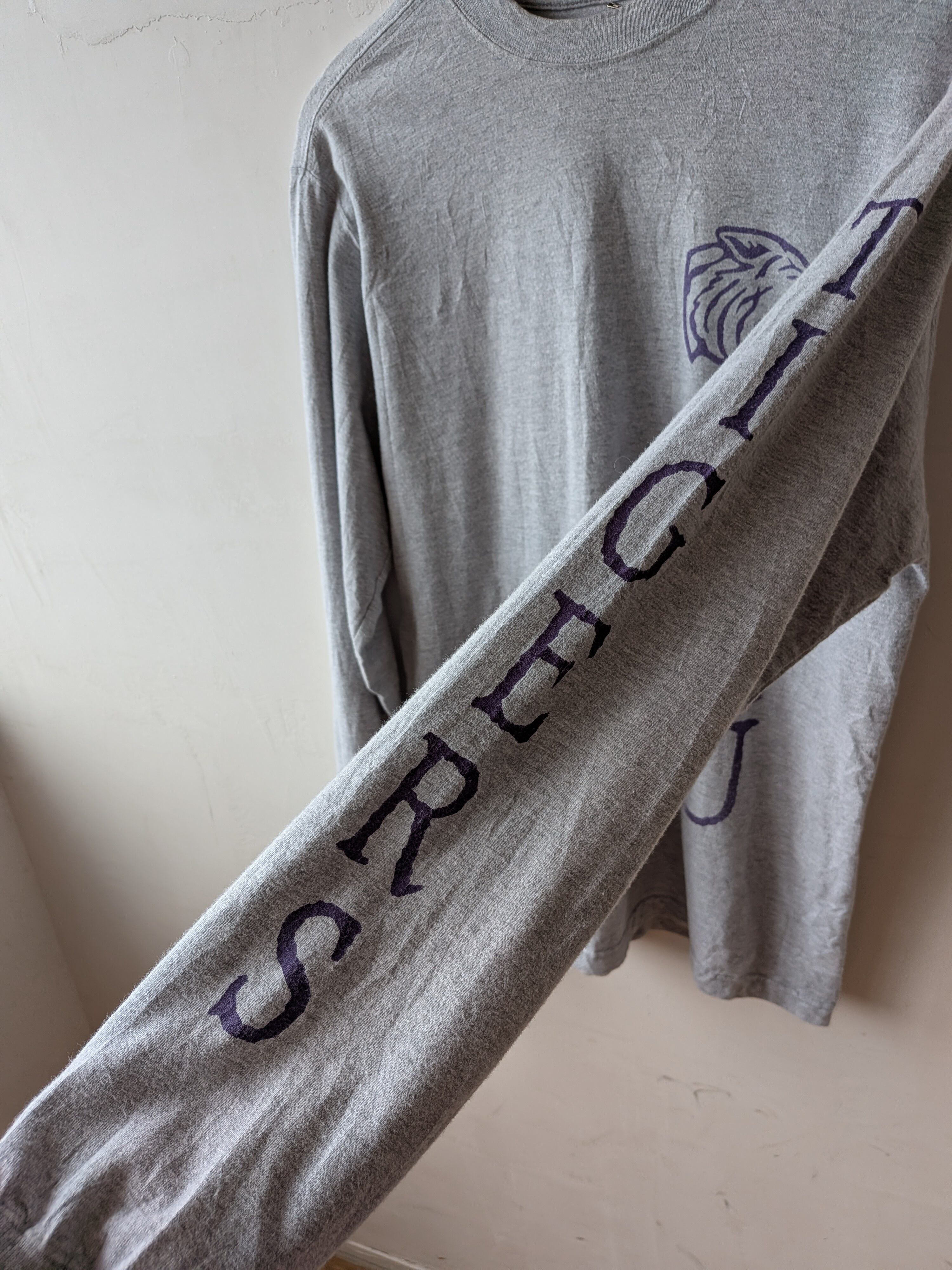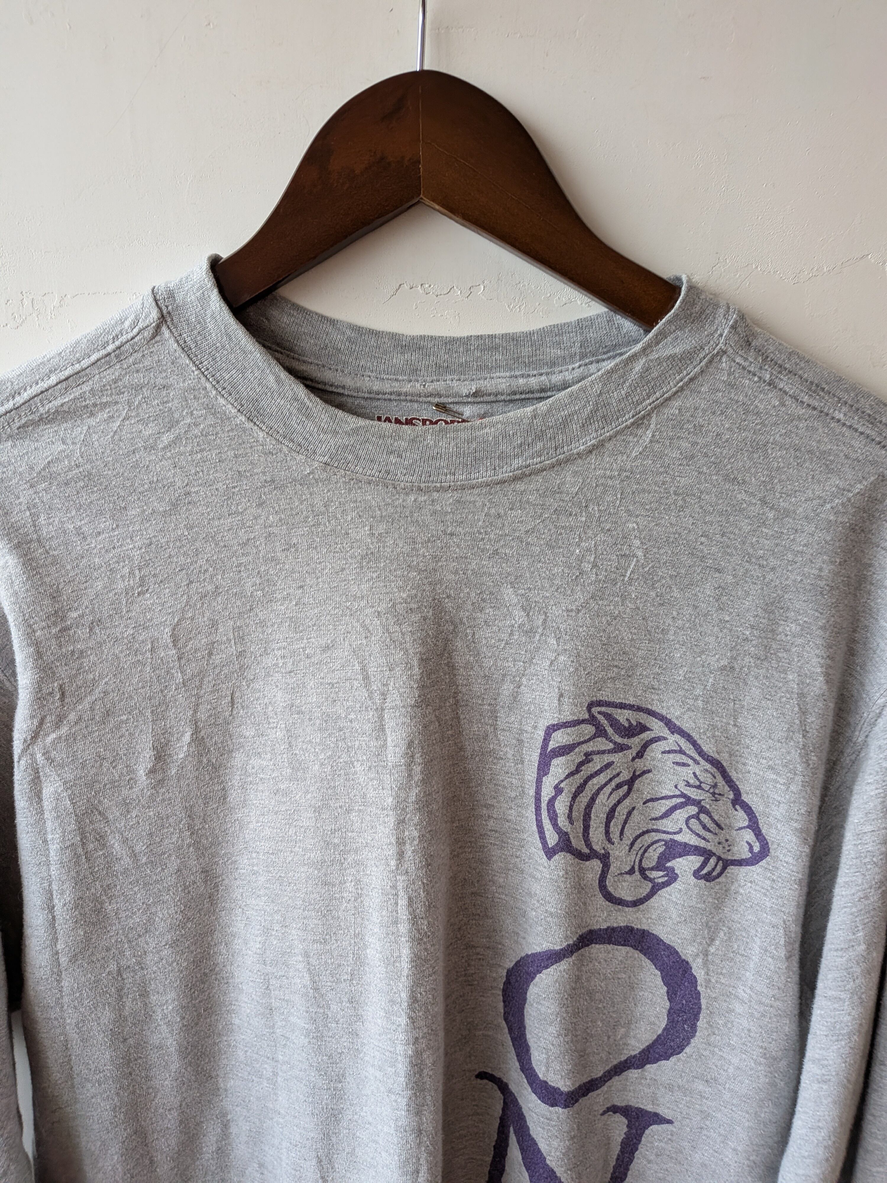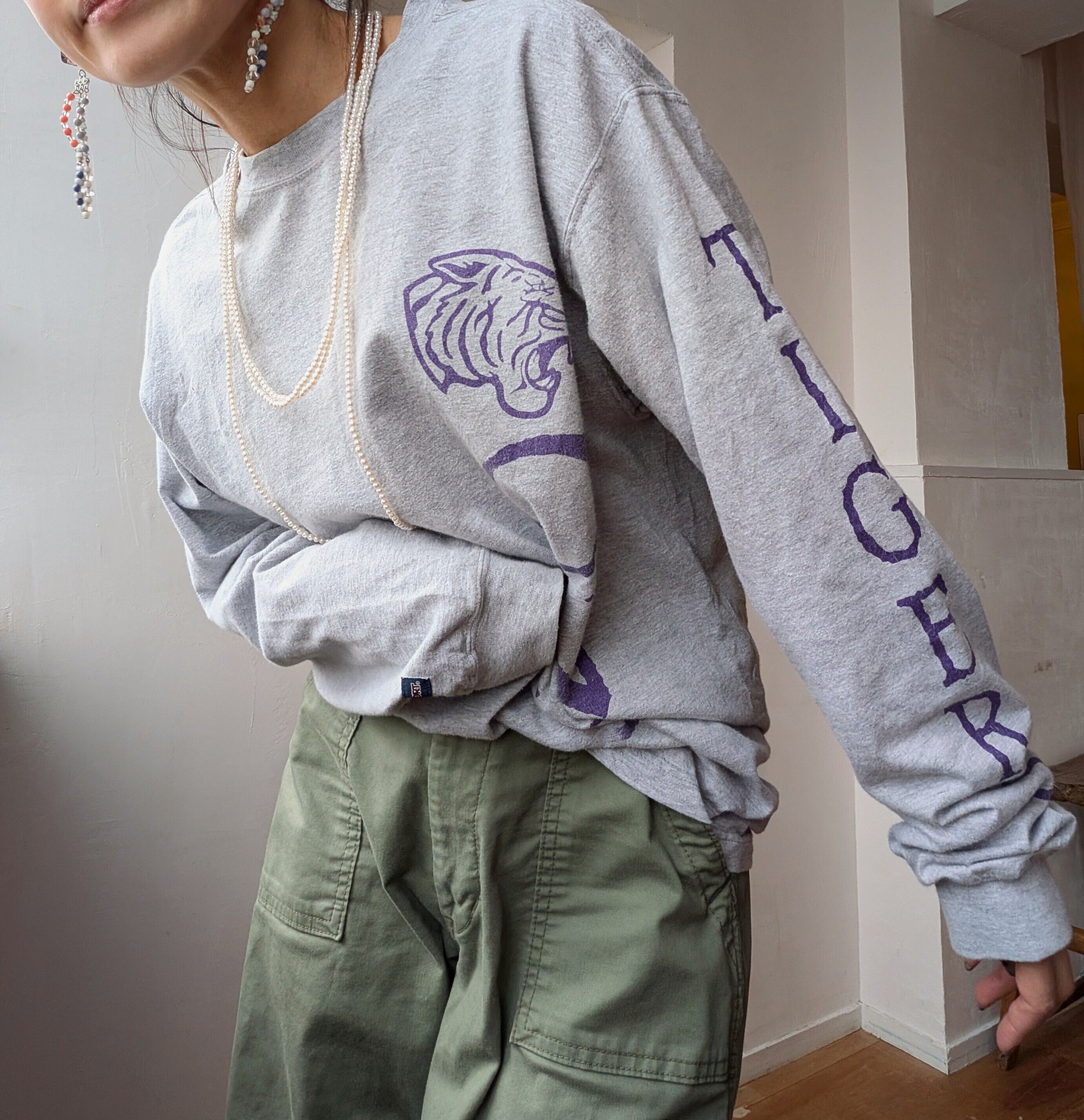 グレーボディに、パープルのタイガーのイラストと袖のロゴがかっこいいJANSPORTのロングTシャツ。