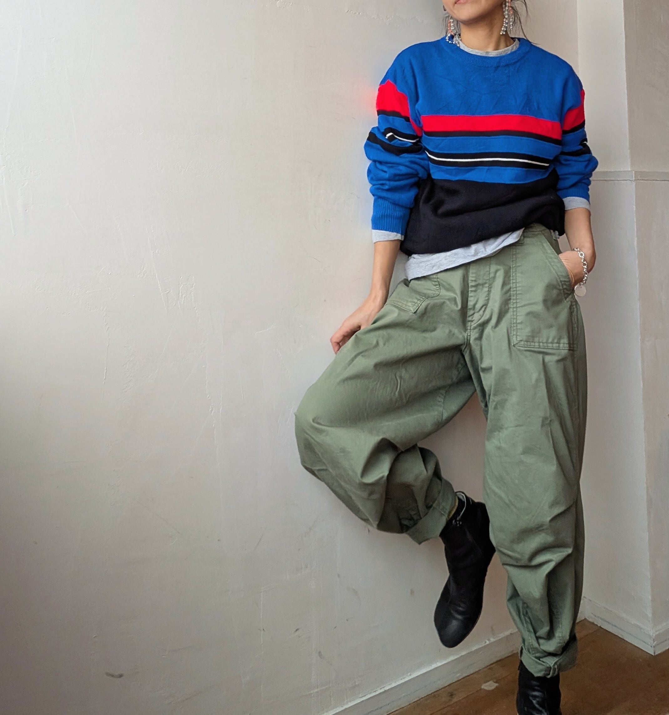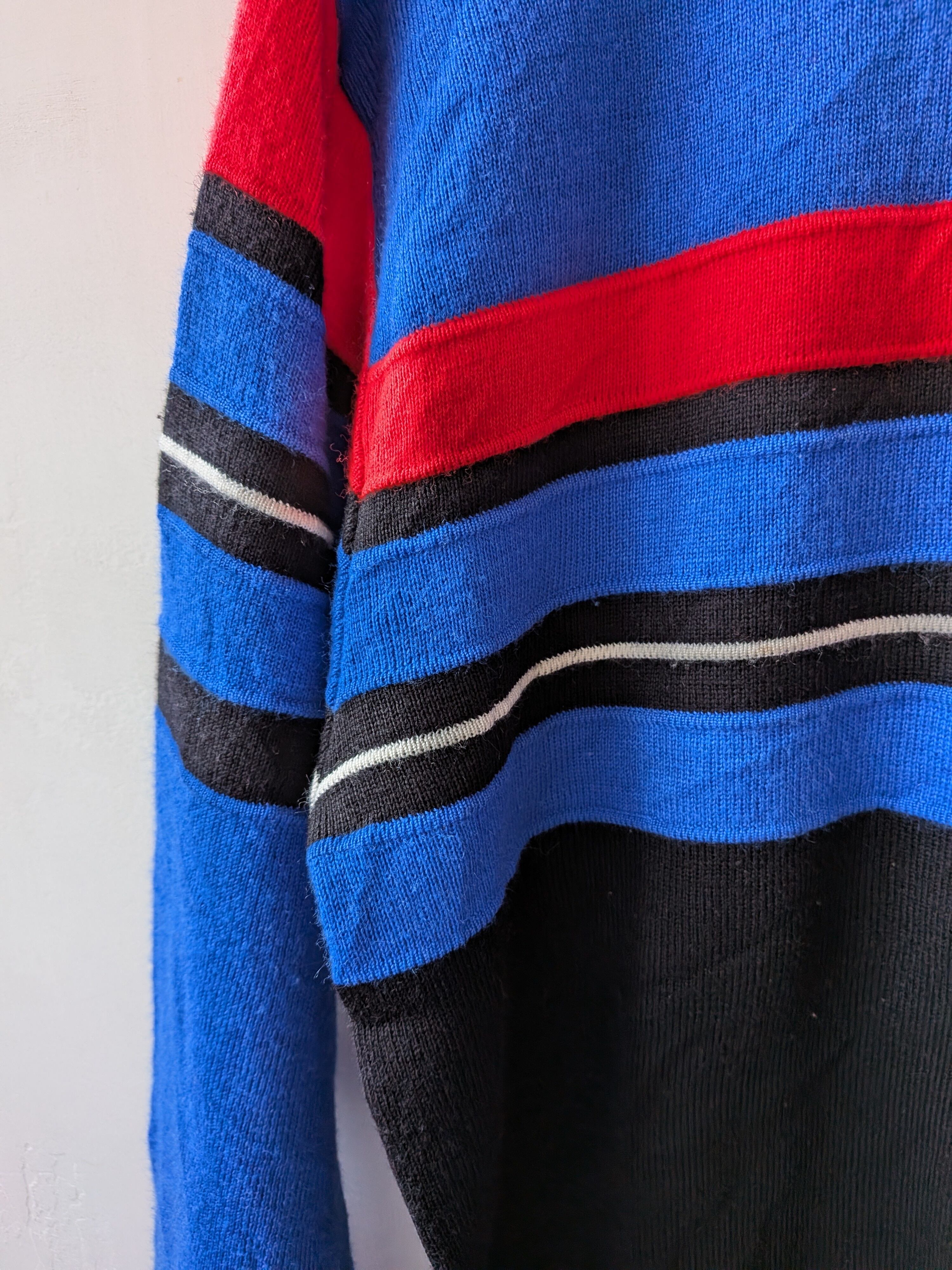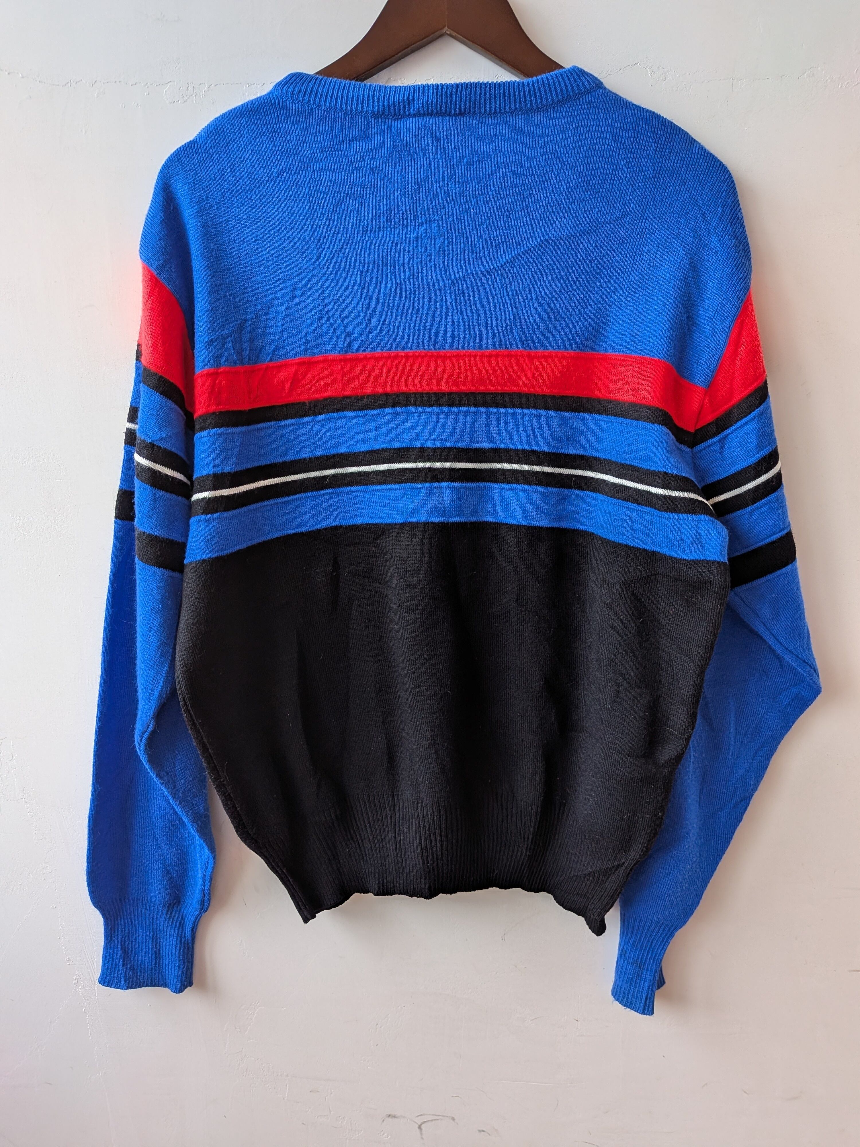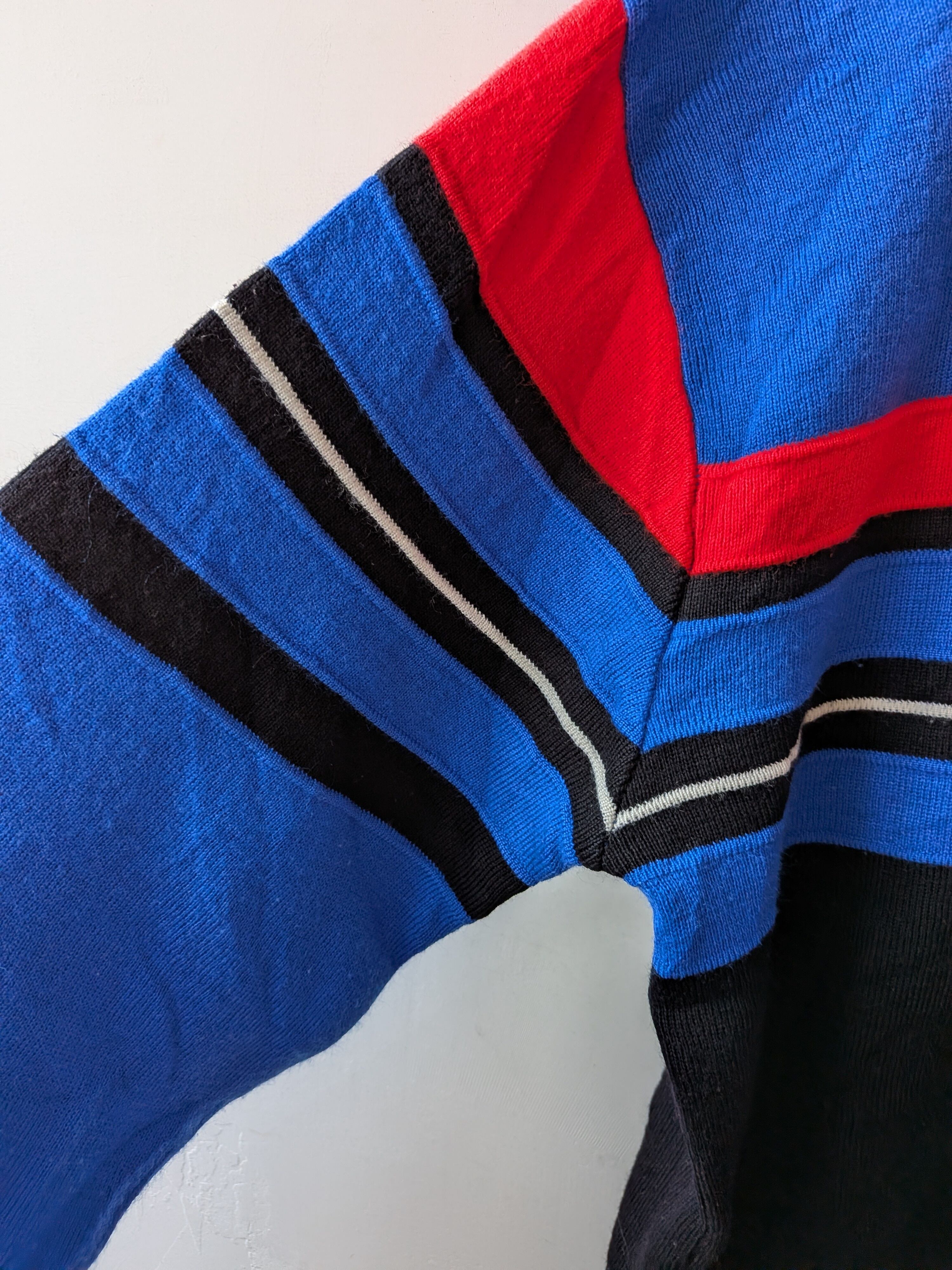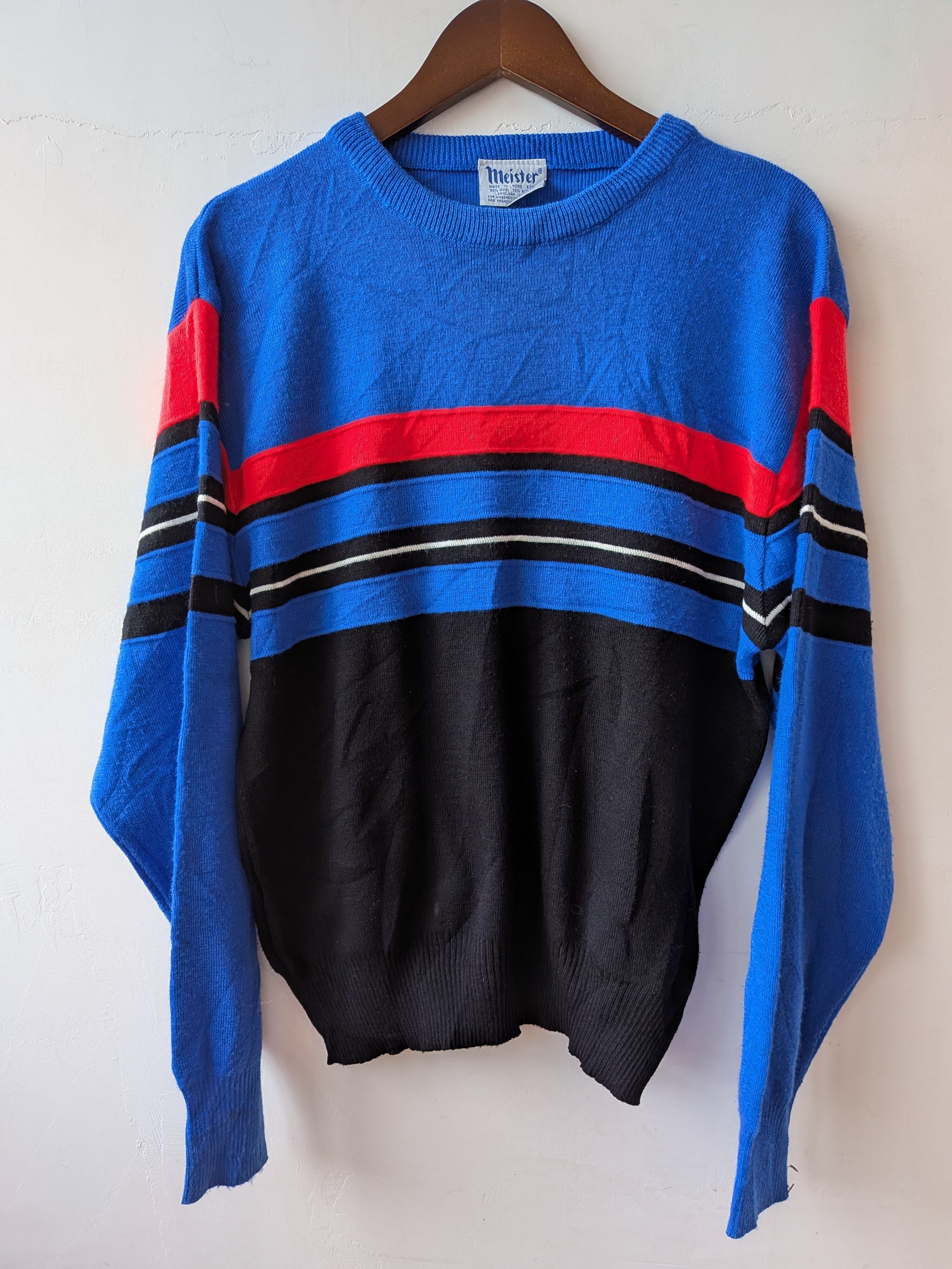 鮮やかなネオンブルーのボディにネオンのボーダーデザインがレトロな雰囲気でぱっと目を引くVintage neon border sweater。