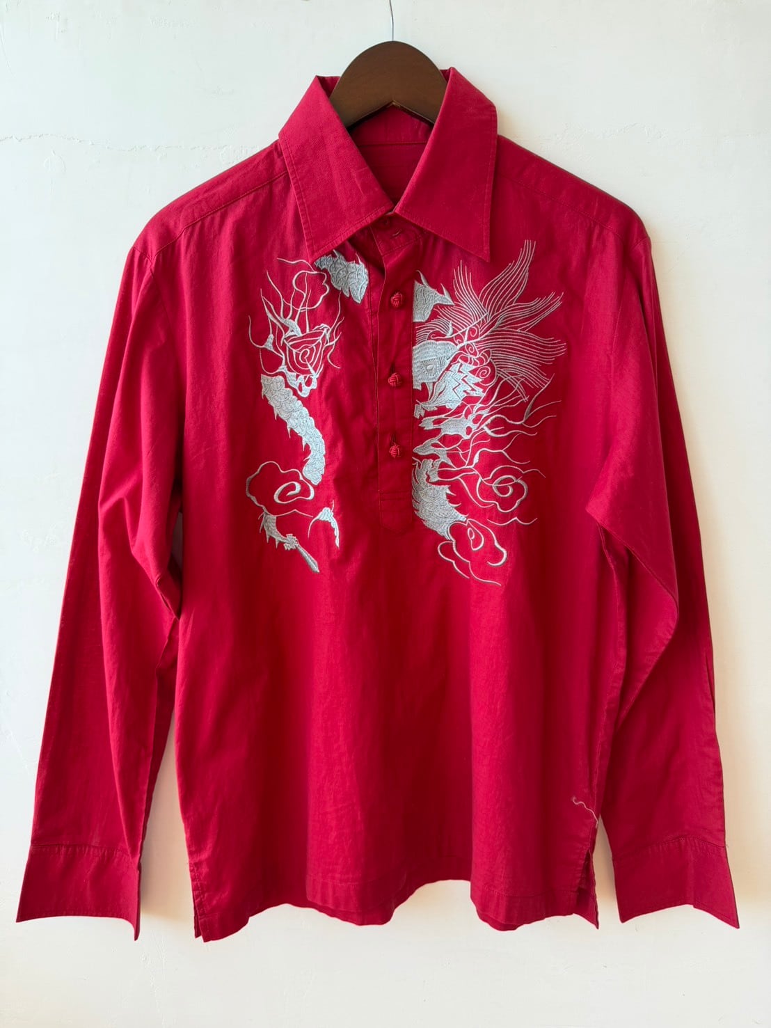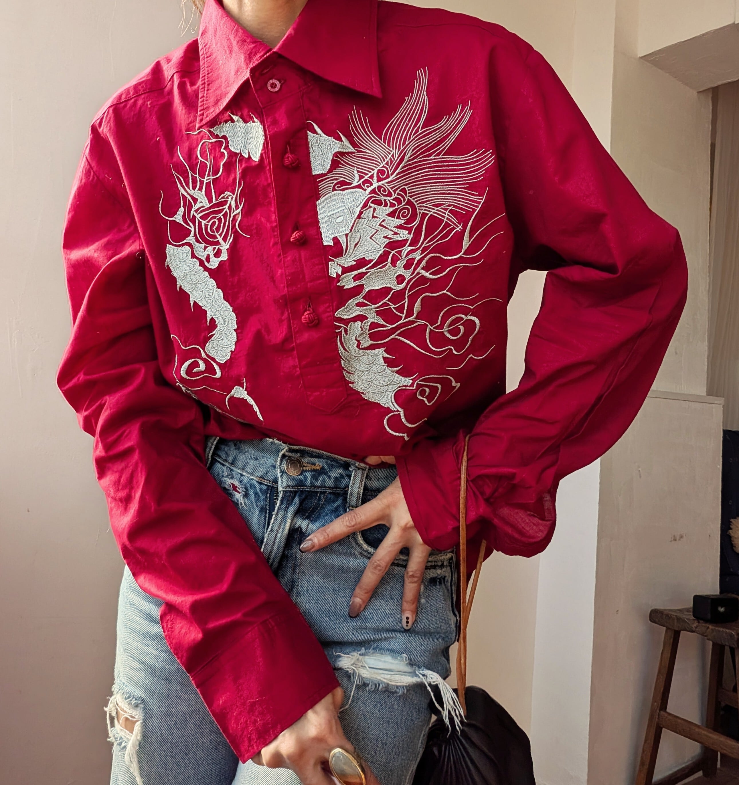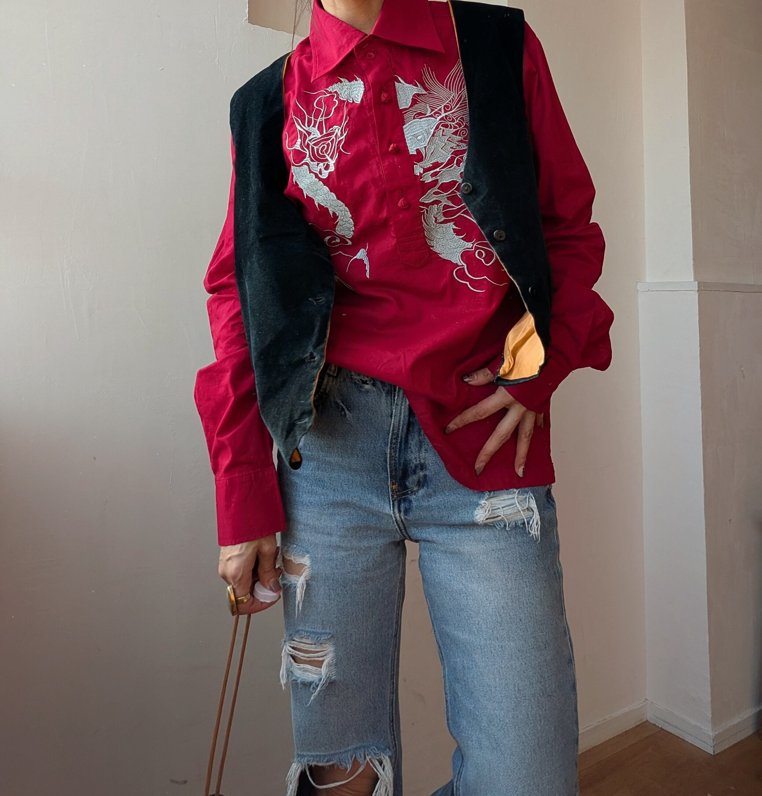 華やかな刺繍が施されたChina風シャツ。