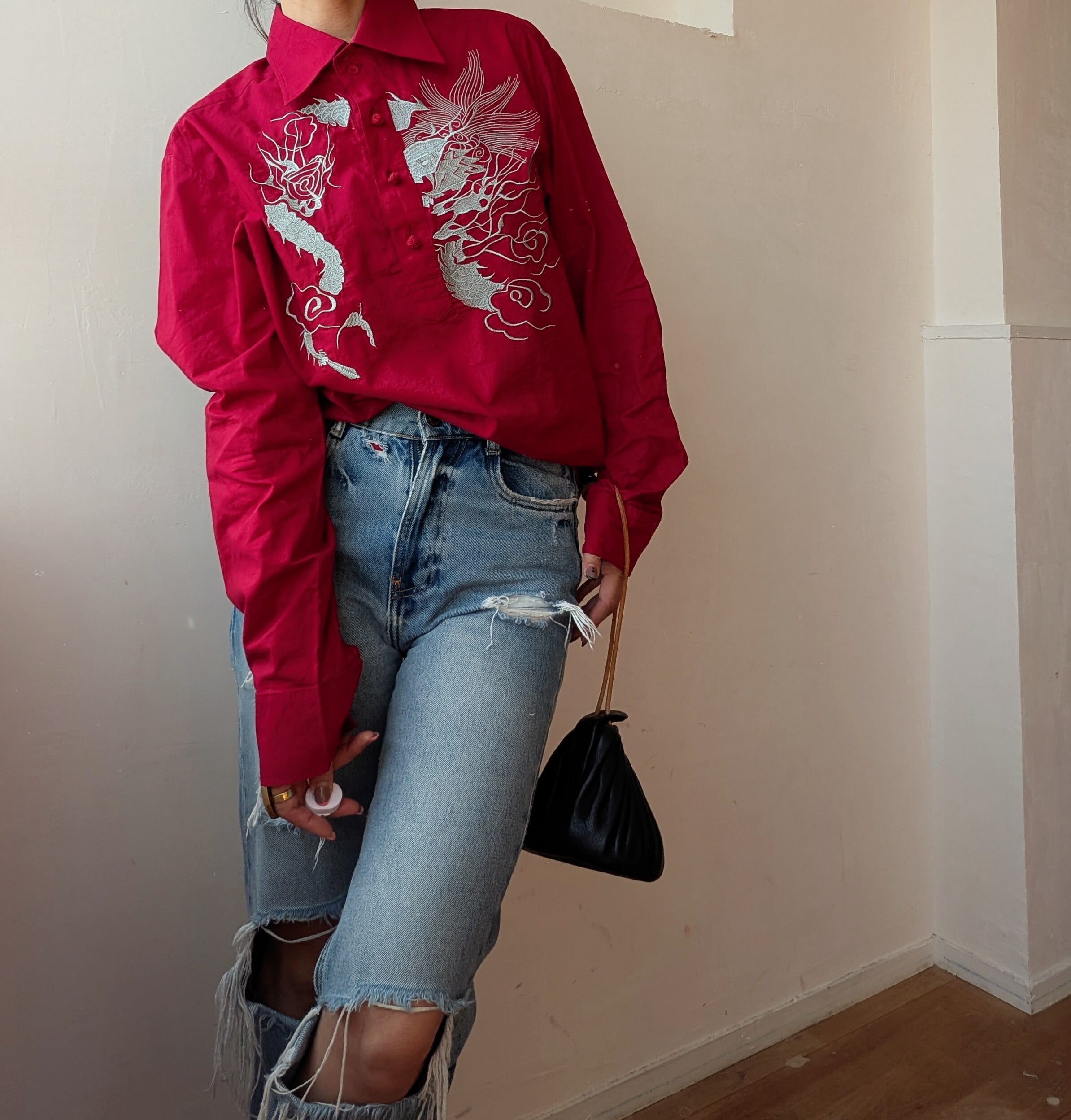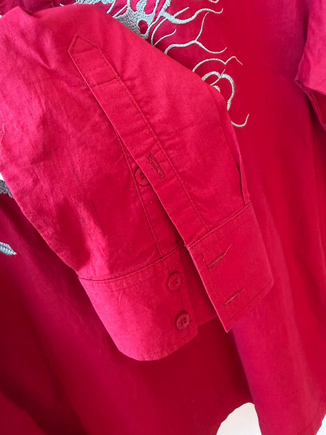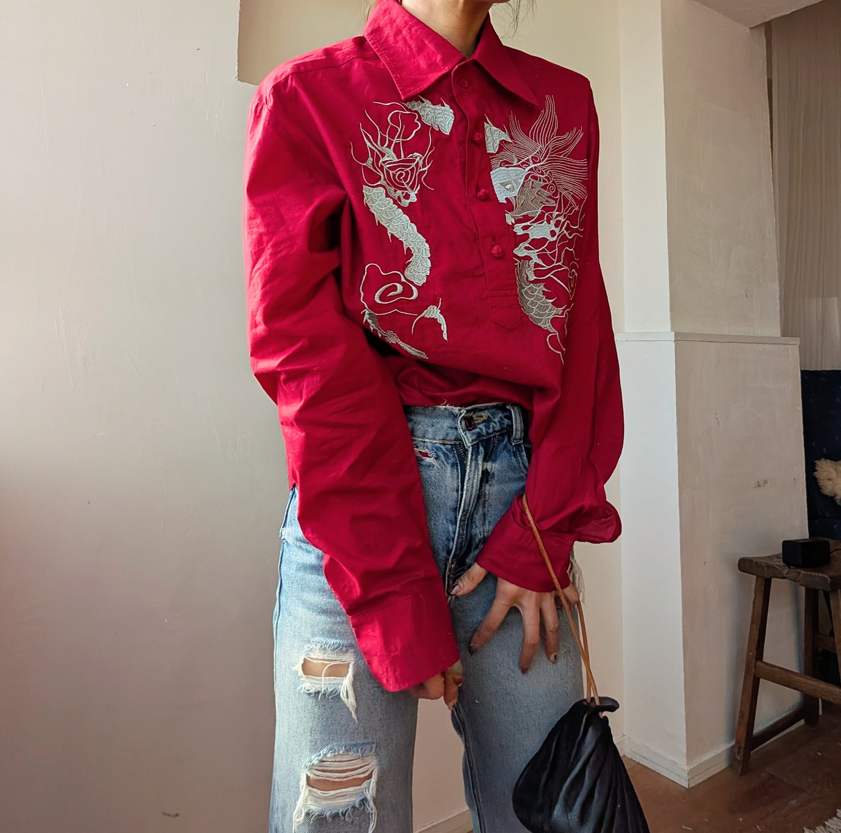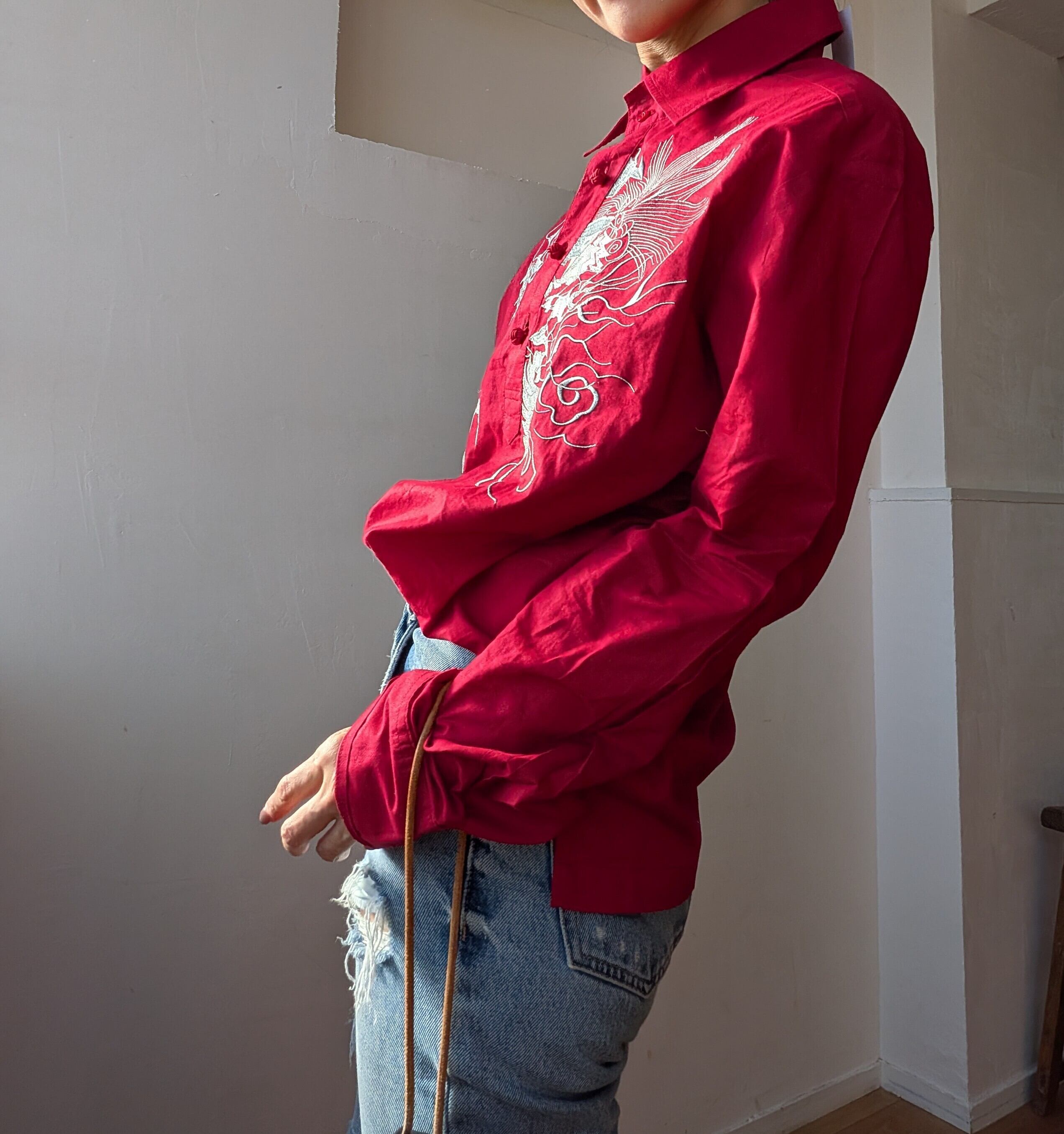 華やかな刺繍が施されたChina風シャツ。