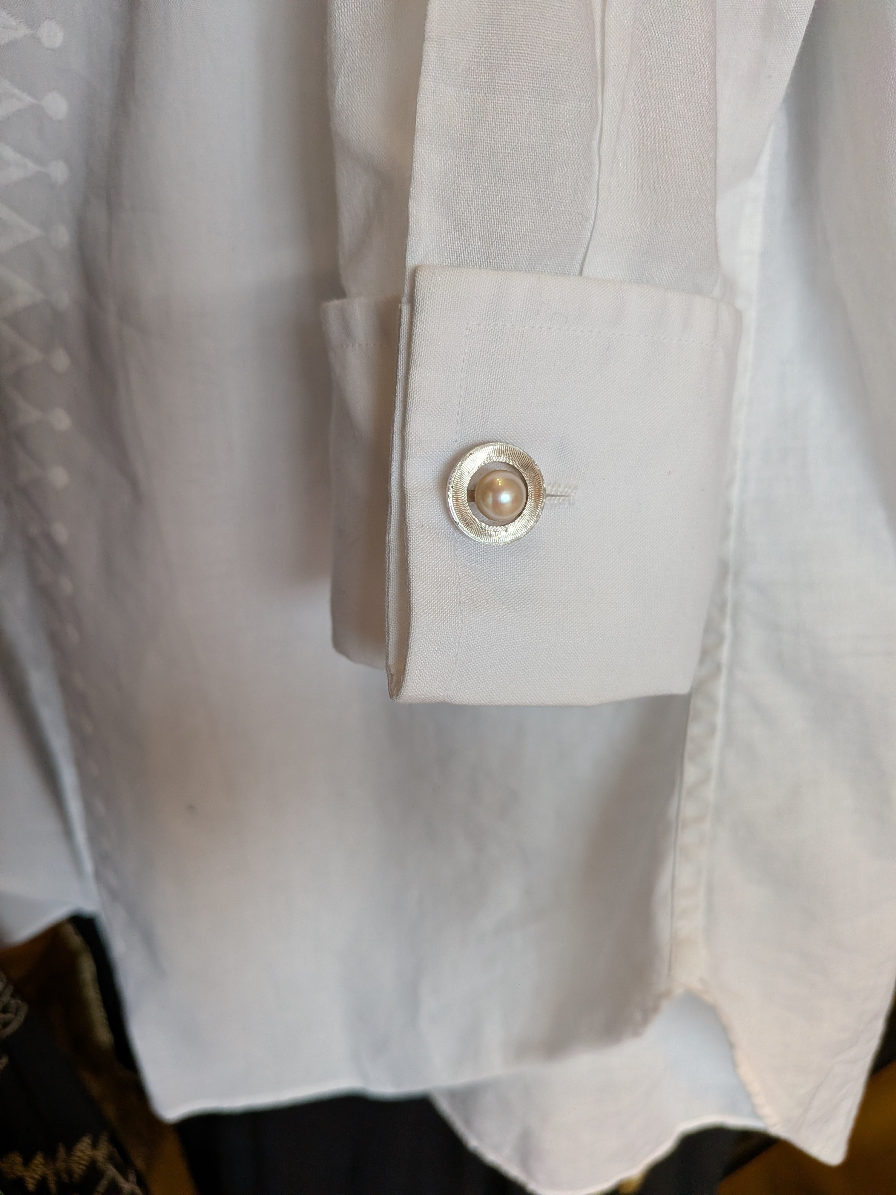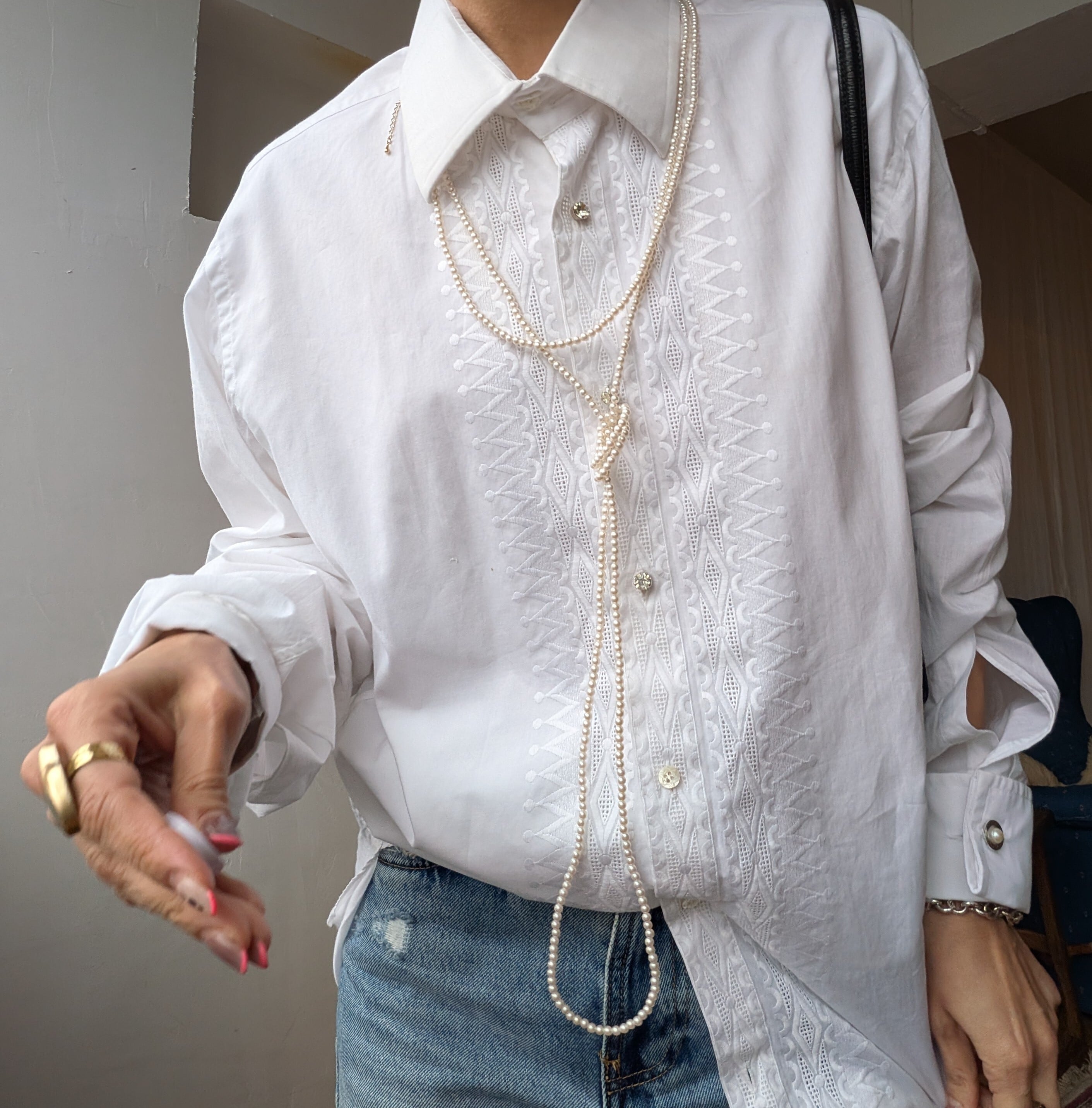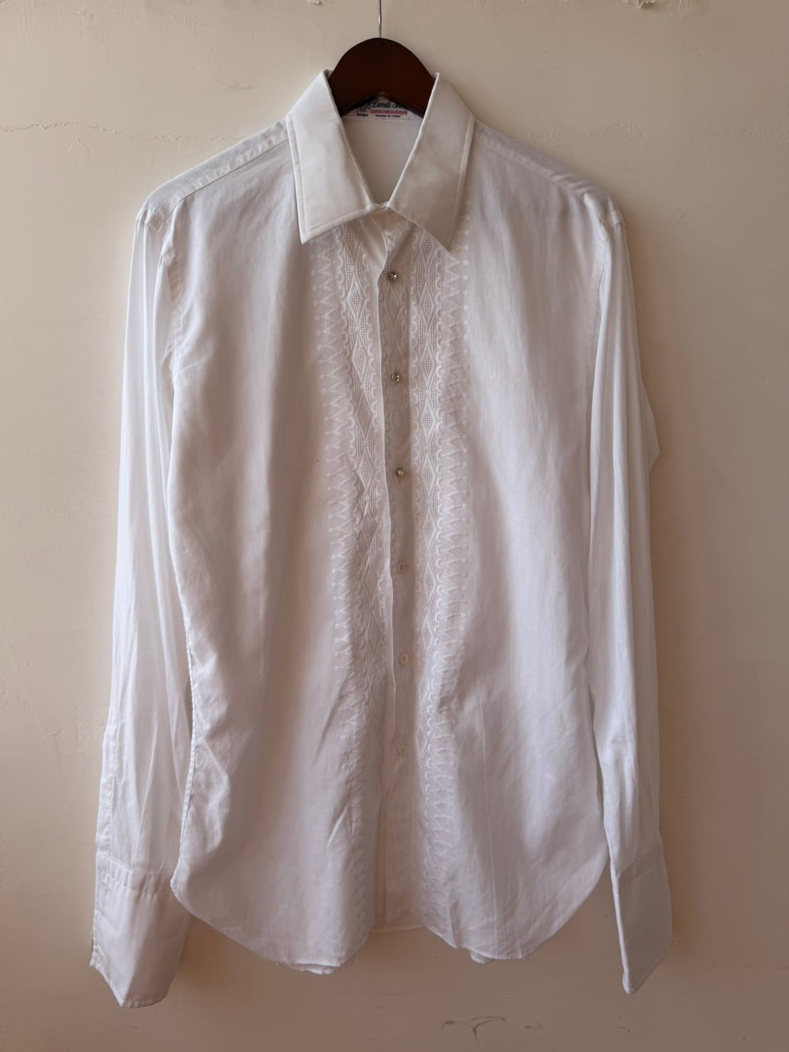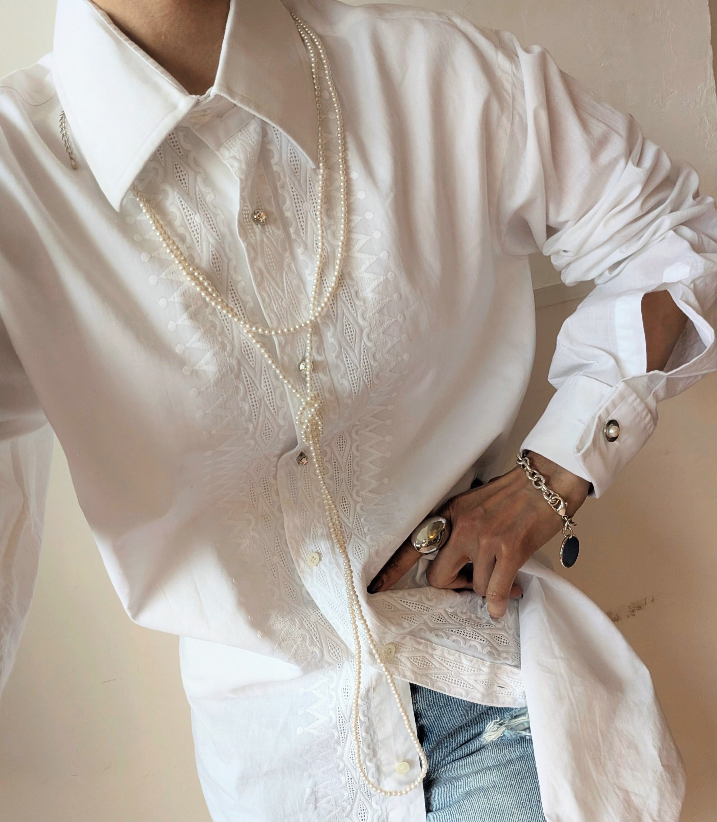 繊細な刺繍が施されたItaly製vintage shirt。長めのカフスにパールのカフスボタン付き。