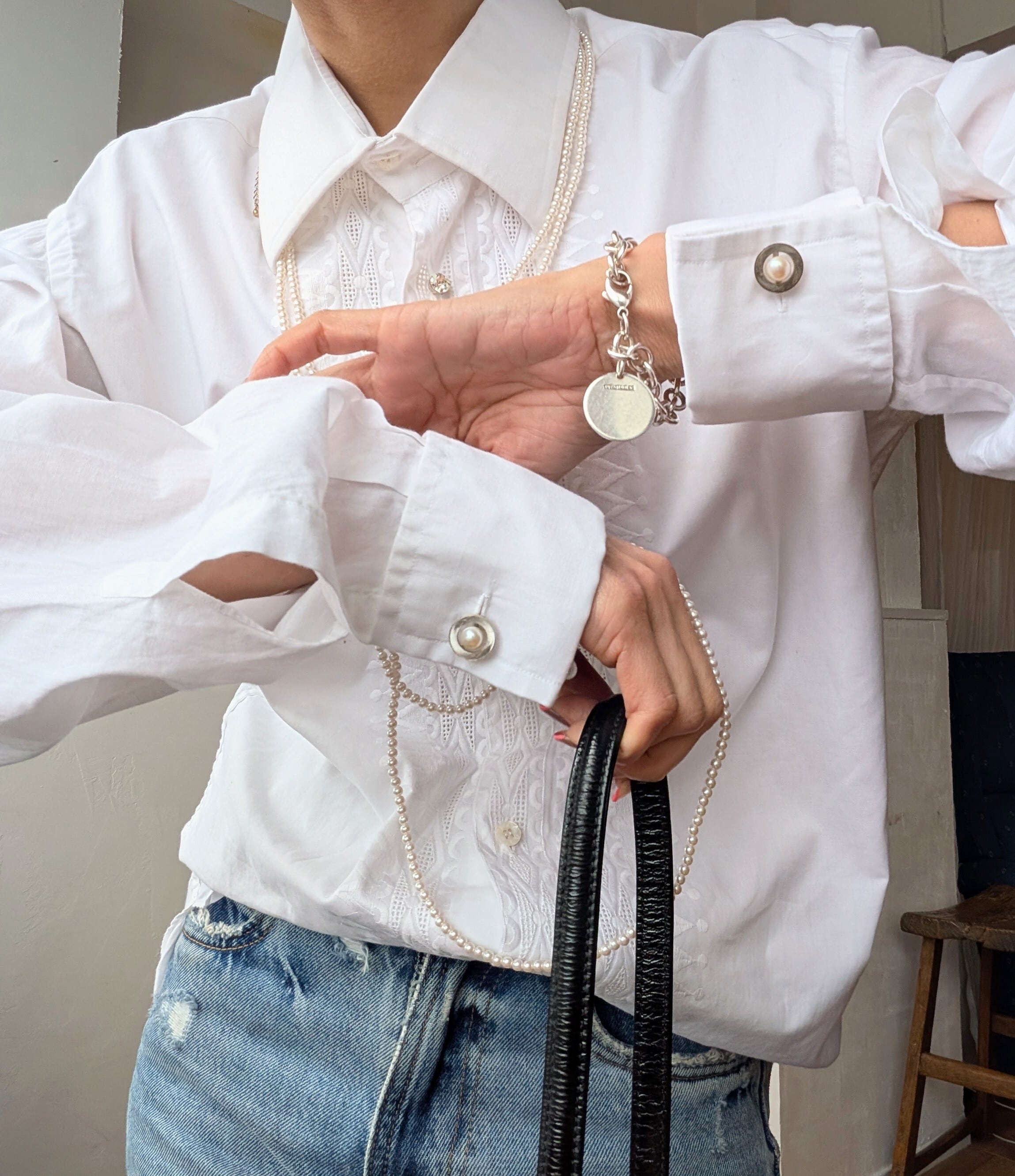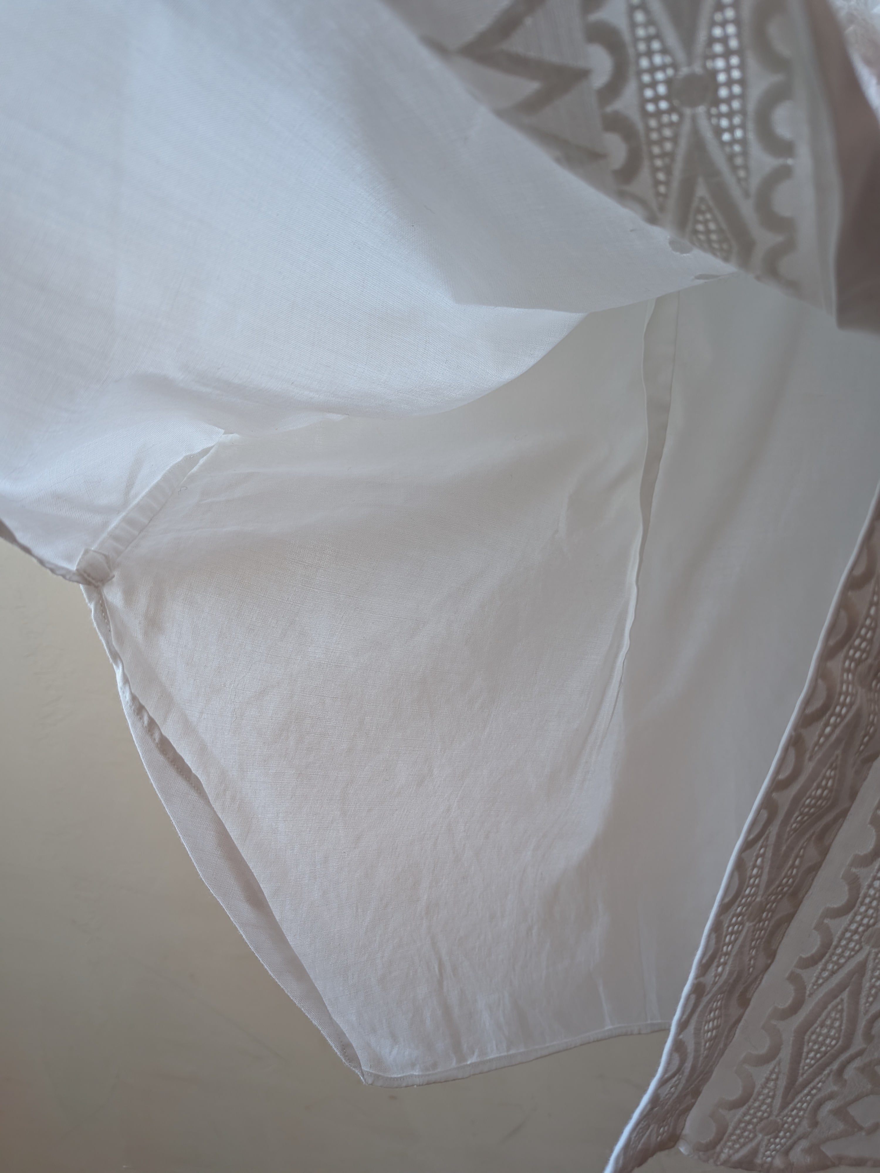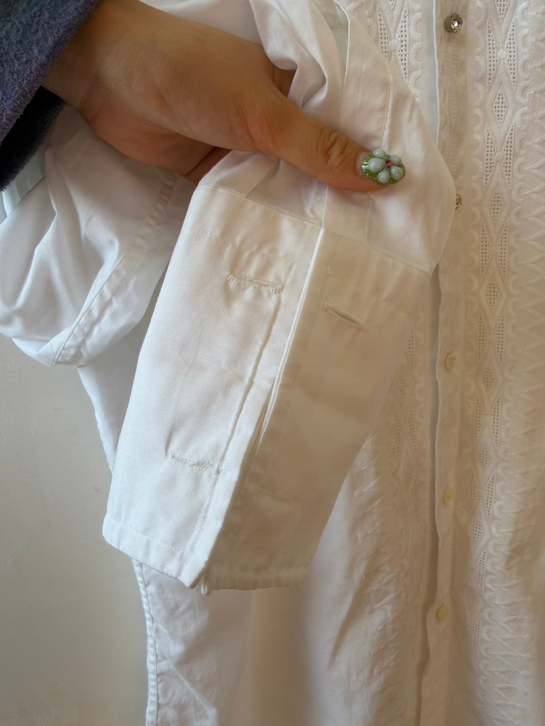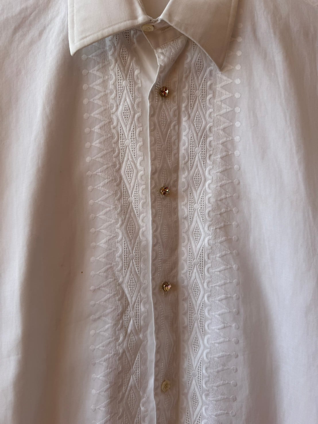 繊細な刺繍が施されたItaly製vintage shirt。長めのカフスにパールのカフスボタン付き。