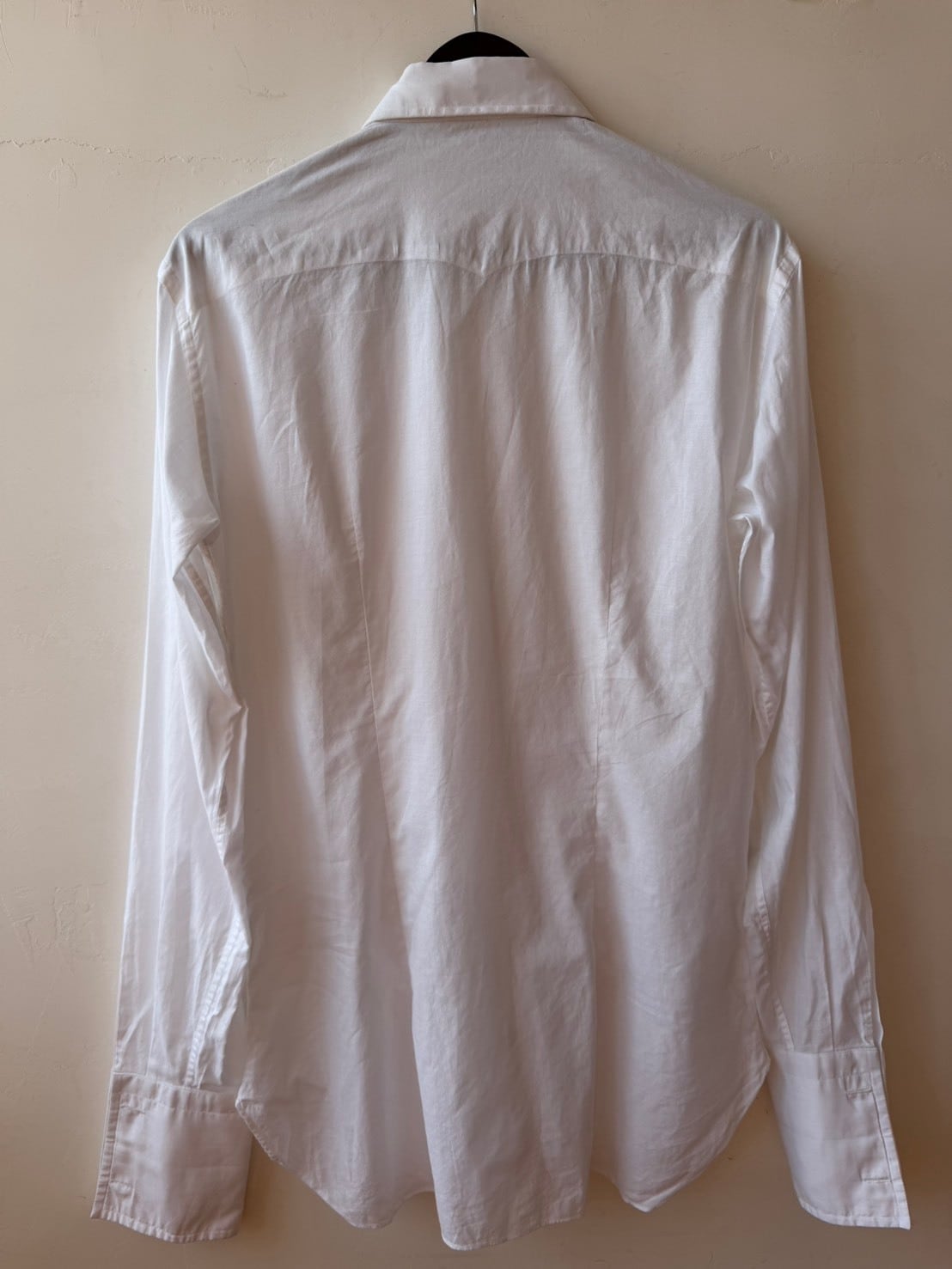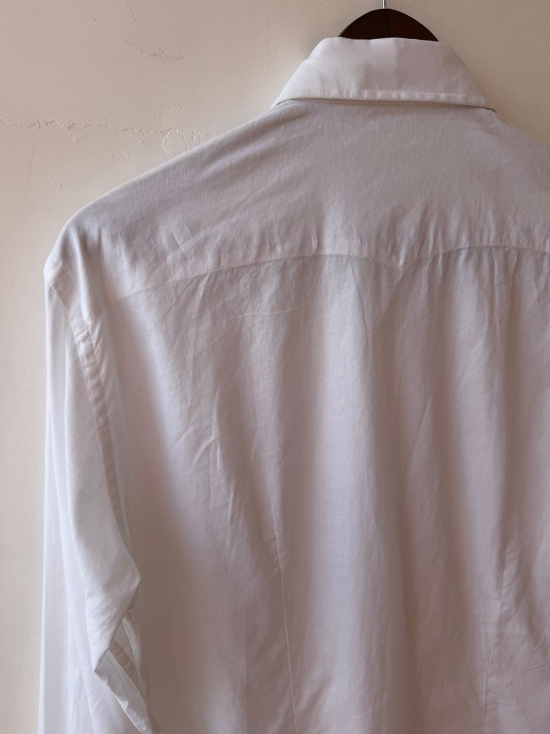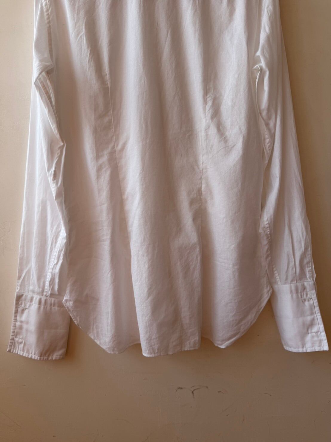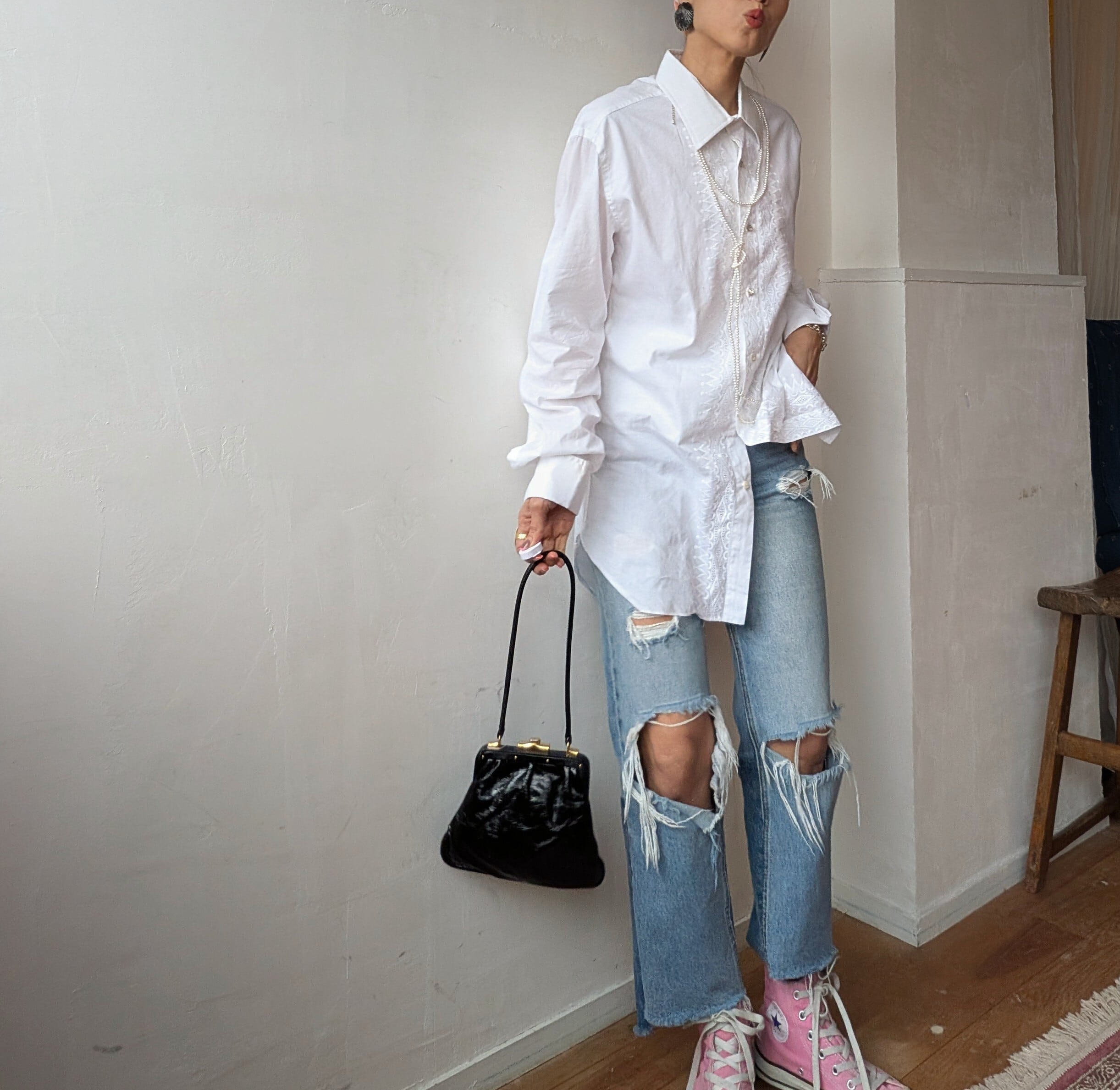 繊細な刺繍が施されたItaly製vintage shirt。長めのカフスにパールのカフスボタン付き。
