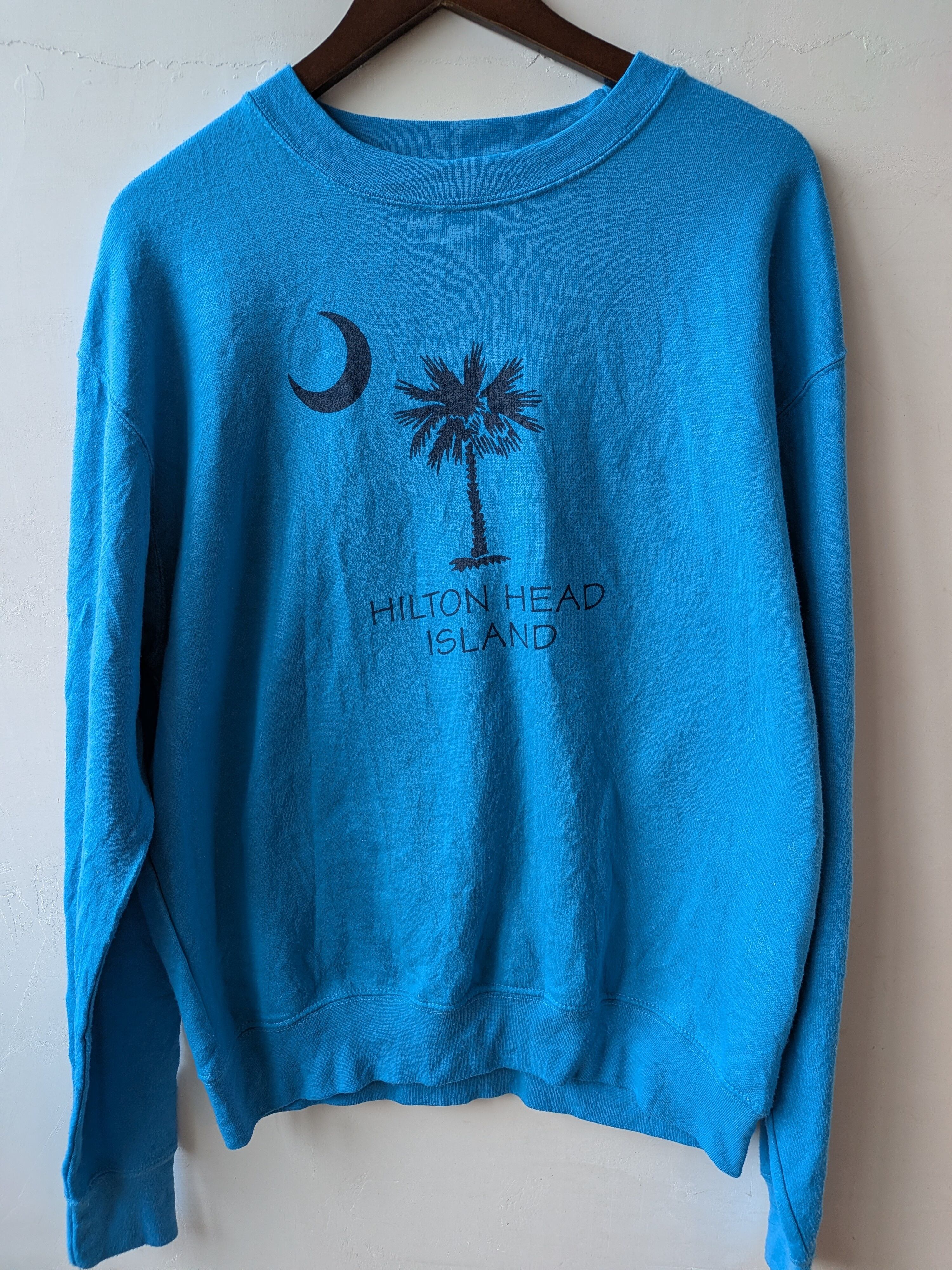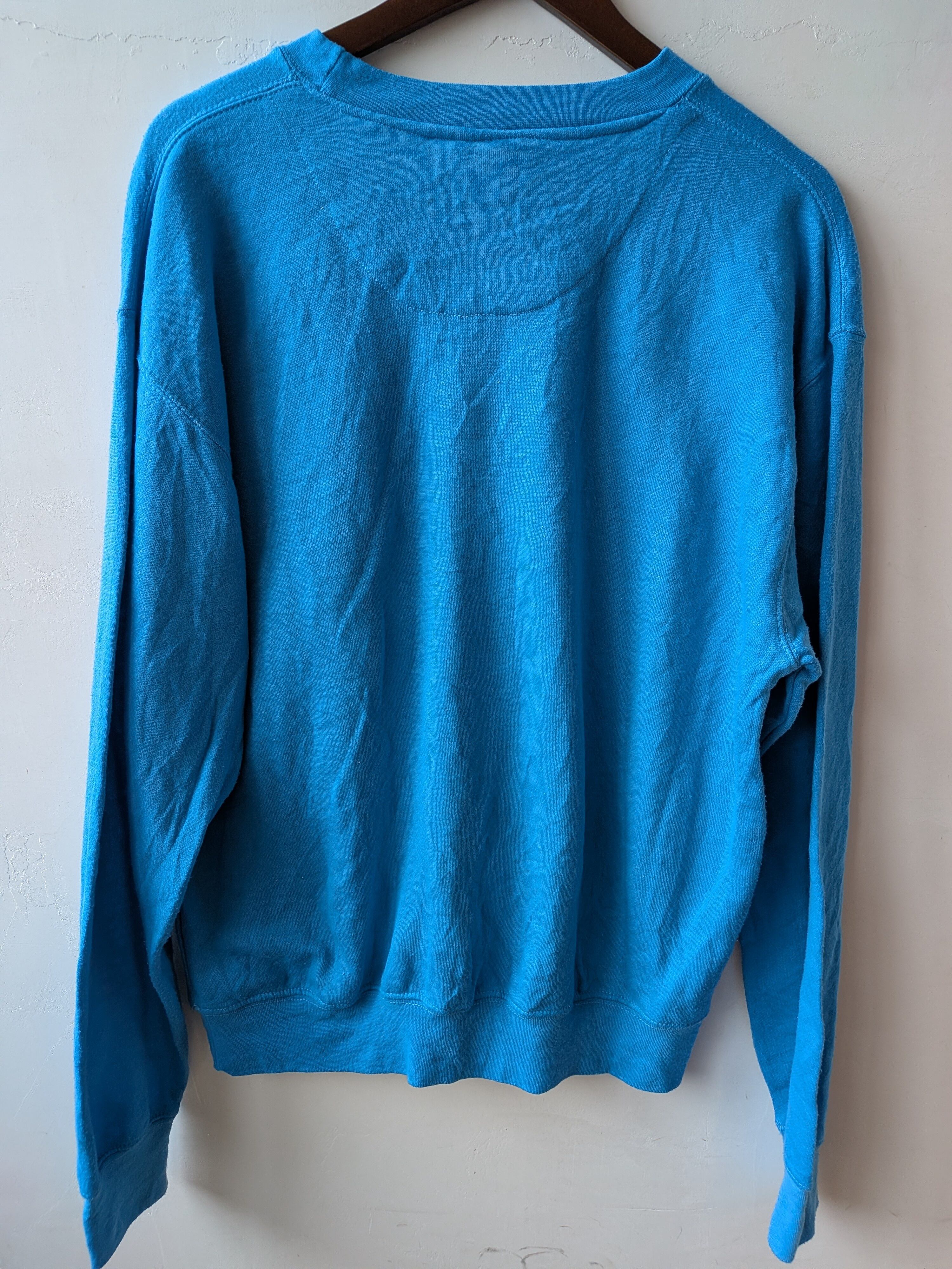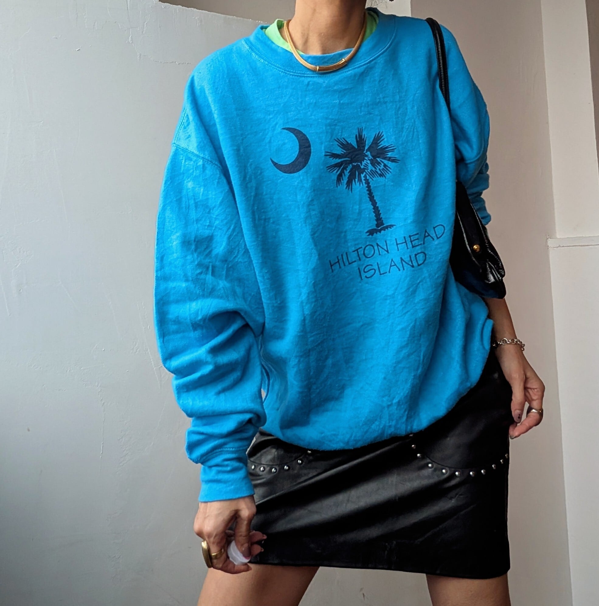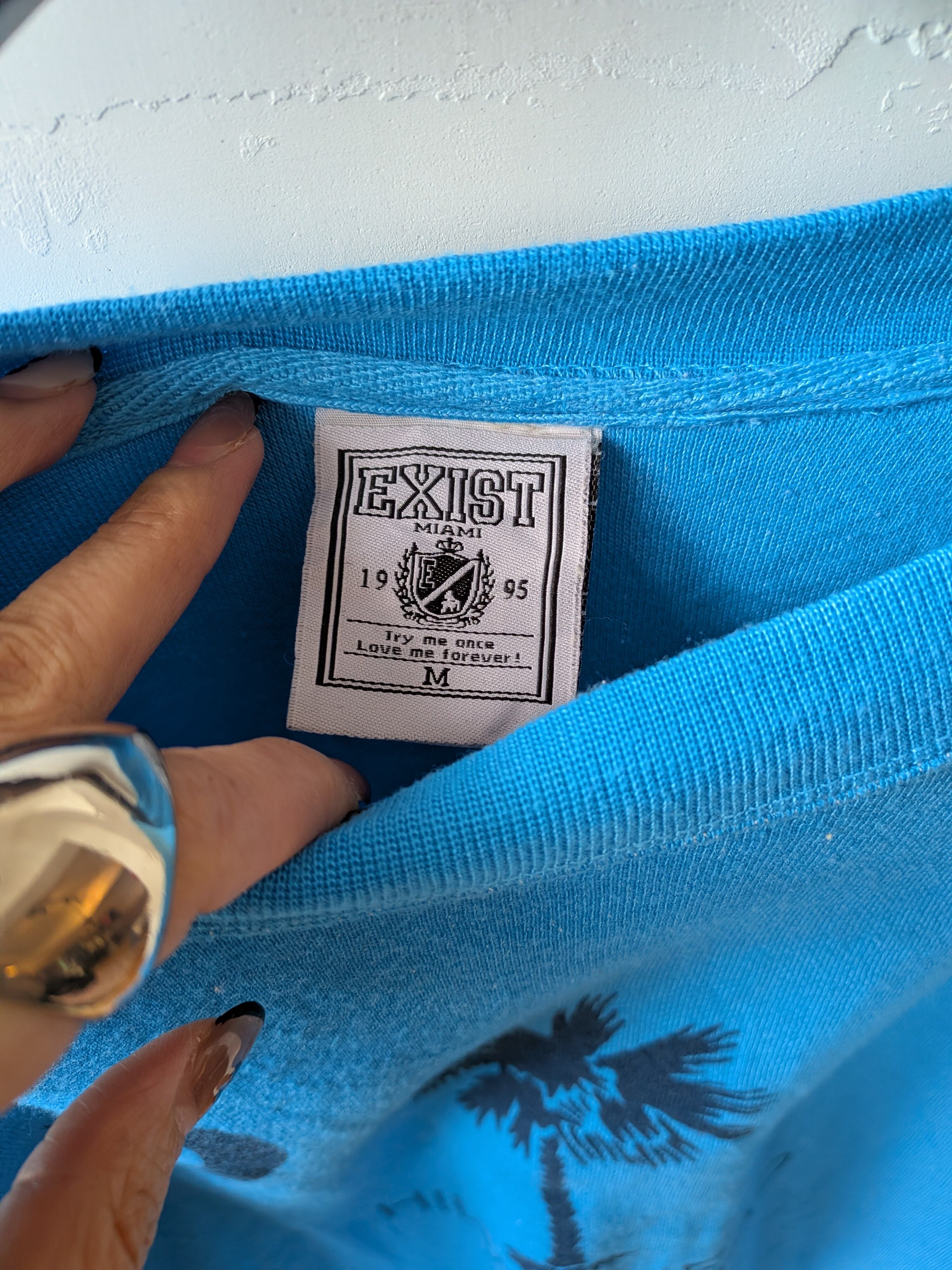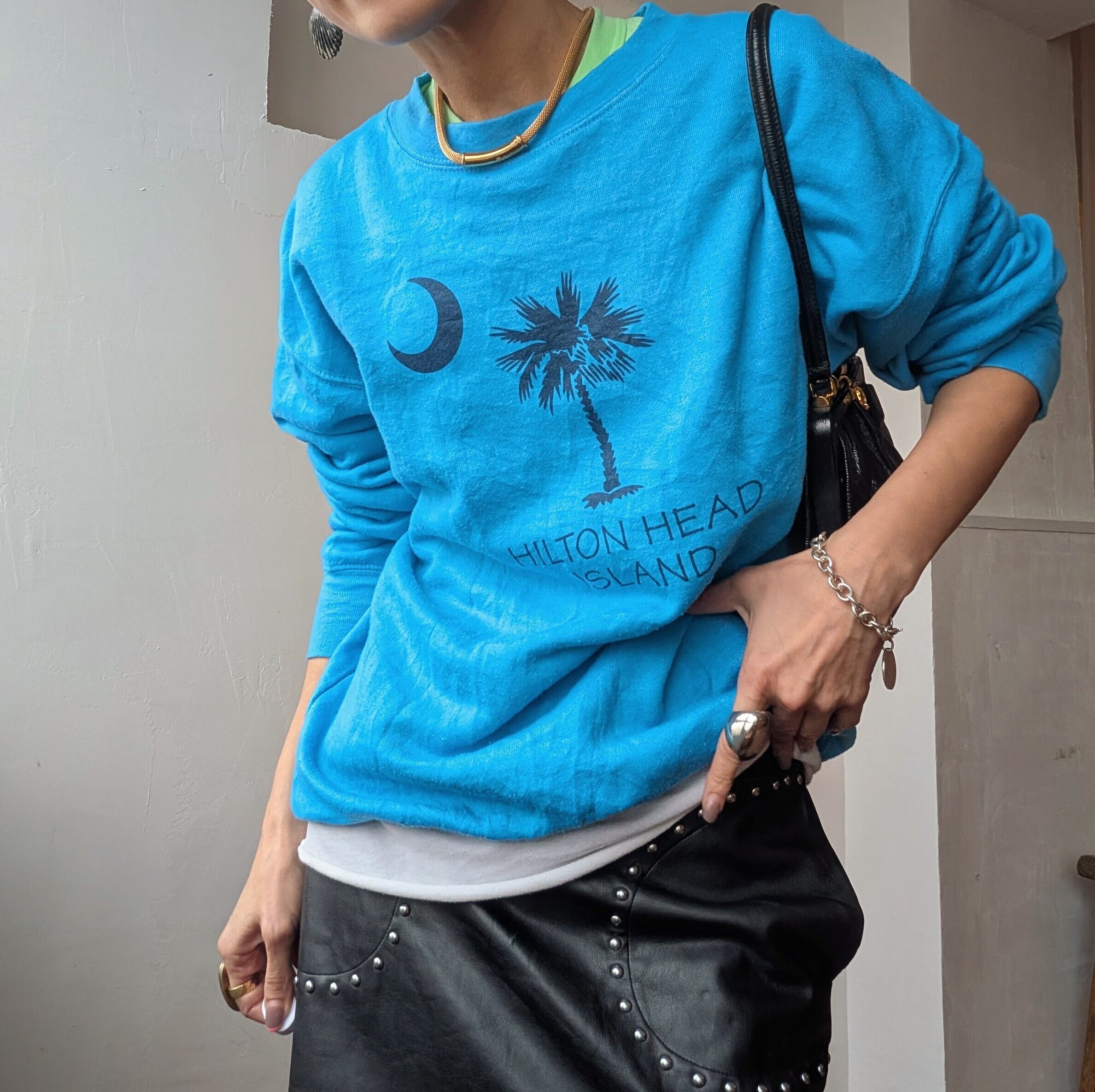 パームツリーのデザインが特徴的なUSA90年代スウェット。華やかなトロピカルスタイルで、ターコイズブルーが目を惹く1点。