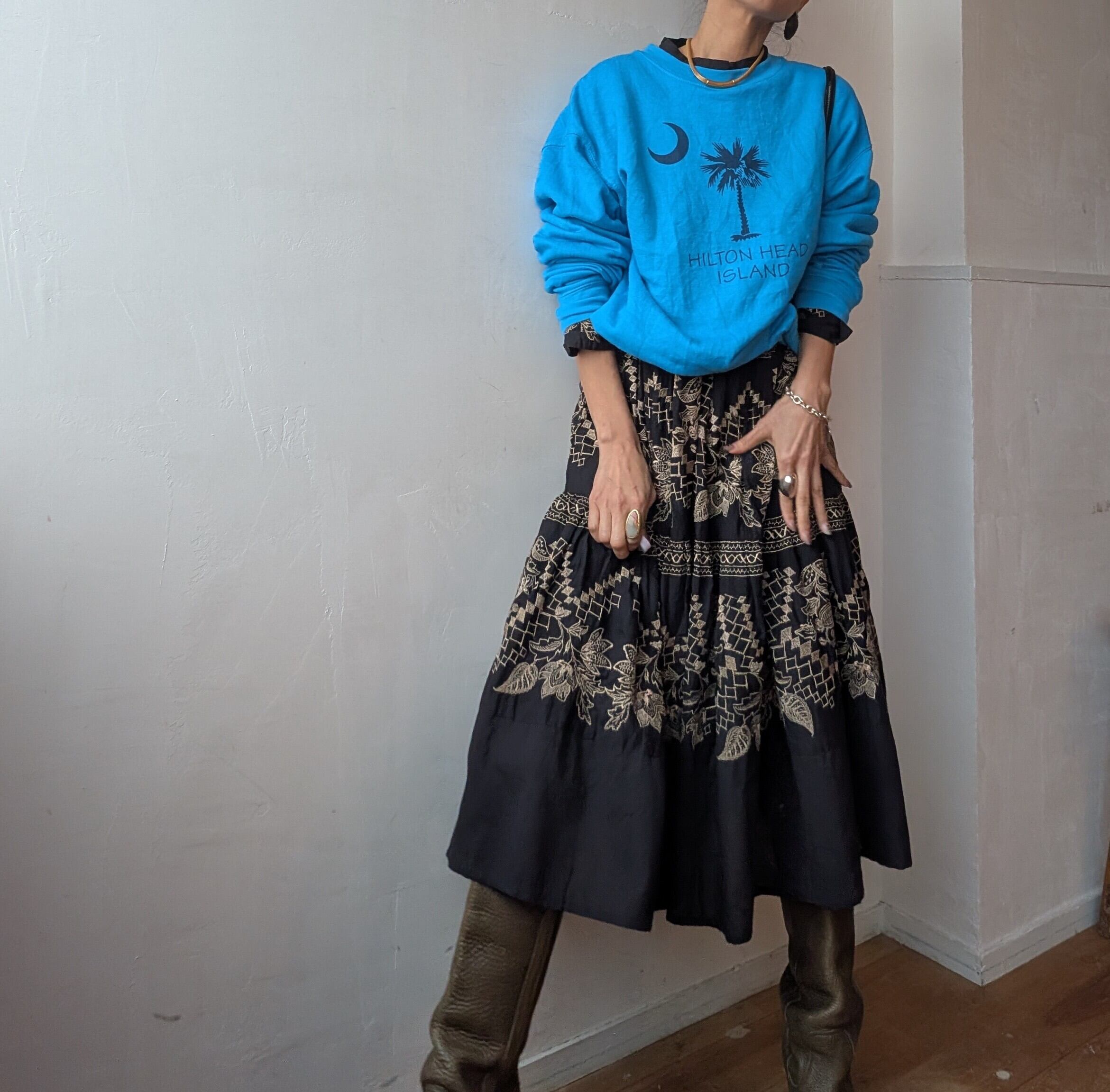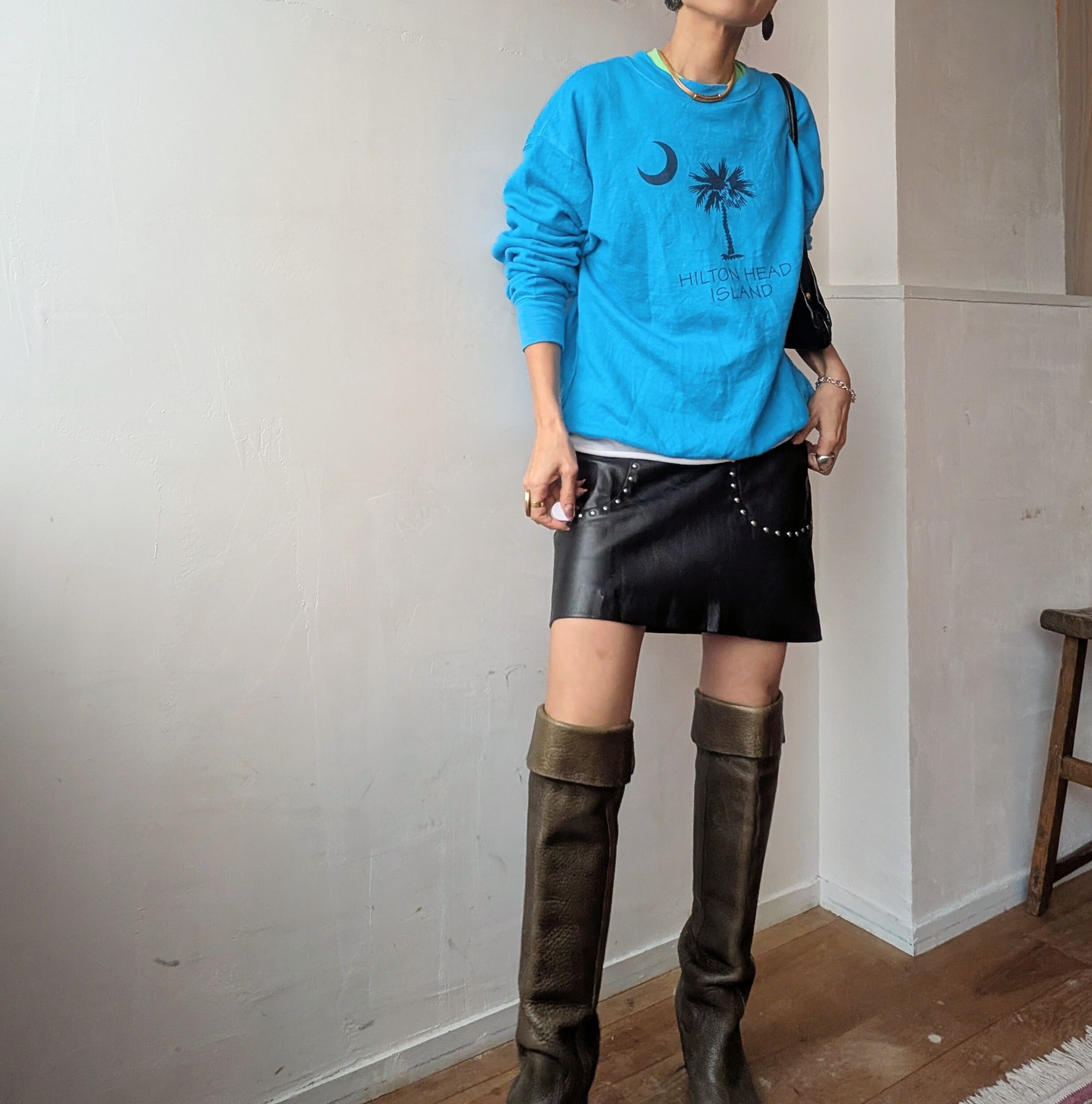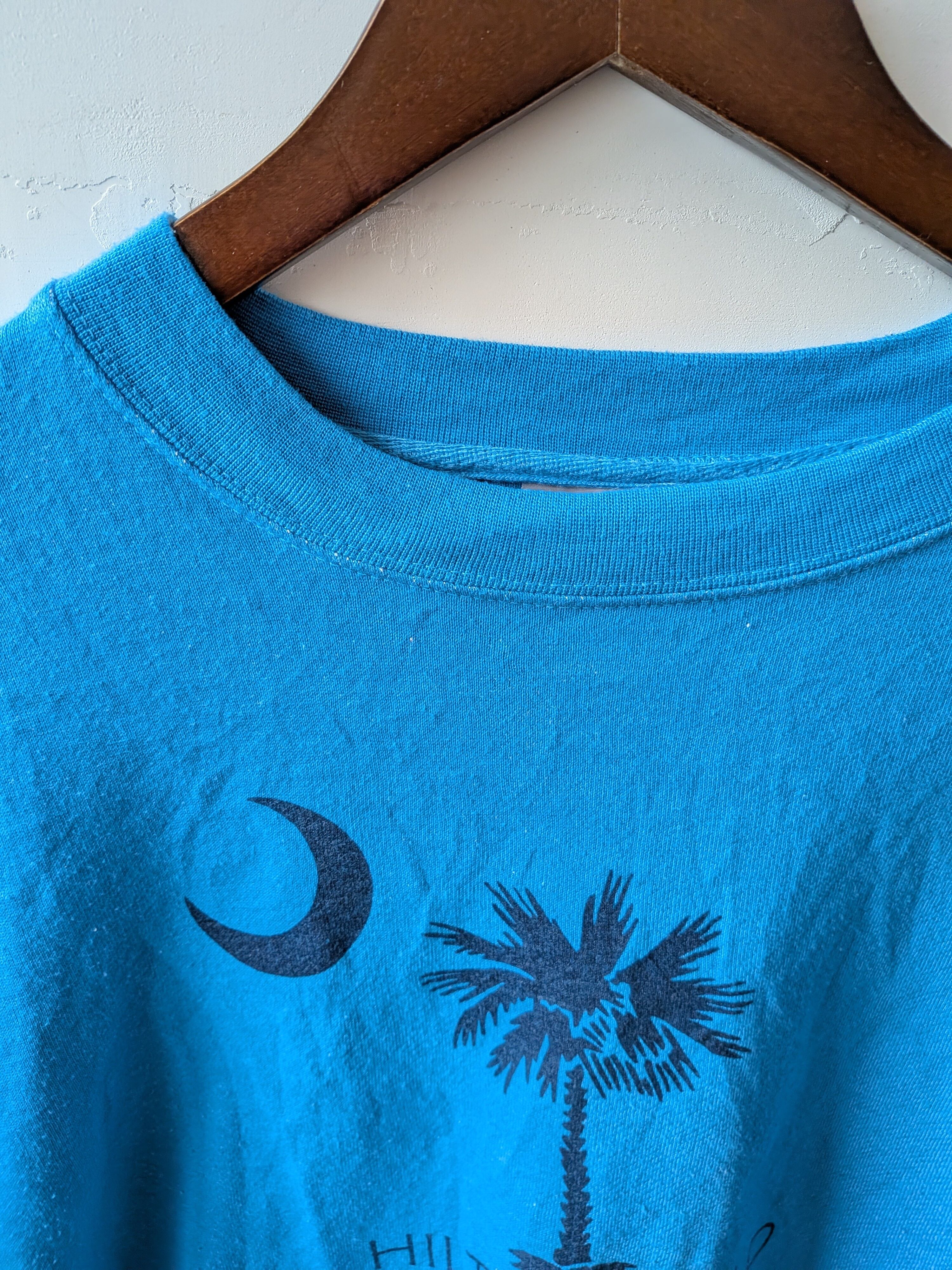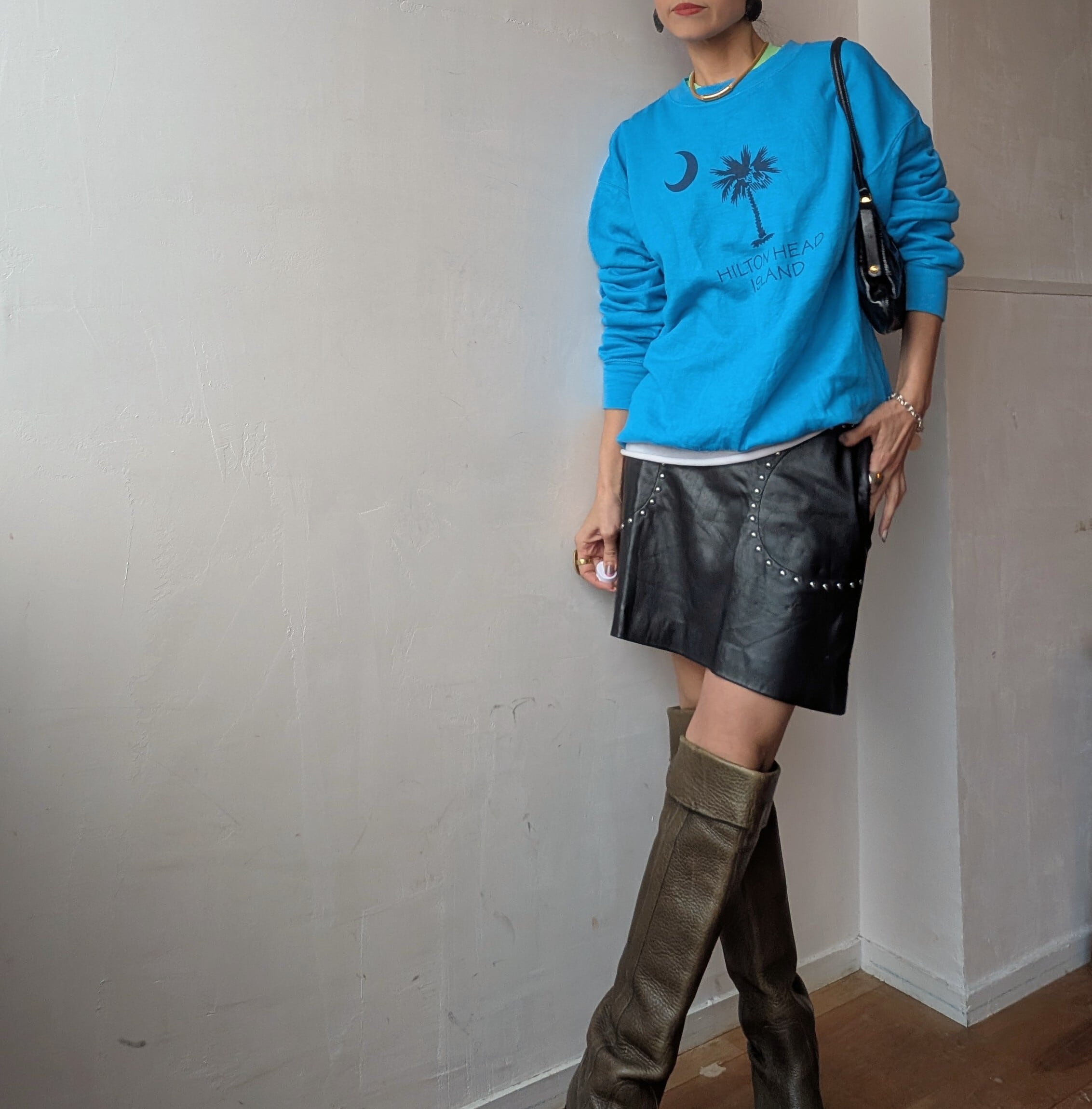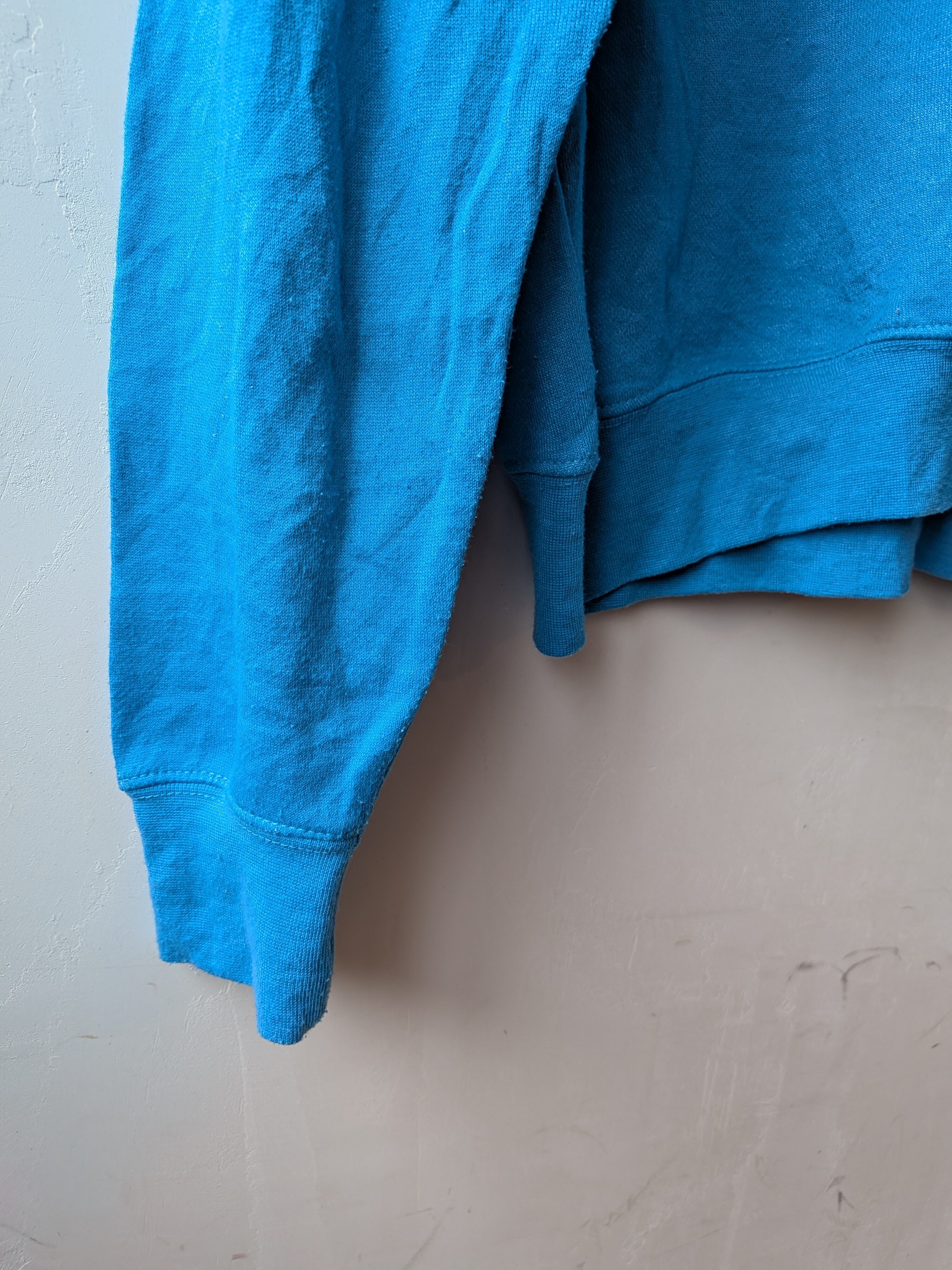 パームツリーのデザインが特徴的なUSA90年代スウェット。華やかなトロピカルスタイルで、ターコイズブルーが目を惹く1点。