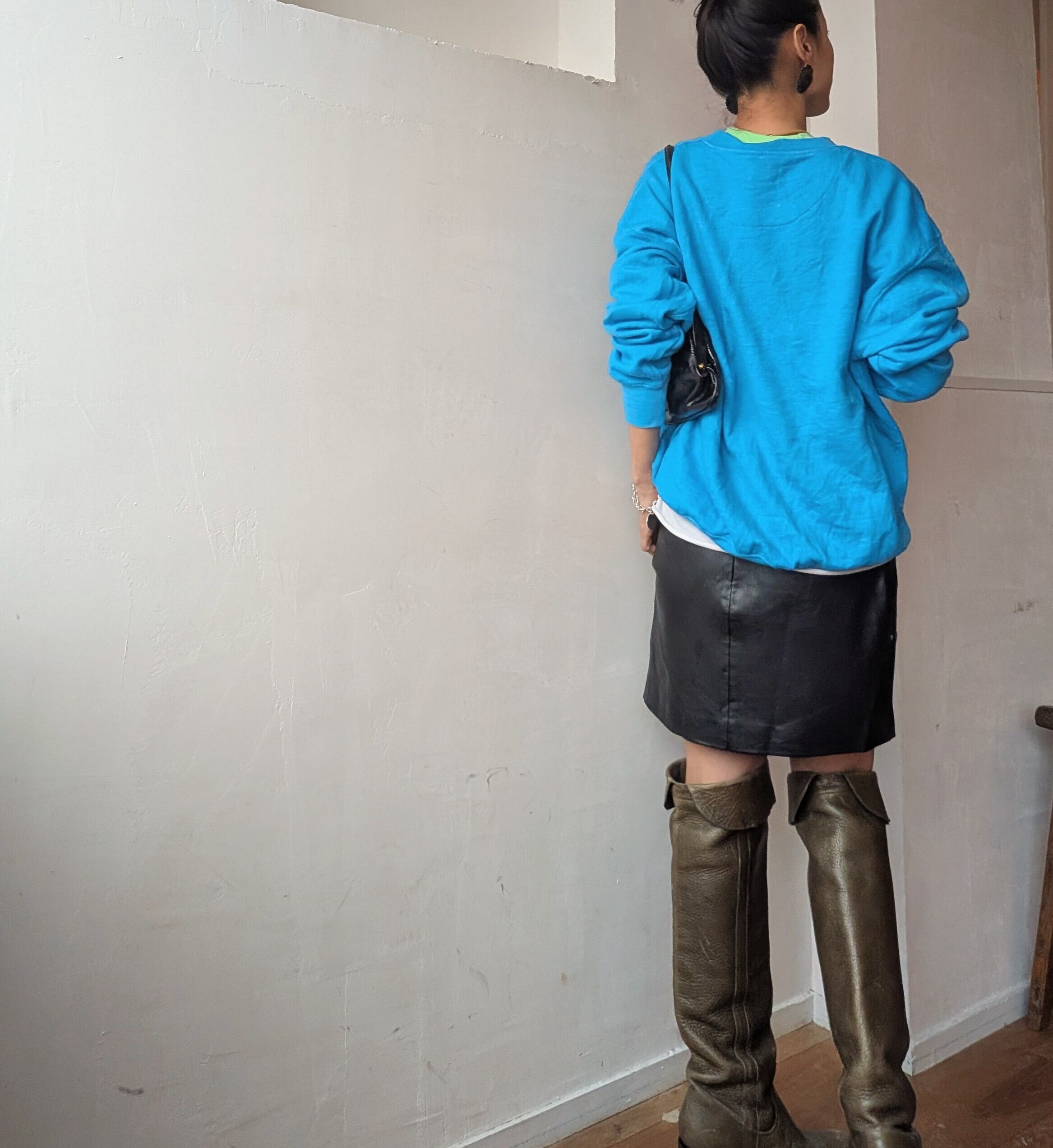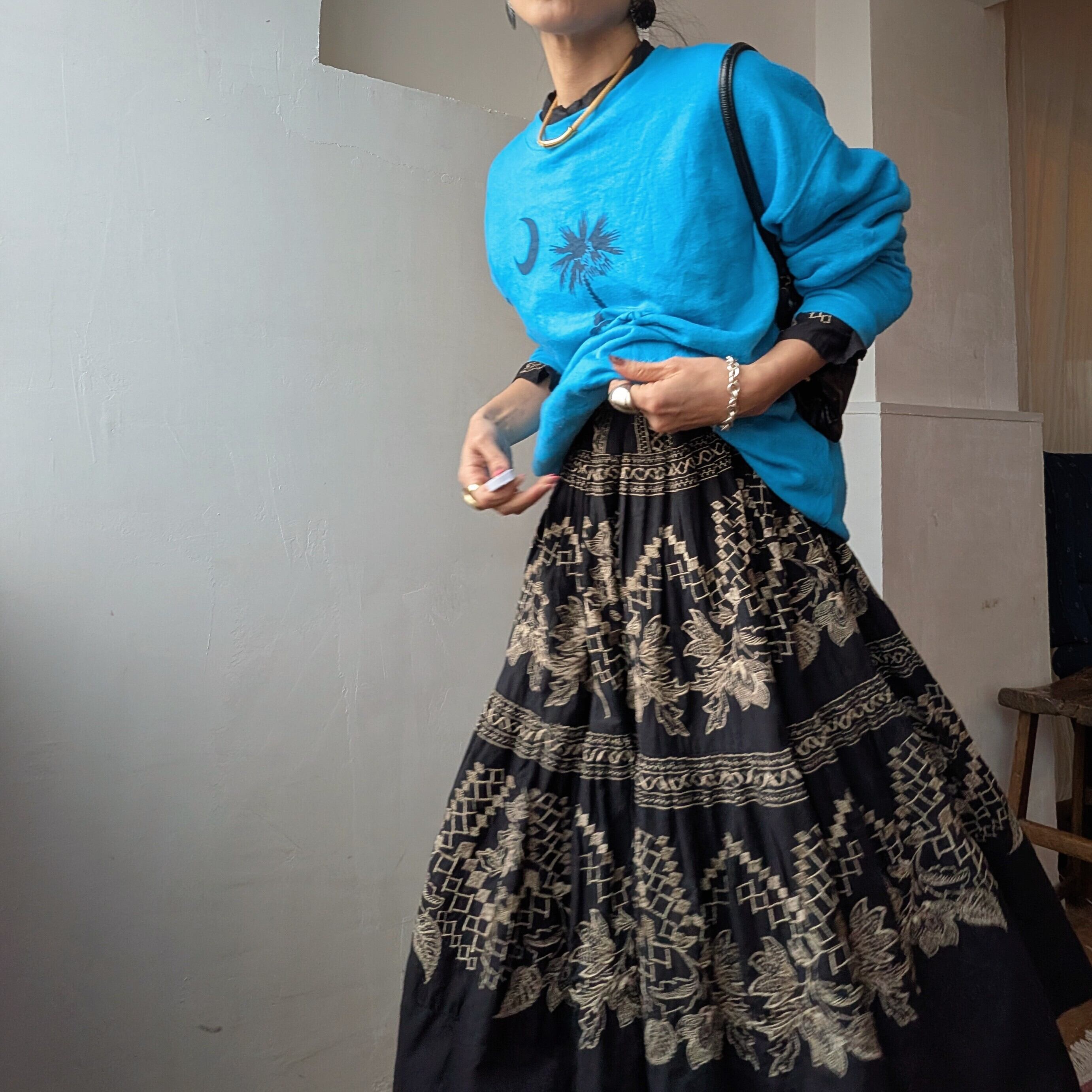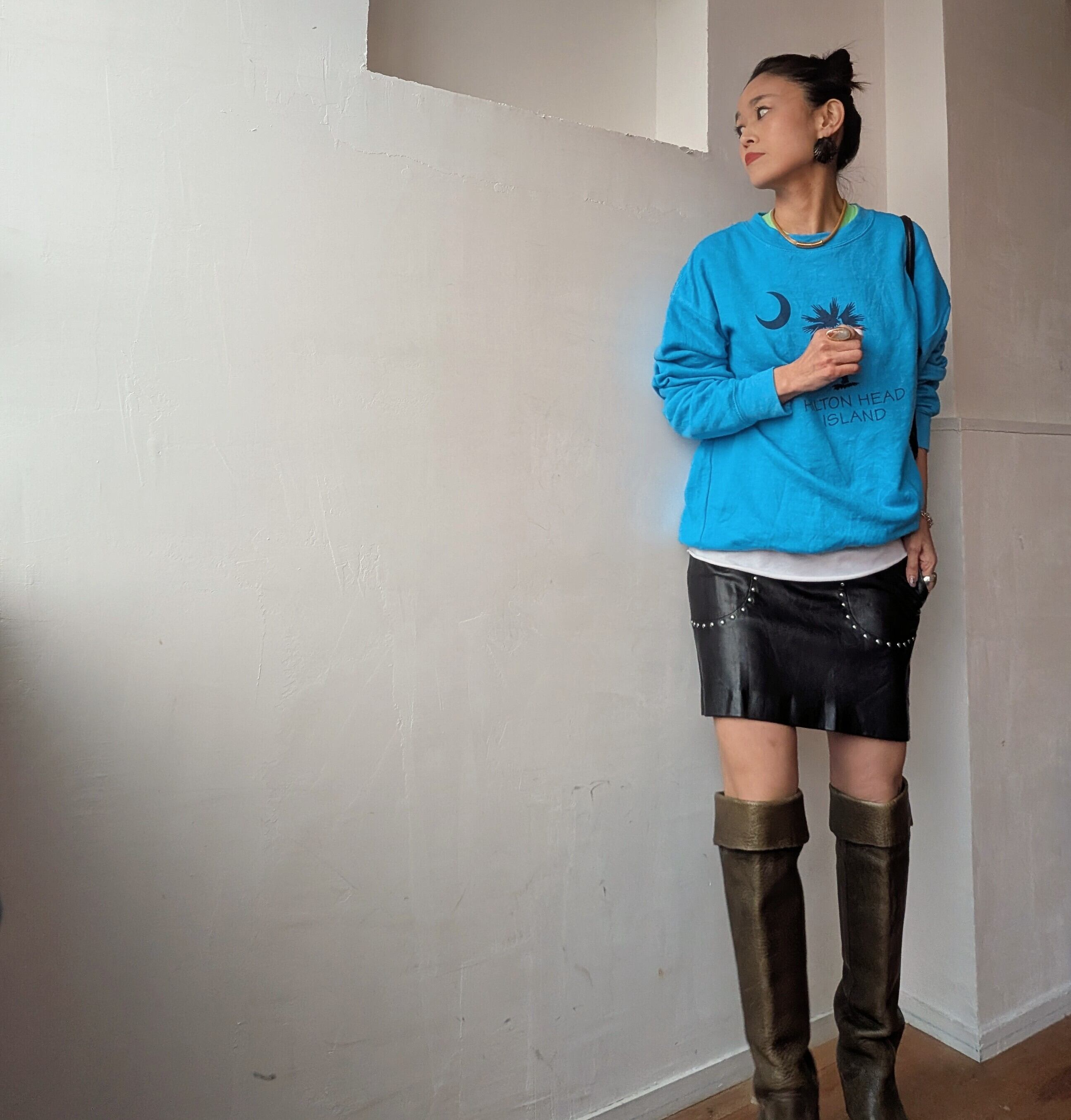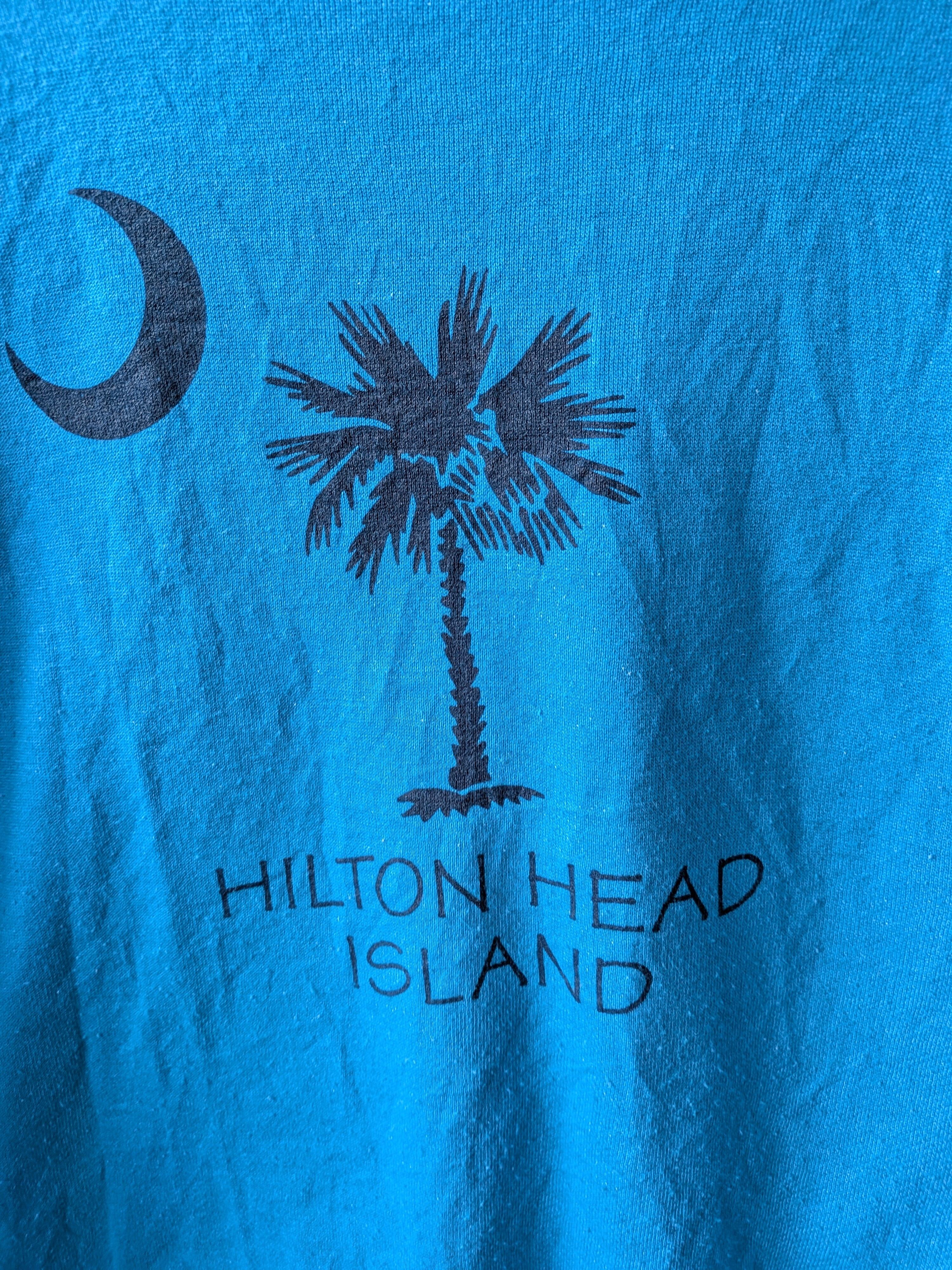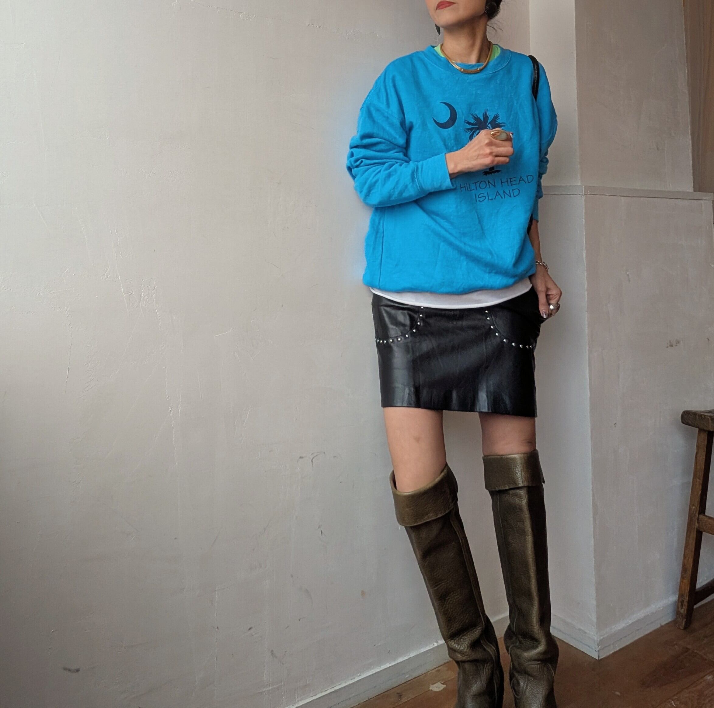 パームツリーのデザインが特徴的なUSA90年代スウェット。華やかなトロピカルスタイルで、ターコイズブルーが目を惹く1点。