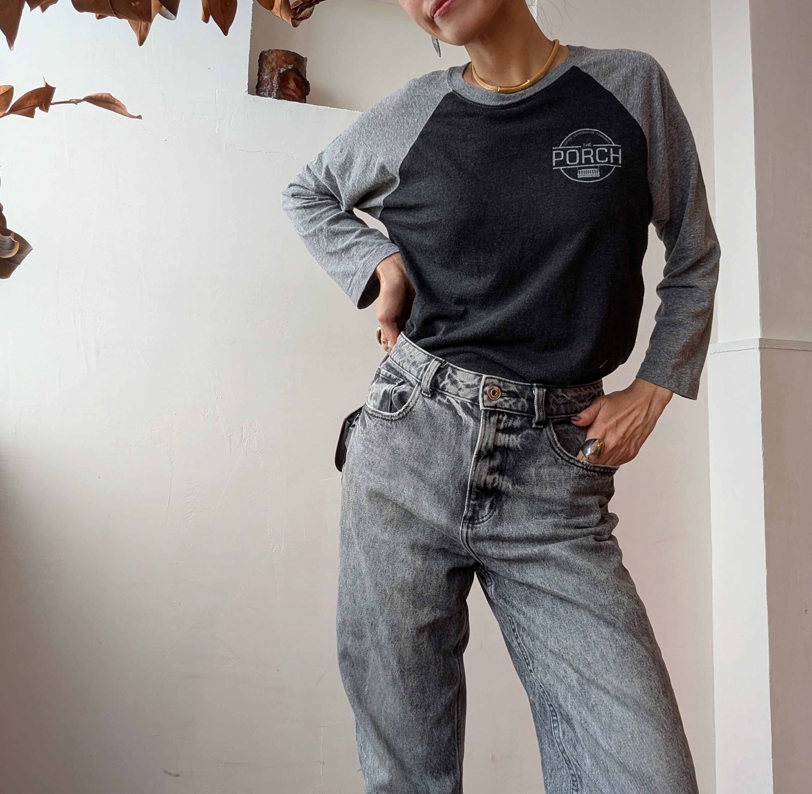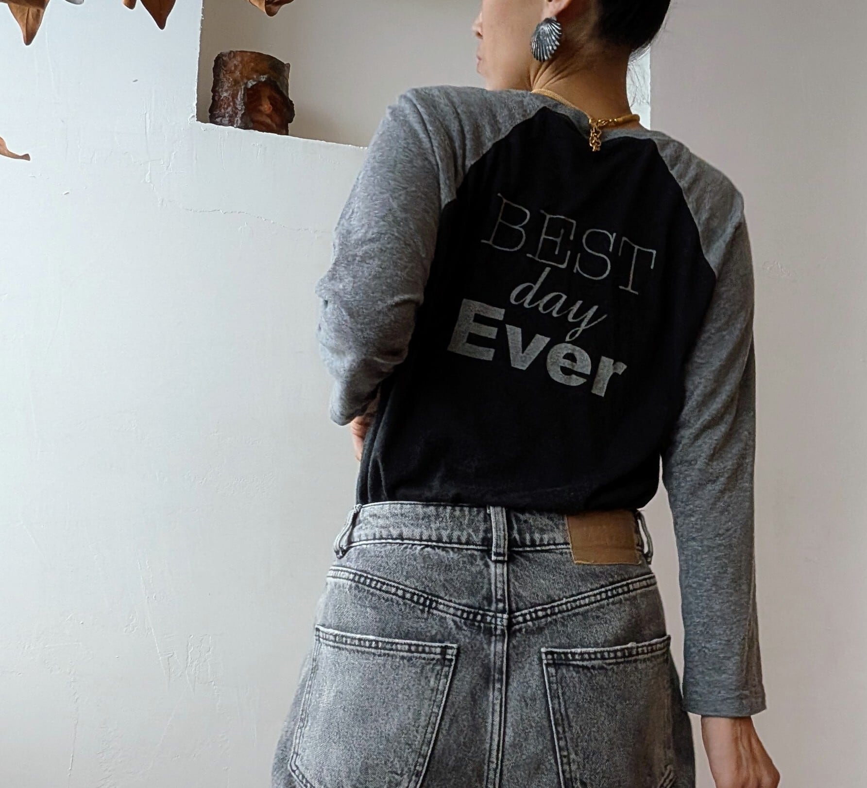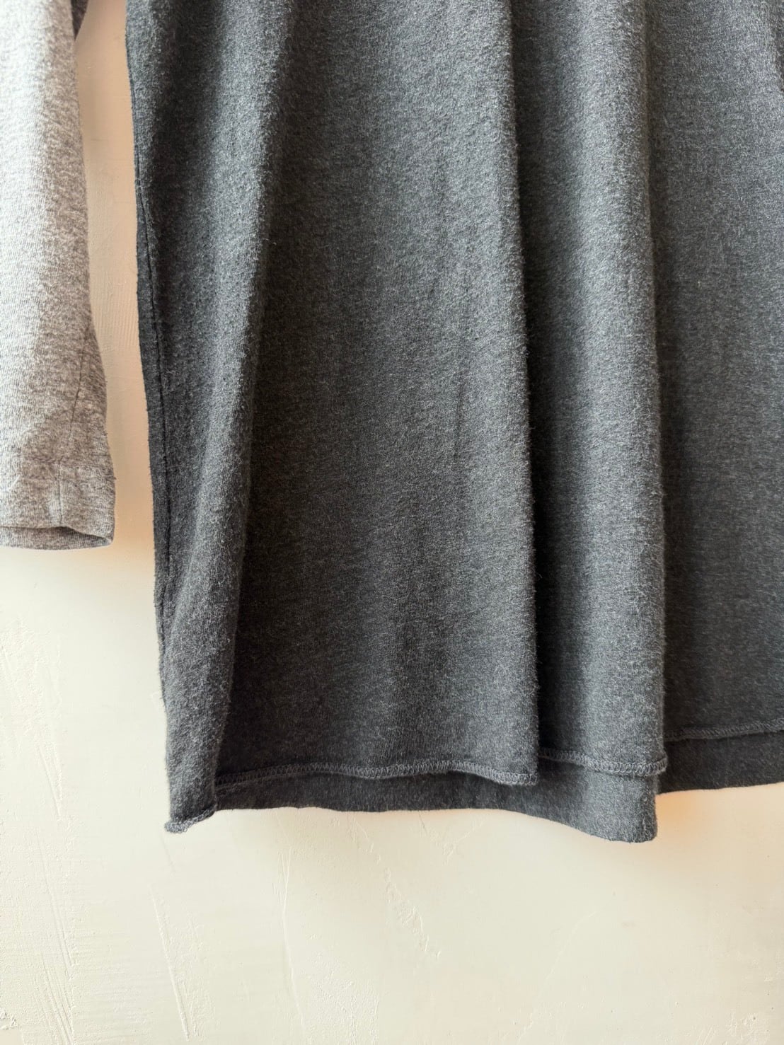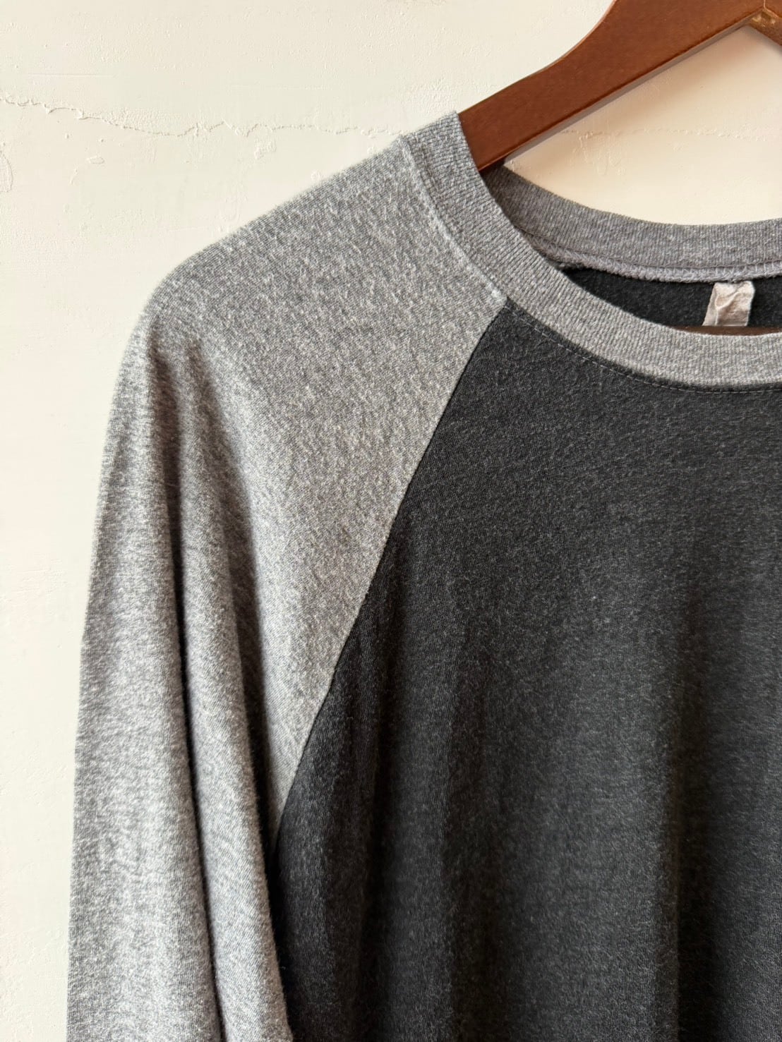 シンプルなデザインとBlack×greyカラーの落ちついたカラーが春におすすめのラグランスリーブTシャツ。