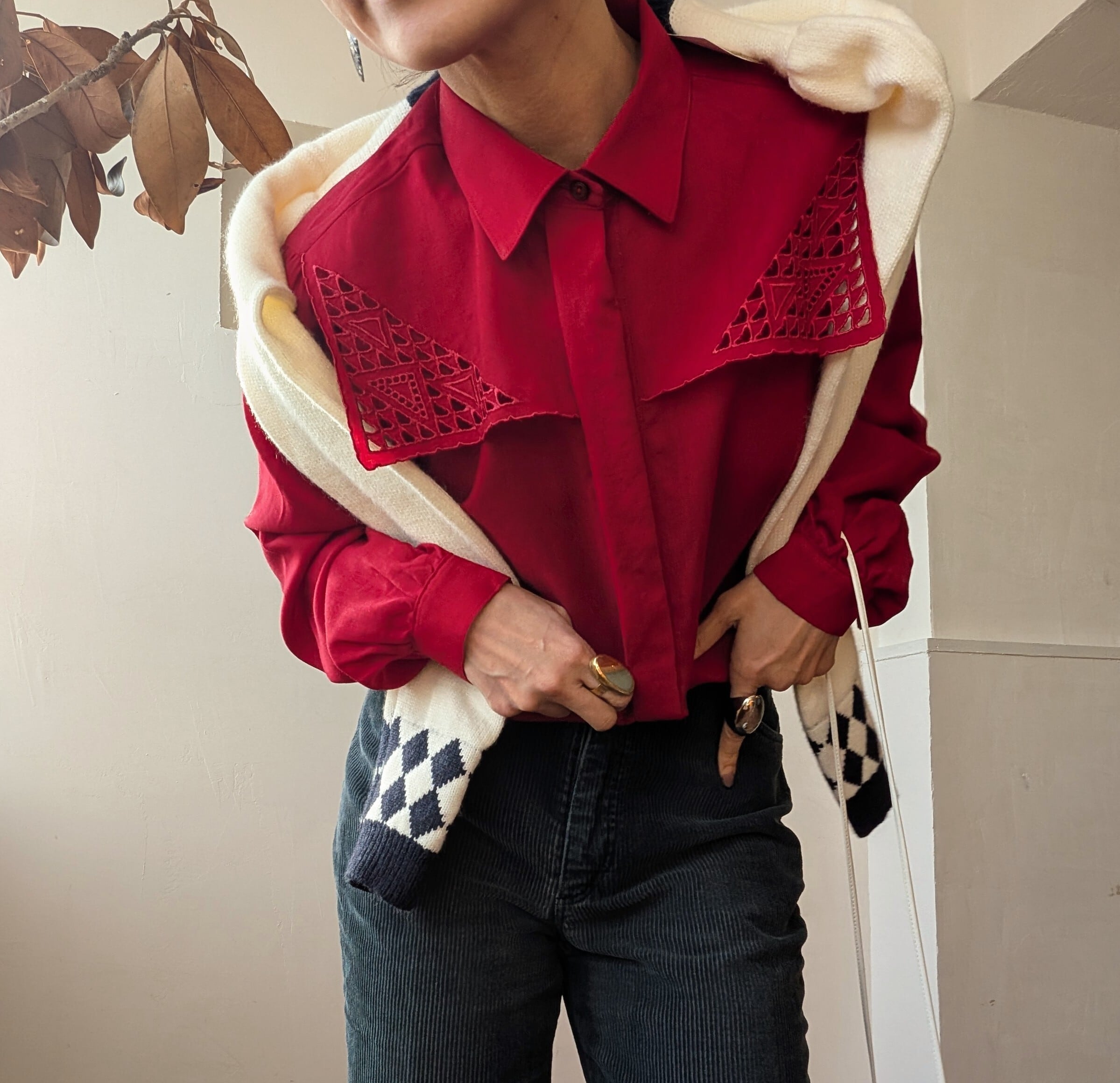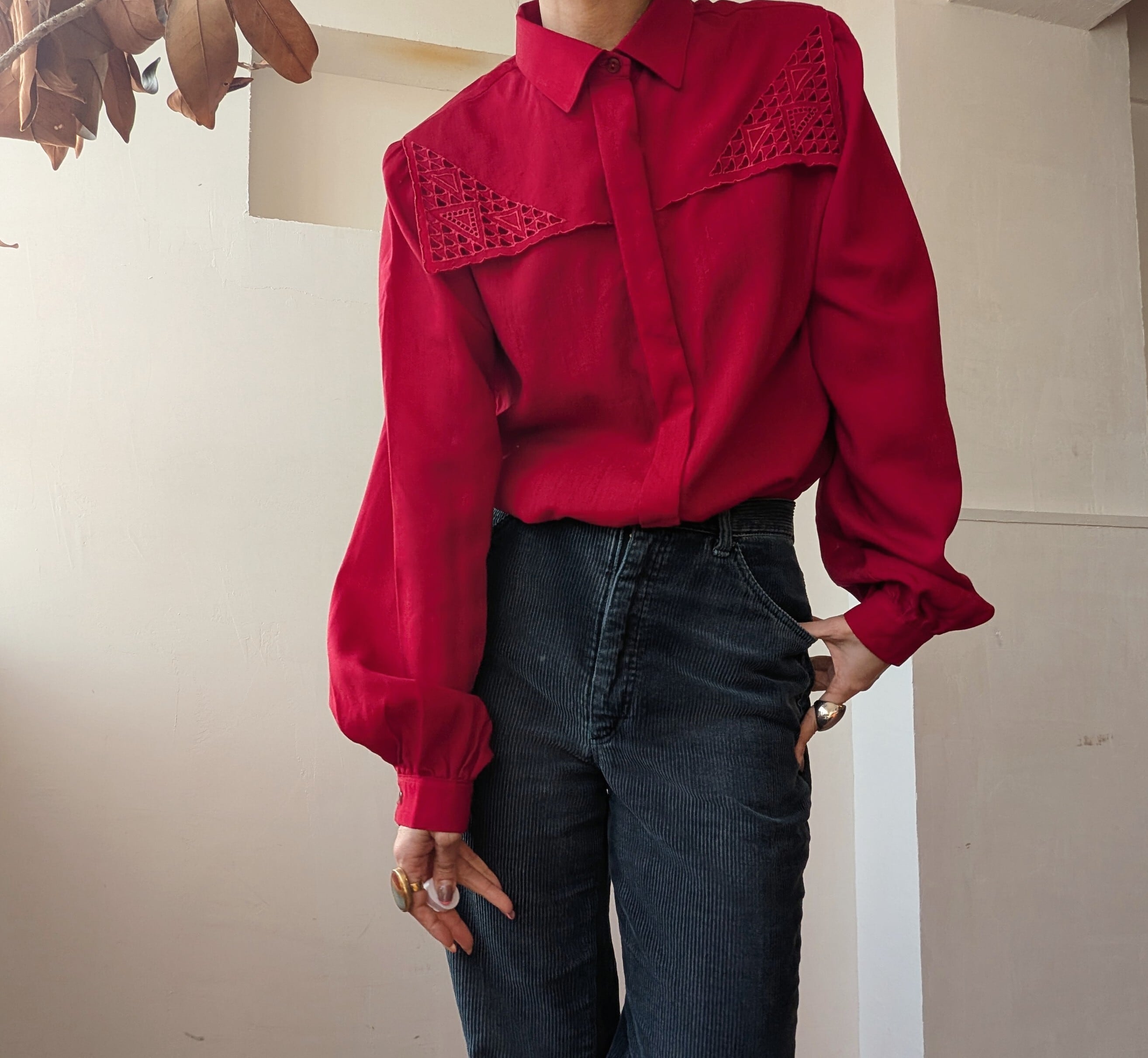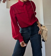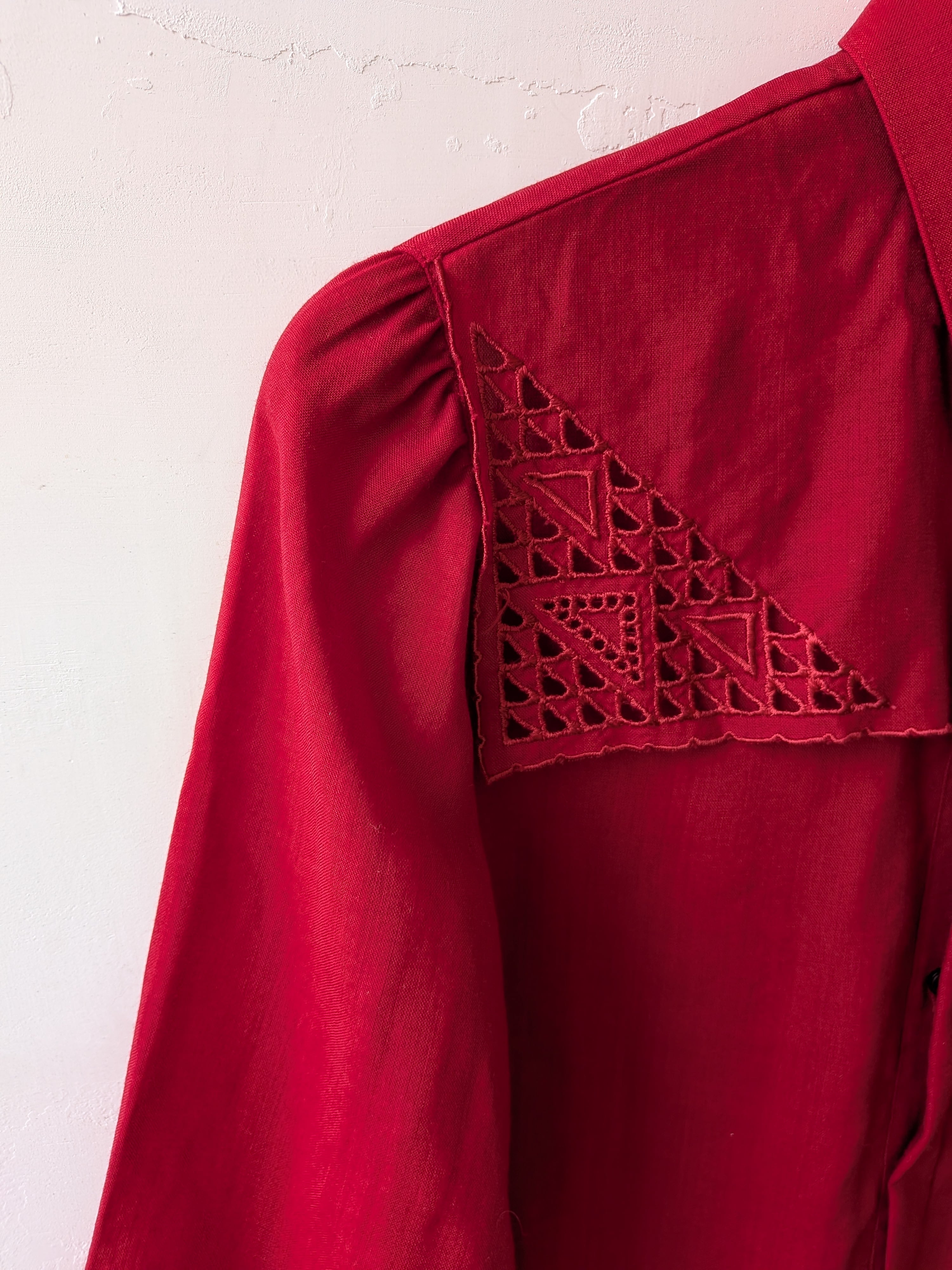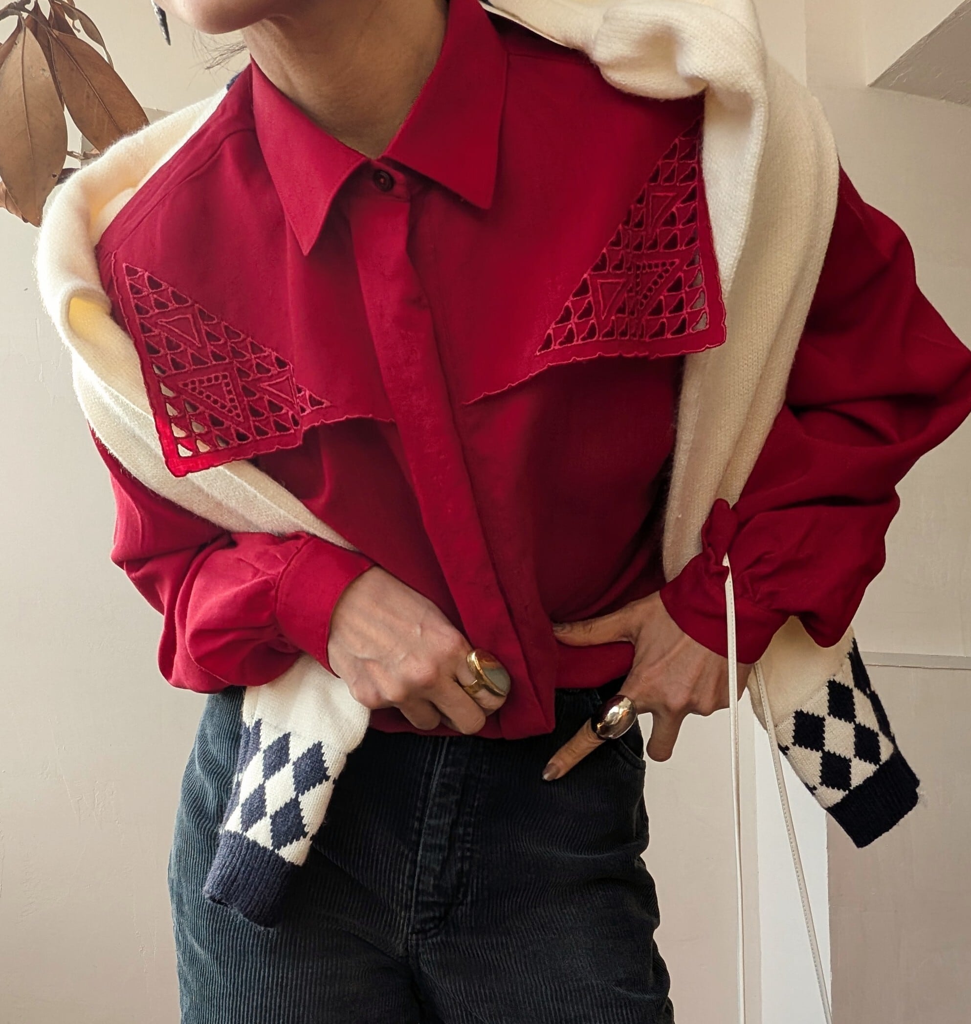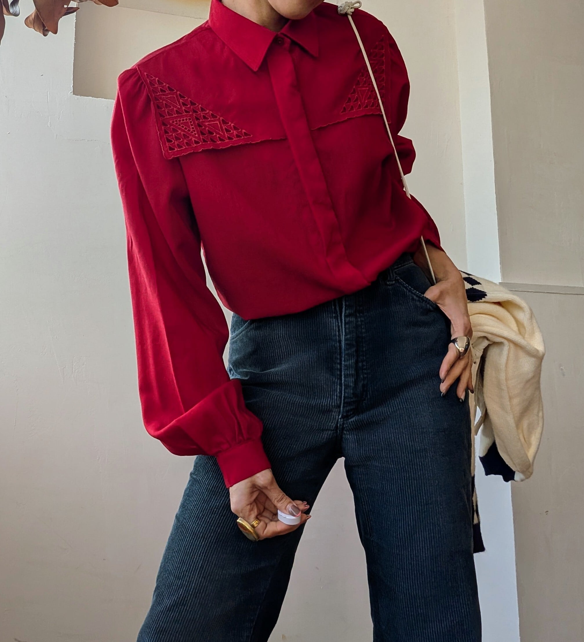 深みのある赤に可愛いらしいレースのショルダーデザインが、クラシックでレトロな雰囲気。