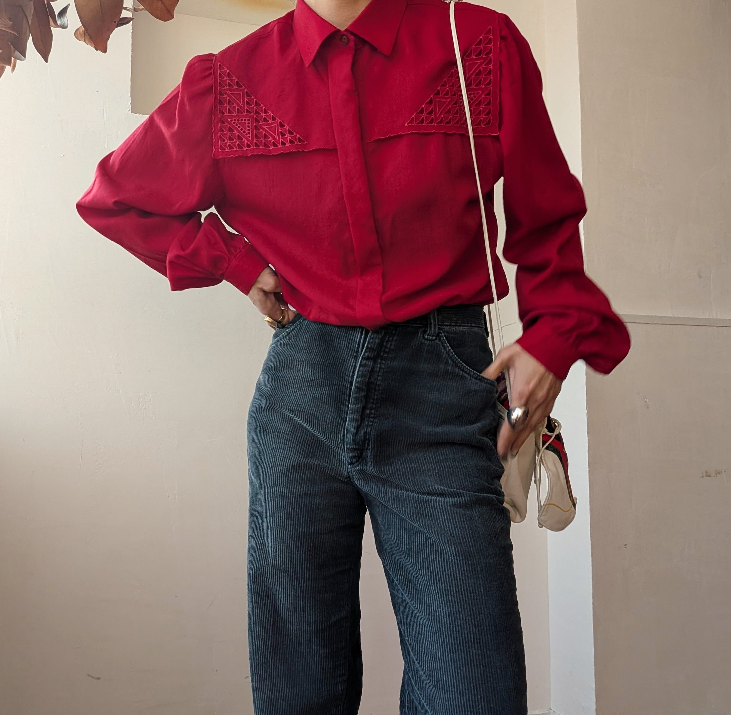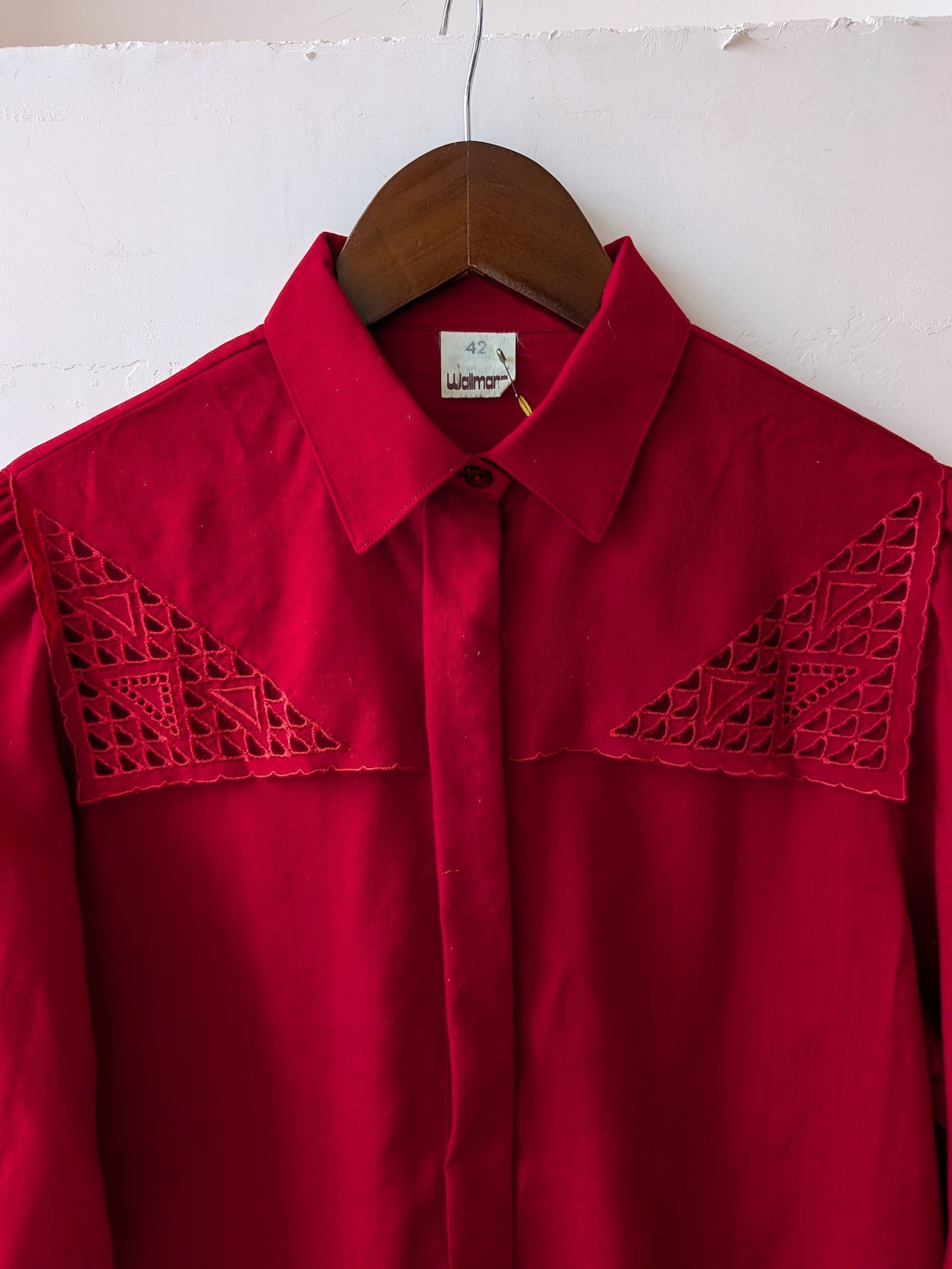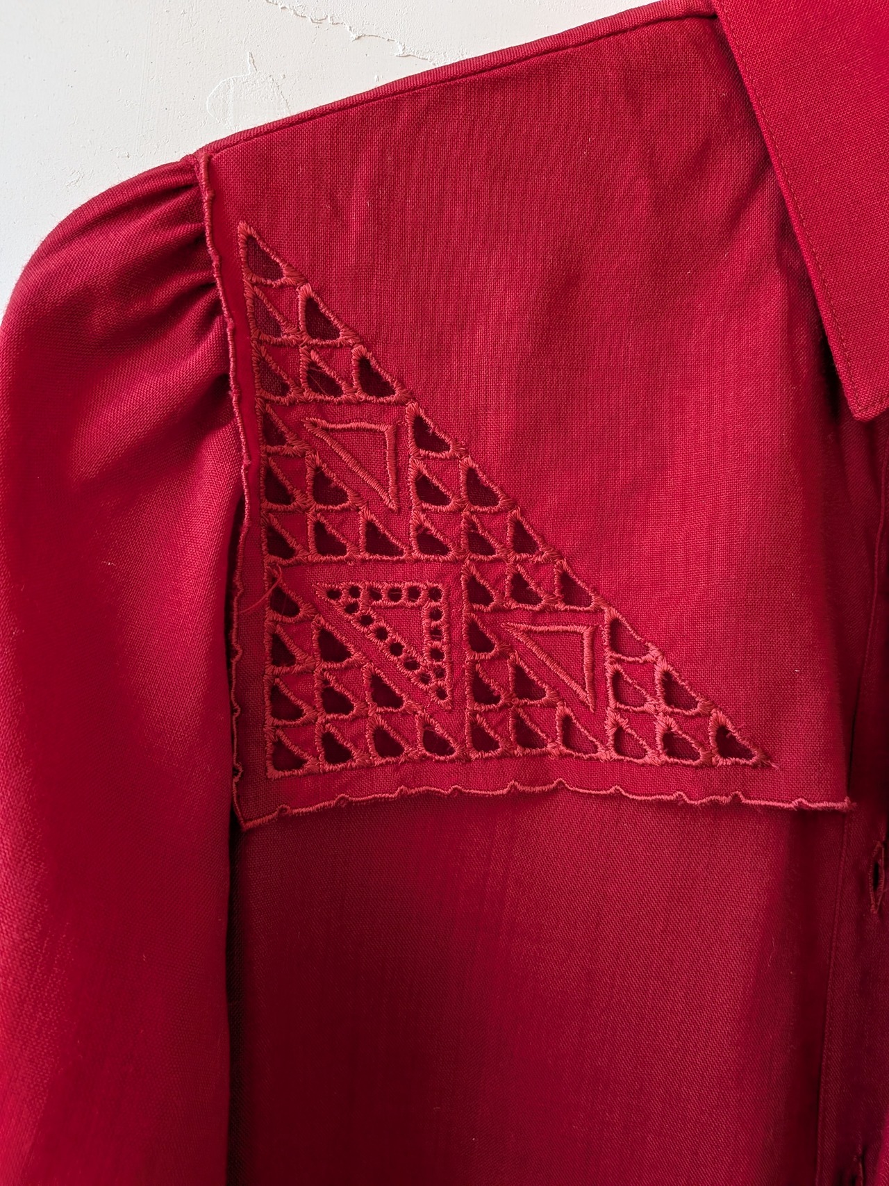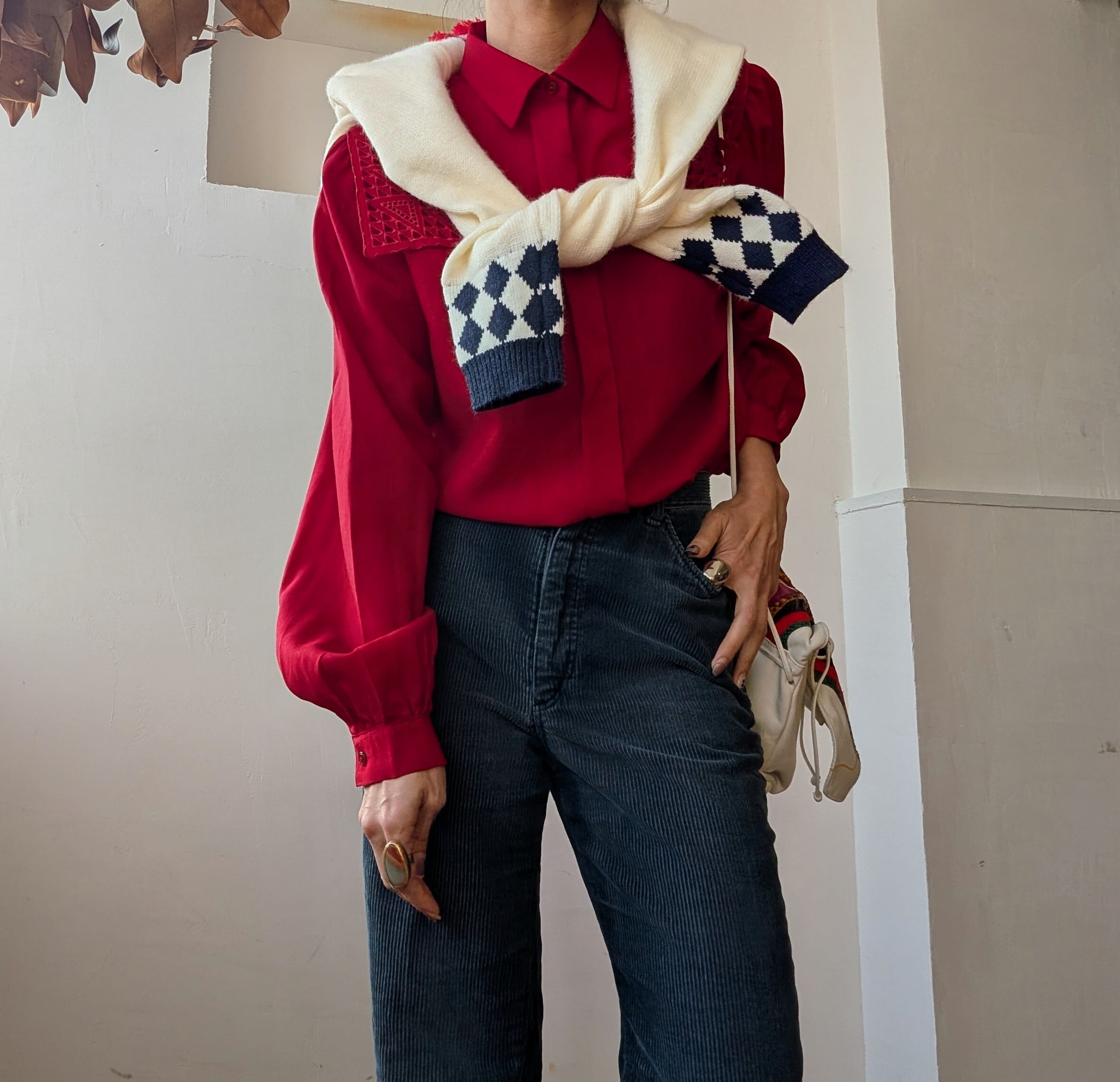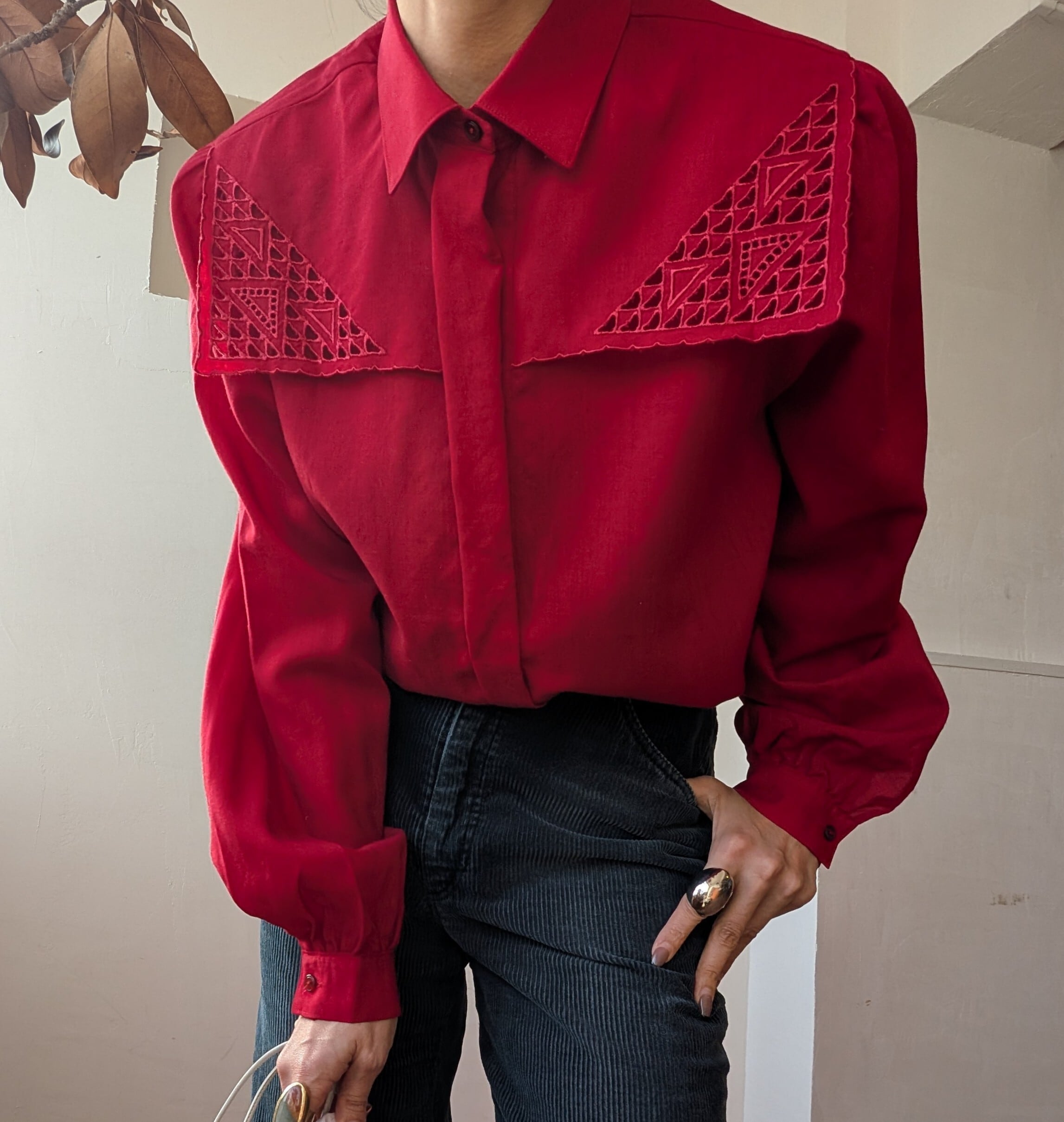深みのある赤に可愛いらしいレースのショルダーデザインが、クラシックでレトロな雰囲気。