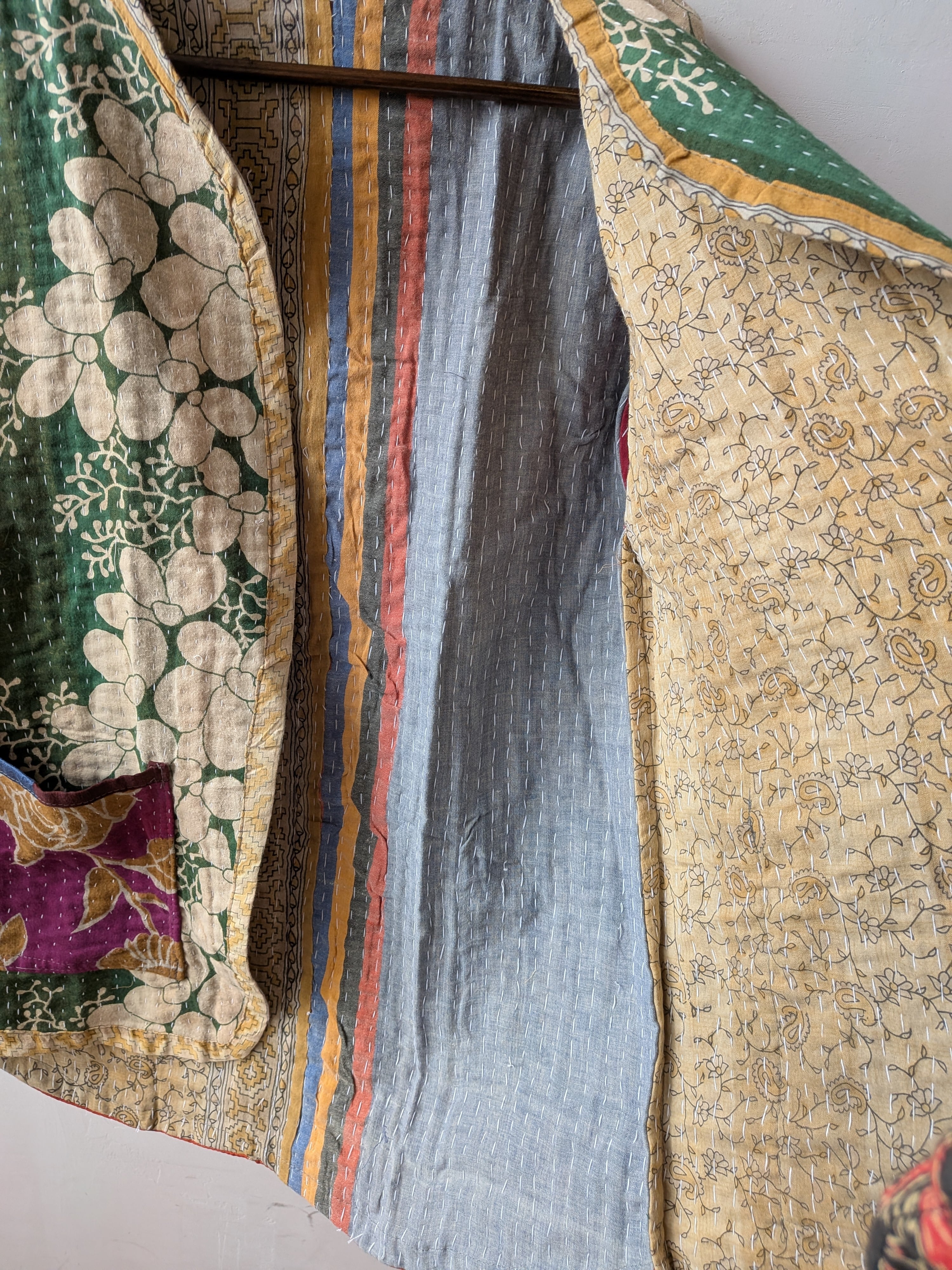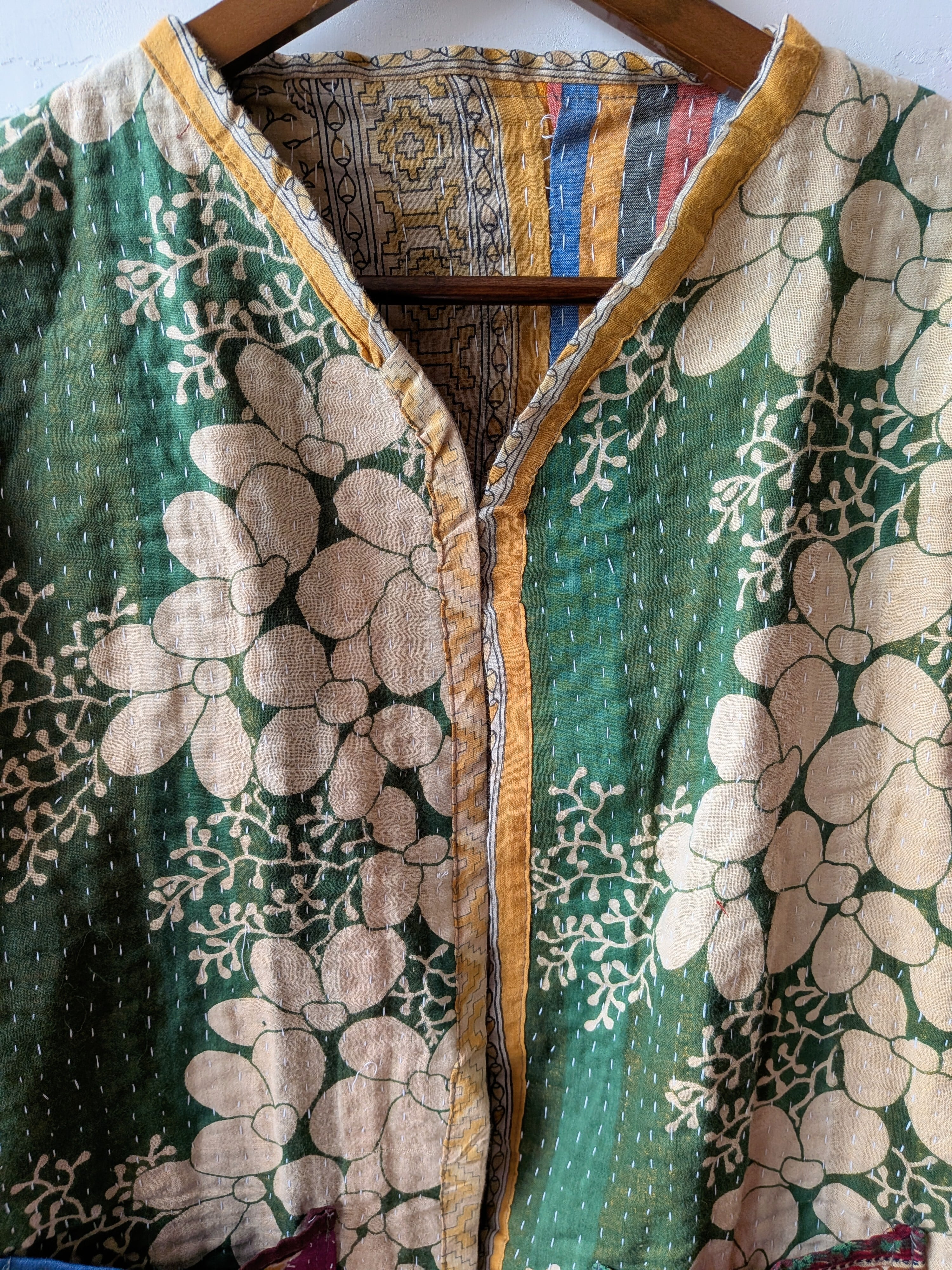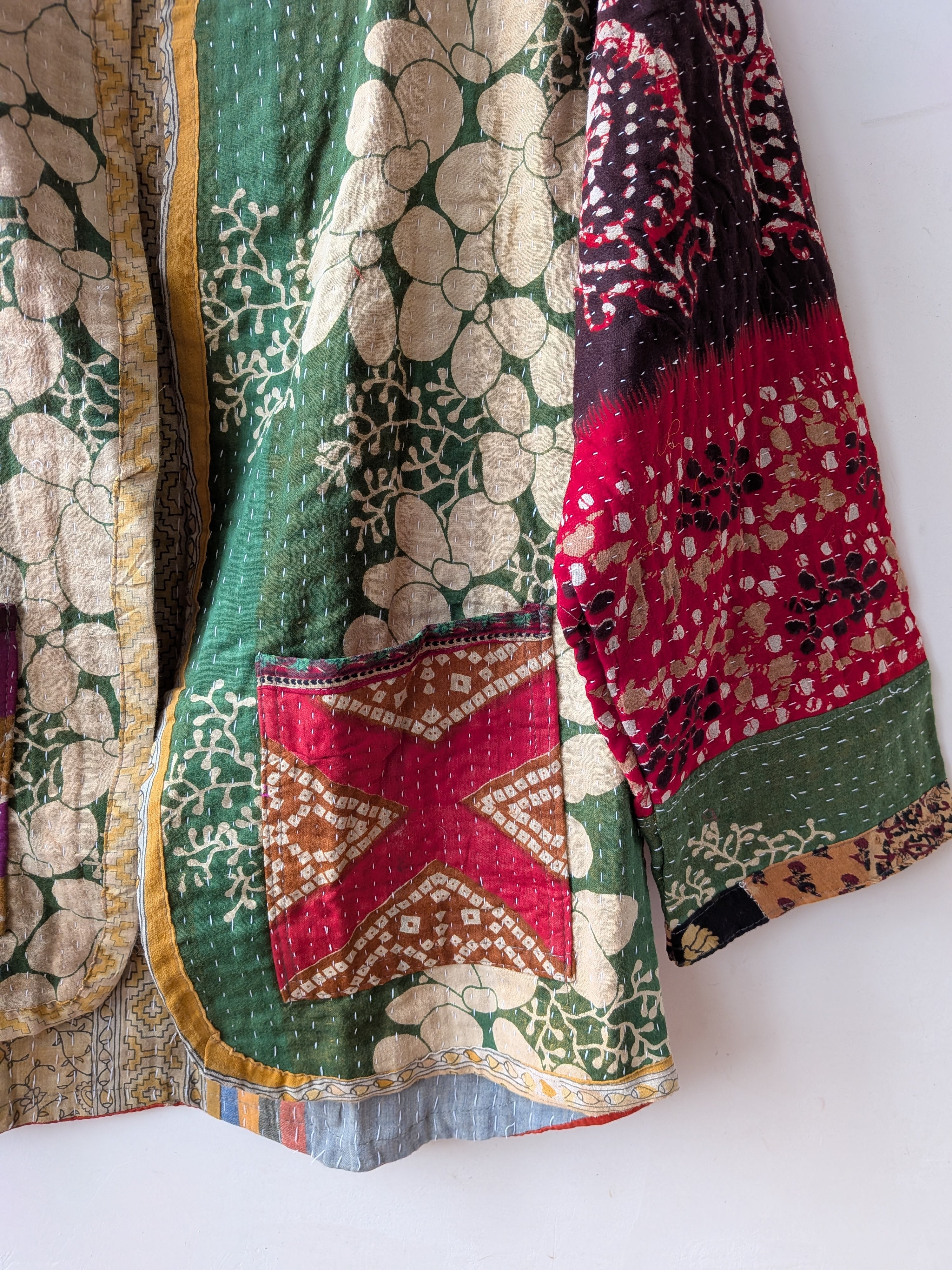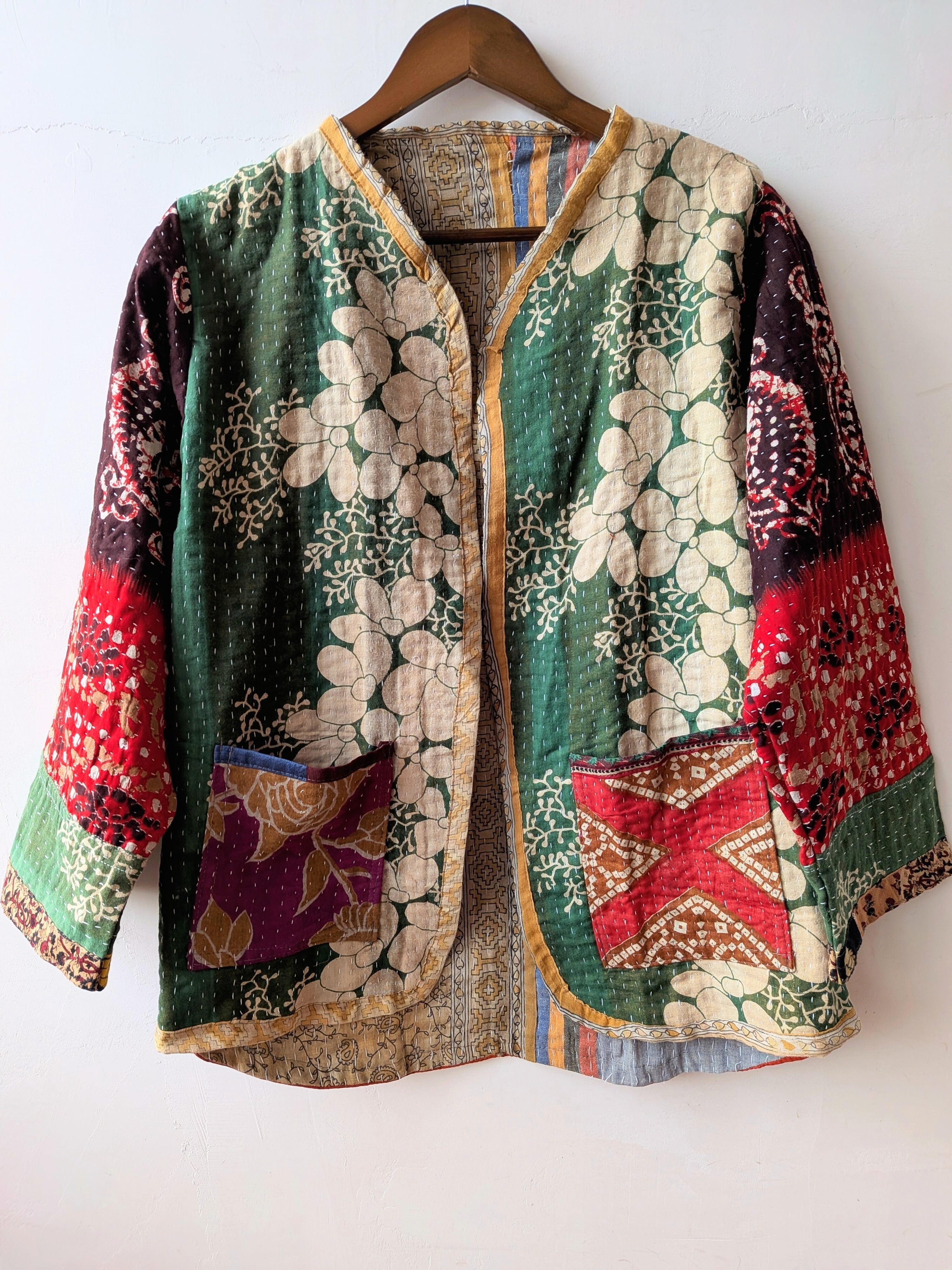 Vintage handmade khantha quilt patchwork jacket /green multi