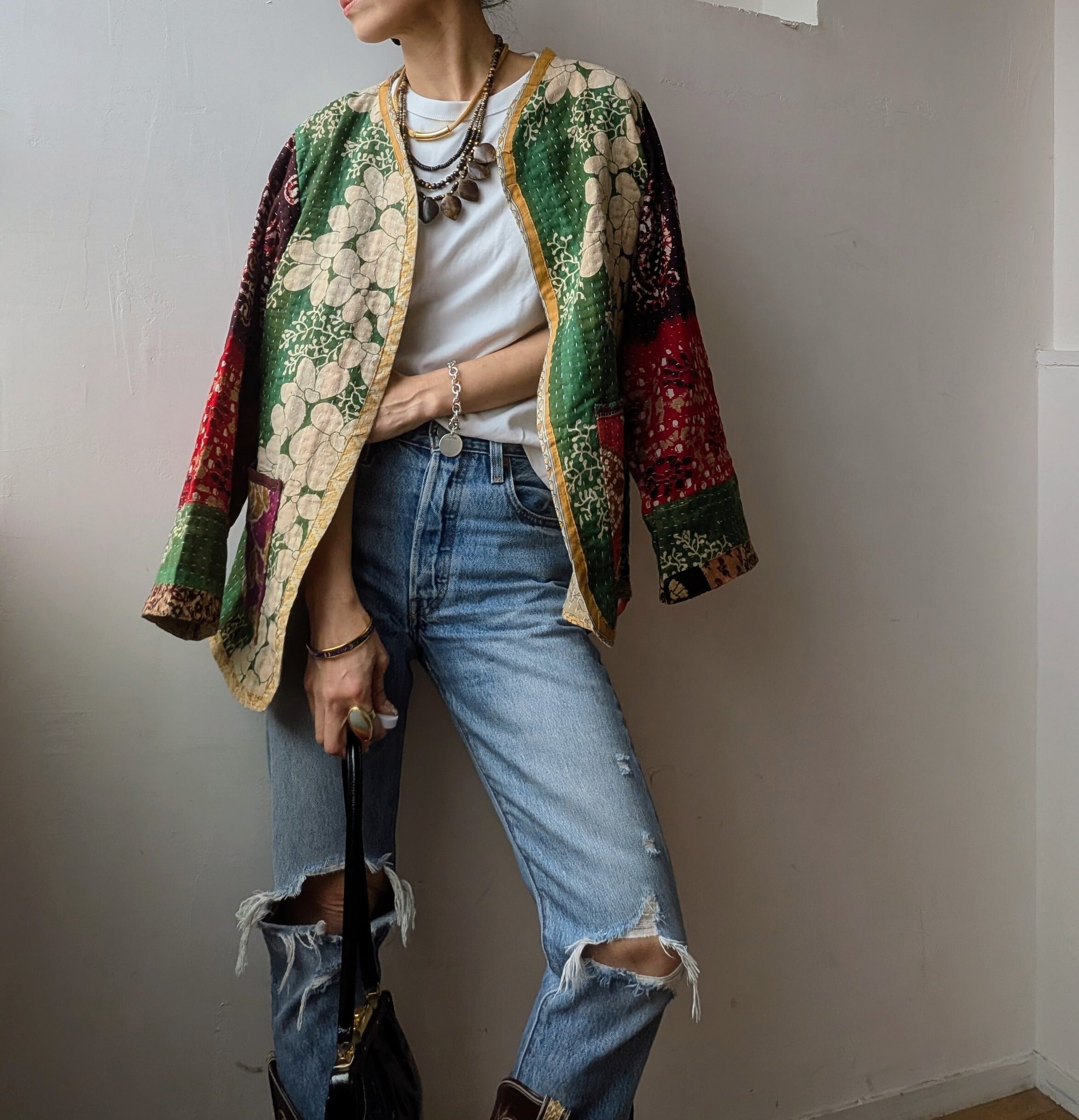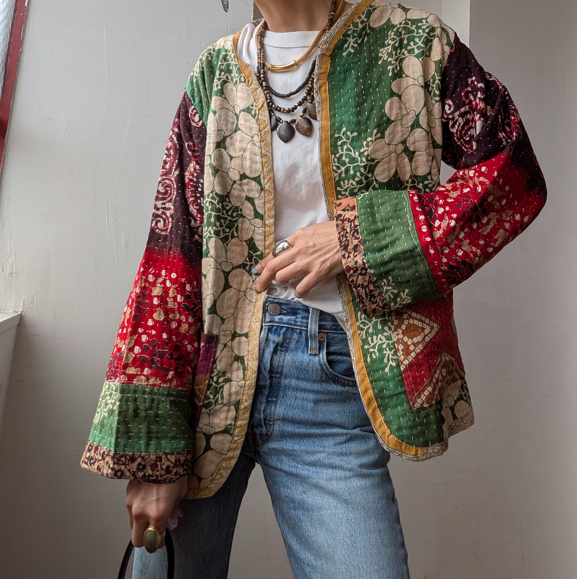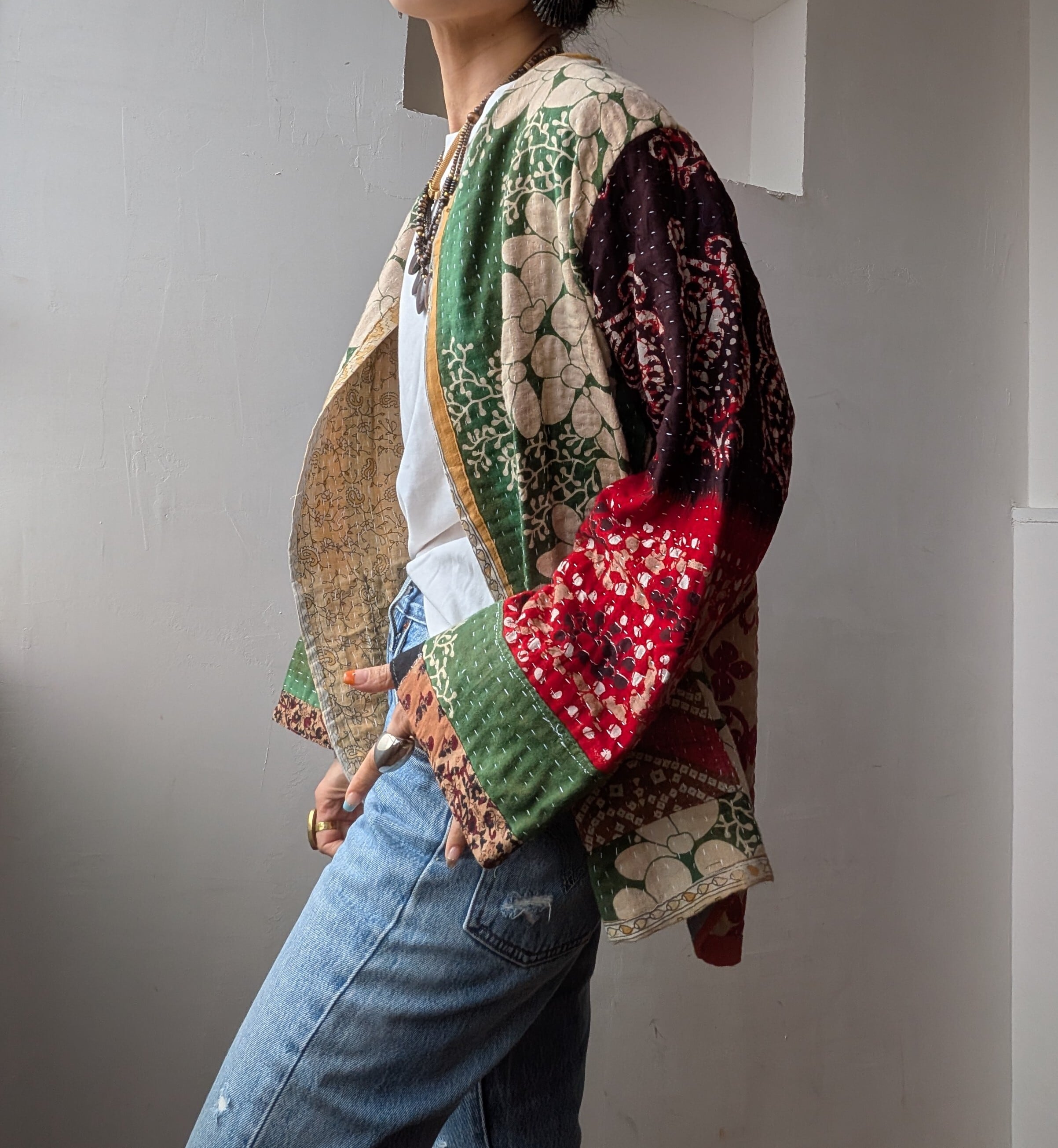 こちらはインドで長く愛された ヴィンテージサリーやドゥティーなどの古布をアップサイクルして作られた世界にひとつのパッチワークジャケットです。