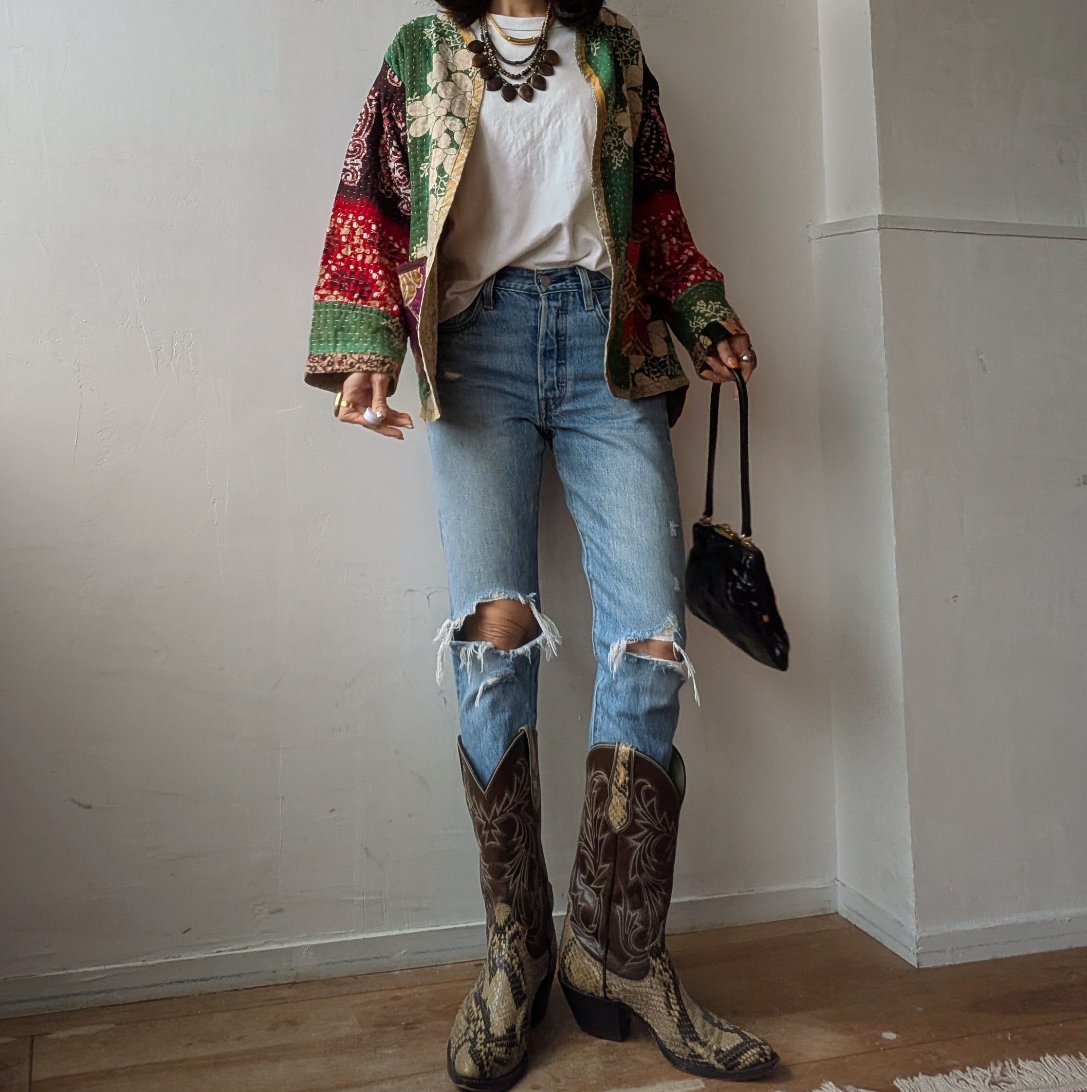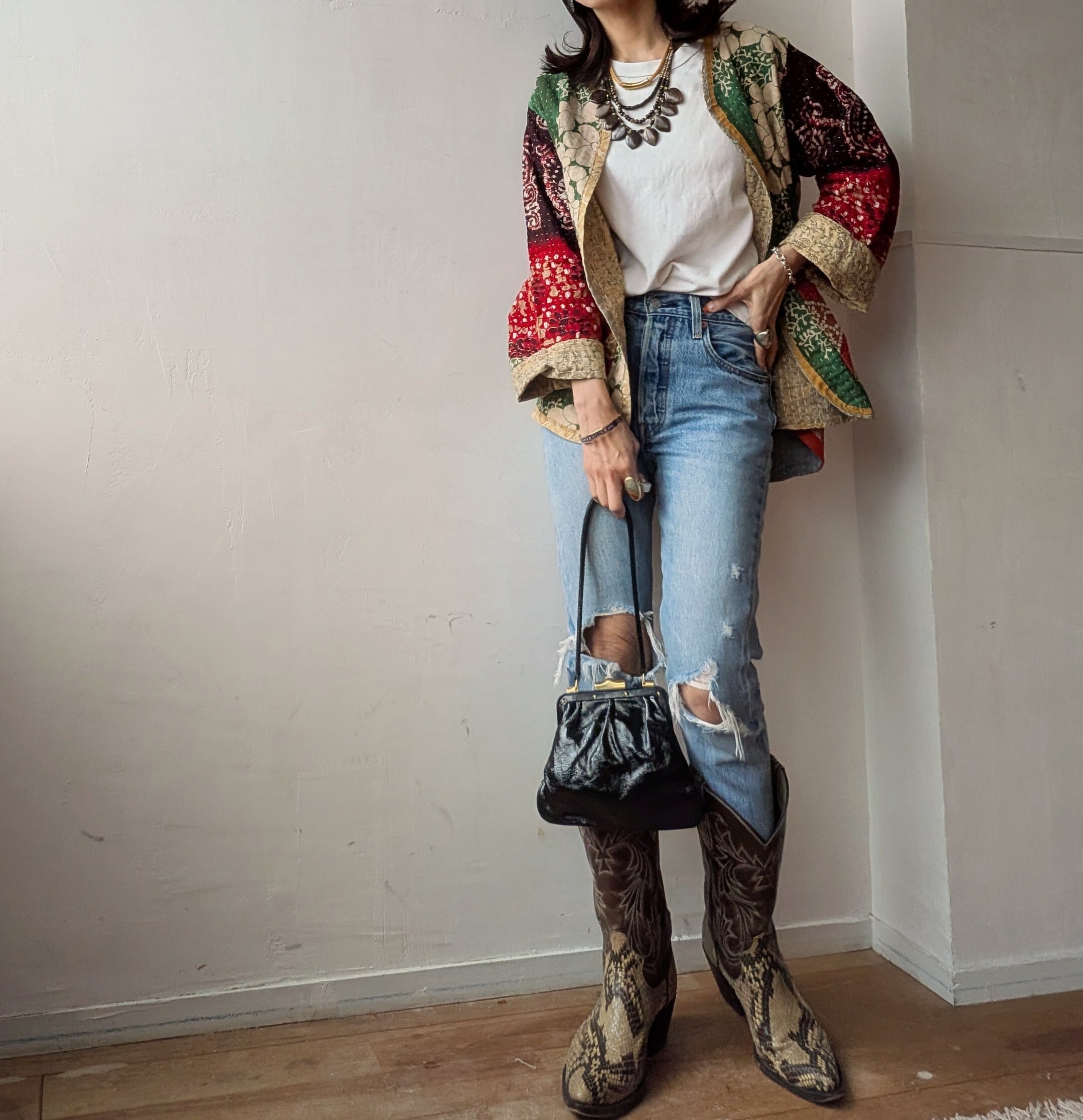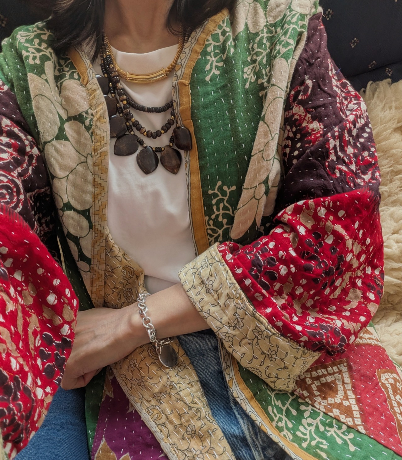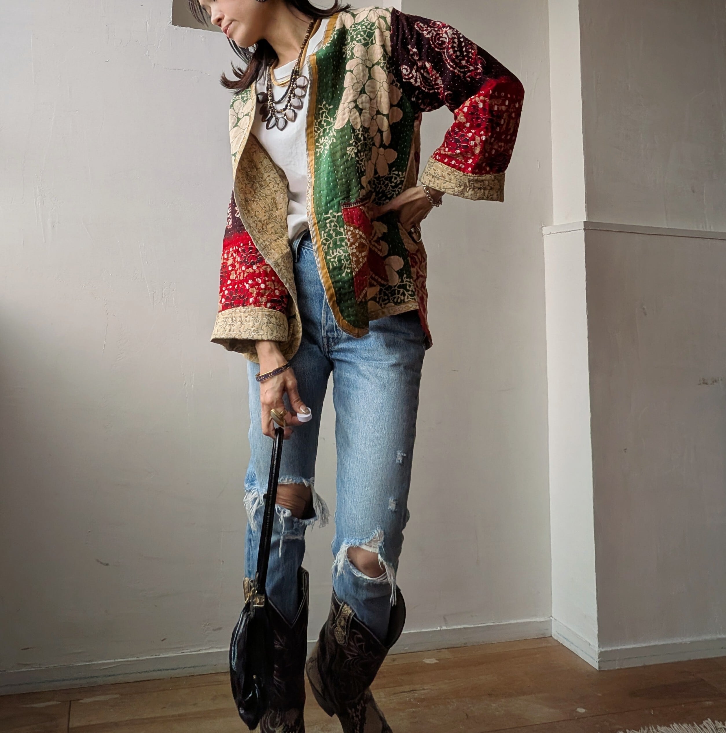 こちらはインドで長く愛された ヴィンテージサリーやドゥティーなどの古布をアップサイクルして作られた世界にひとつのパッチワークジャケットです。
