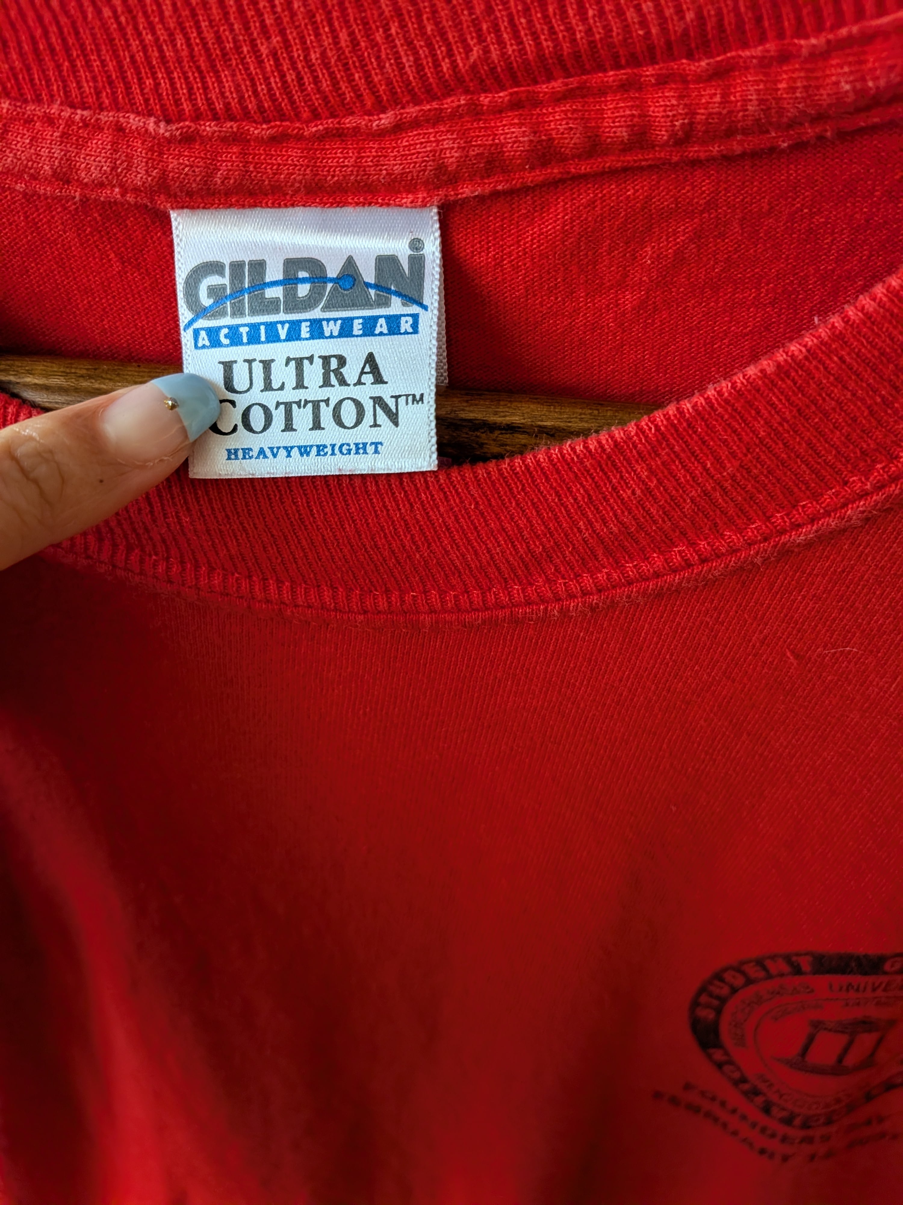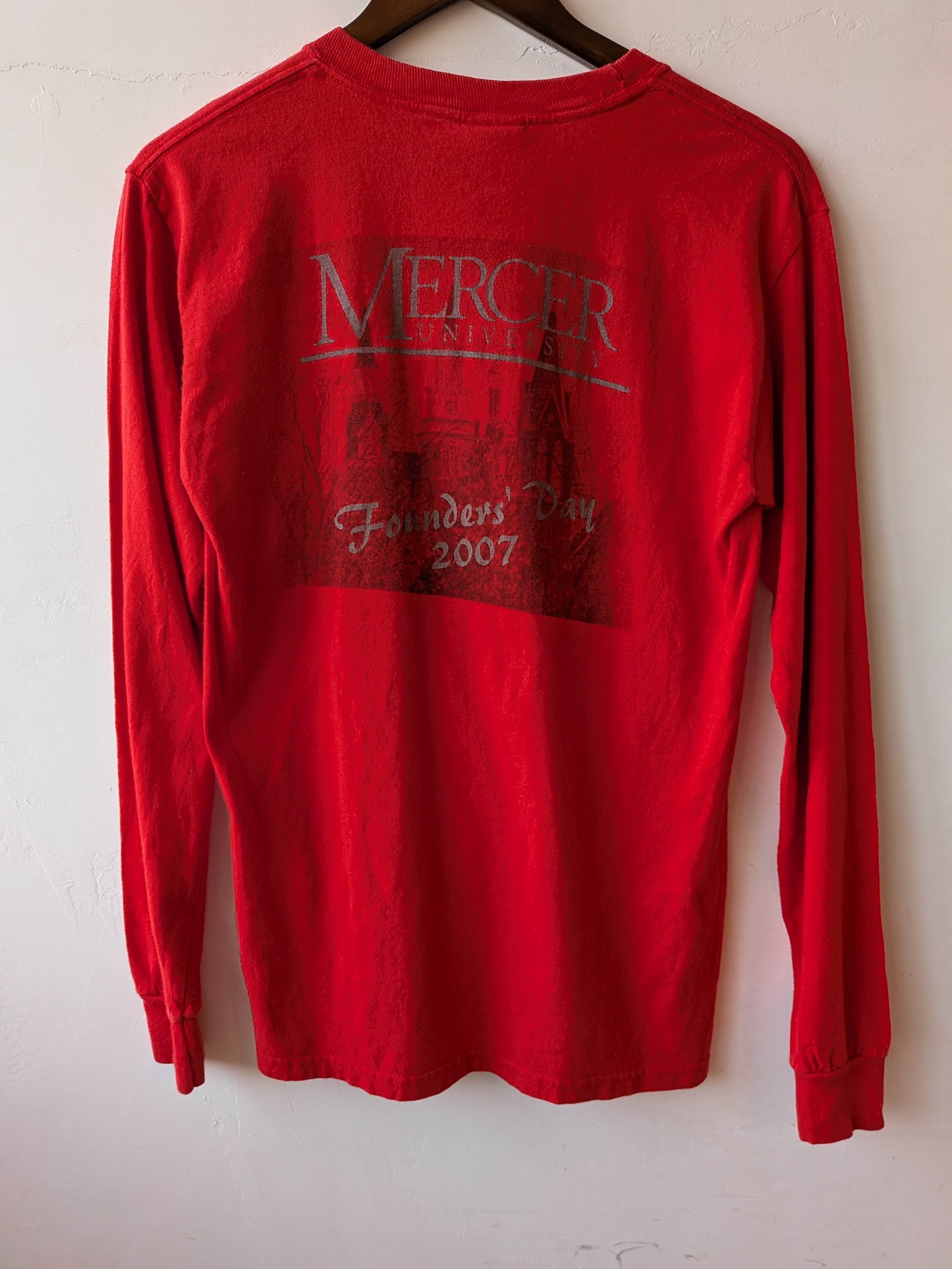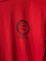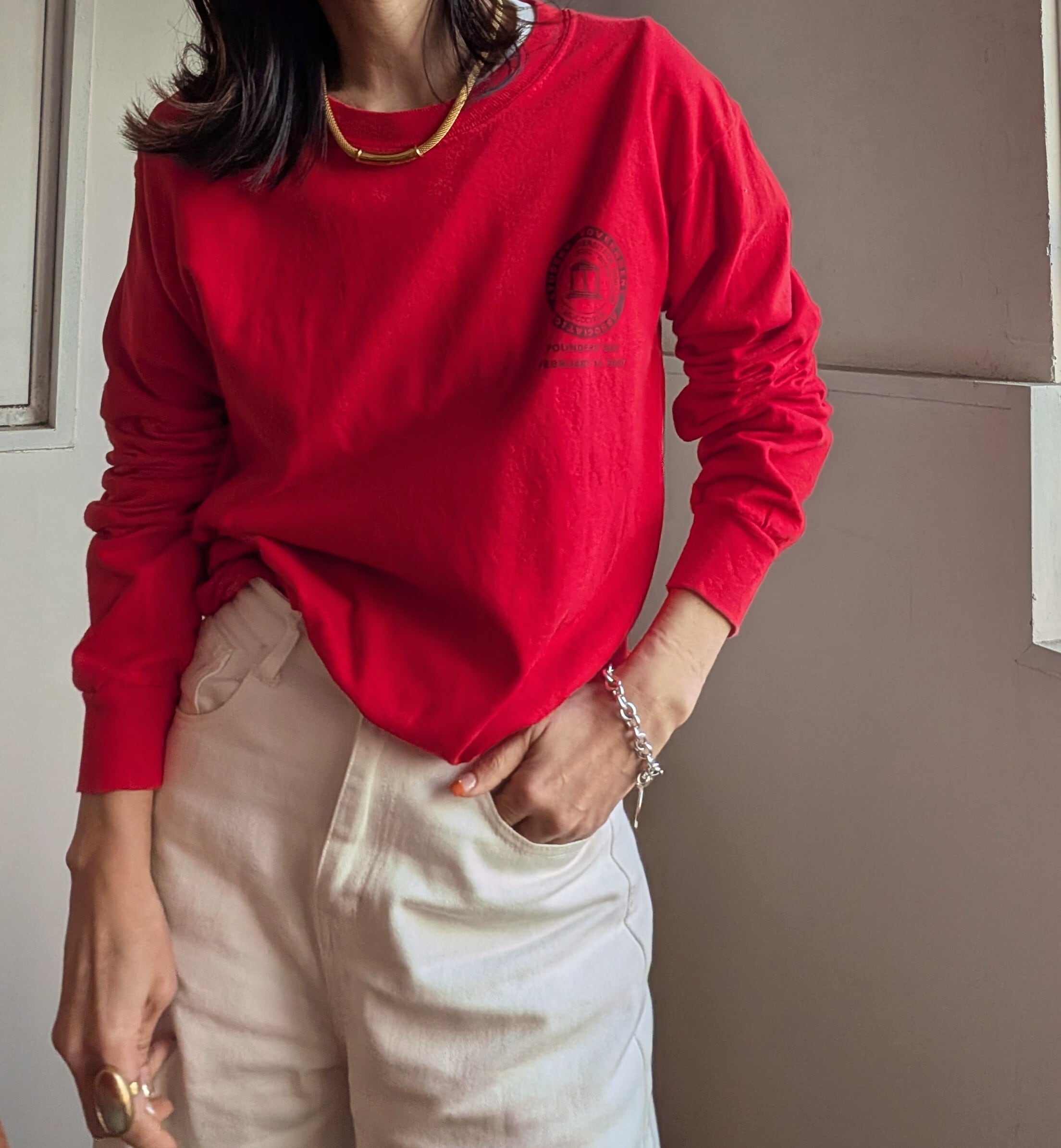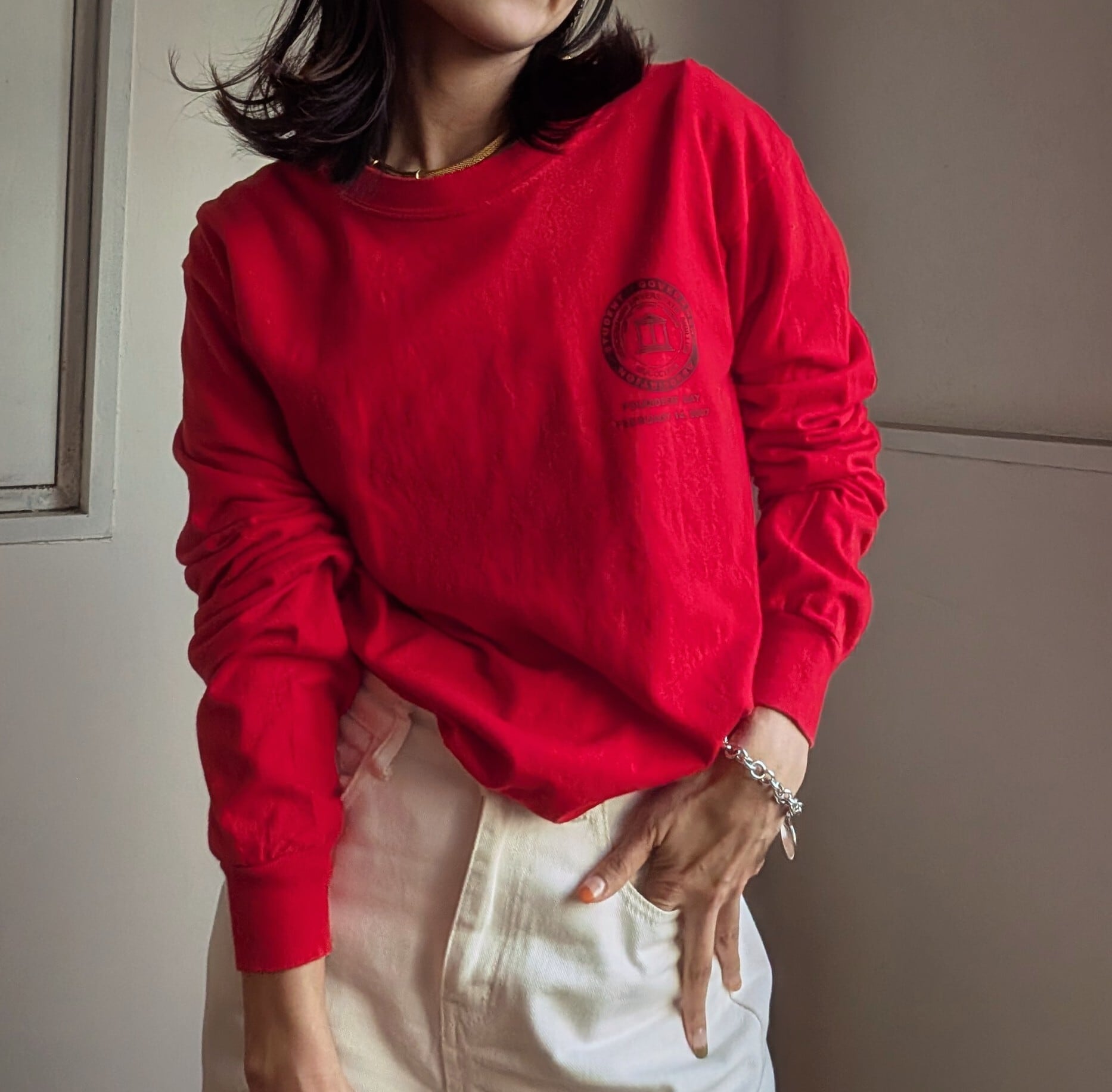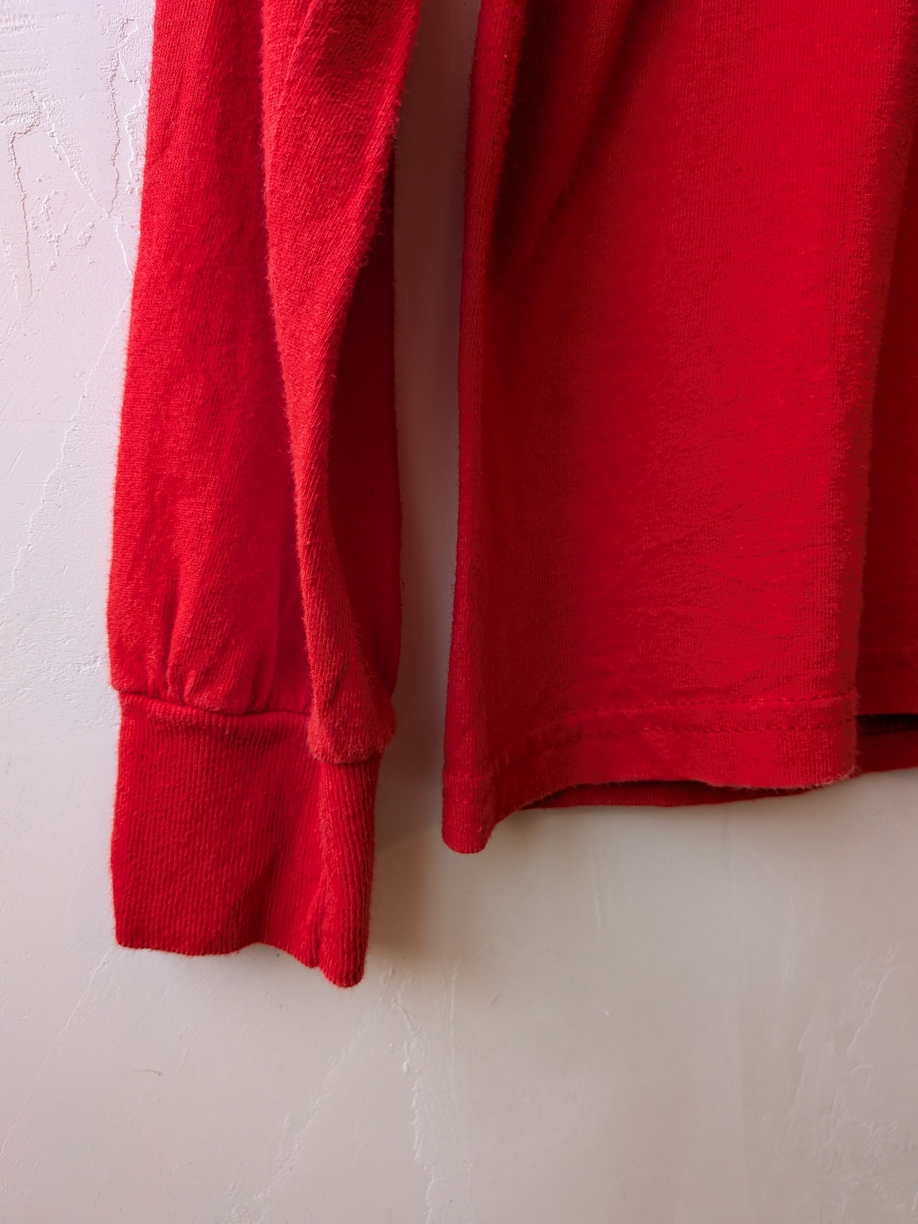 鮮やかな真っ赤なボディが目を惹く、フロントのワンポイントがシンプルなロングTシャツ。