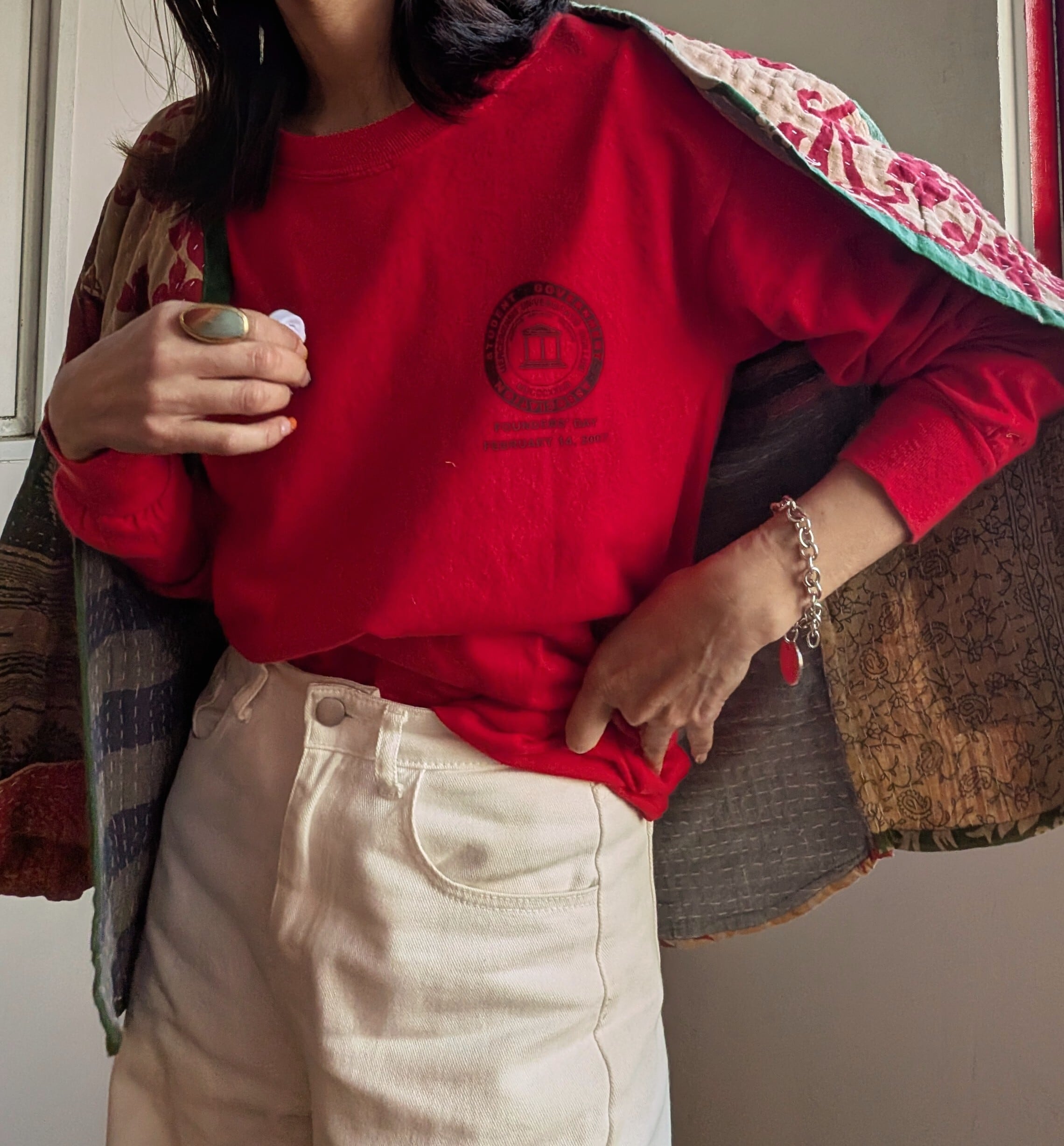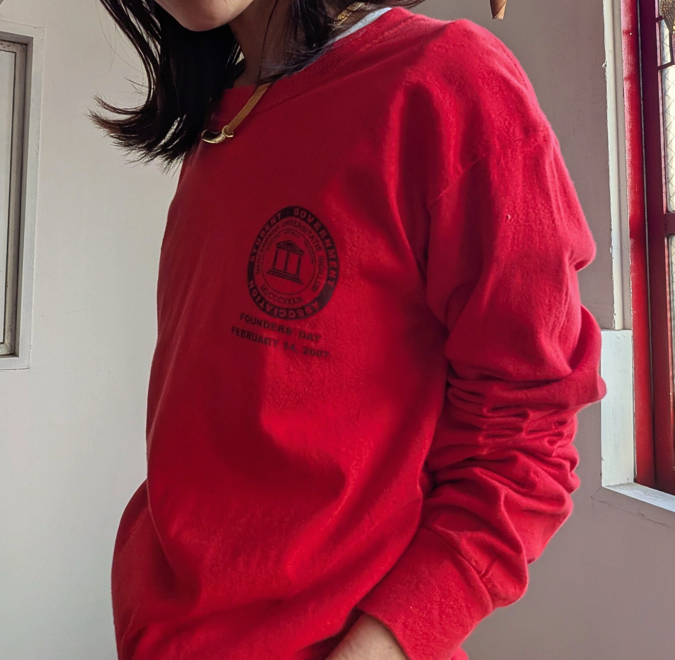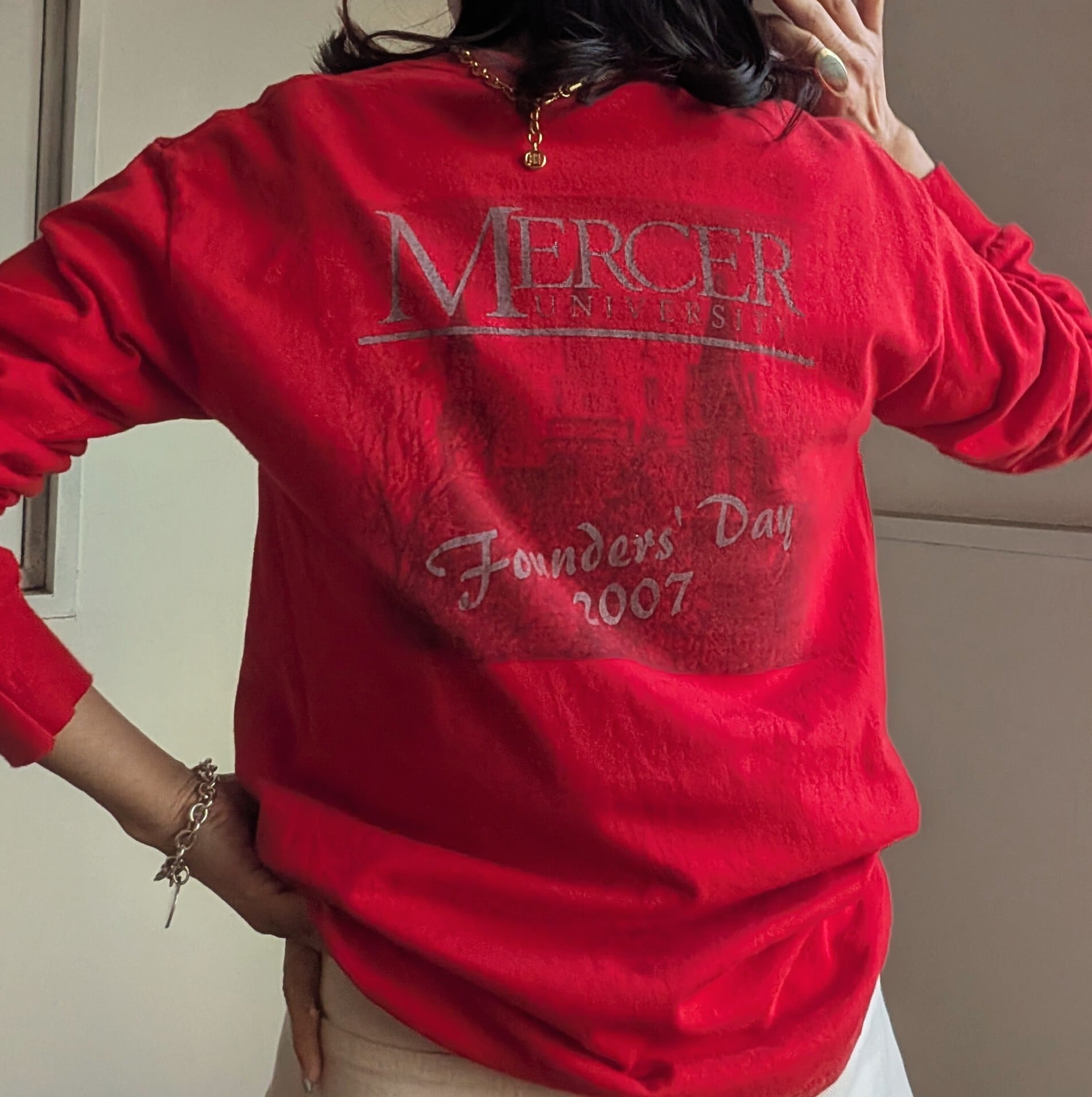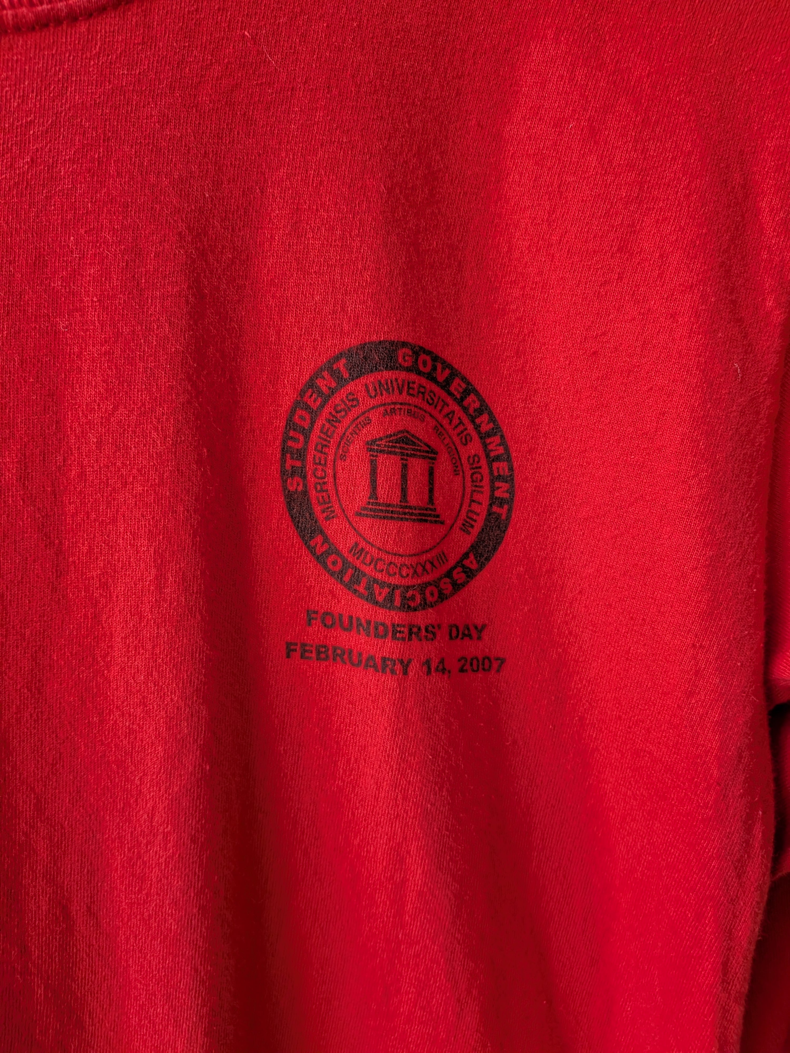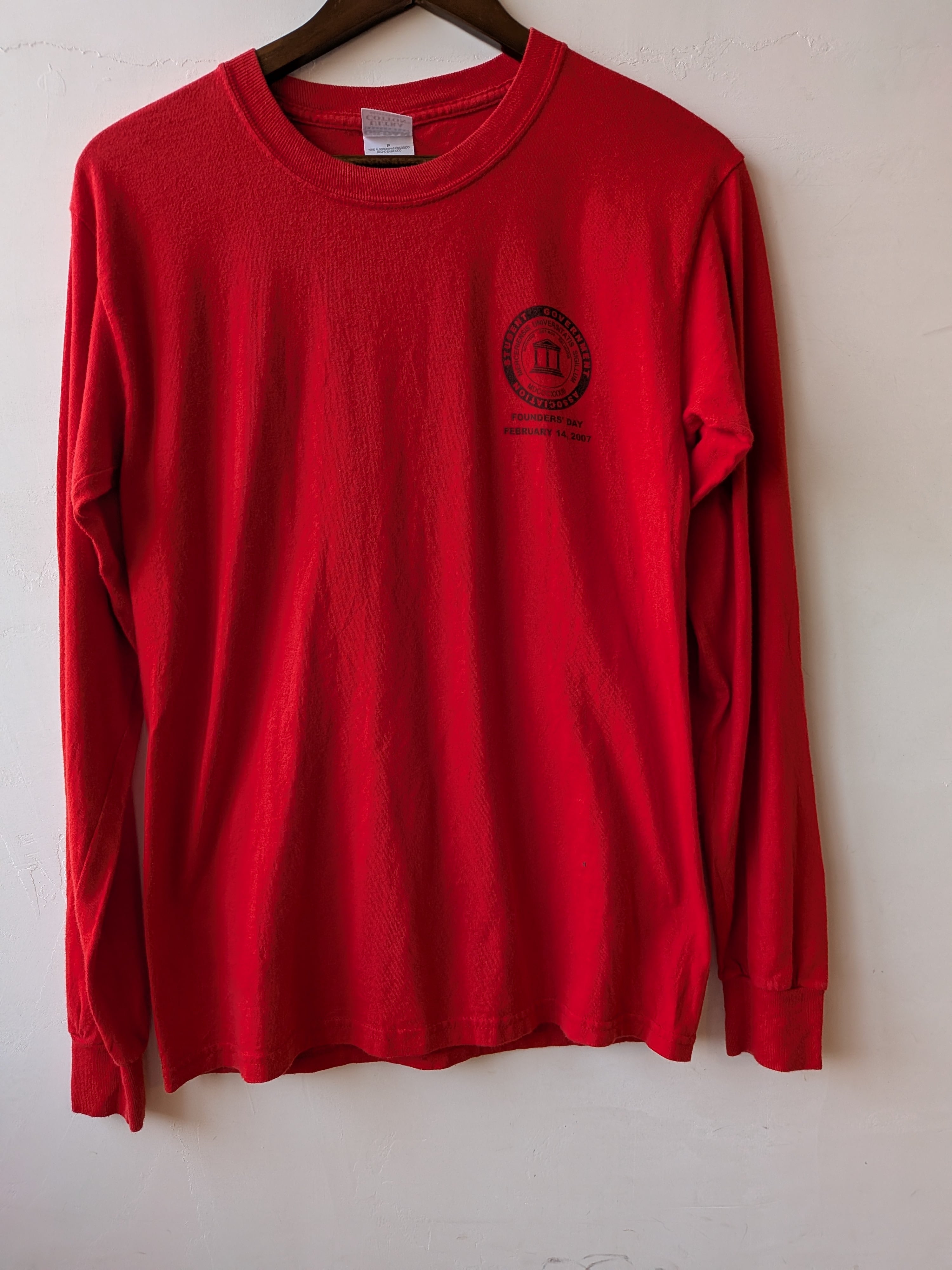 鮮やかな真っ赤なボディが目を惹く、フロントのワンポイントがシンプルなロングTシャツ。