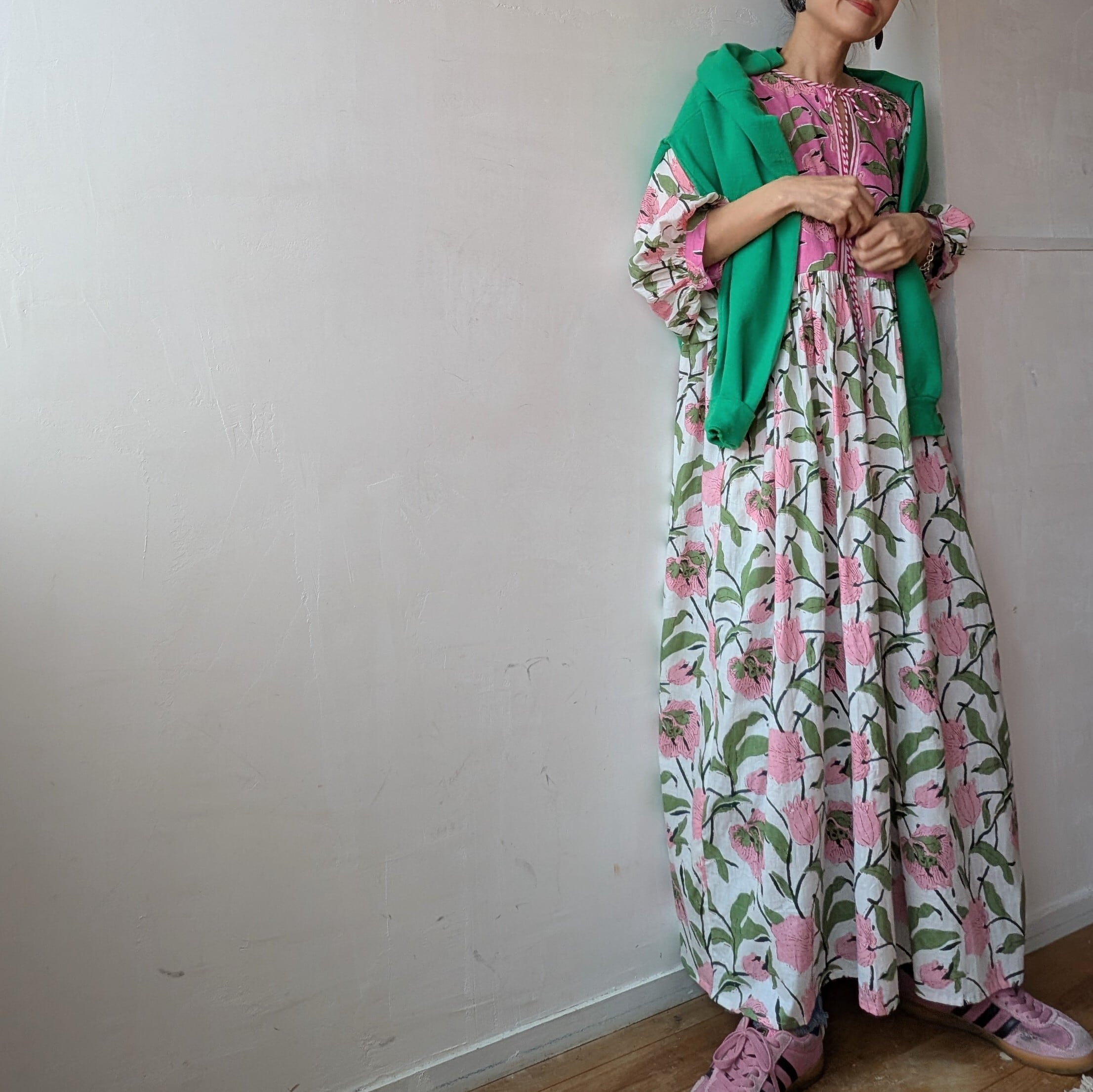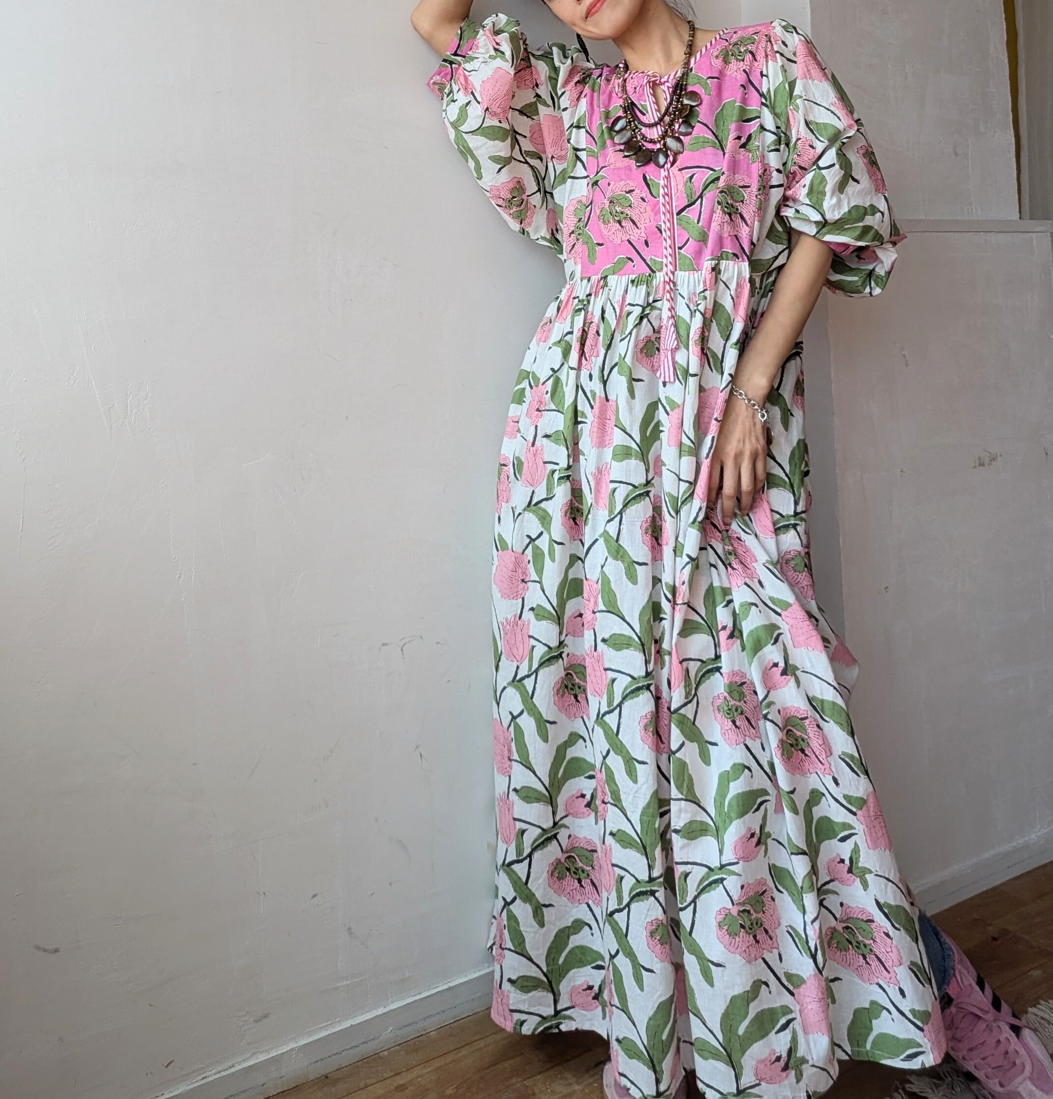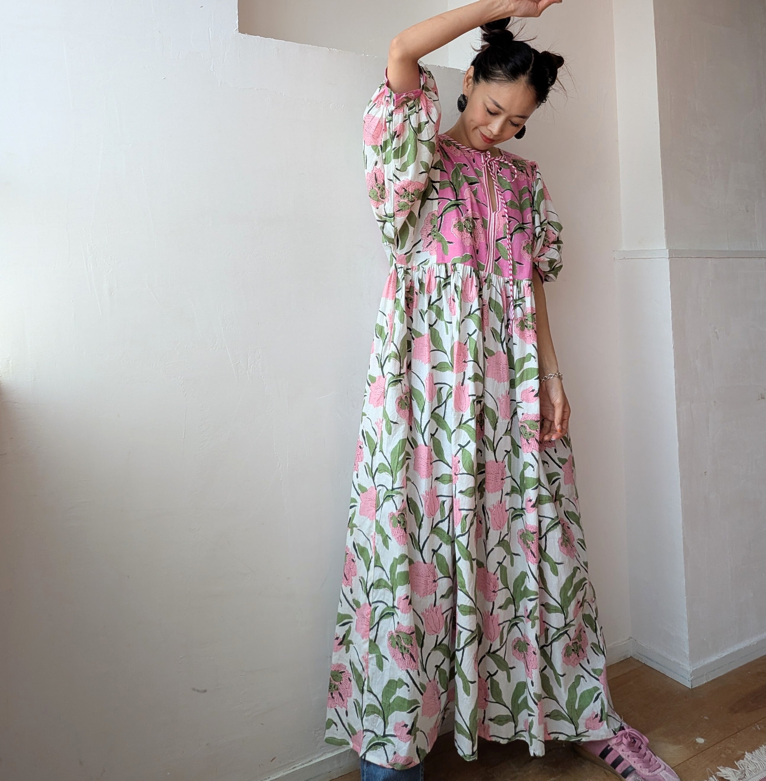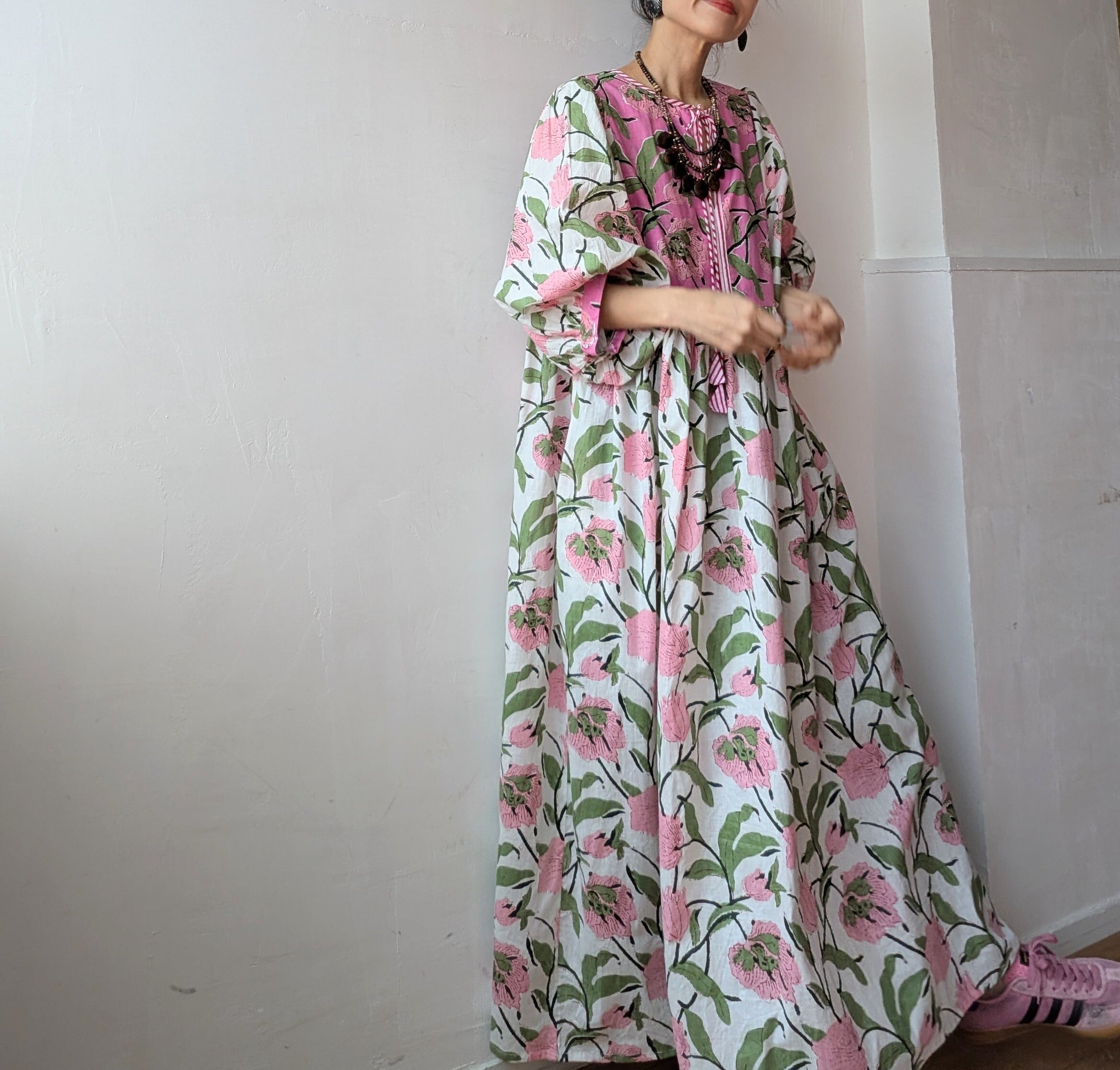 女性らしいふんわりとしたシルエットで、春夏にサンダルやスニーカーを併せて、1枚での着用はもちろん、デニムをレイヤードしたり、秋冬はインナーにタートルネックや、スウェットやニットを併せたり、足元をブーツに変えるだけでオールシーズン対応可能です!