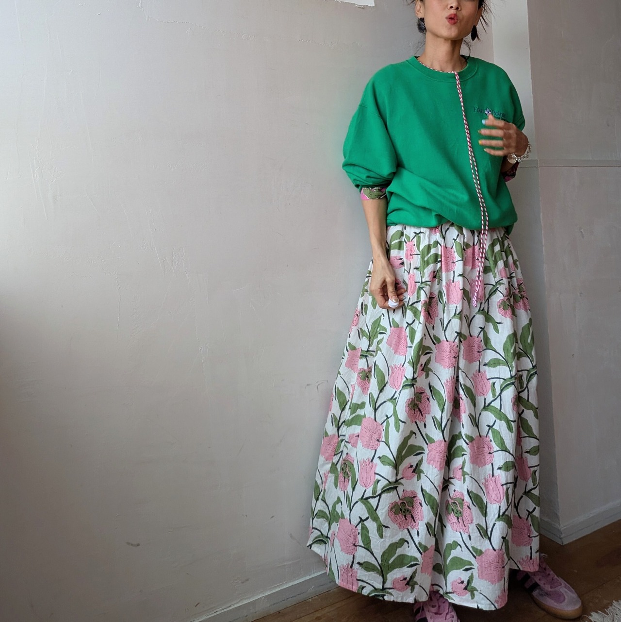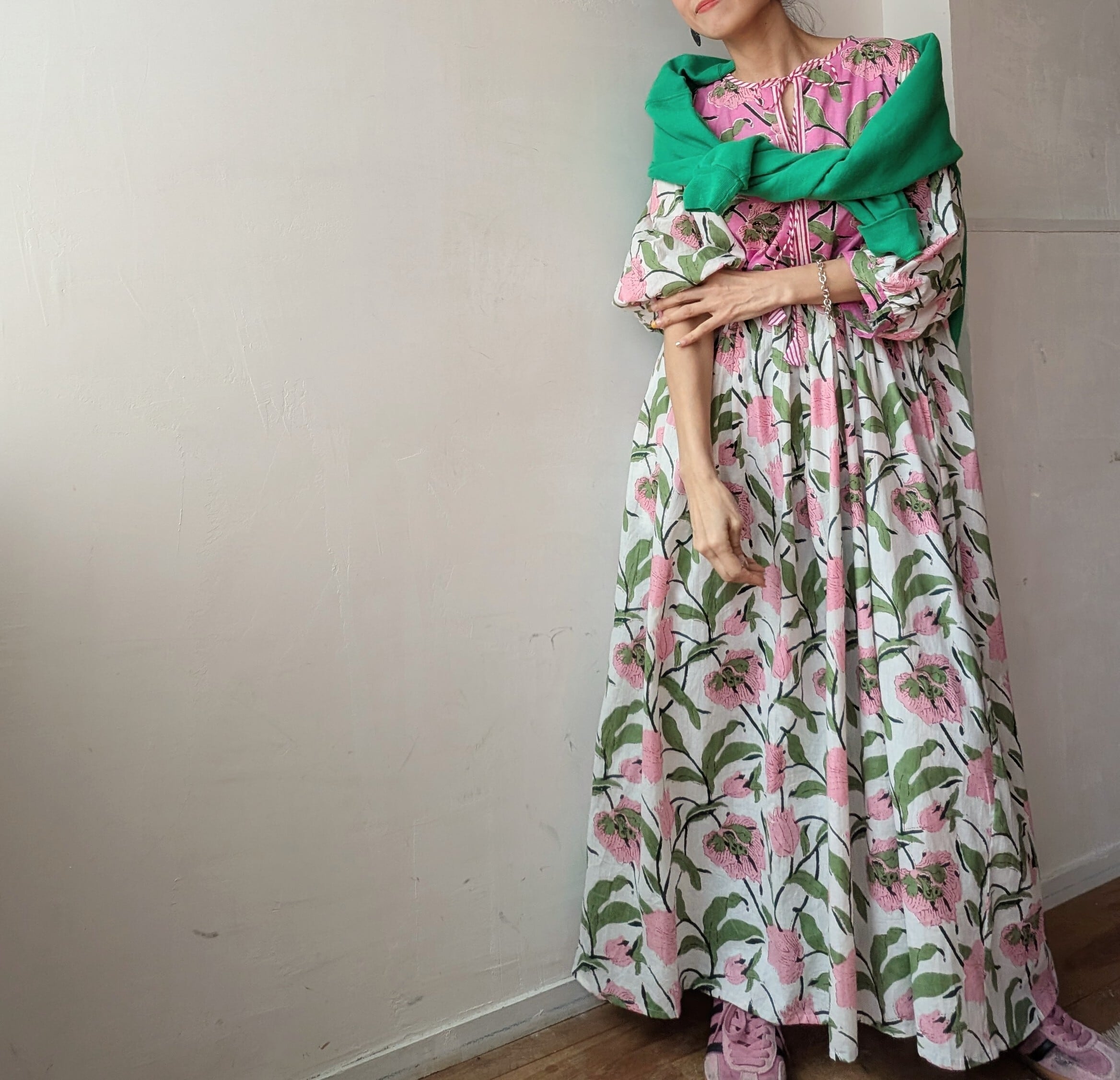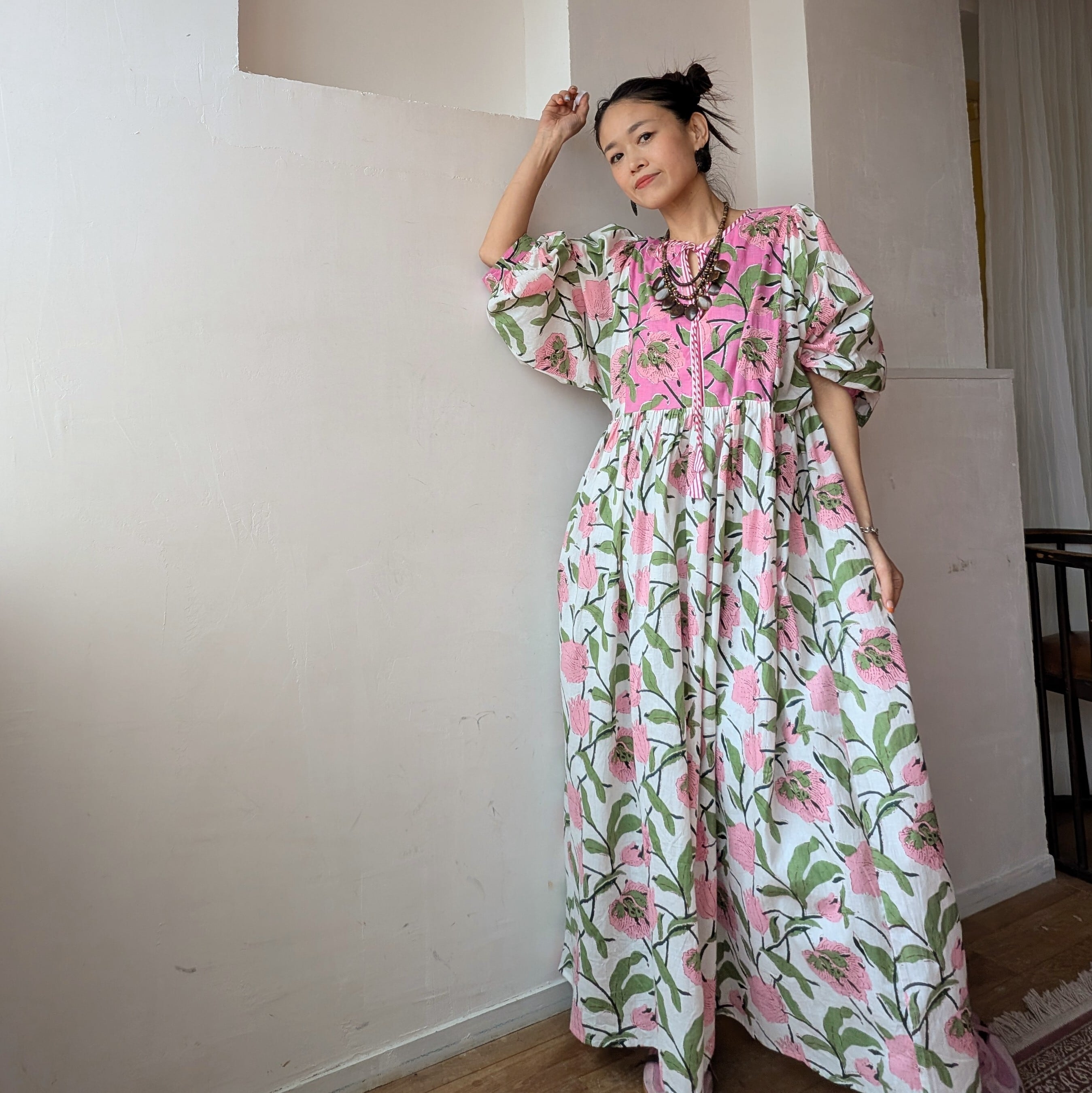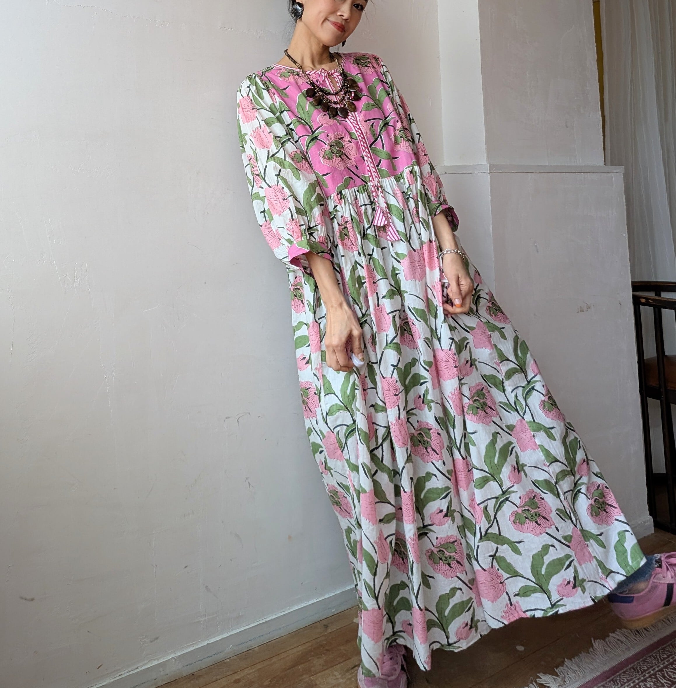 女性らしいふんわりとしたシルエットで、春夏にサンダルやスニーカーを併せて、1枚での着用はもちろん、デニムをレイヤードしたり、秋冬はインナーにタートルネックや、スウェットやニットを併せたり、足元をブーツに変えるだけでオールシーズン対応可能です!