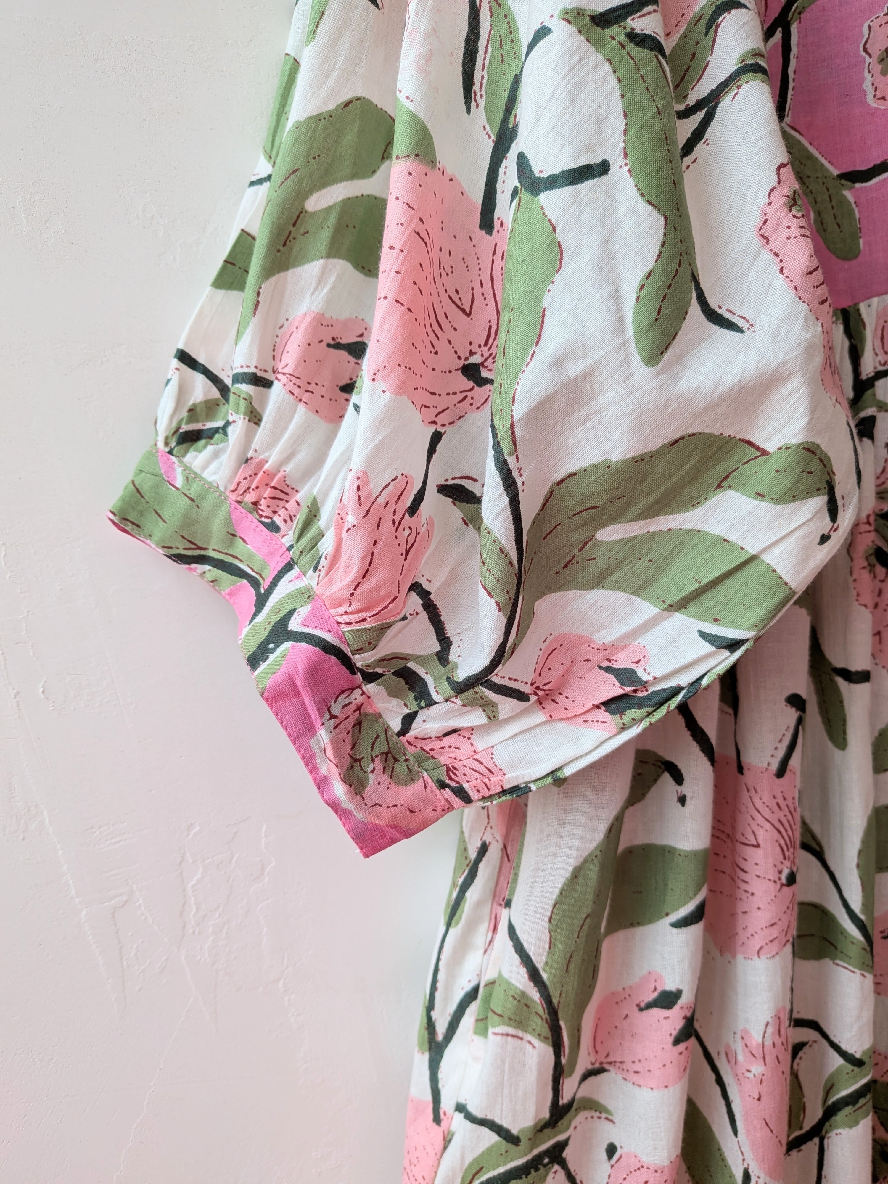 柔らかなピンクカラーと爽やかなホワイトのボディカラーに大判の花柄プリントが映え、お顔周りもぱっと明るく華やかになる1枚です♡