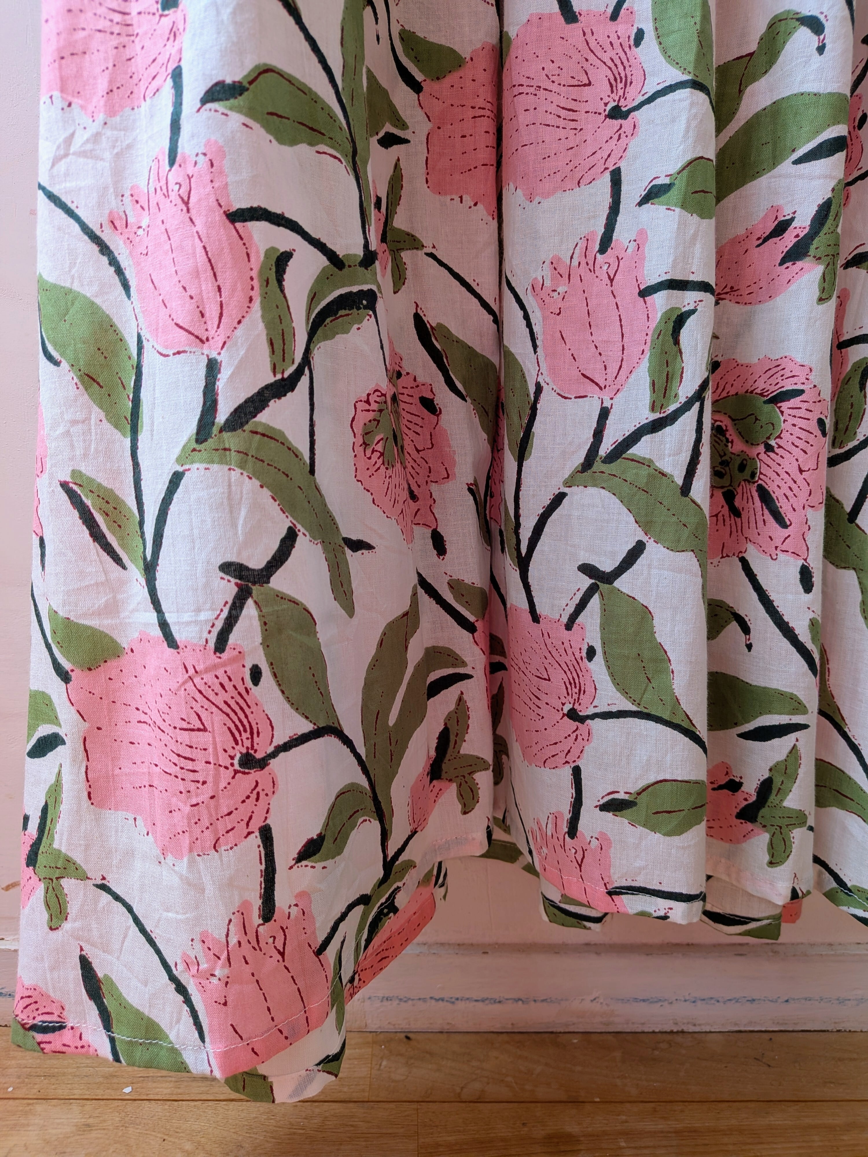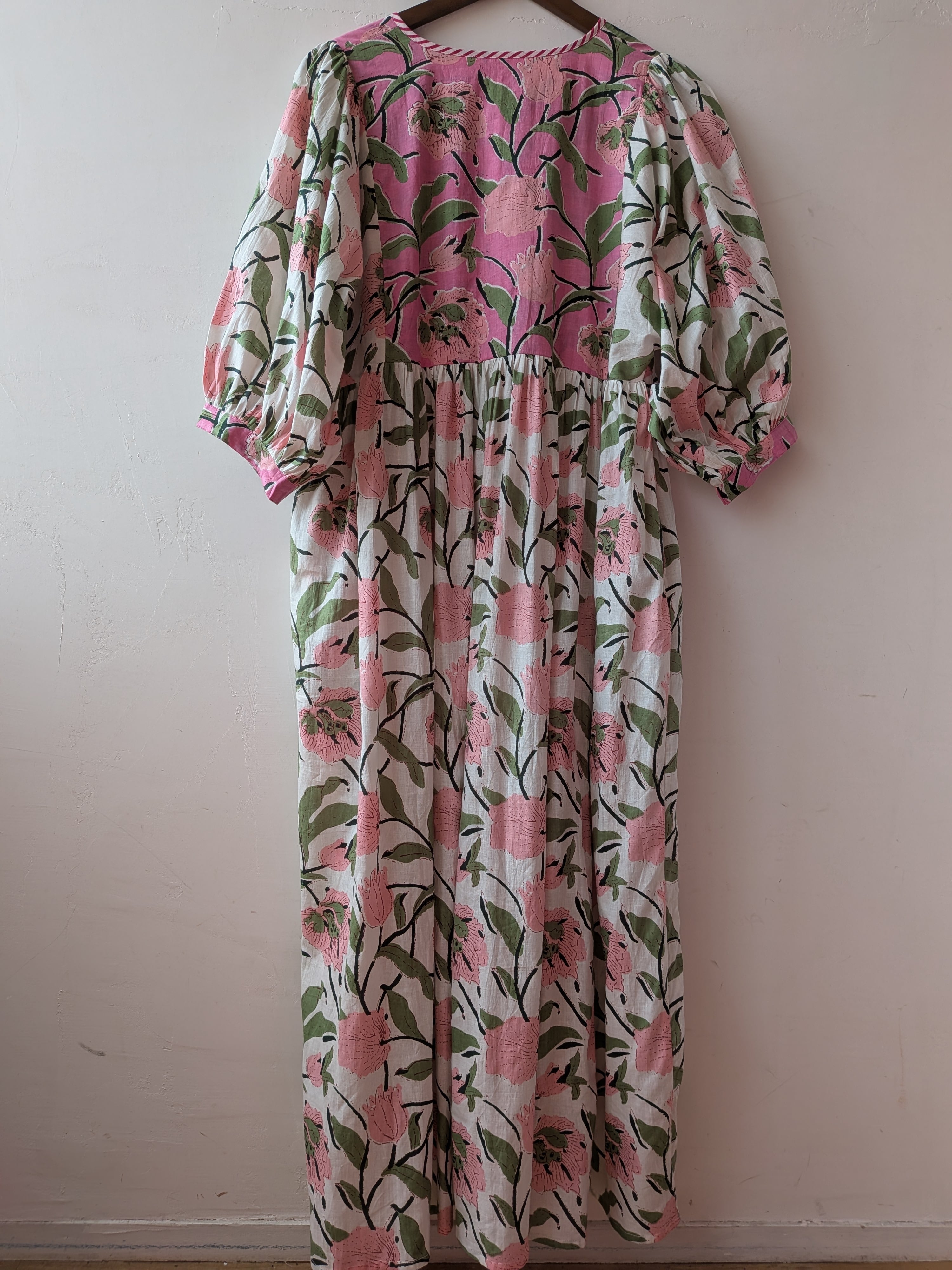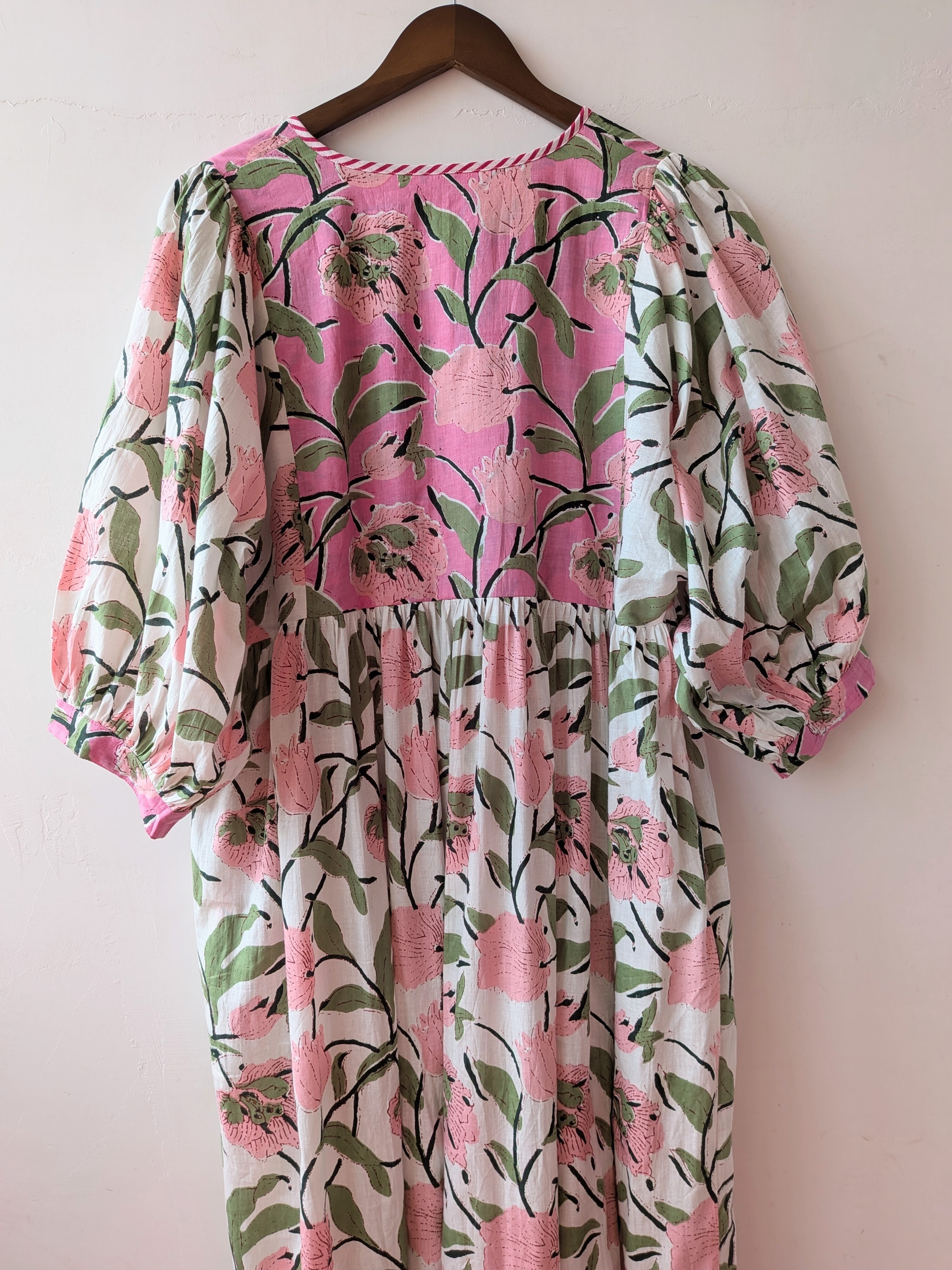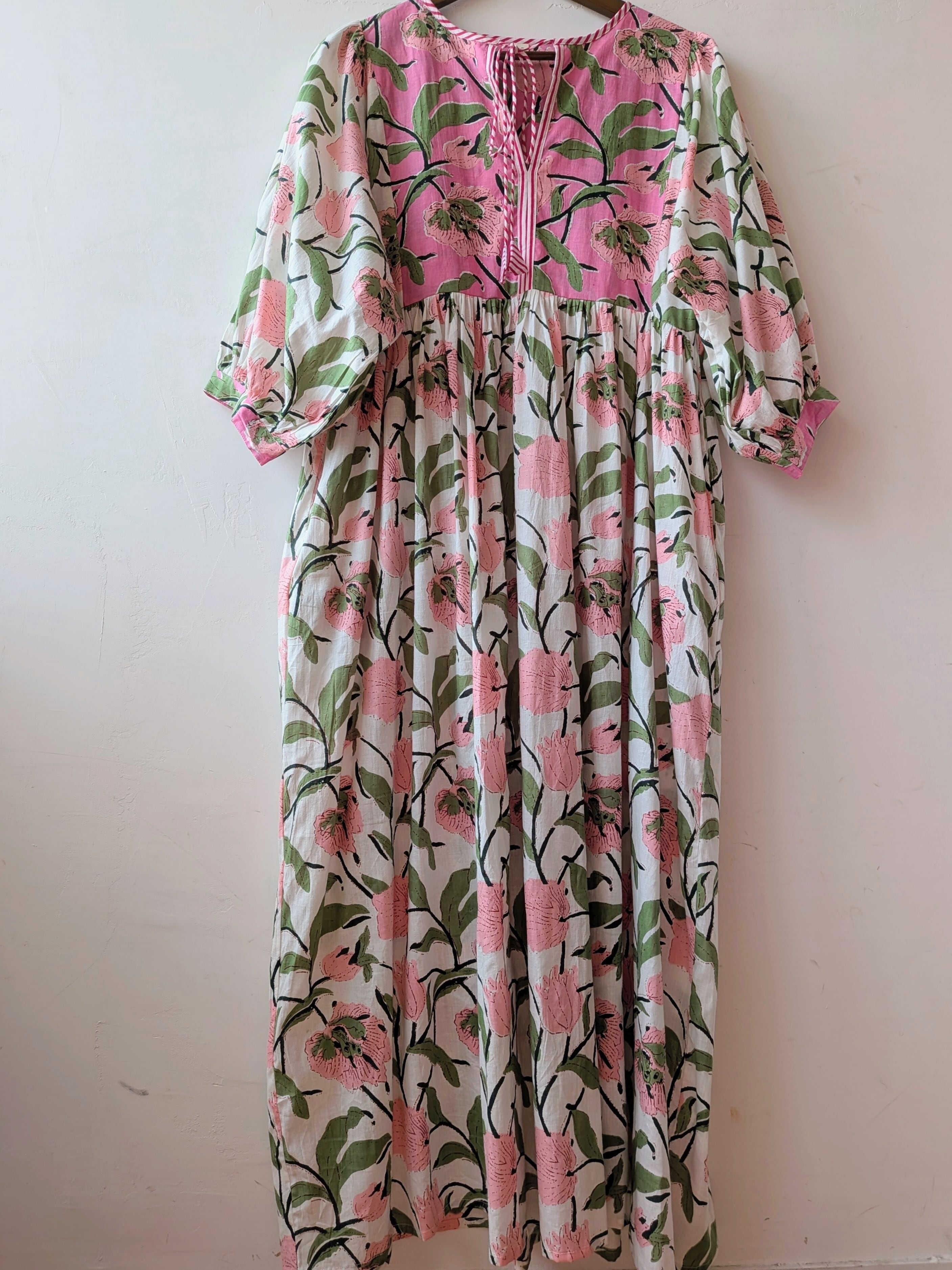 Flower print switching flare long cotton dress