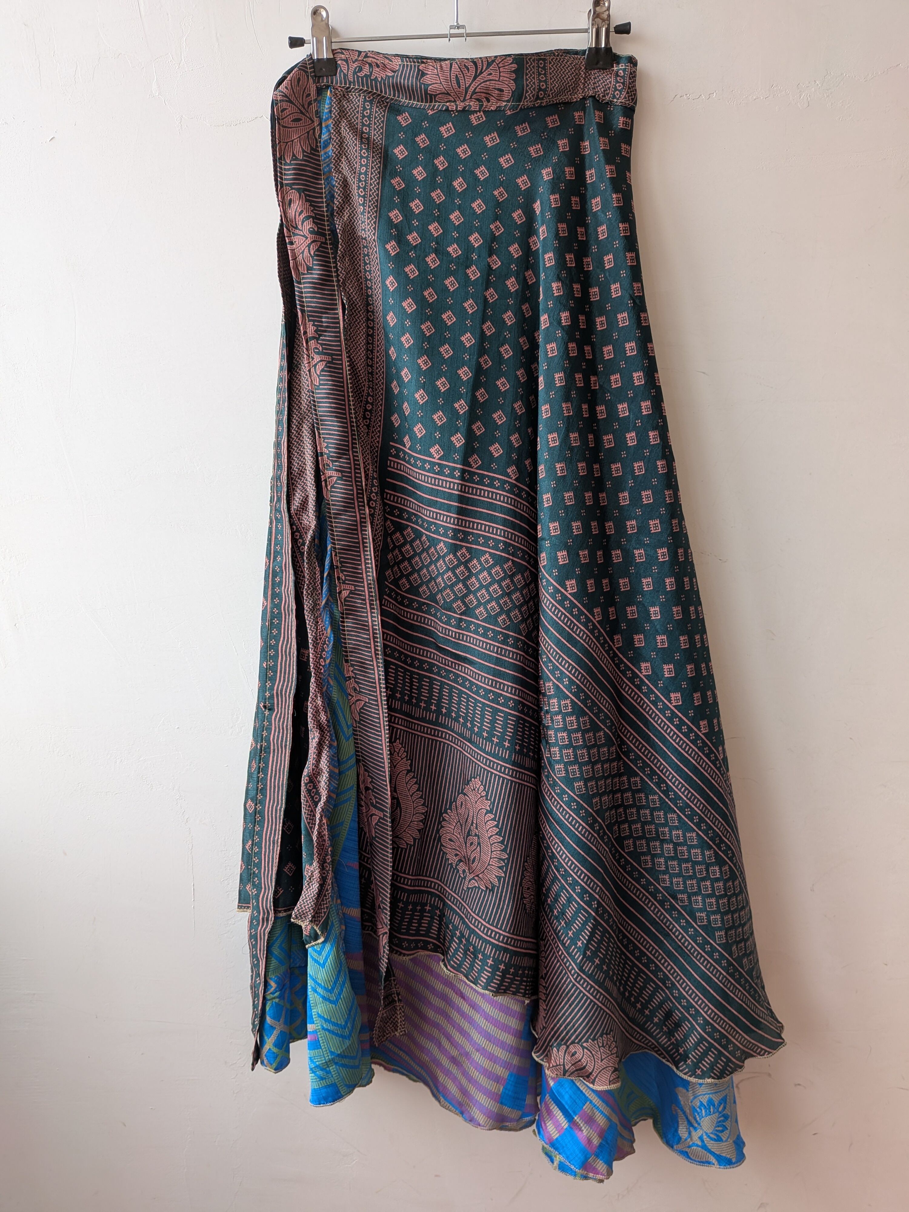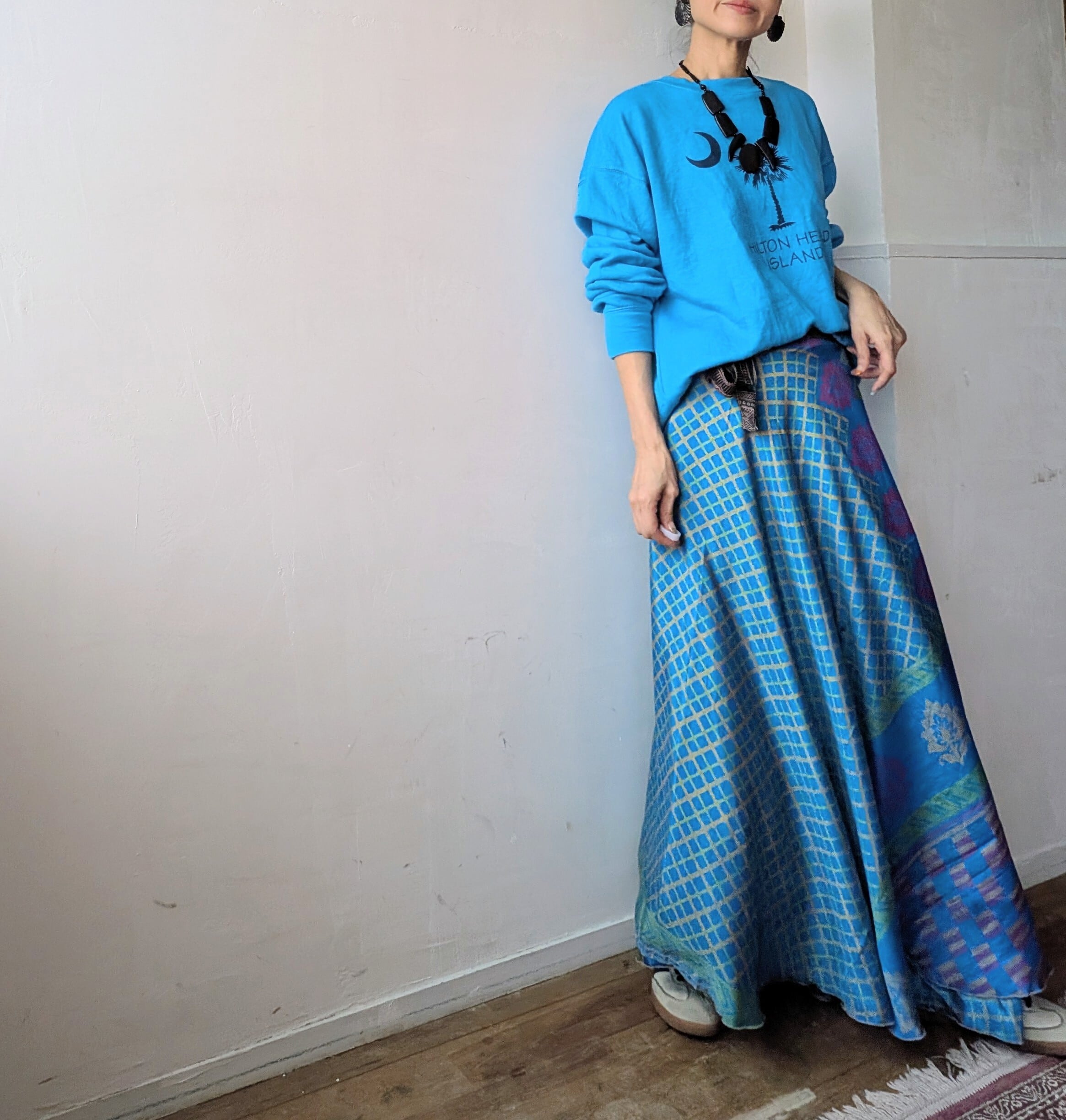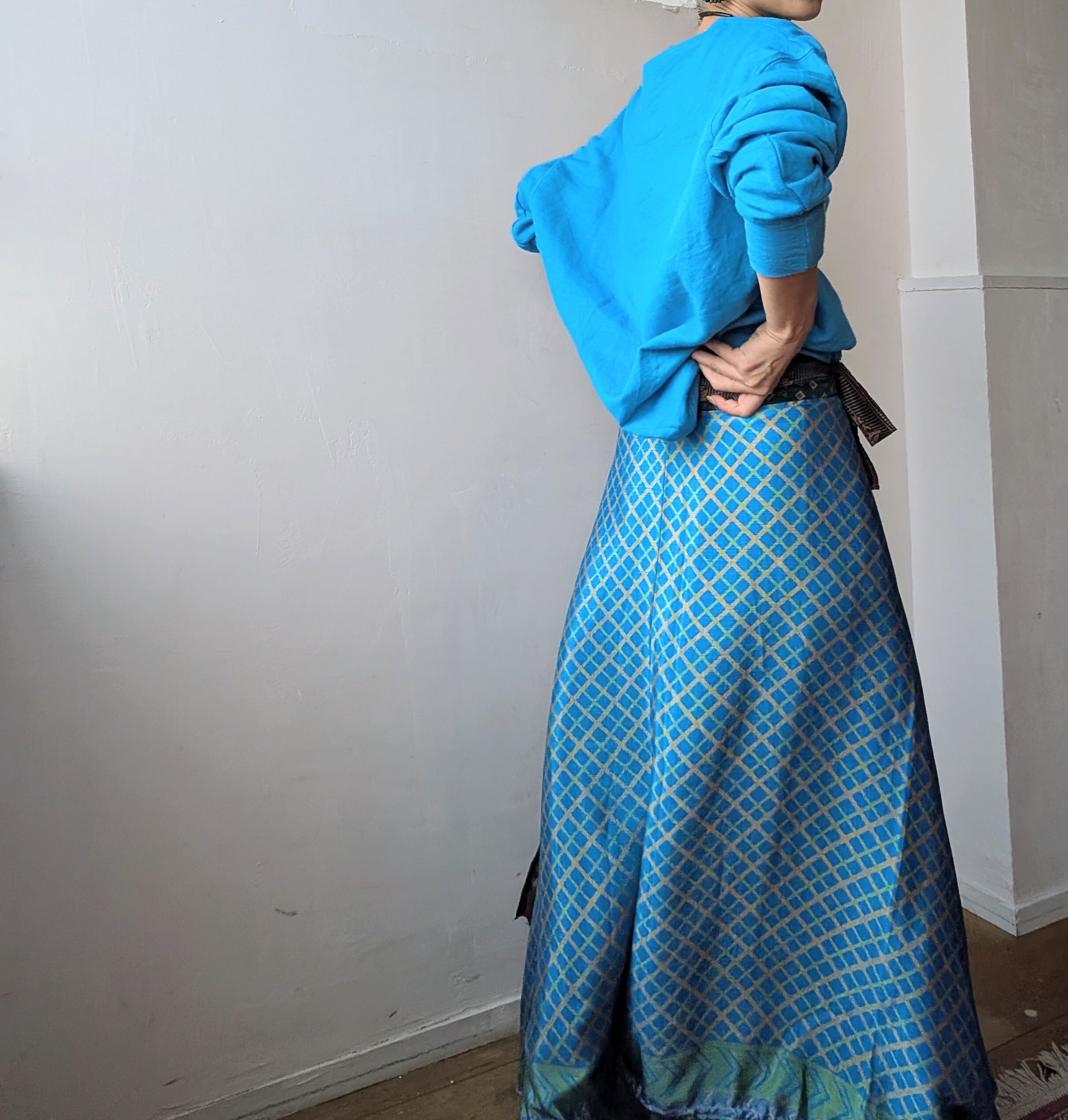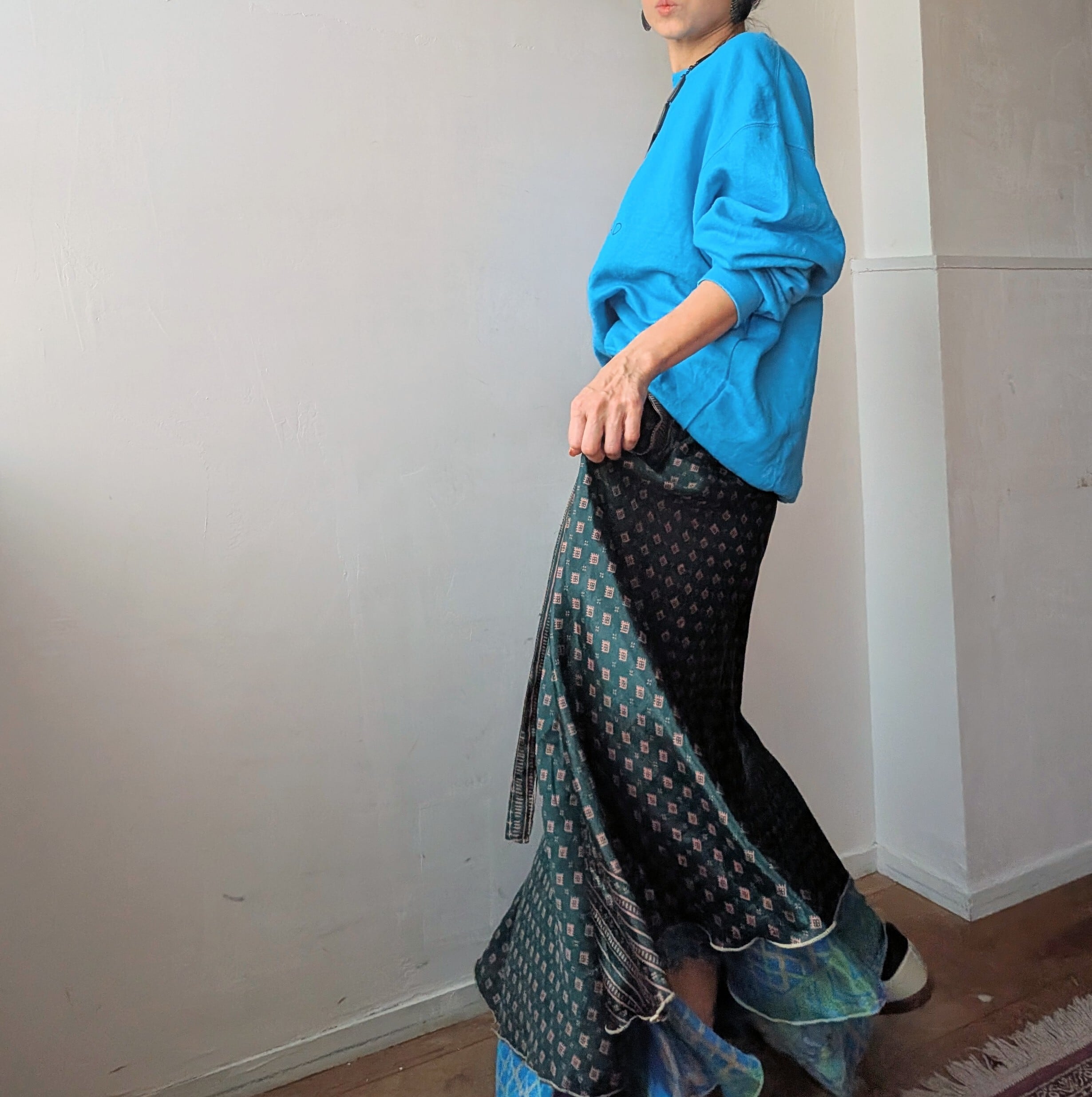 美しいインドの伝統が息づく、オールドサリーをリメイクした巻きスカートで、一枚ずつセレクトされたサリーから1点1点ハンドメイドで作られており