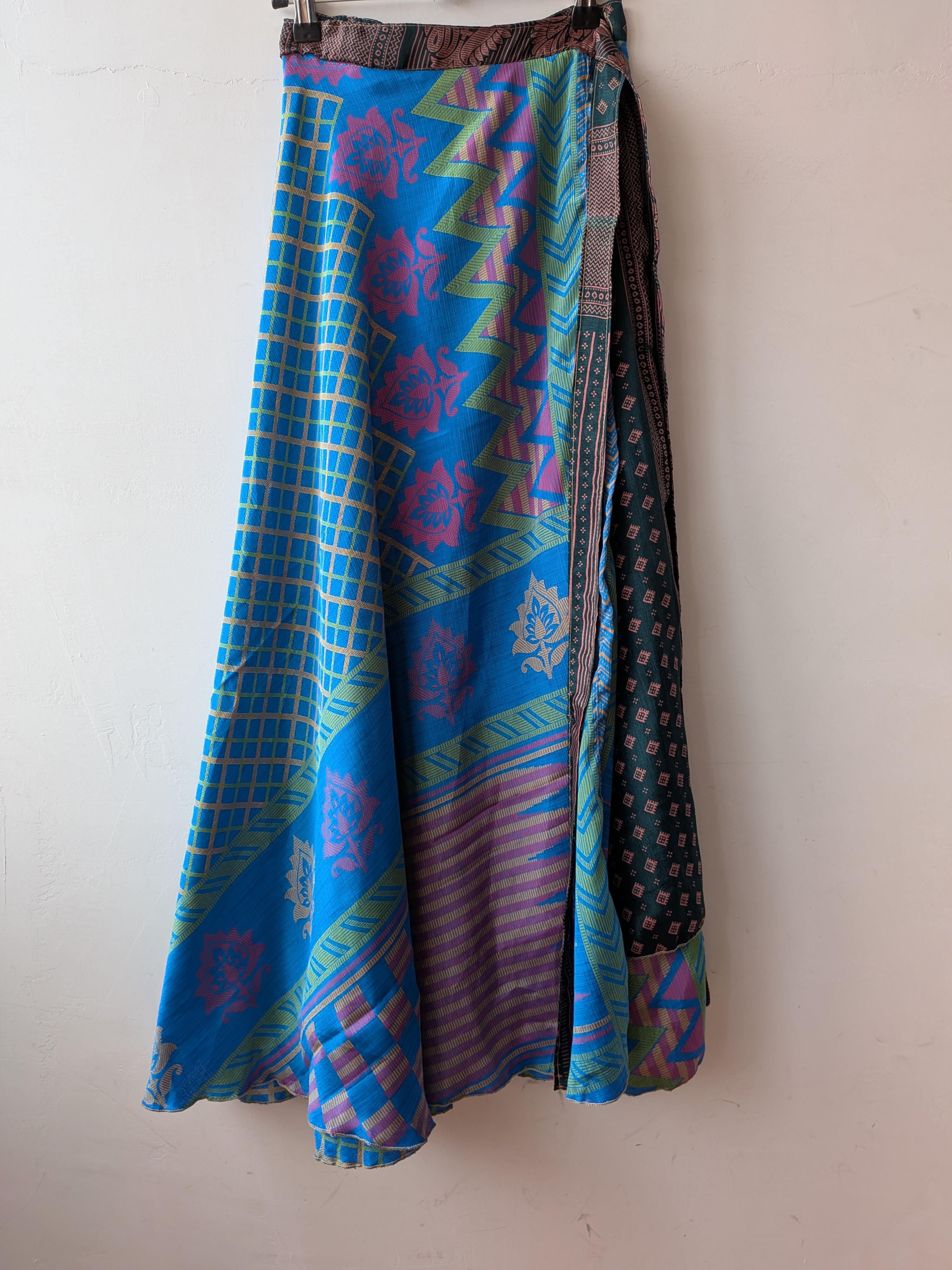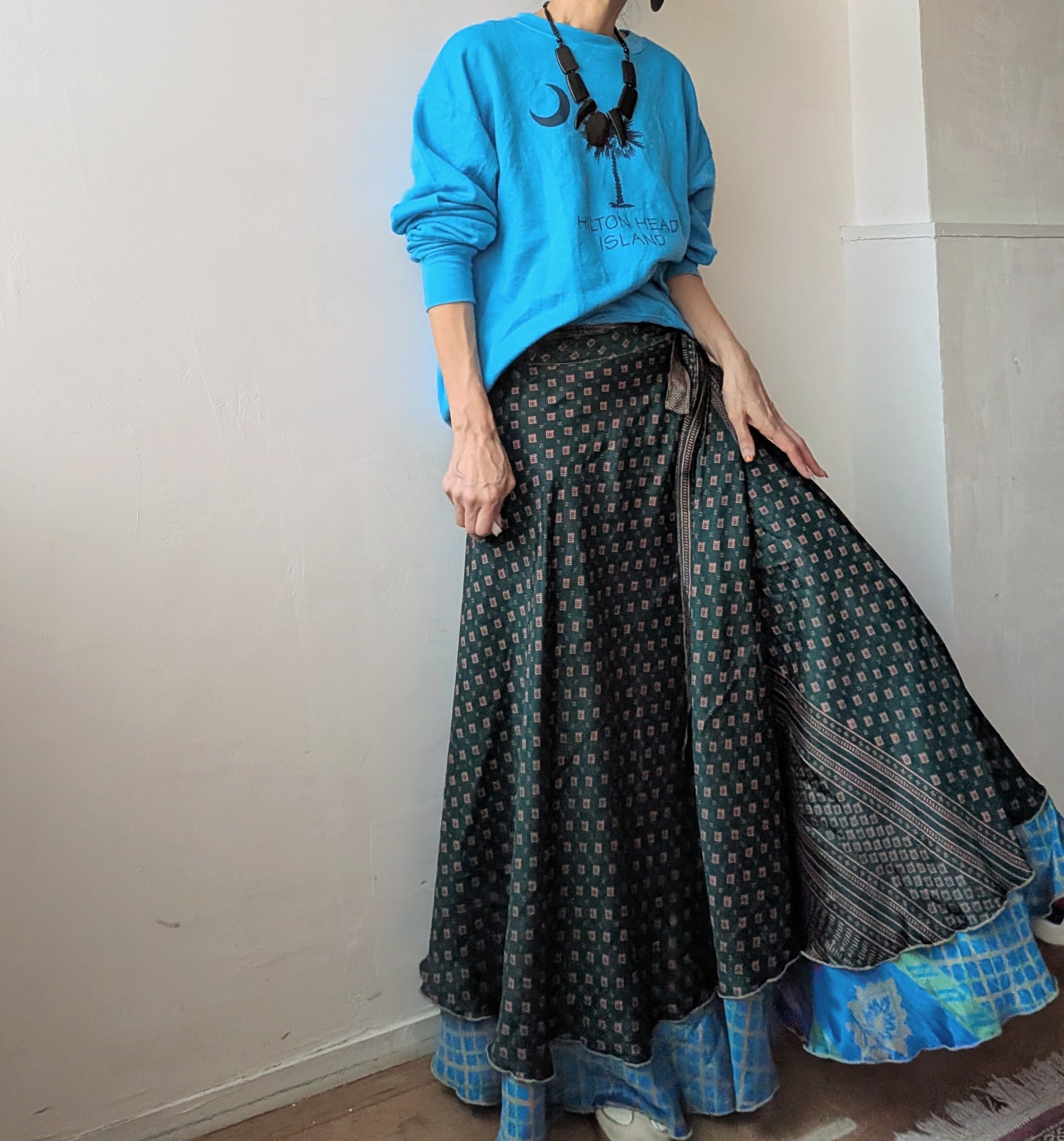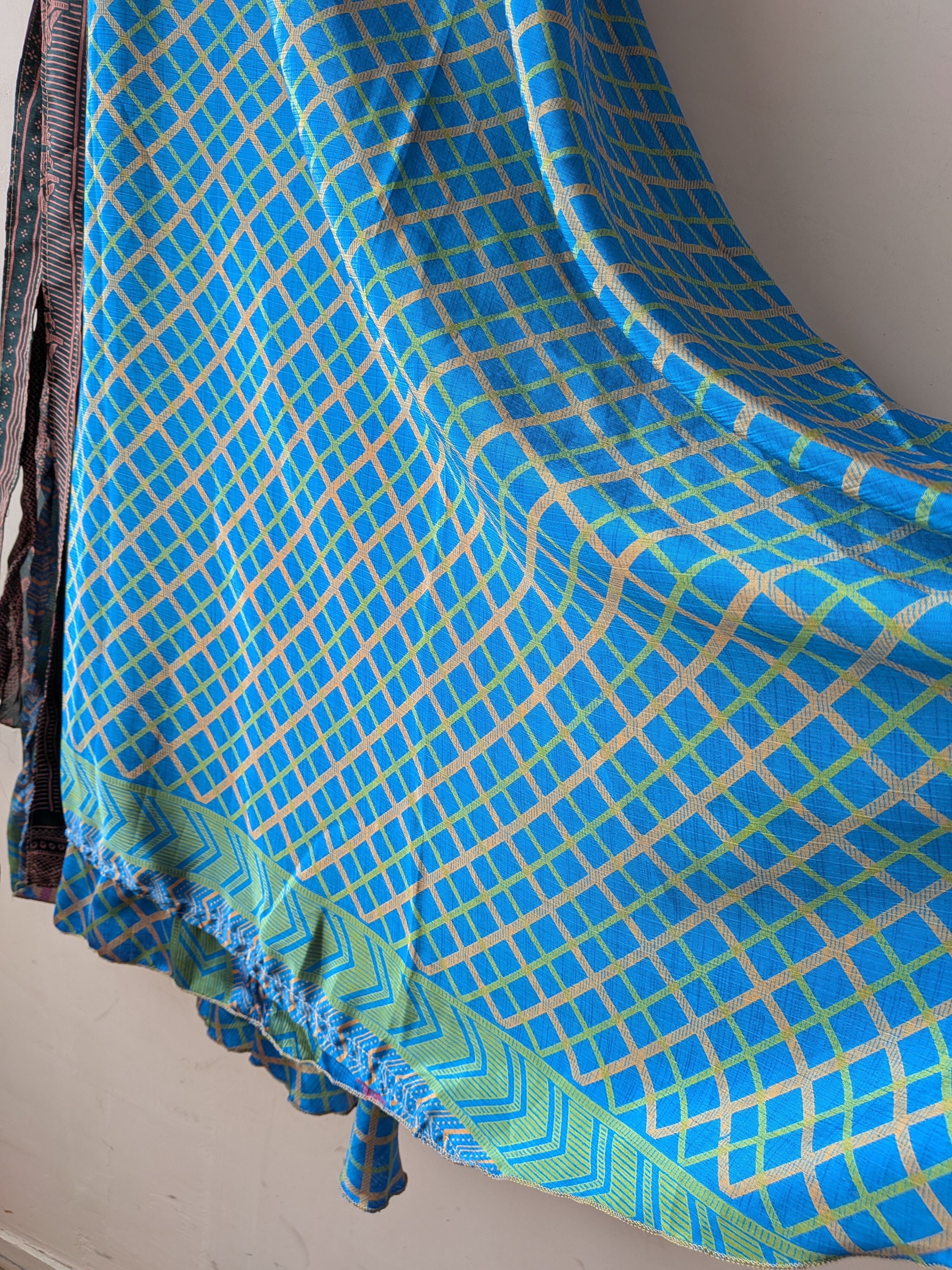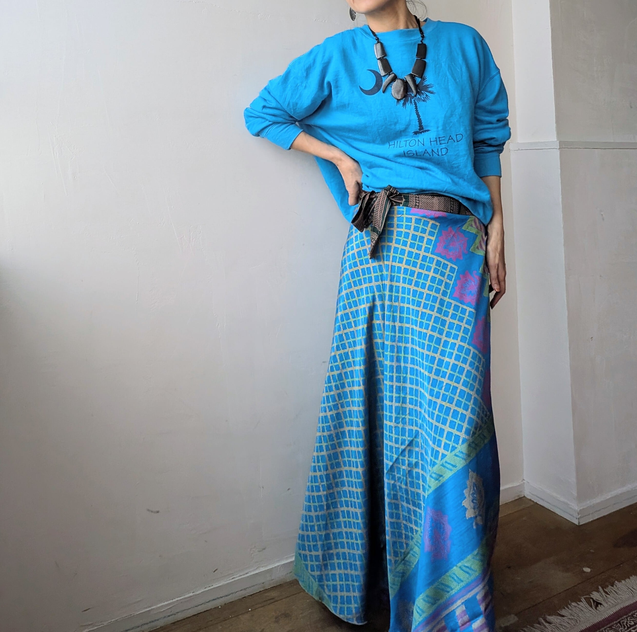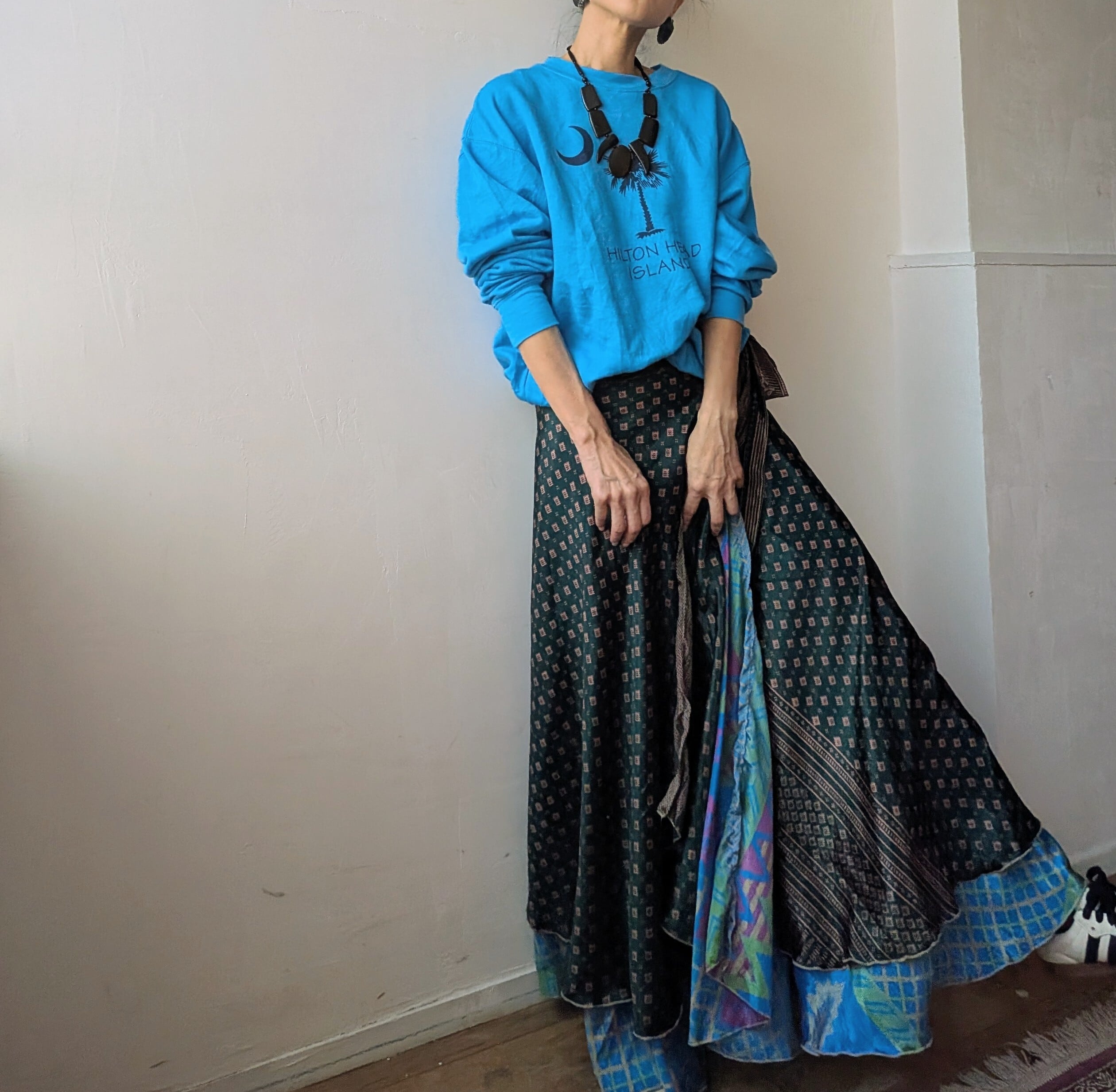 美しいインドの伝統が息づく、オールドサリーをリメイクした巻きスカートで、一枚ずつセレクトされたサリーから1点1点ハンドメイドで作られており