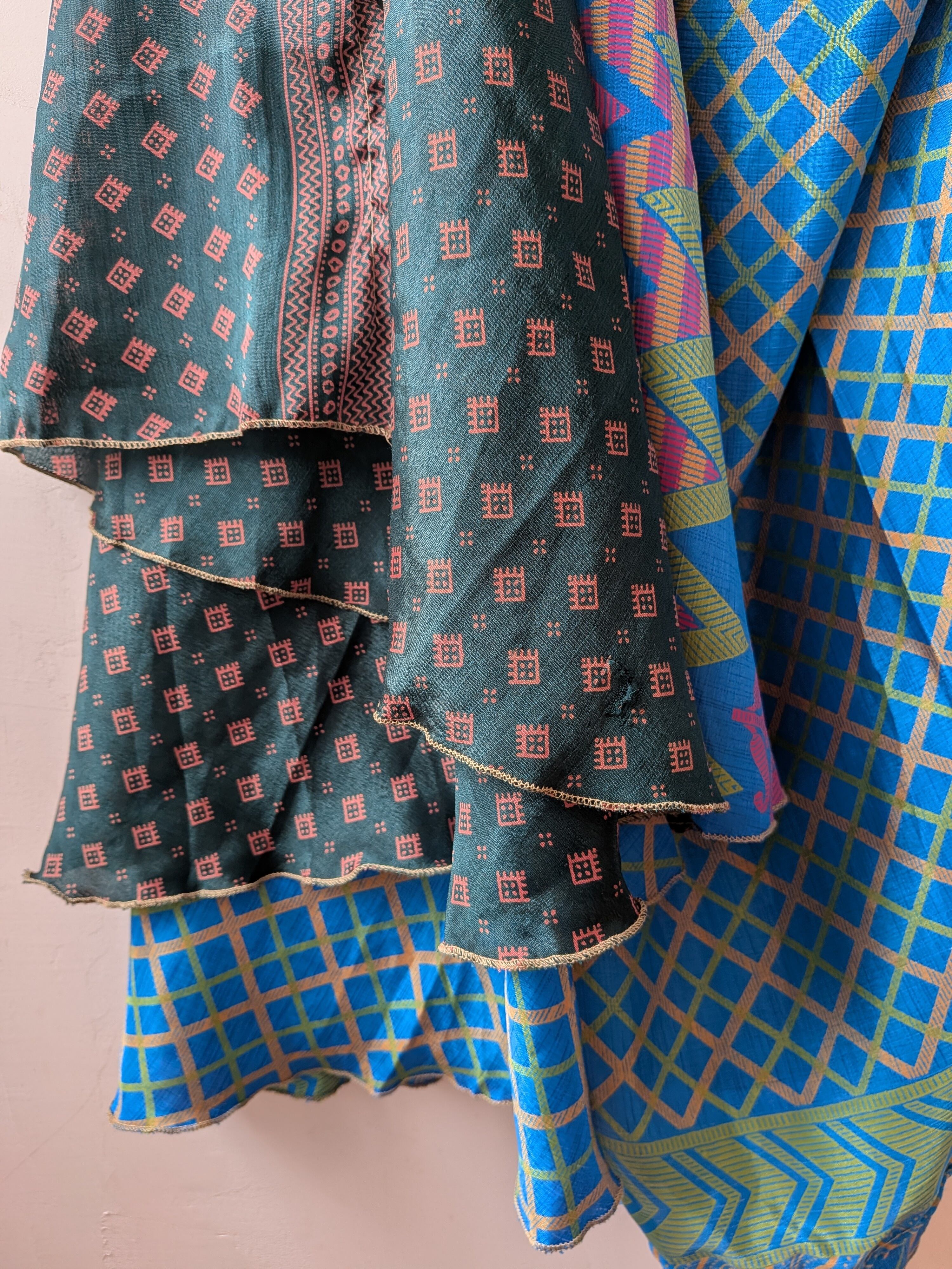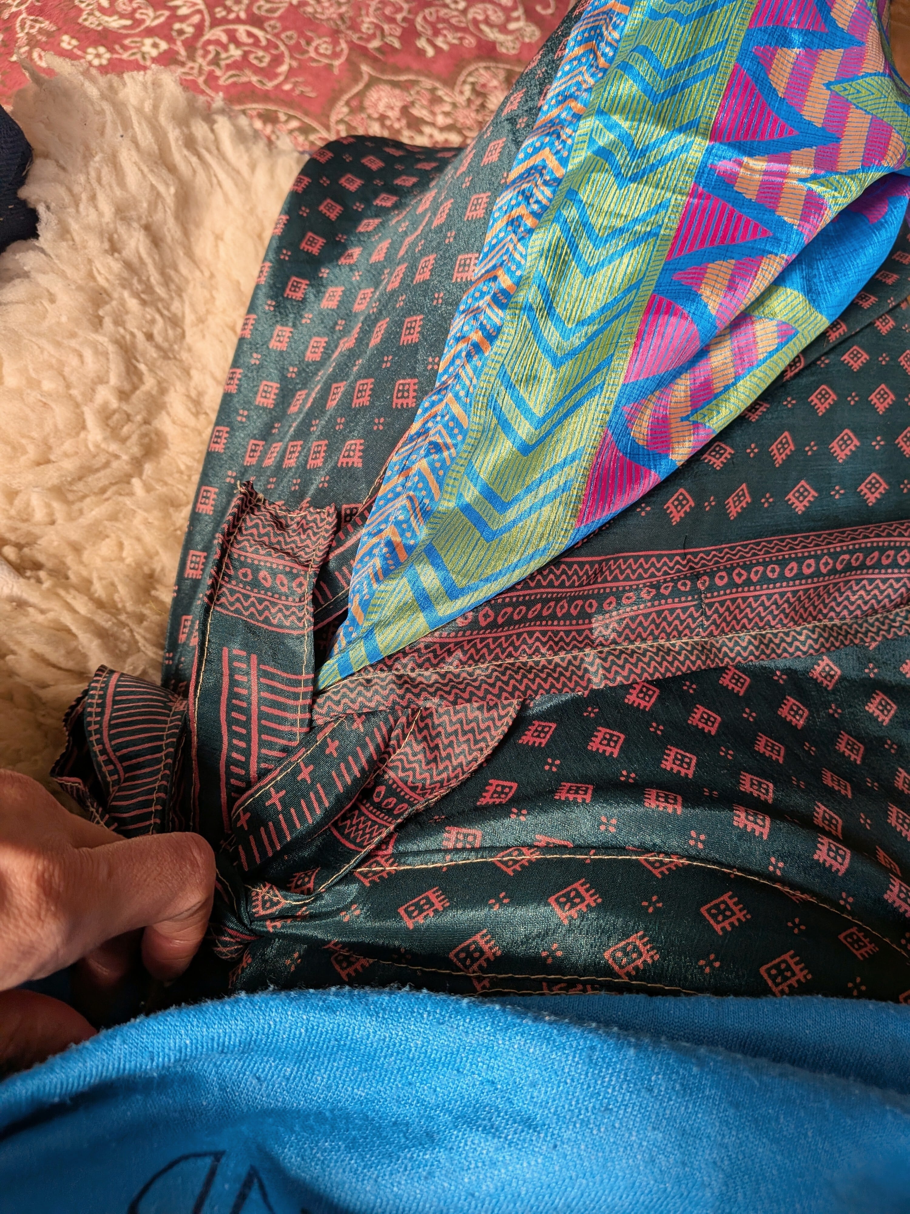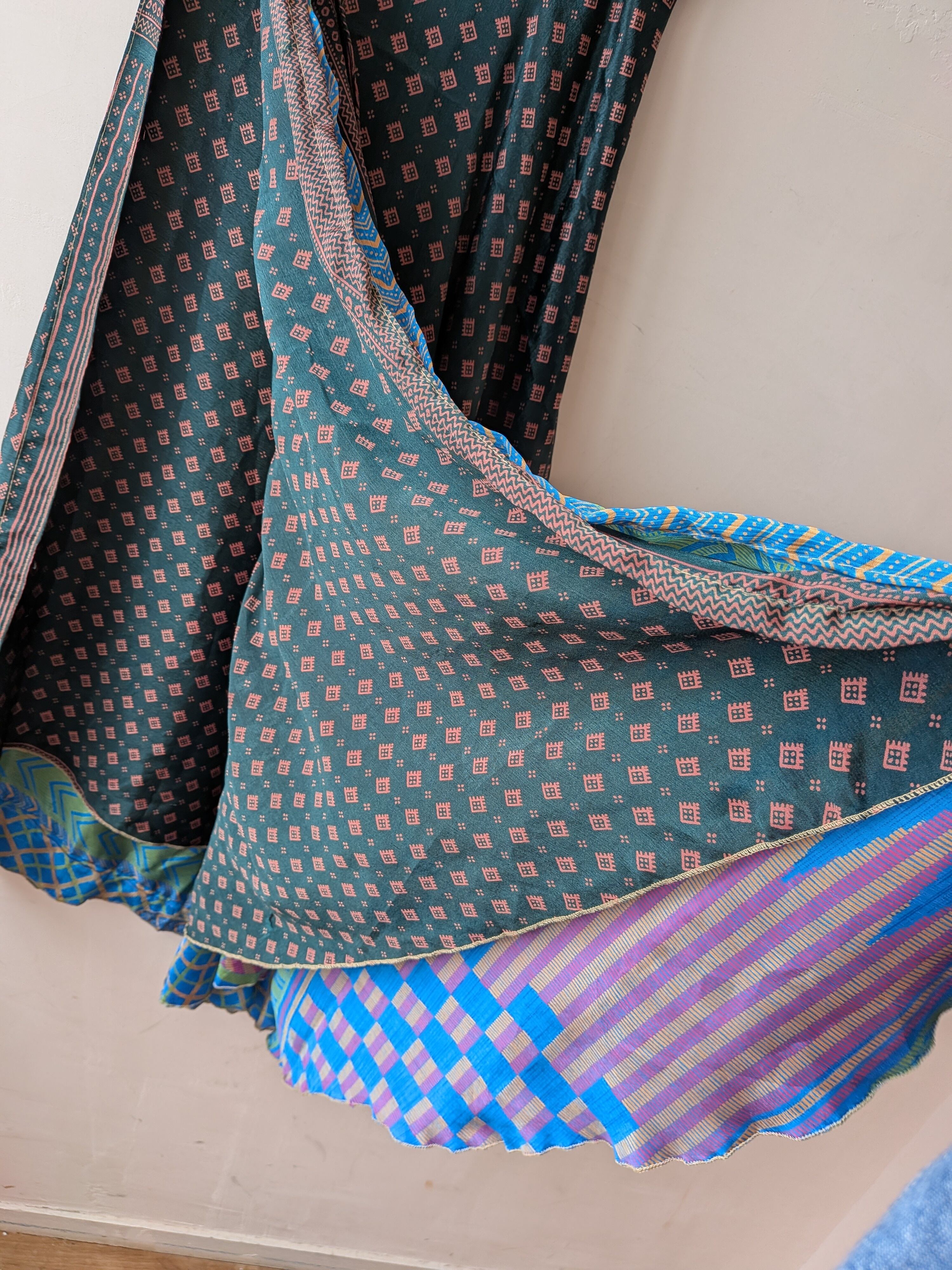 こちらはvintageサリーをリメイクしたお品となり、1点1点手作業で作られているため、生地にほつれなどがある場合があります。