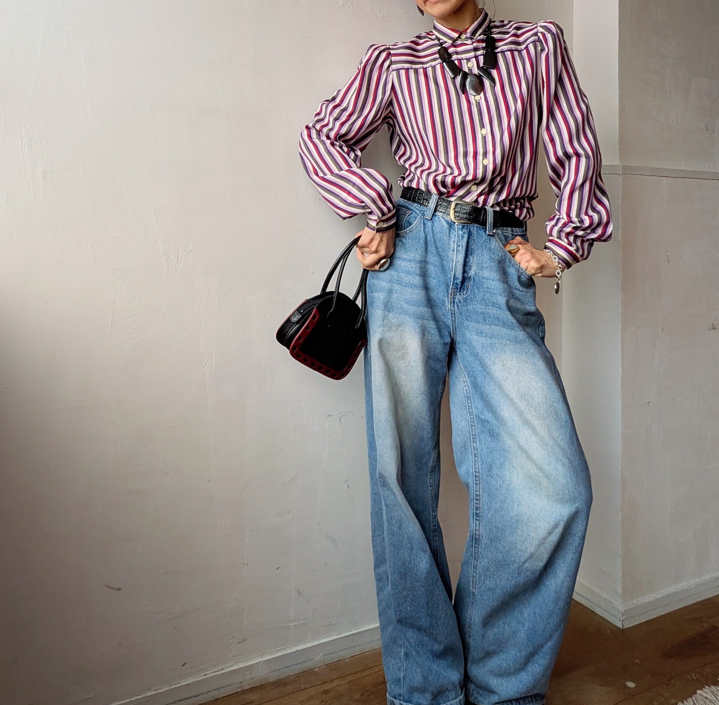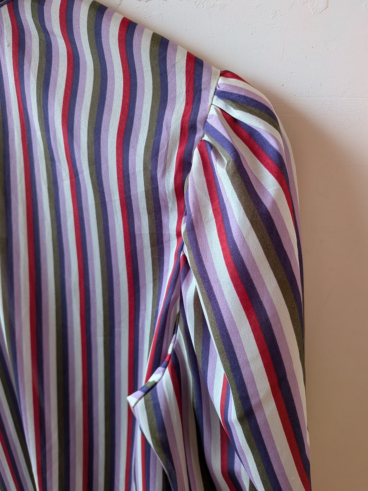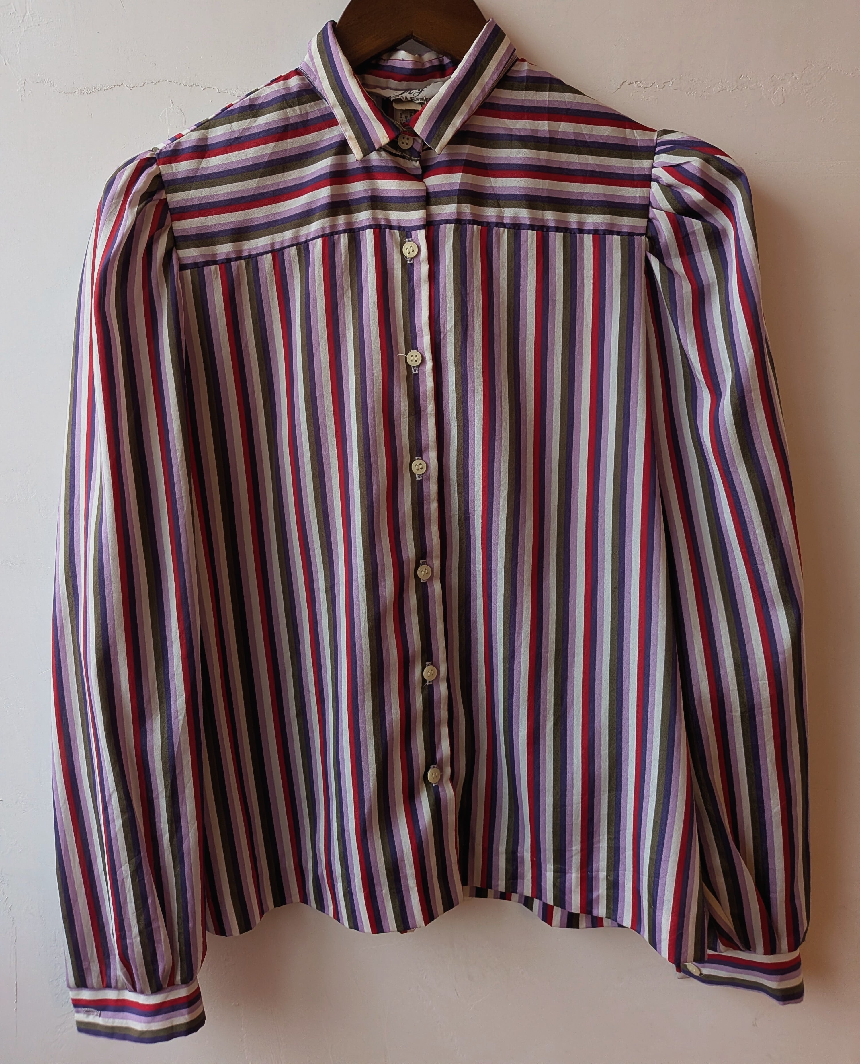 鮮やかなストライプ柄とふんわりボリュームあるパフスリーブが特徴の80年代USAヴィンテージブラウス。
