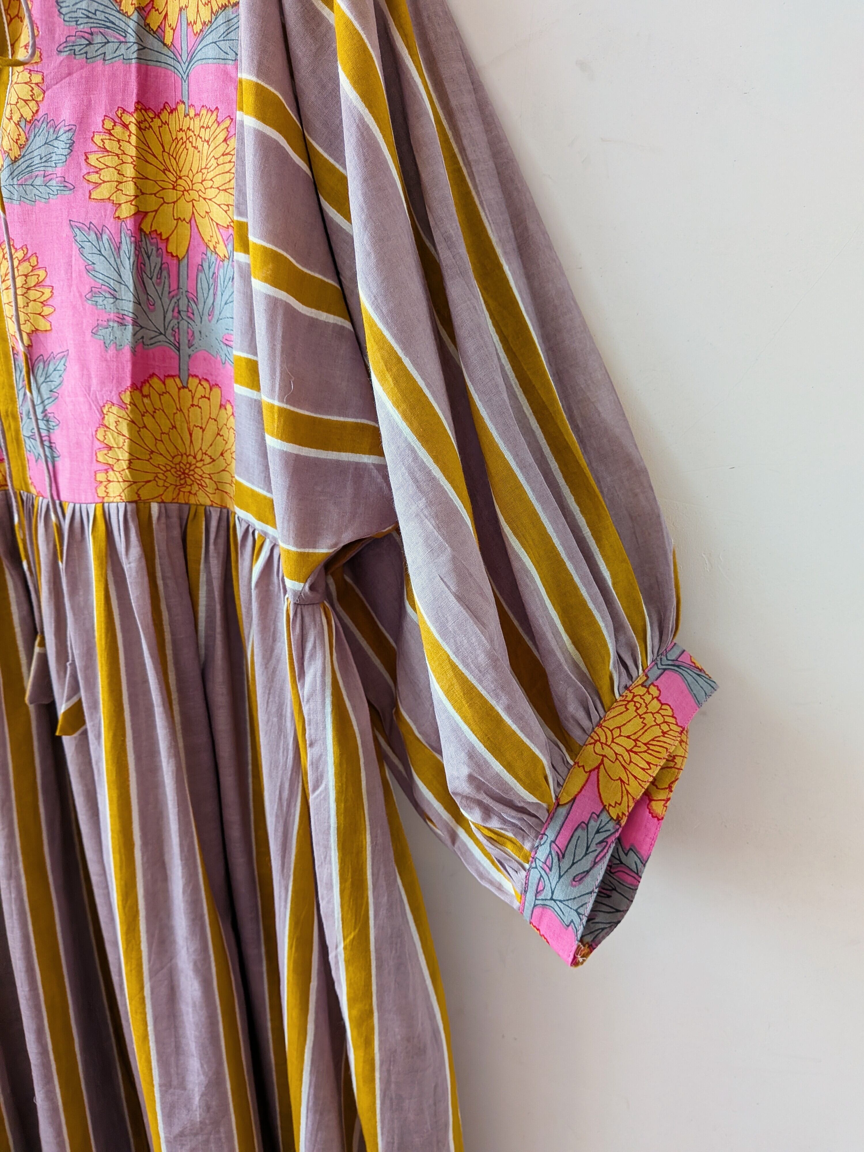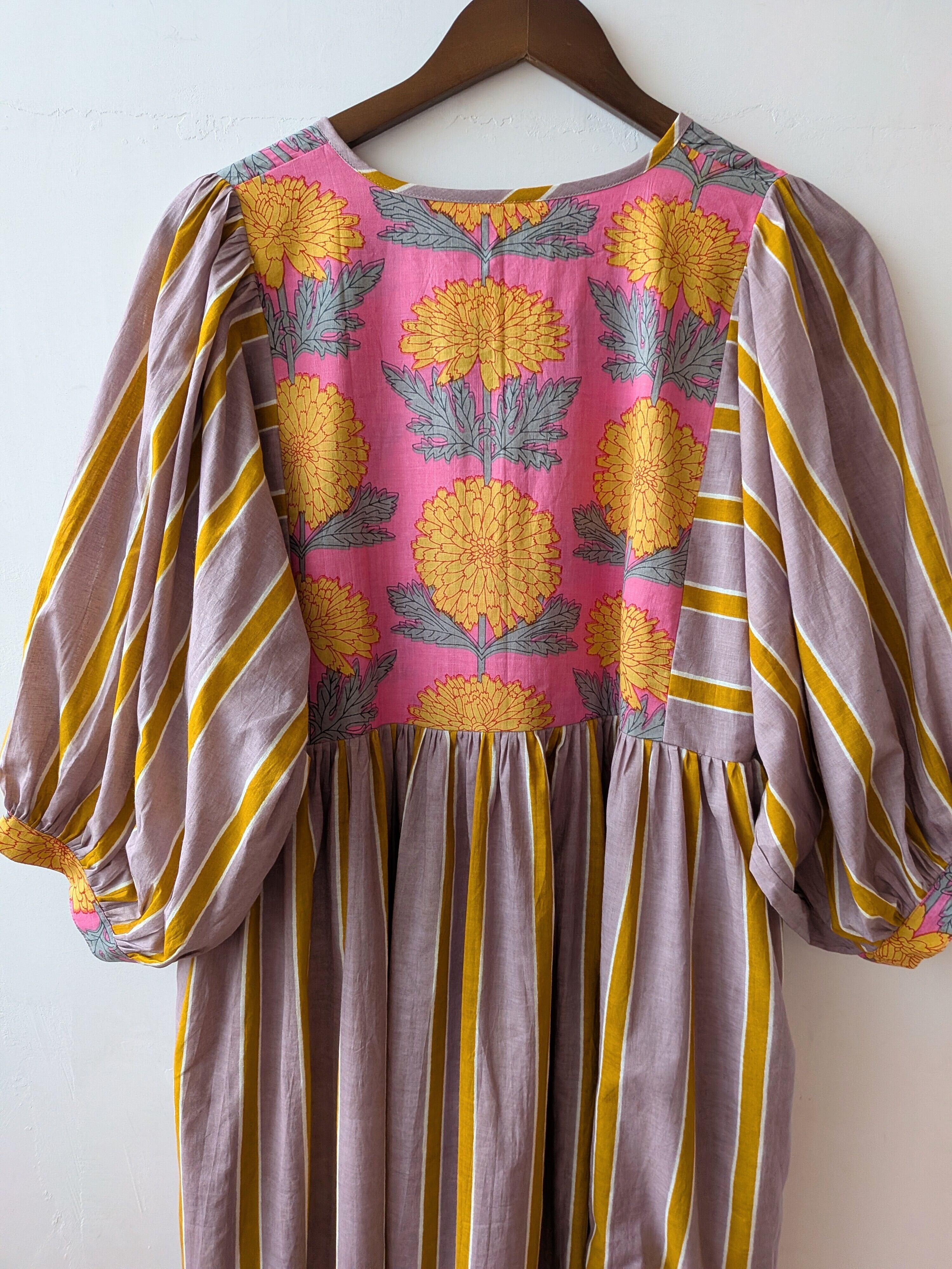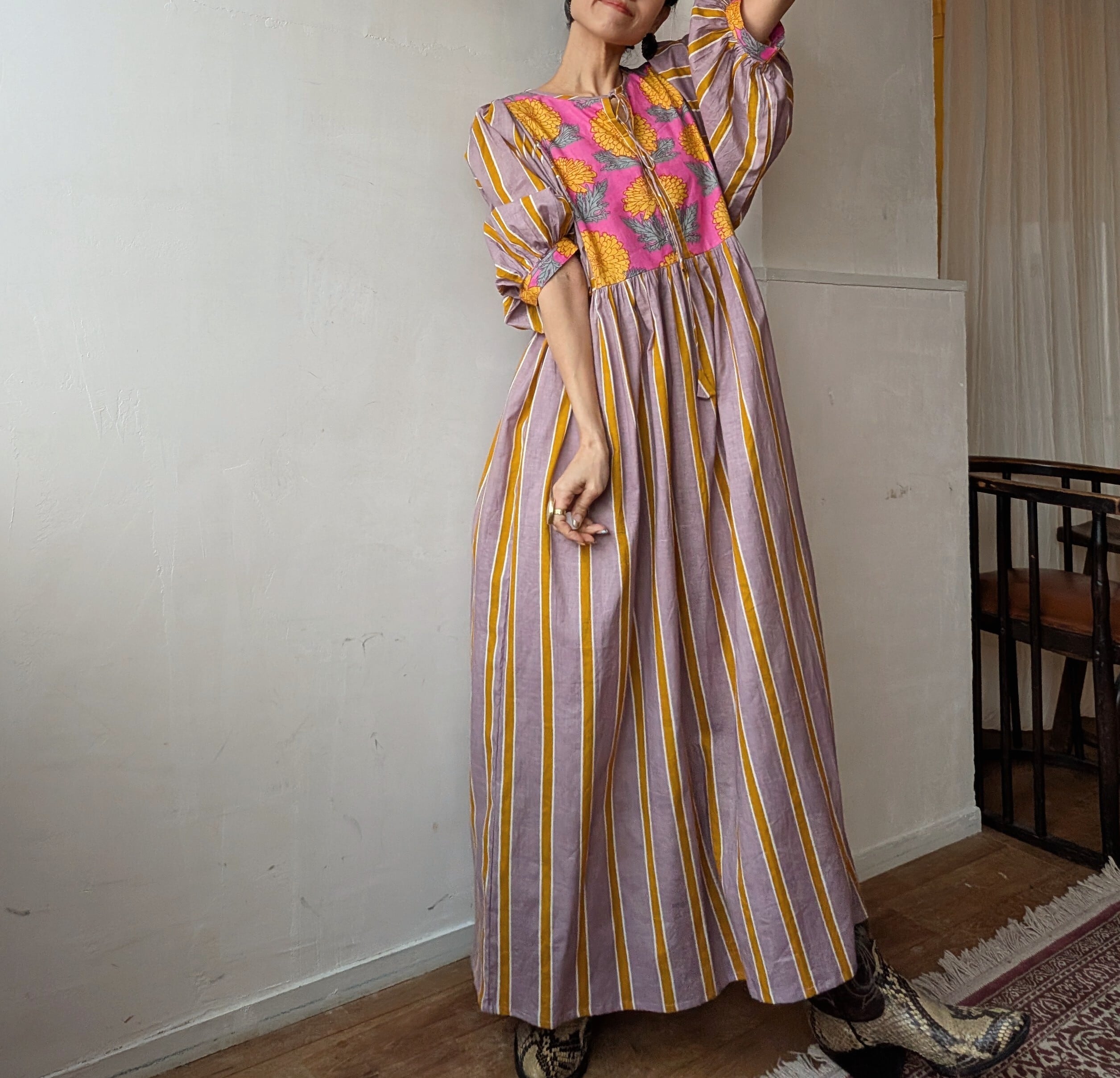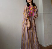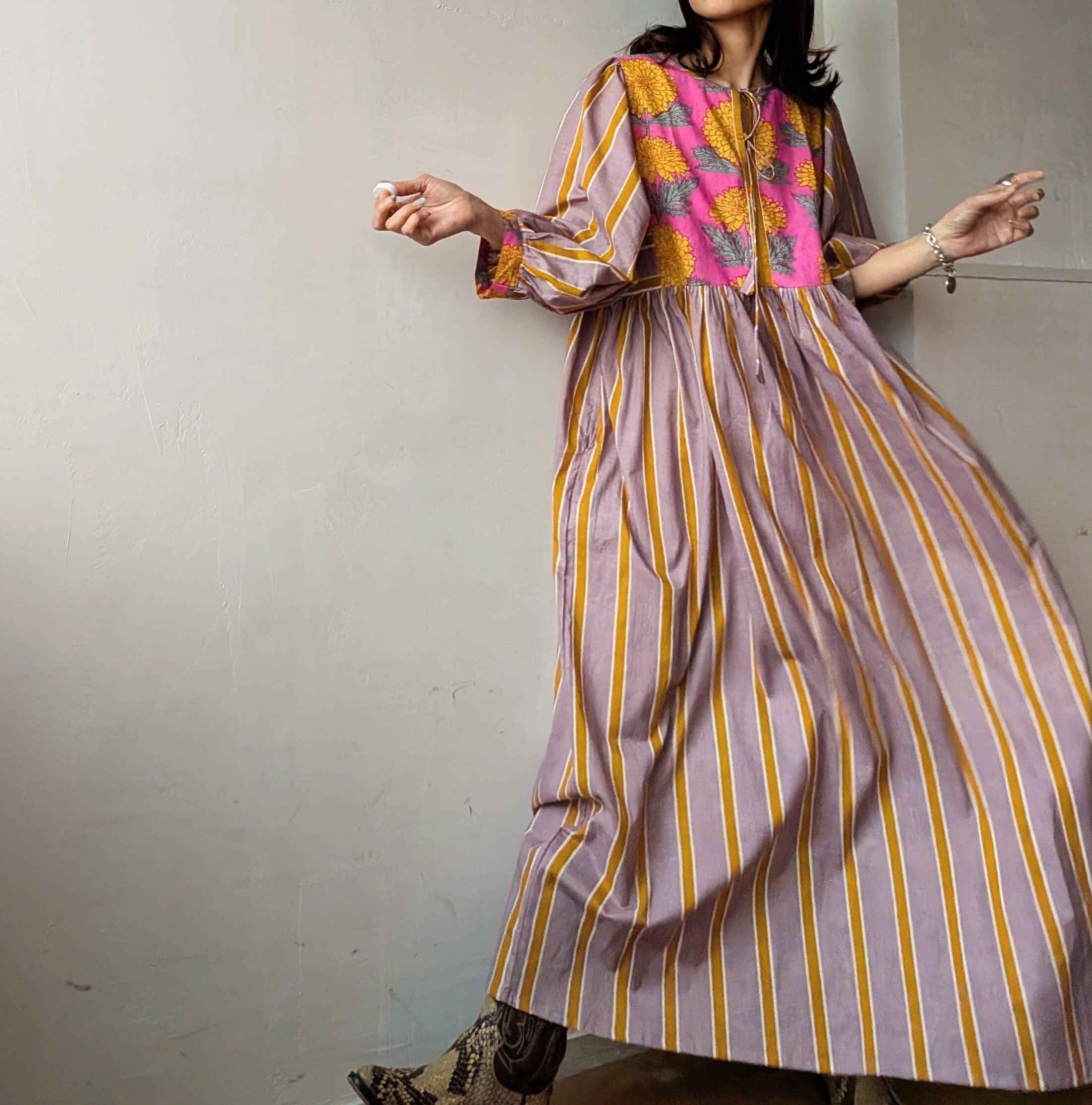 華やかなブロックプリントと控えめで落ちついた大人なな雰囲気のカシスピンクとオレンジカラーのストライプの切り替えしデザインが可愛いすぎるコットンドレス♡