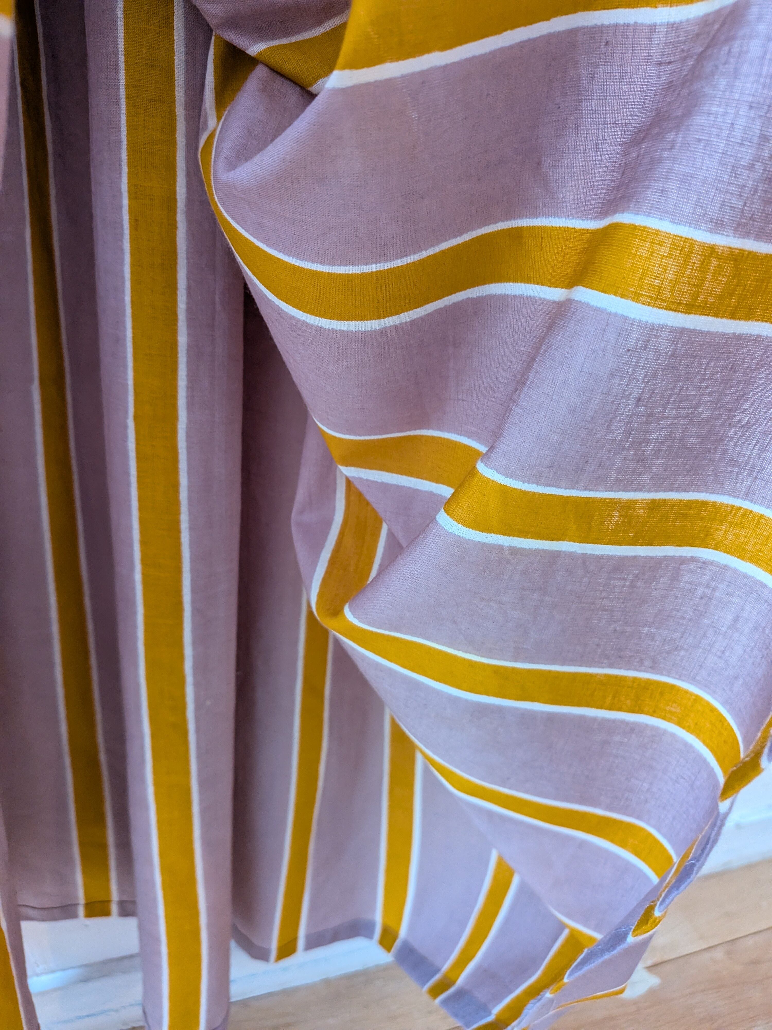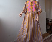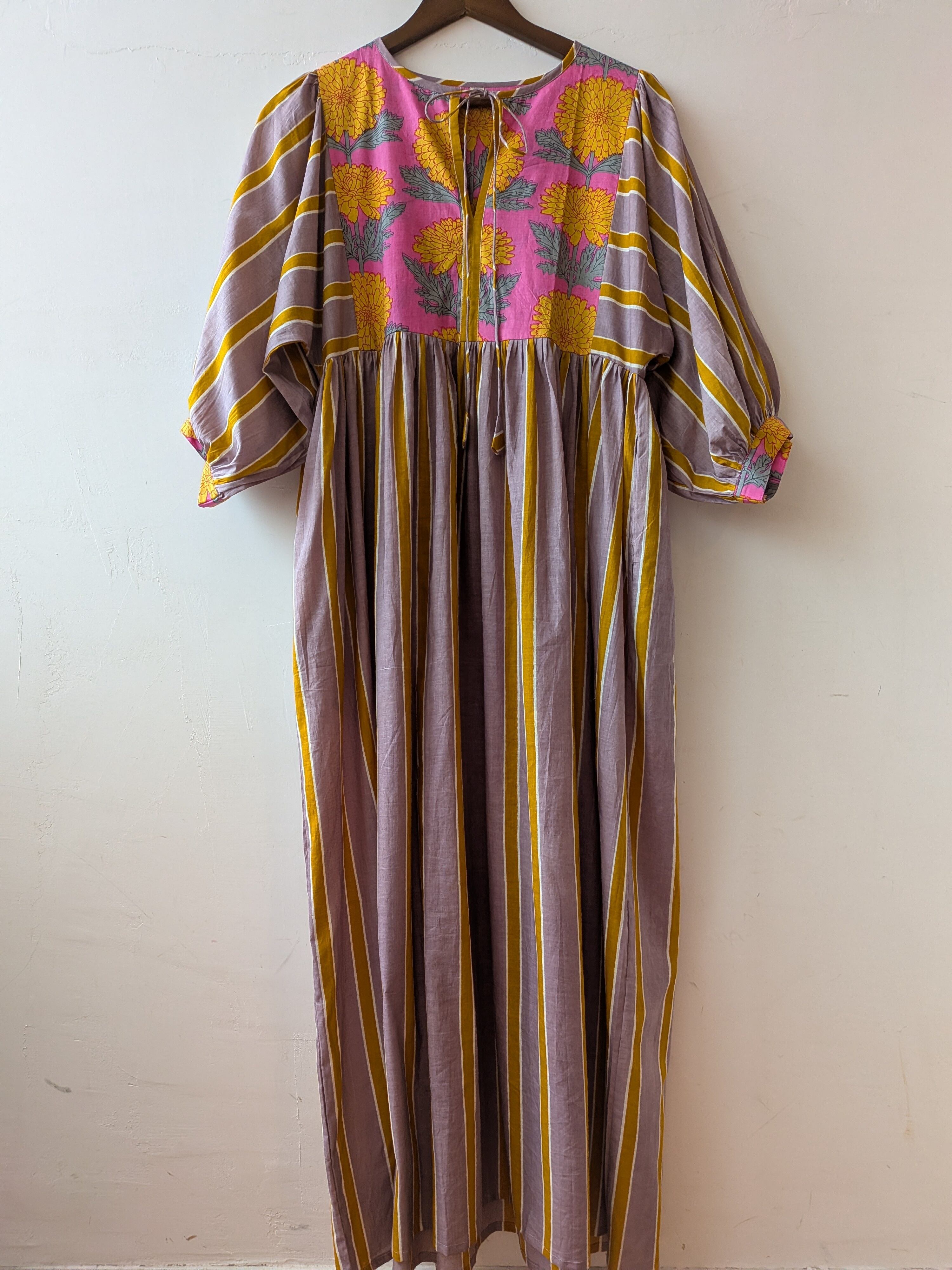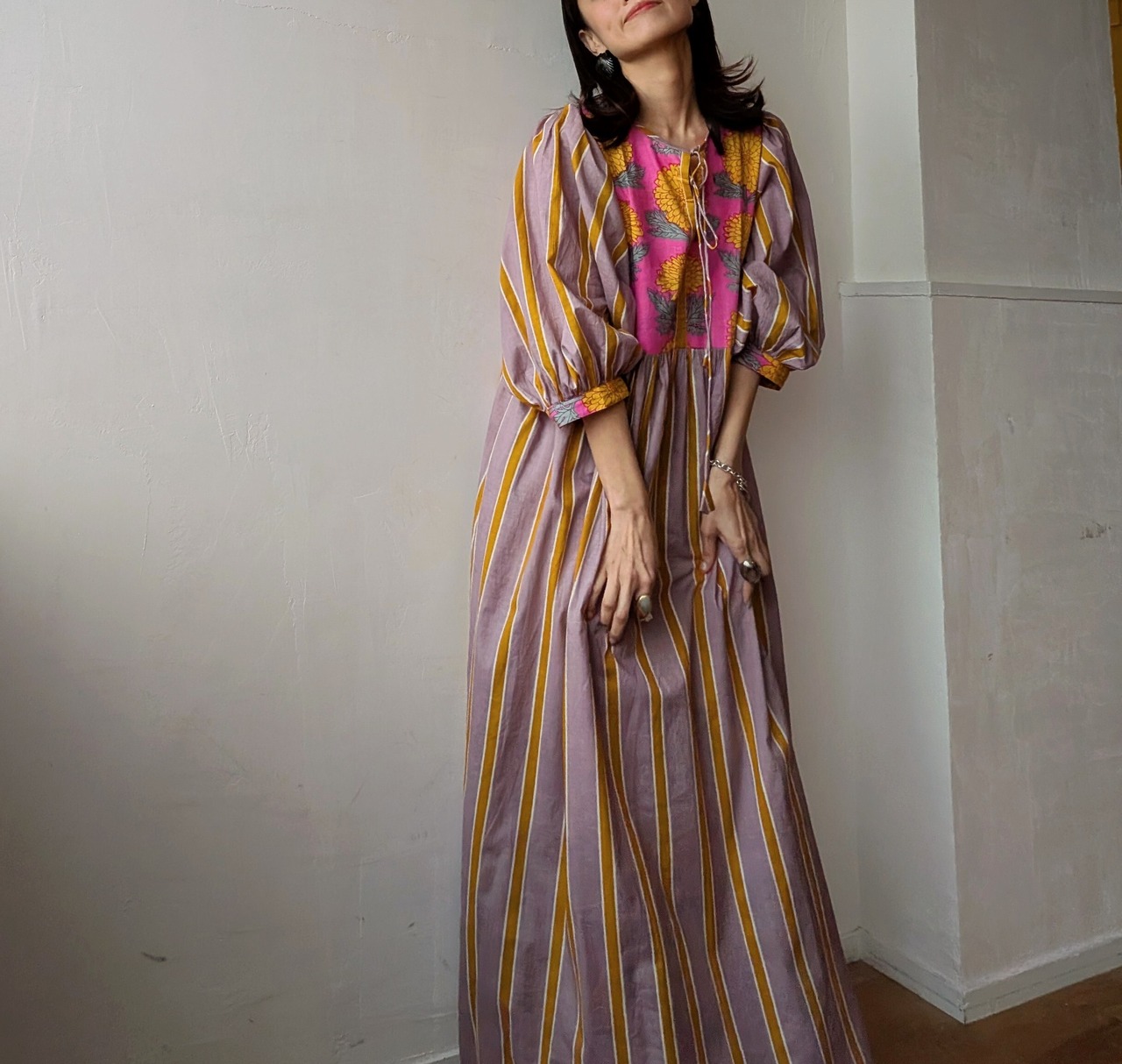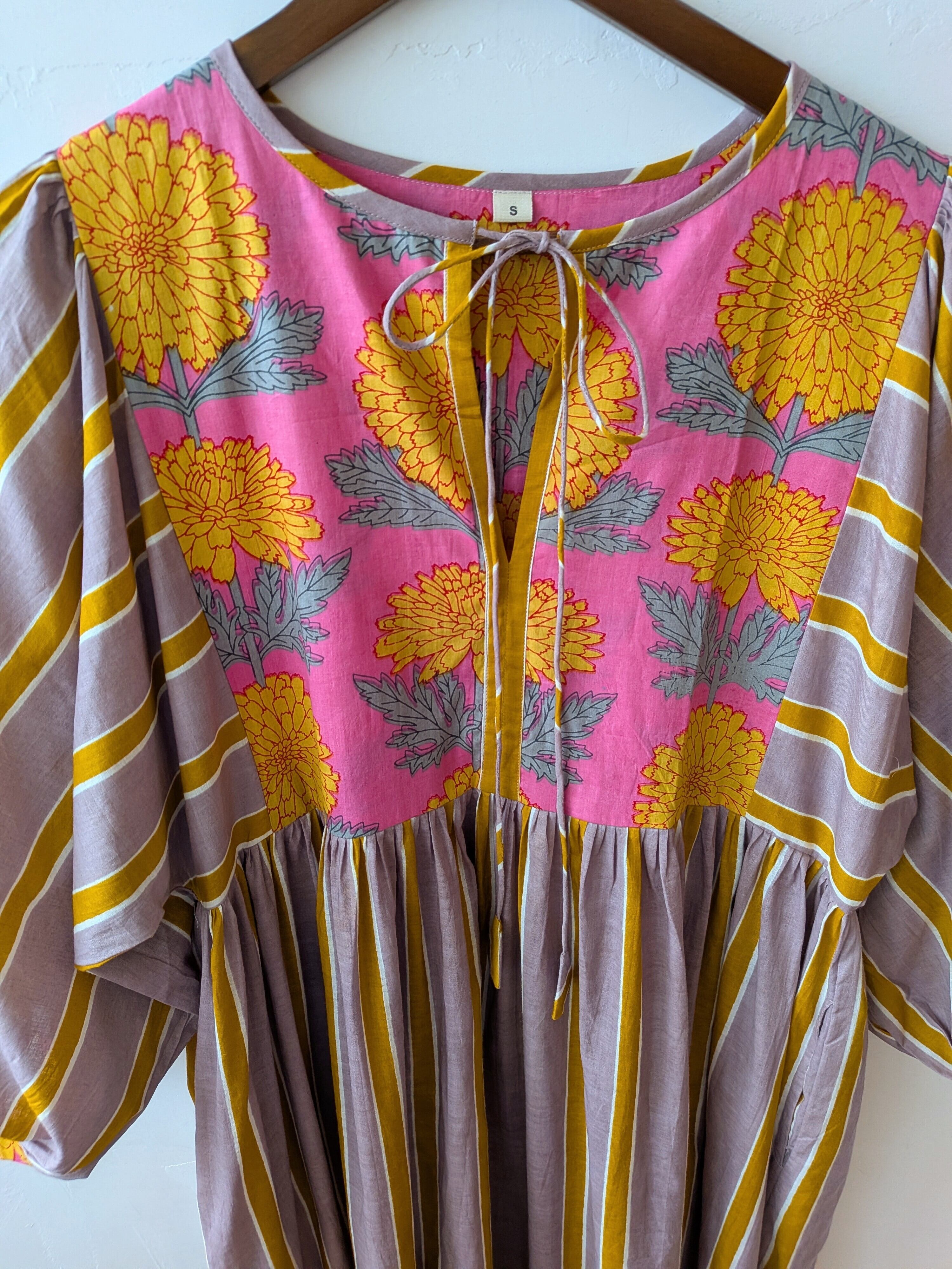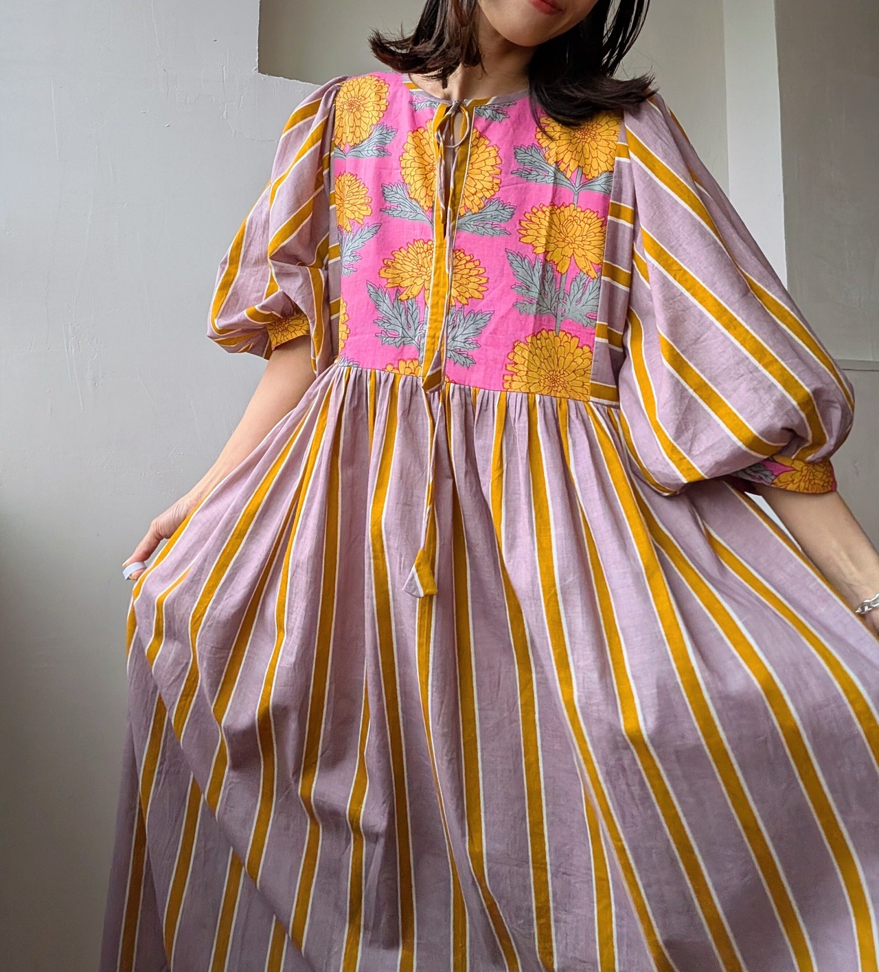 華やかなブロックプリントと控えめで落ちついた大人なな雰囲気のカシスピンクとオレンジカラーのストライプの切り替えしデザインが可愛いすぎるコットンドレス♡