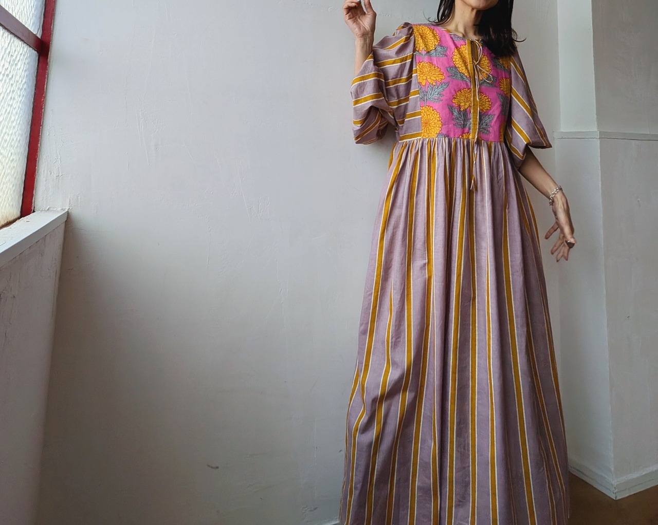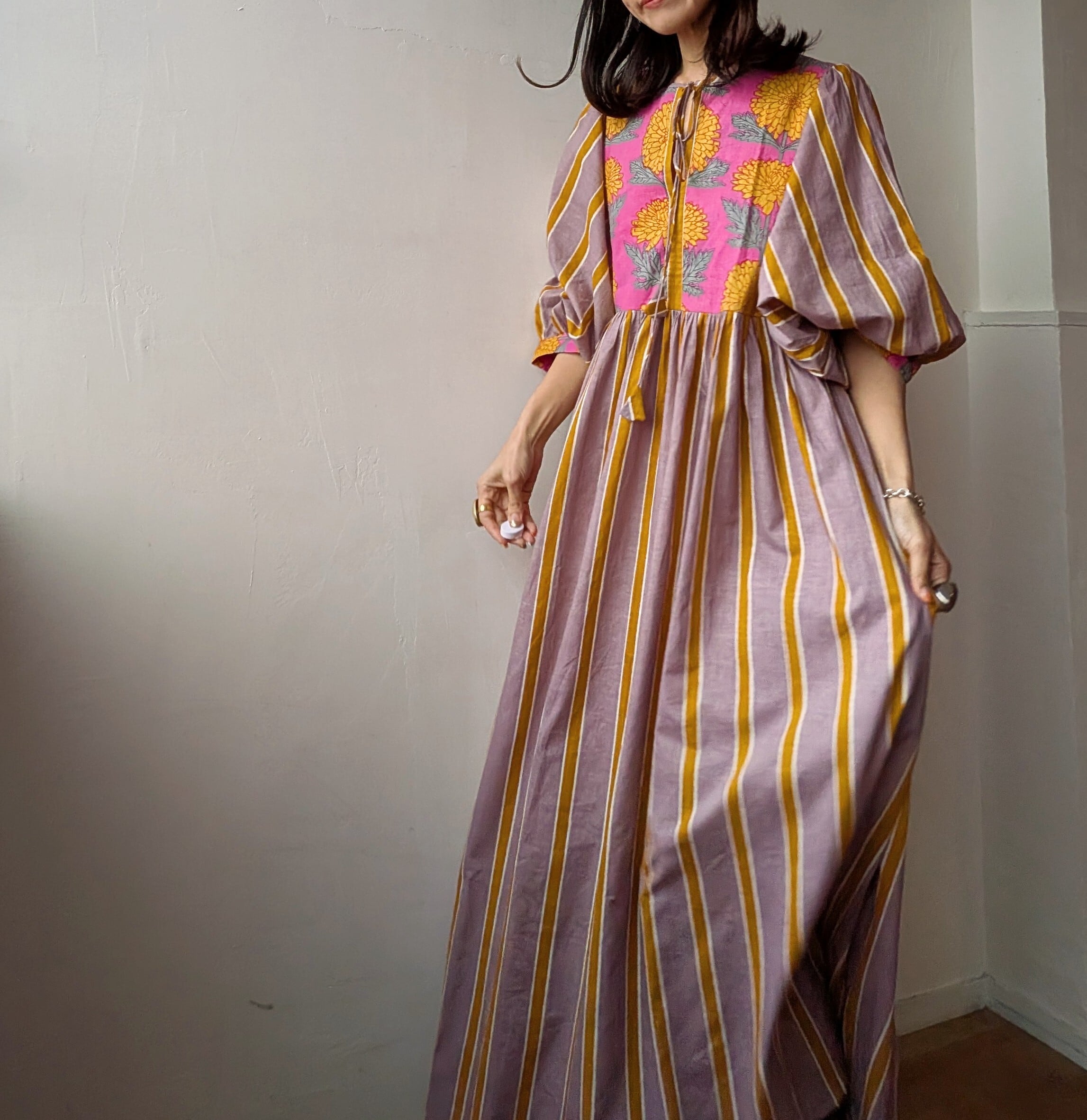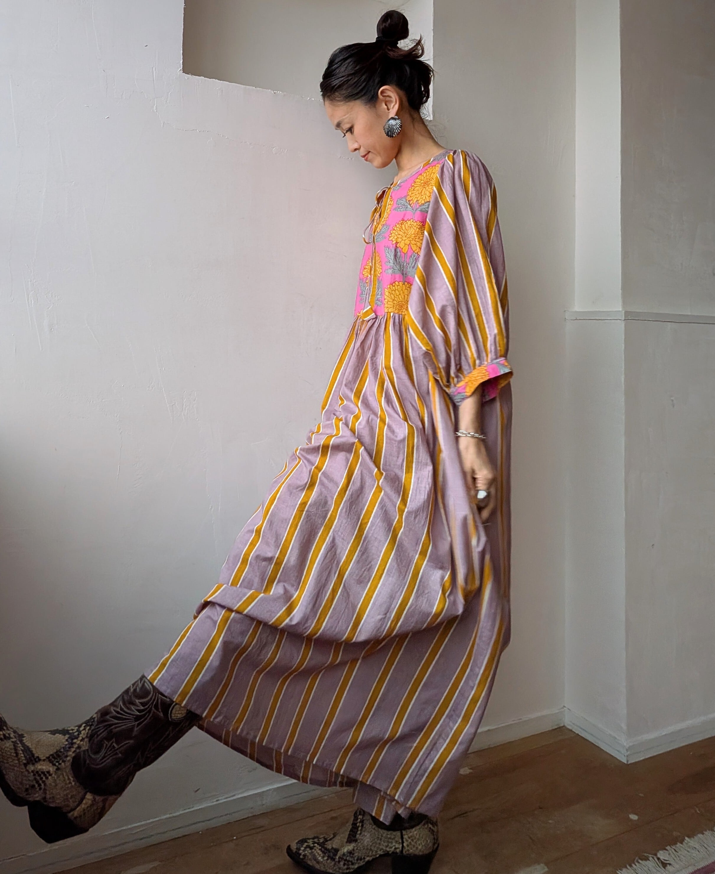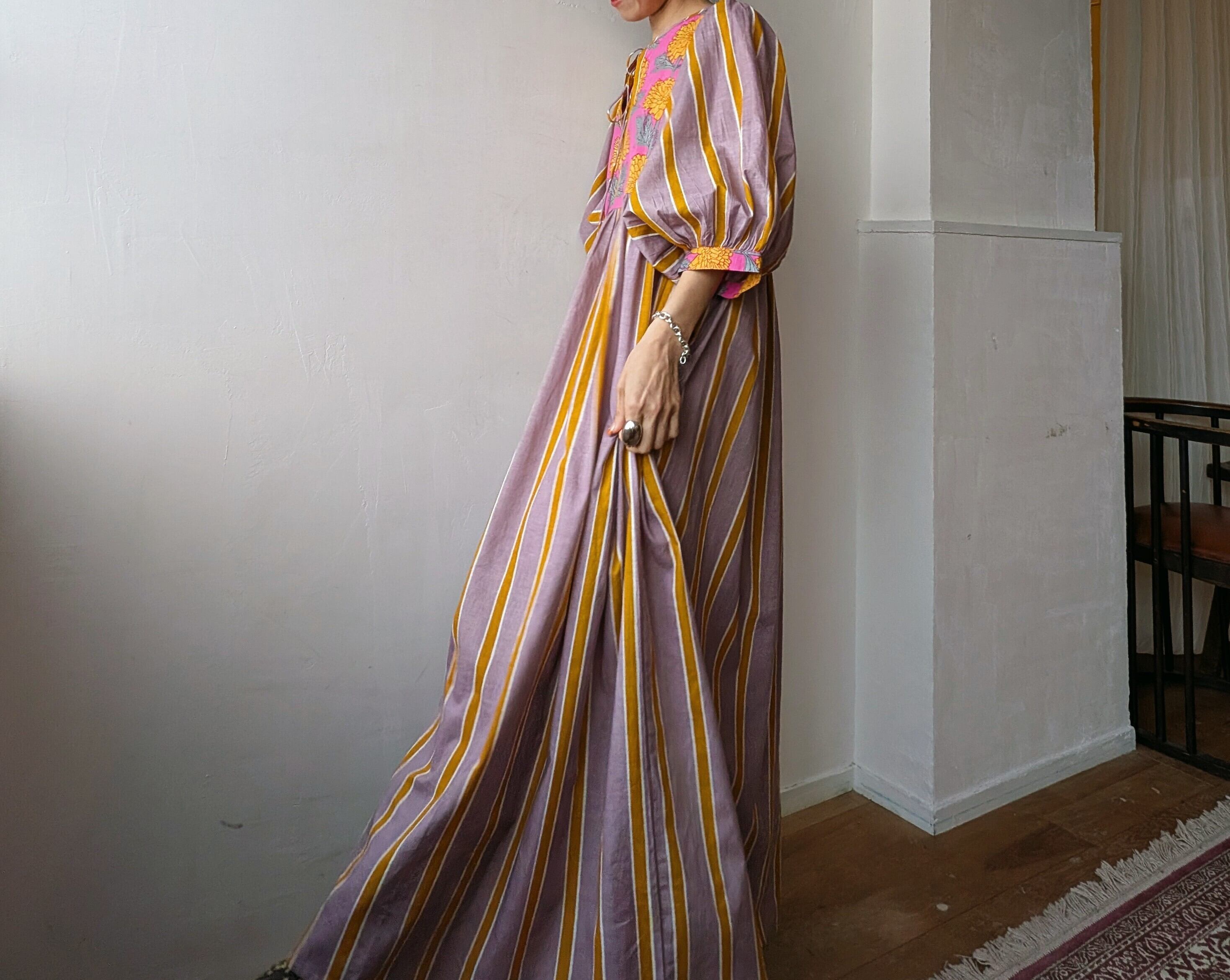 Blockprint Flower×Stripe cotton long dress/Cassis pink