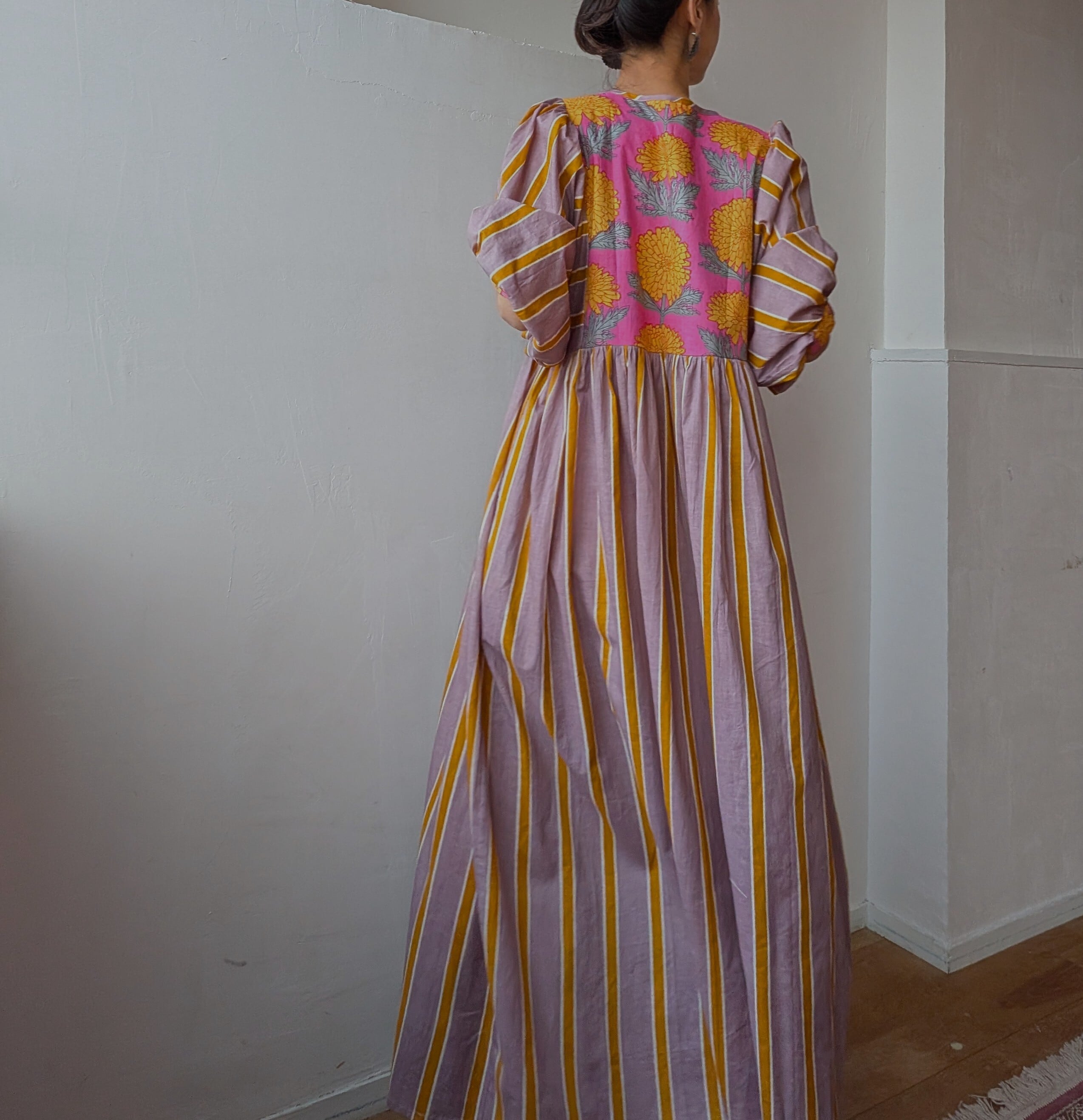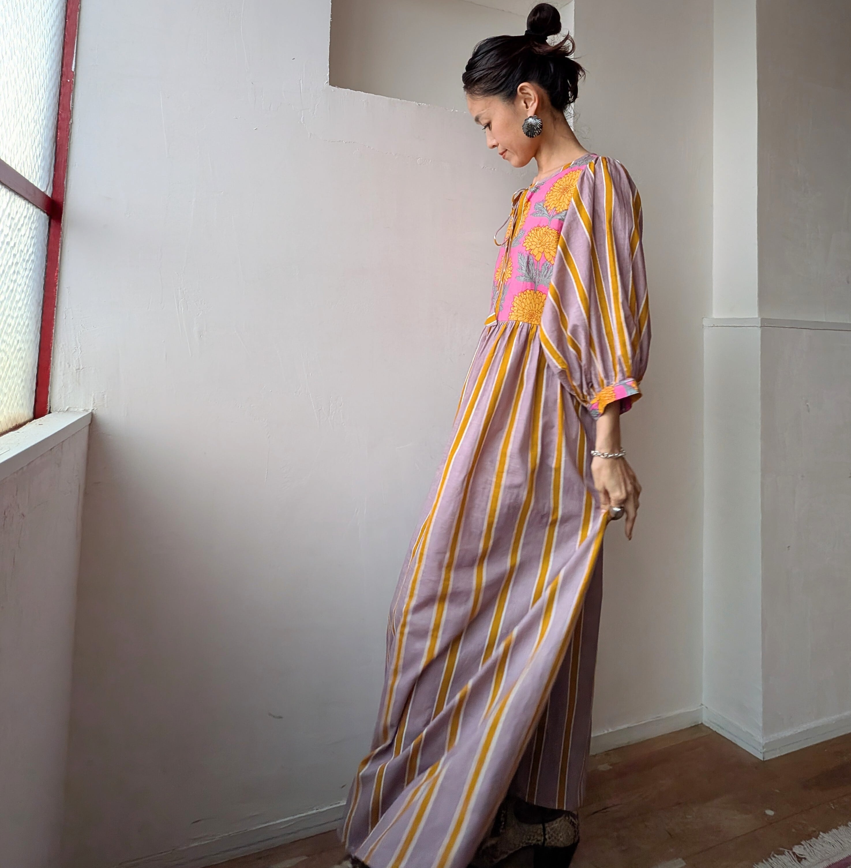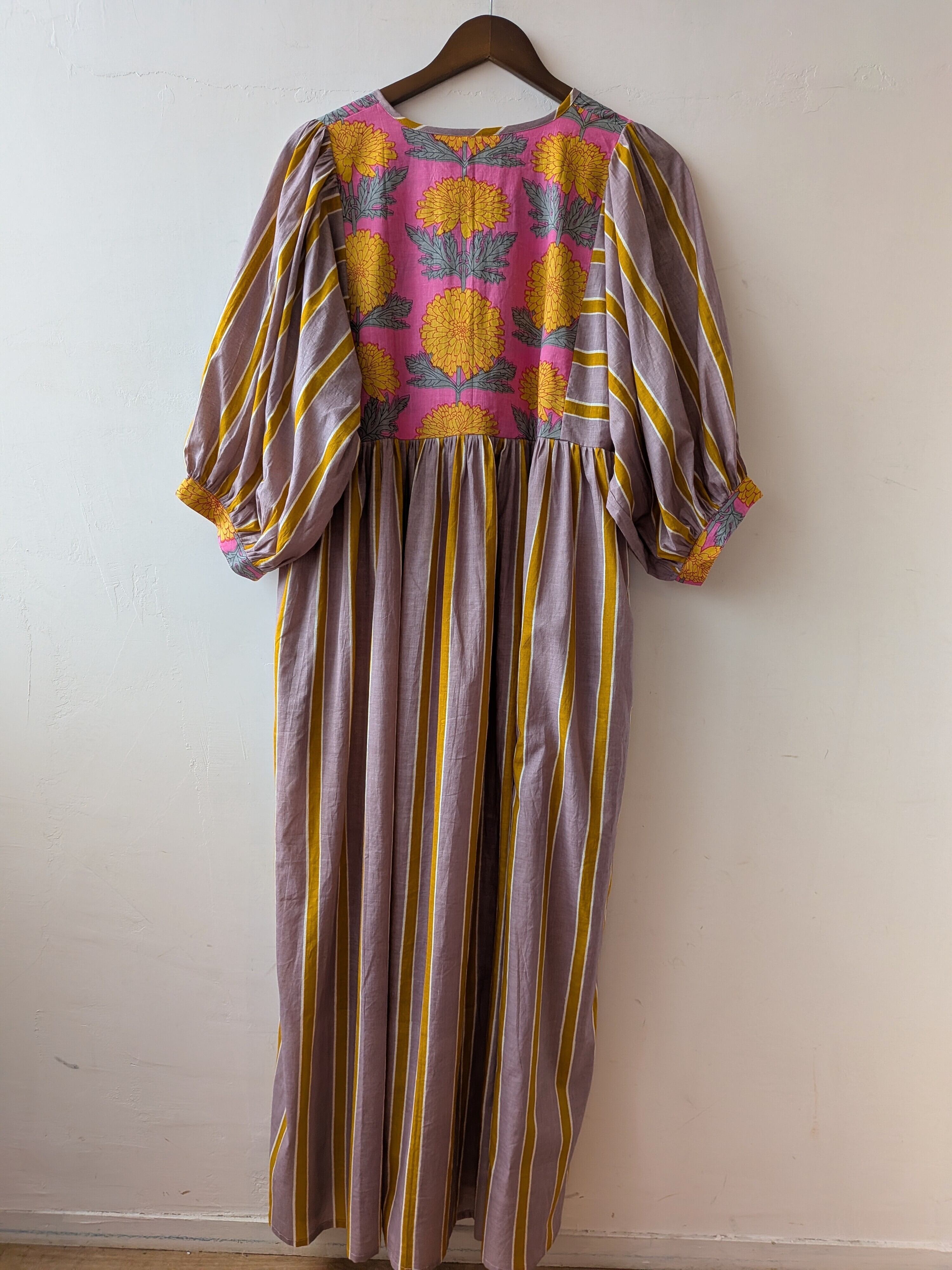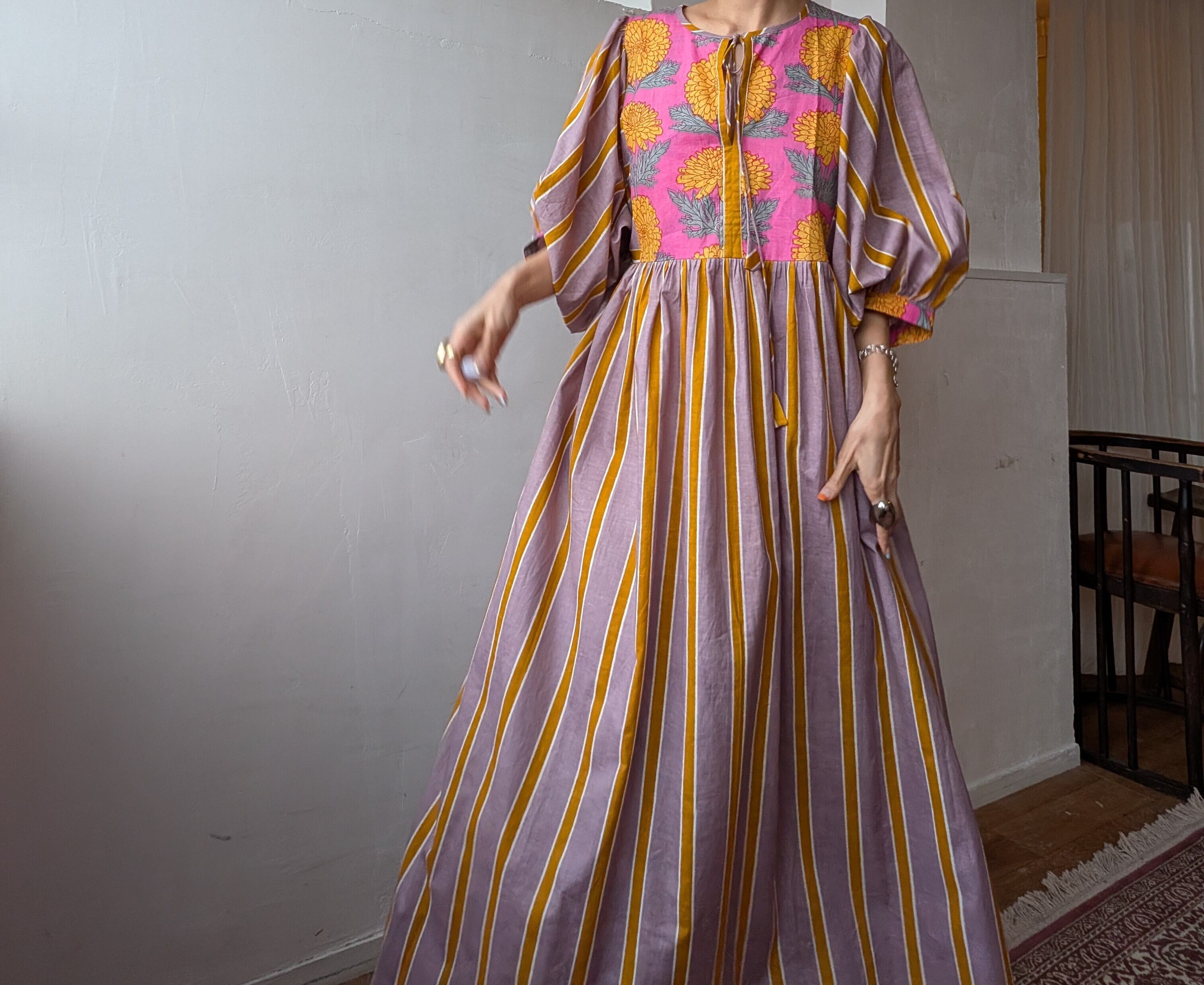 Blockprint Flower×Stripe cotton long dress/Cassis pink