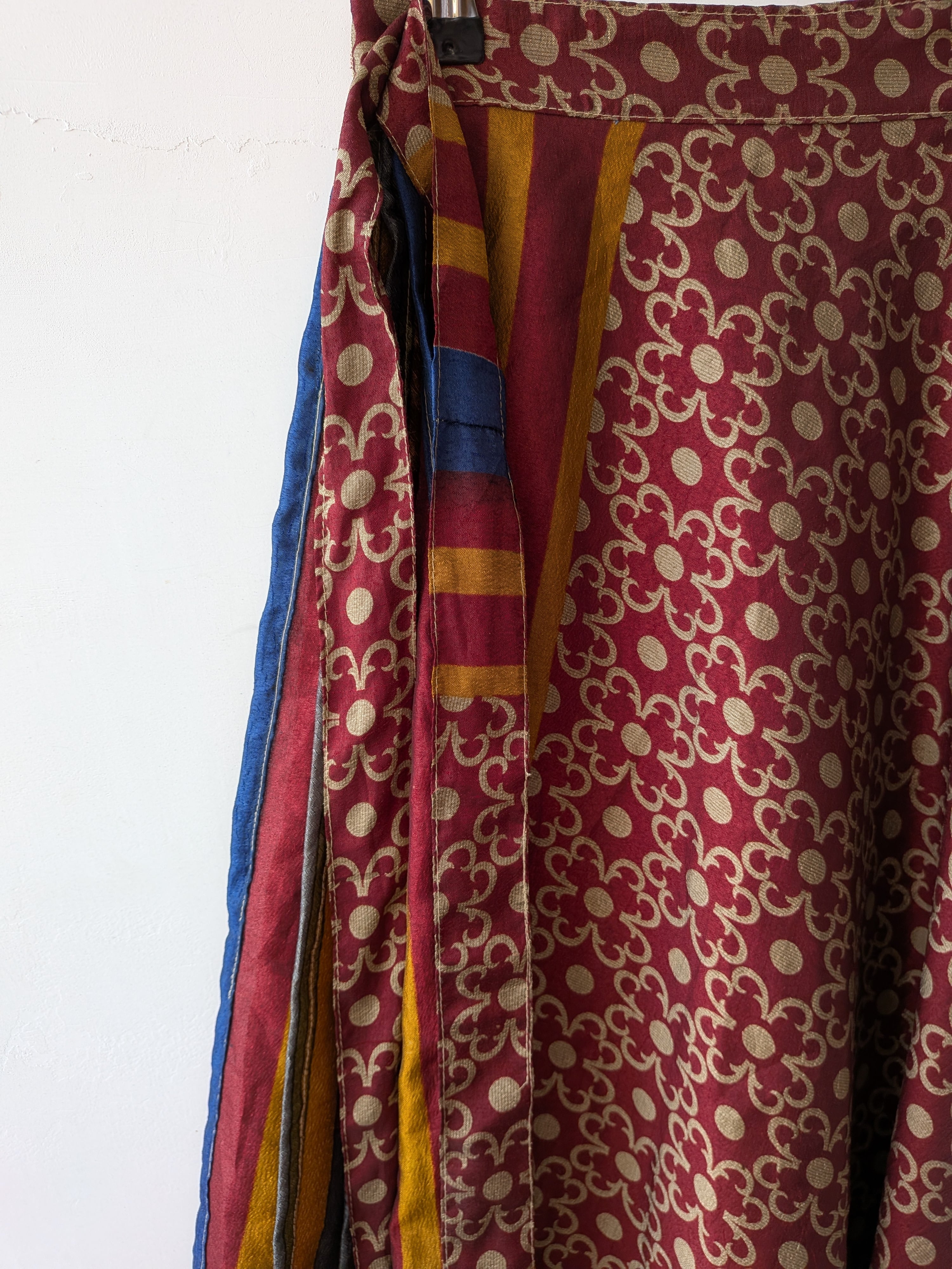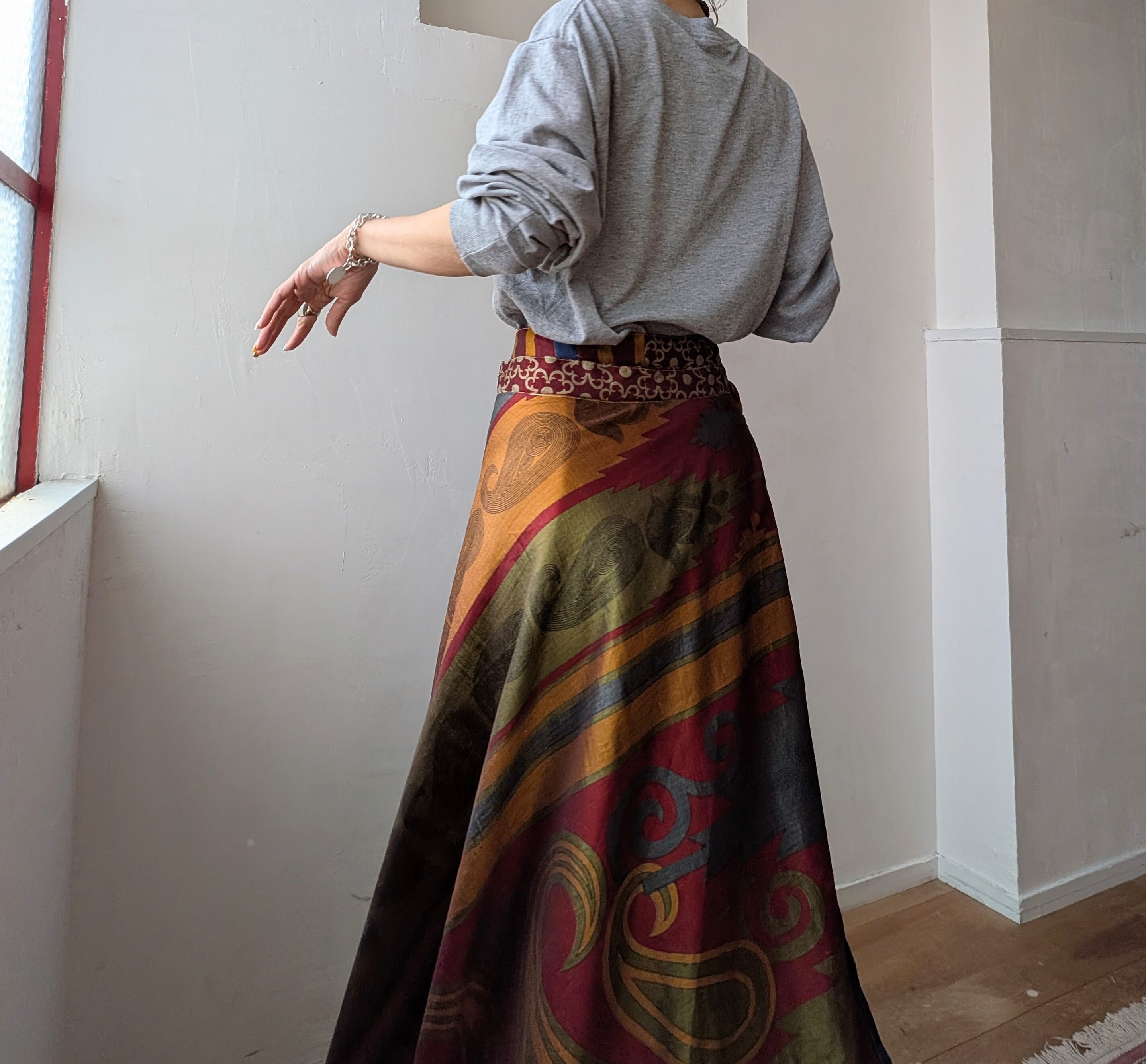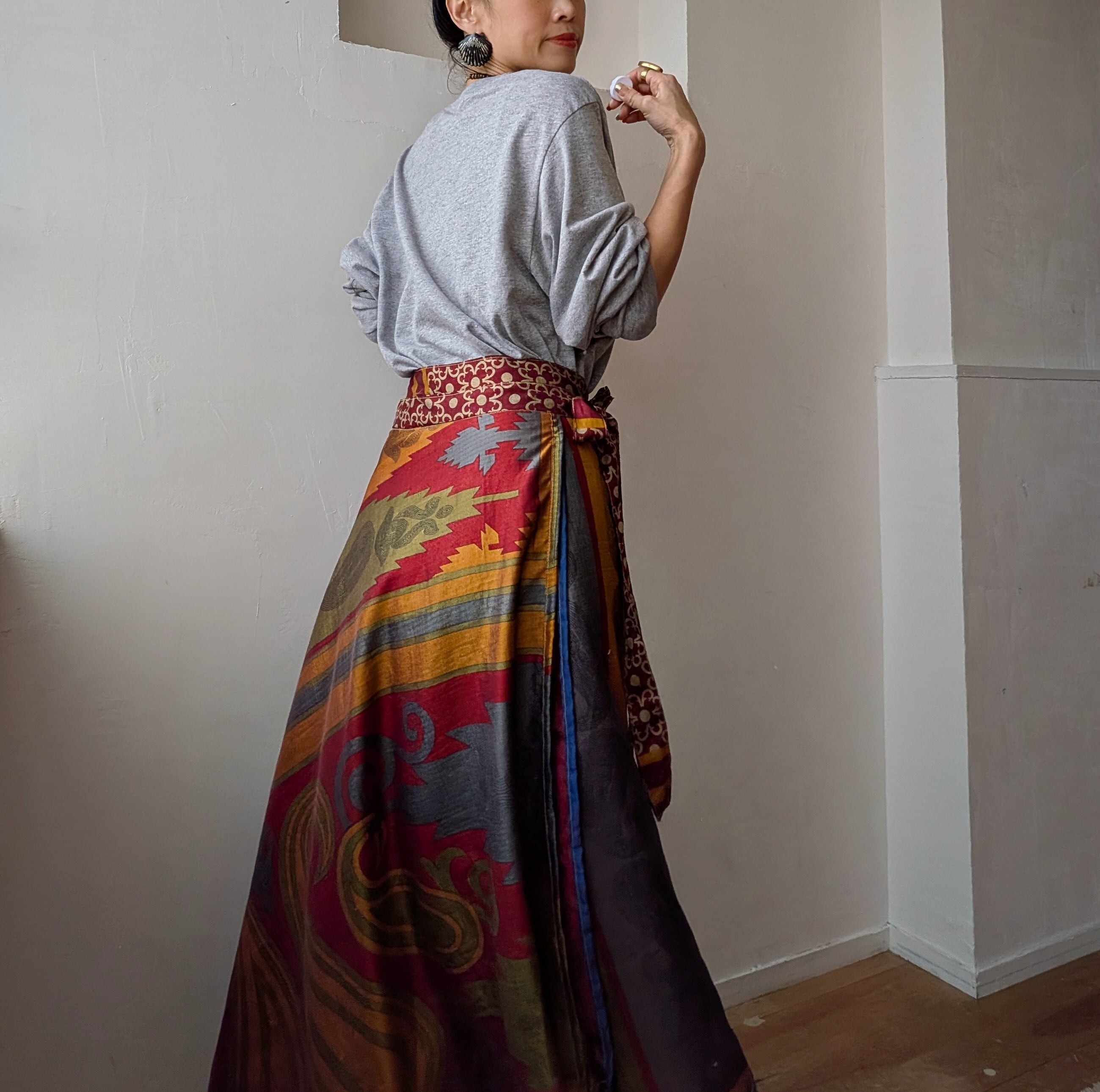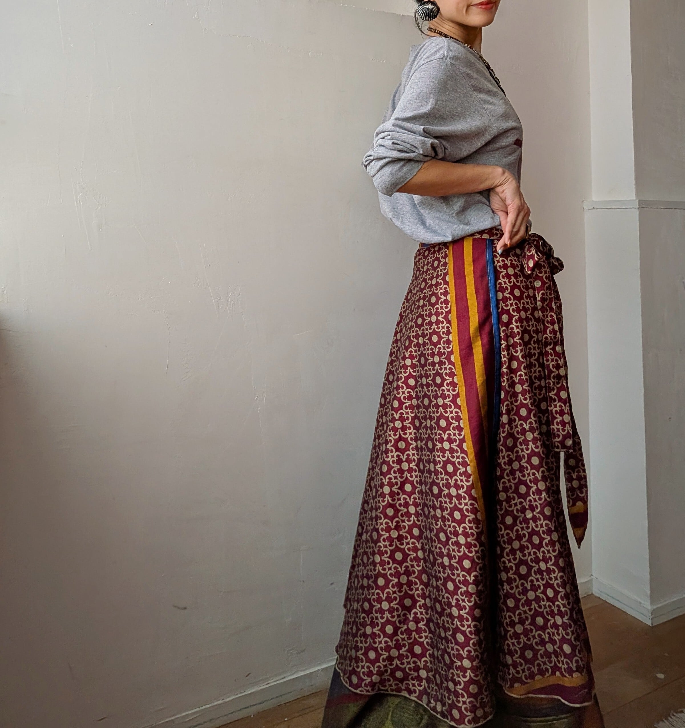 美しいインドの伝統が息づく、オールドサリーをリメイクした巻きスカートで、一枚ずつセレクトされたサリーから1点1点ハンドメイドで作られており