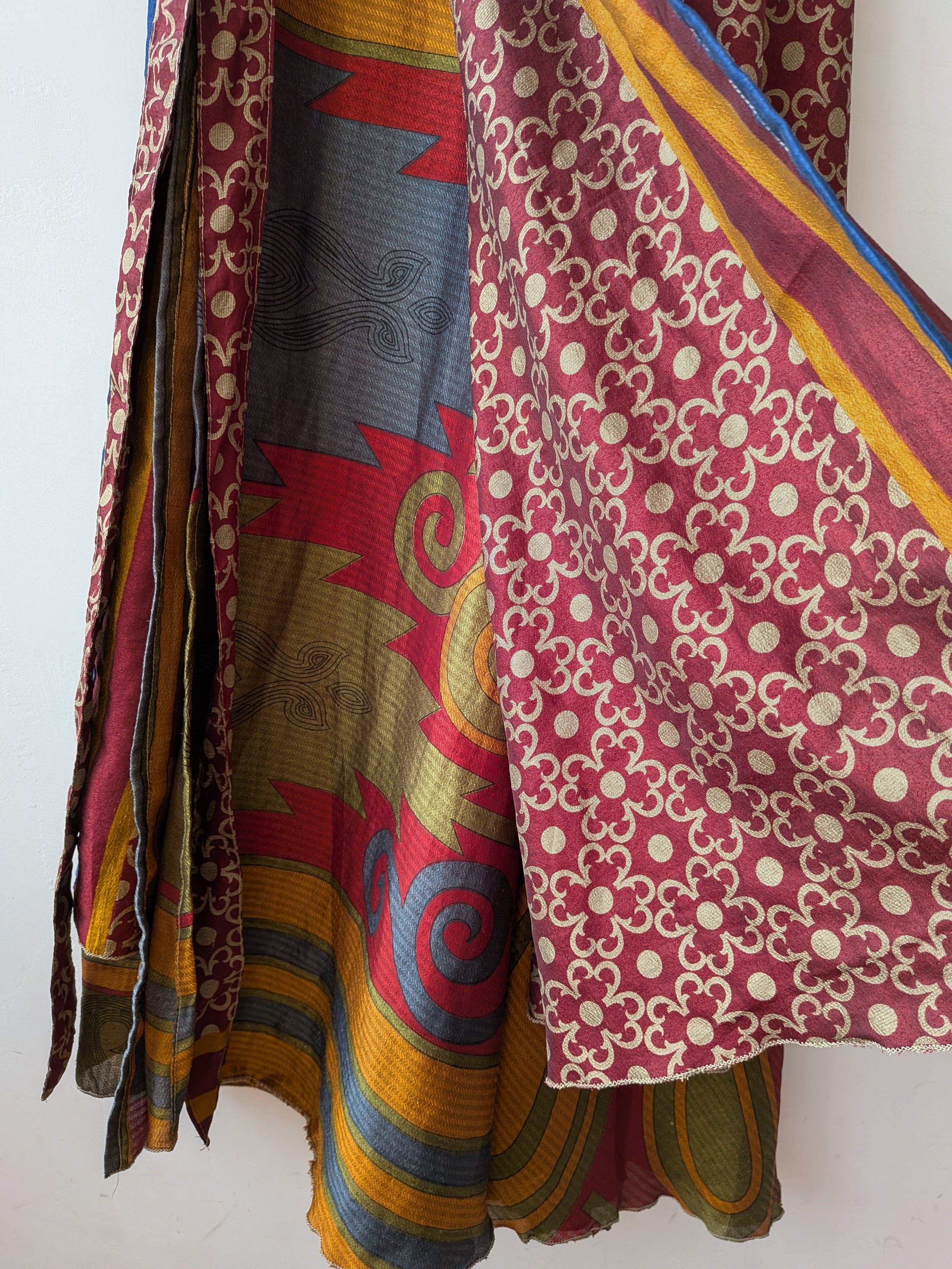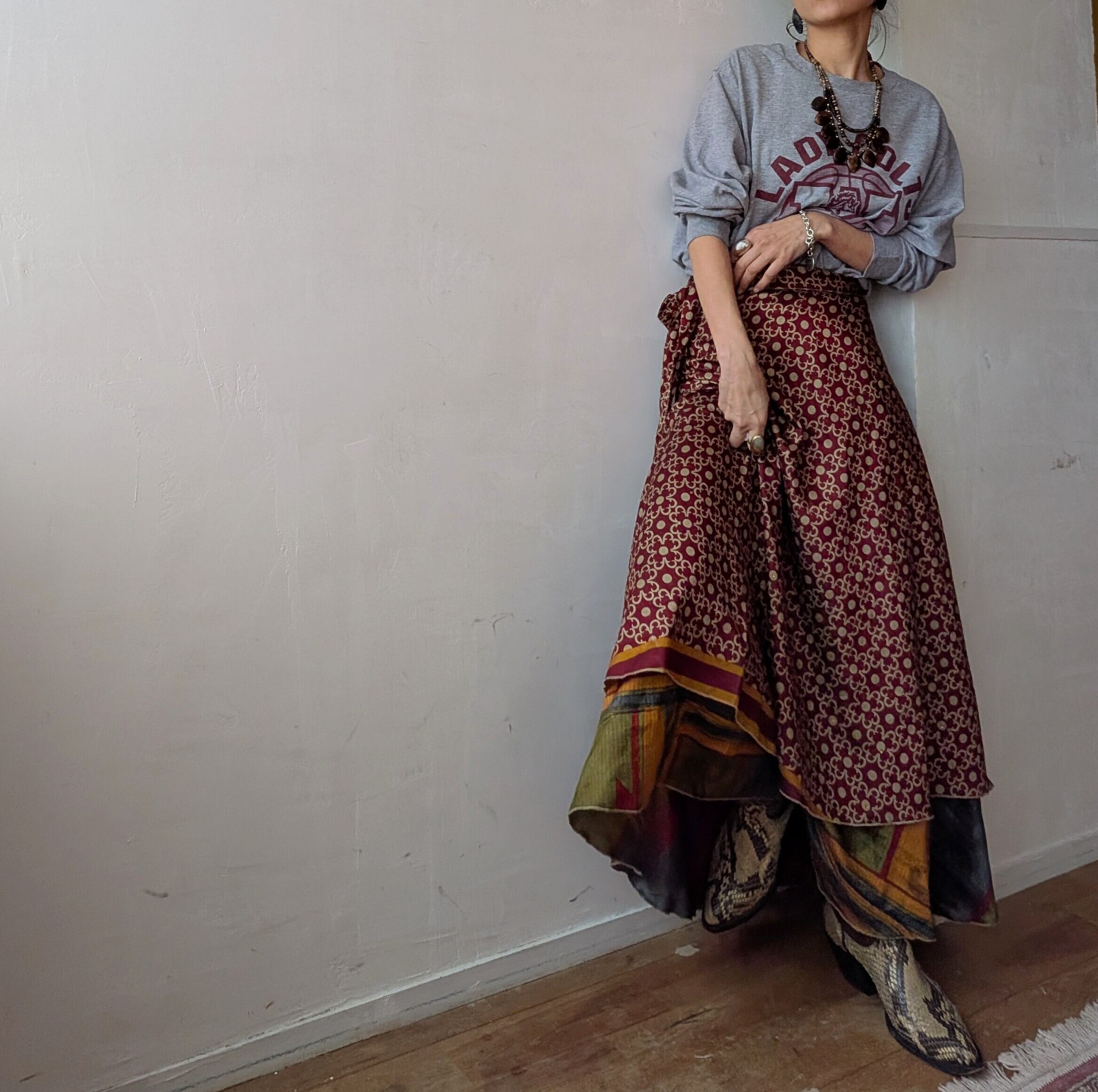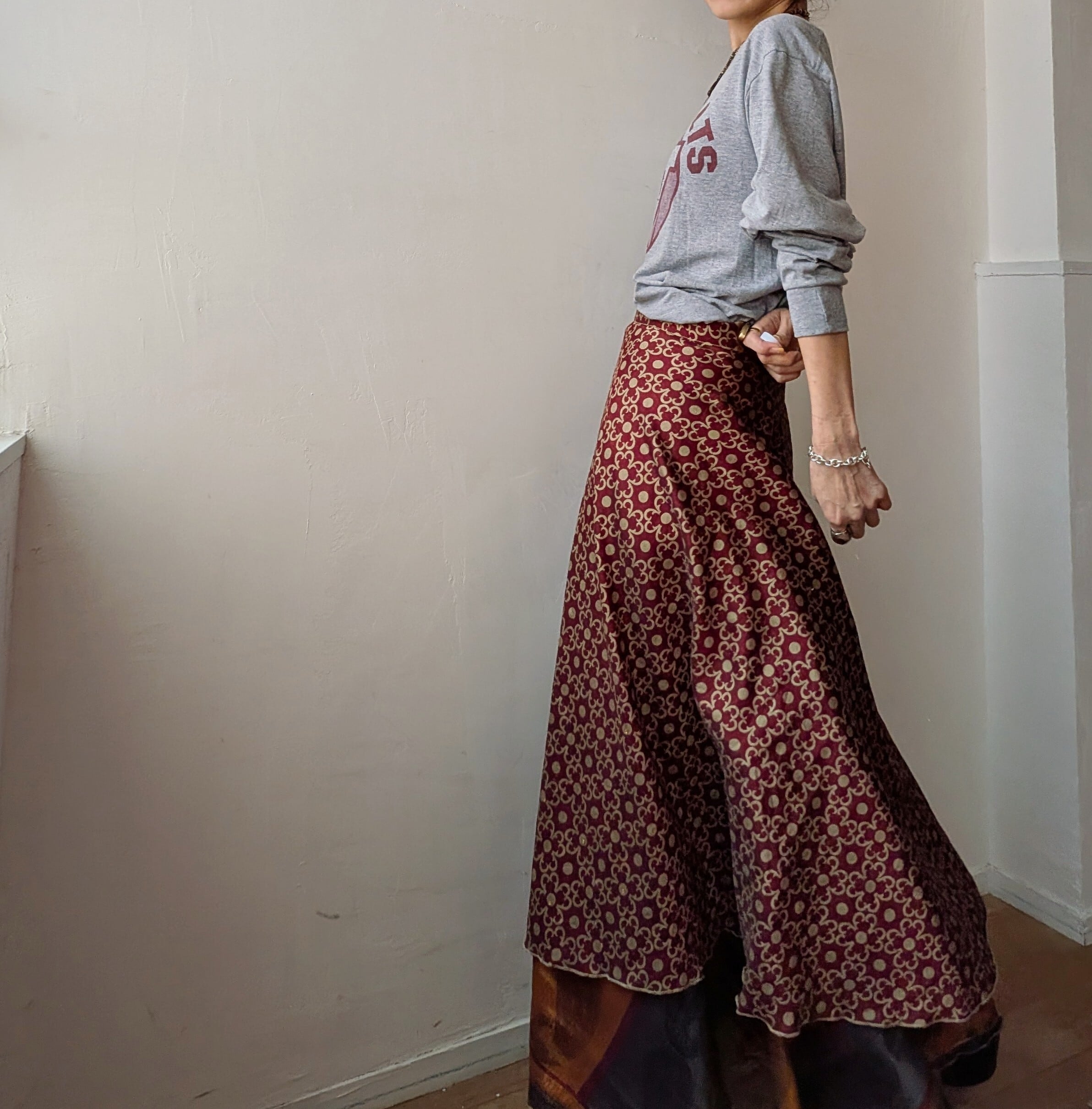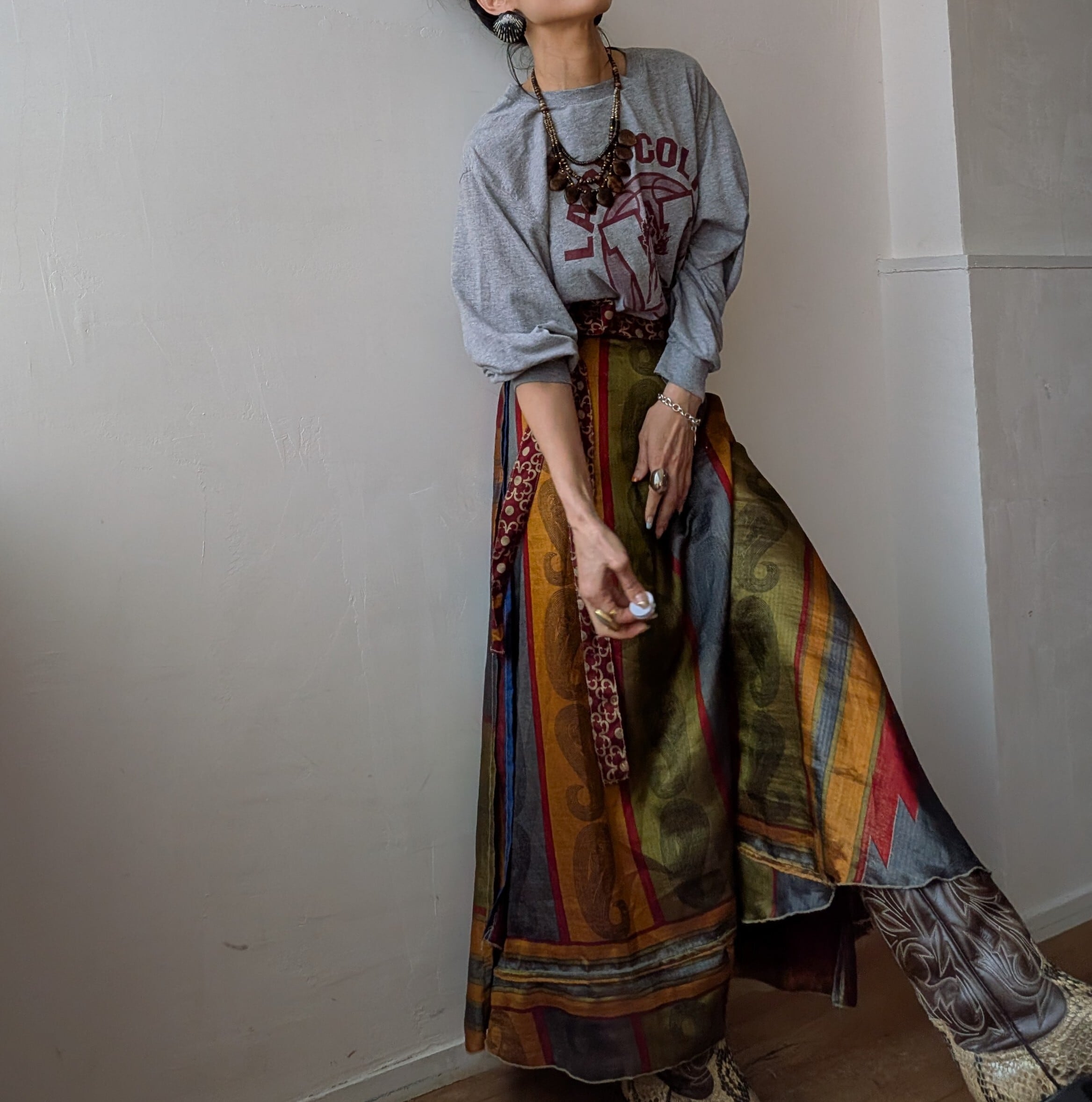 美しいインドの伝統が息づく、オールドサリーをリメイクした巻きスカートで、一枚ずつセレクトされたサリーから1点1点ハンドメイドで作られており
