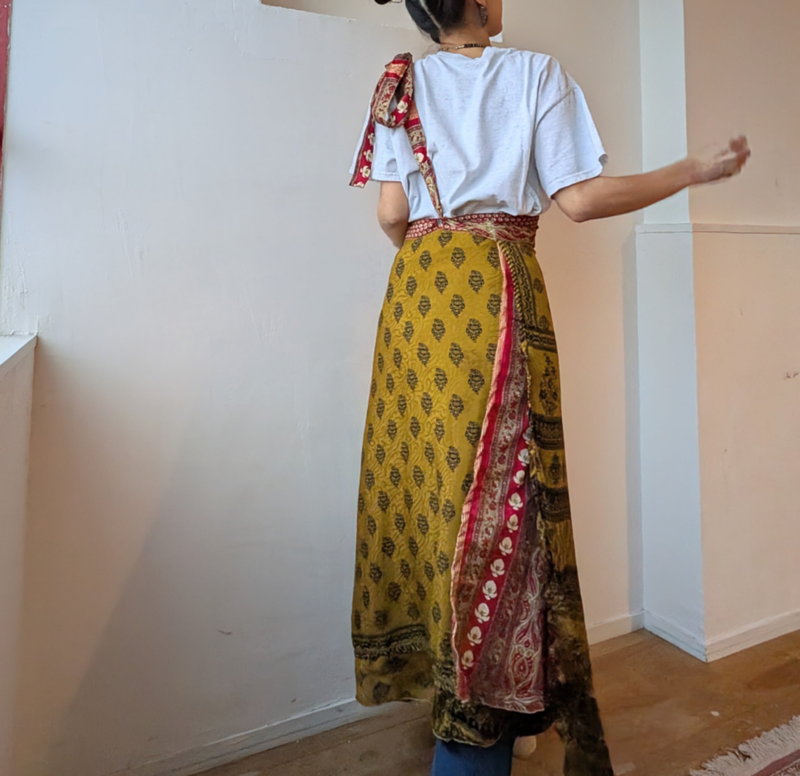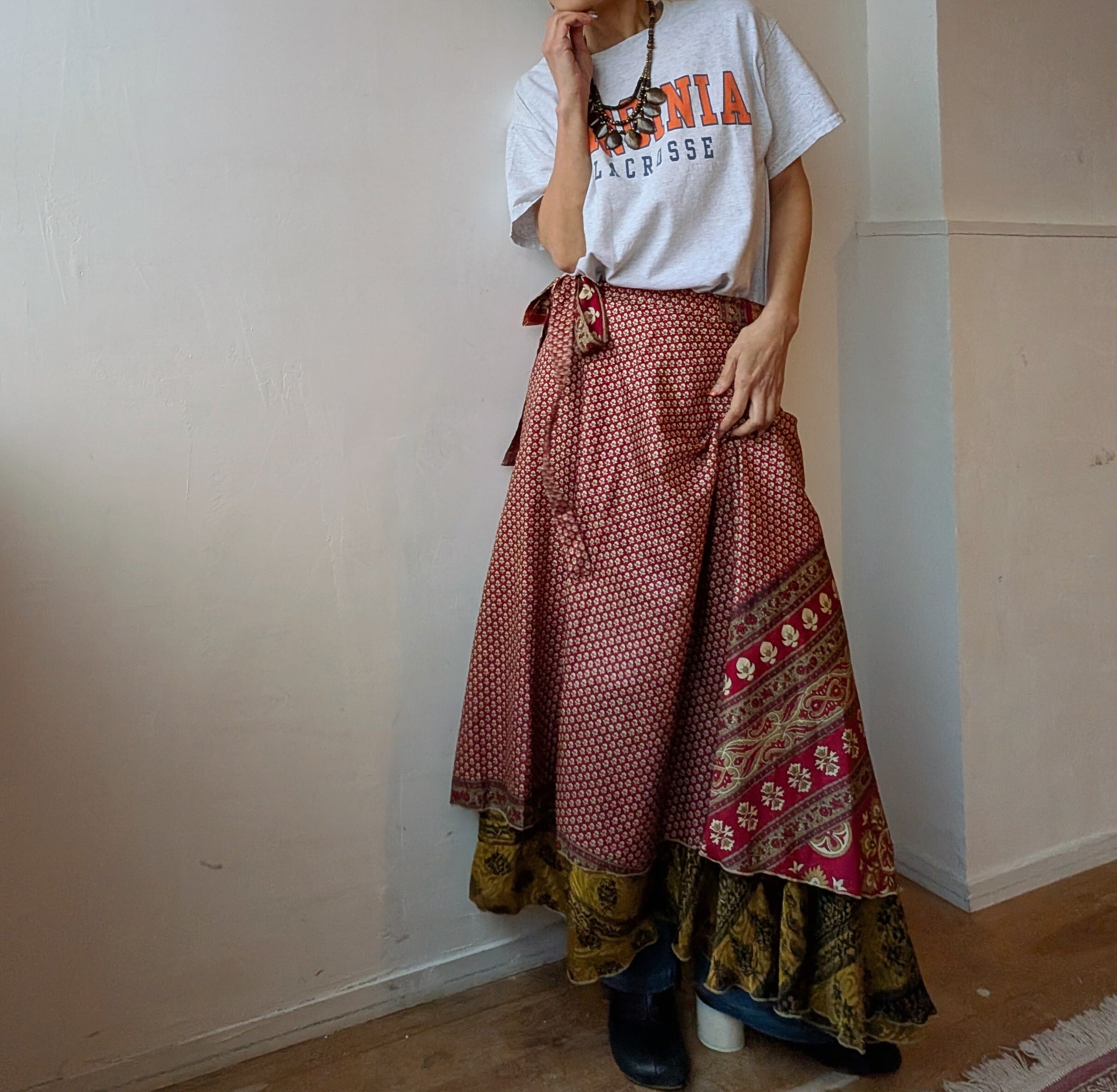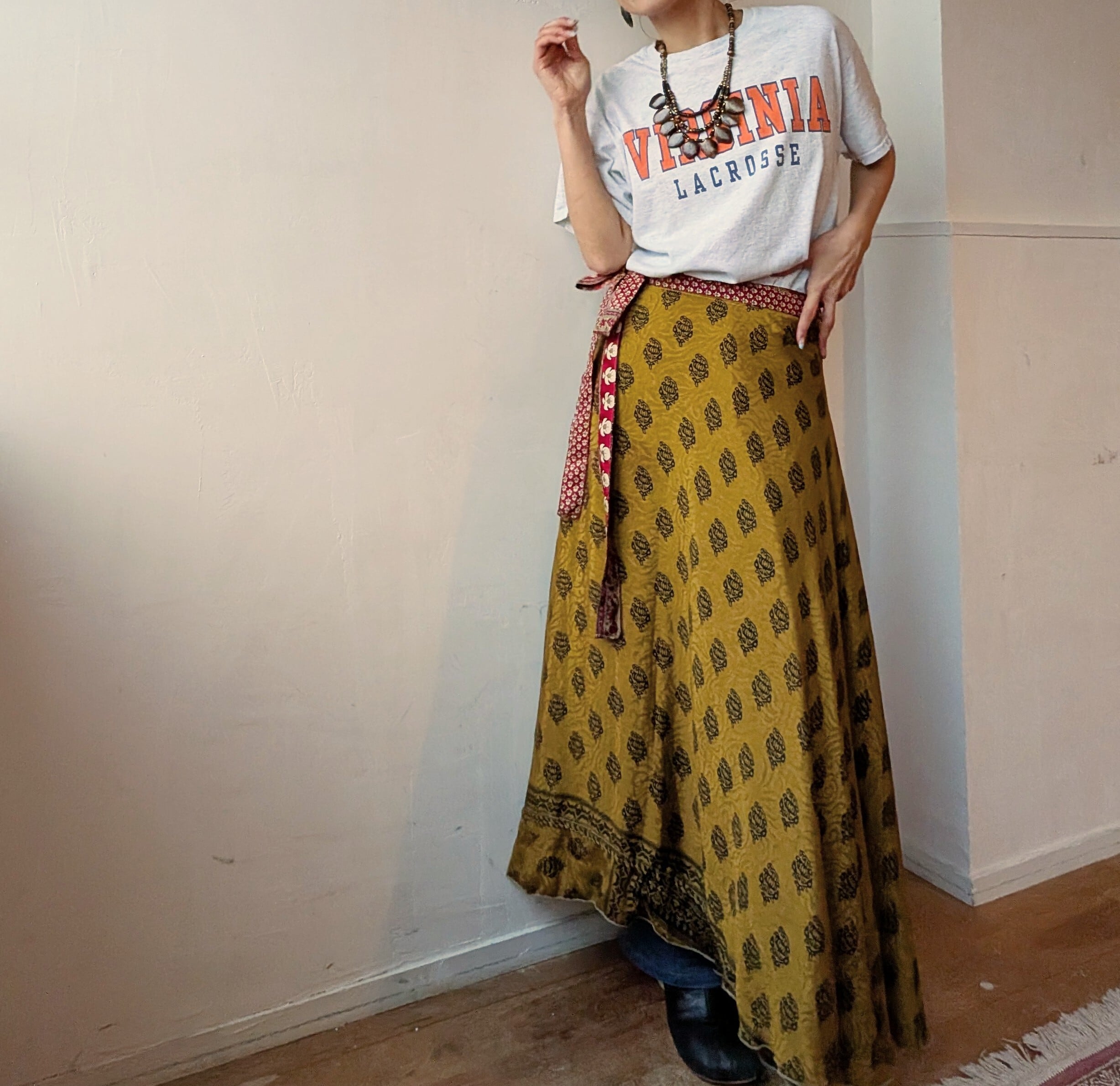 美しいインドの伝統が息づく、オールドサリーをリメイクした巻きスカートで、一枚ずつセレクトされたサリーから1点1点ハンドメイドで作られており