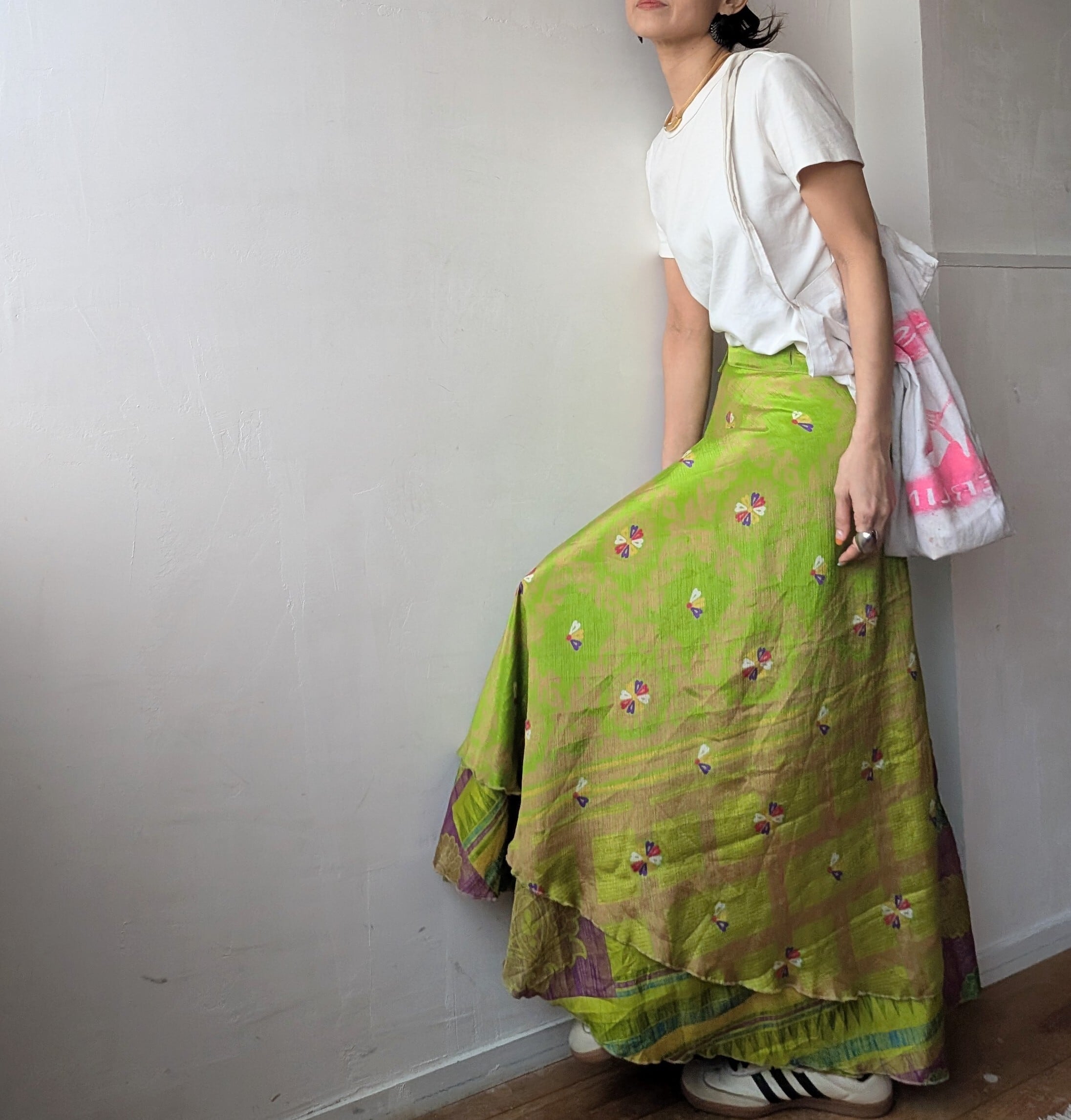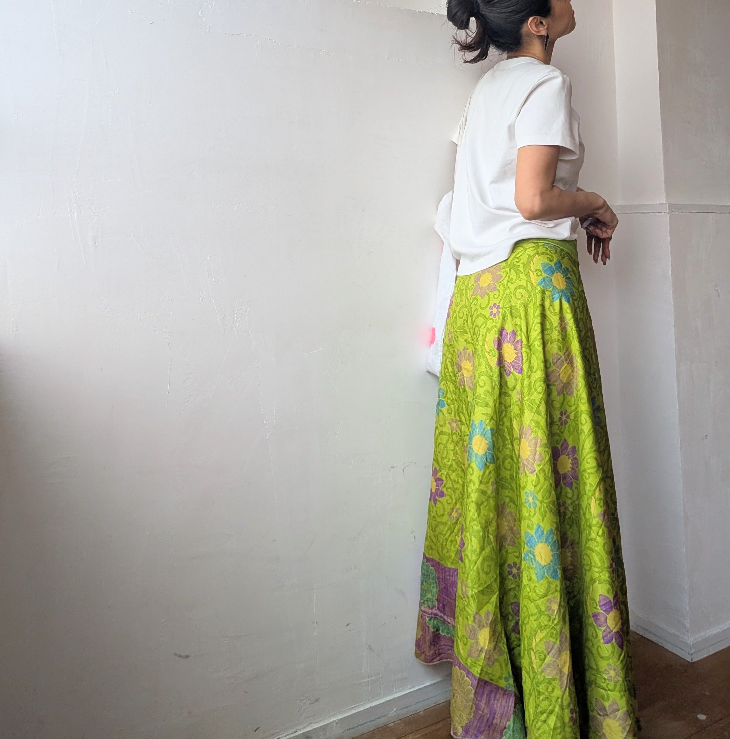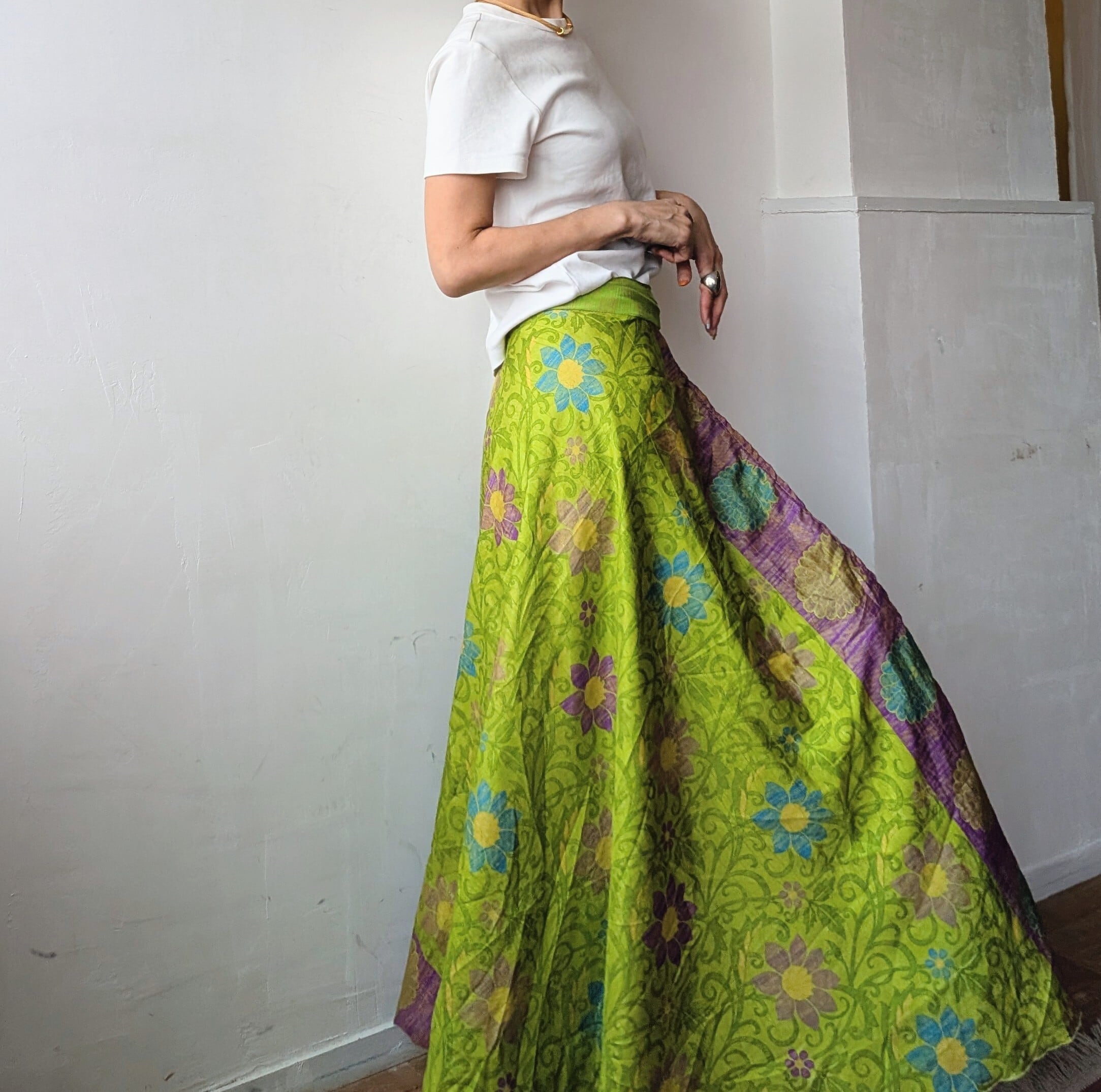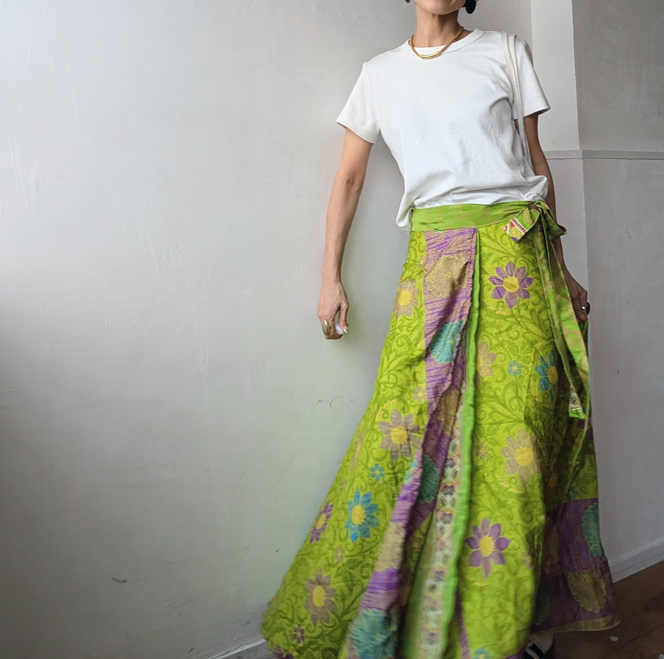 美しいインドの伝統が息づく、オールドサリーをリメイクした巻きスカートで、一枚ずつセレクトされたサリーから1点1点ハンドメイドで作られており、柄併せが個性的で、他にはない唯一無二の1点物です。