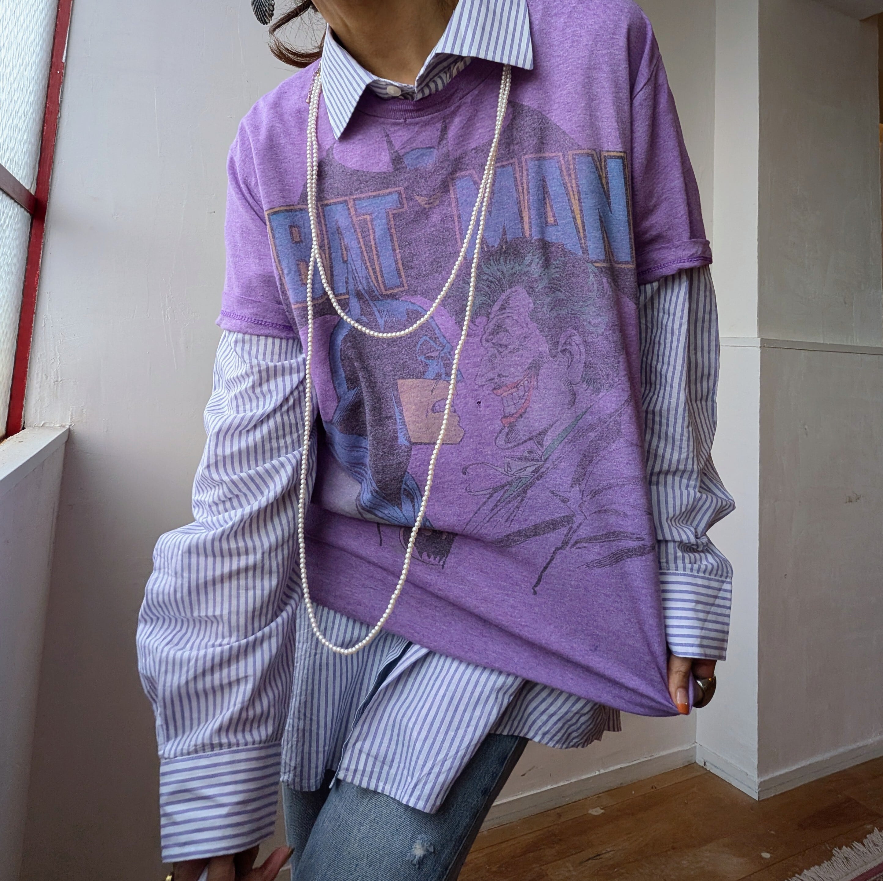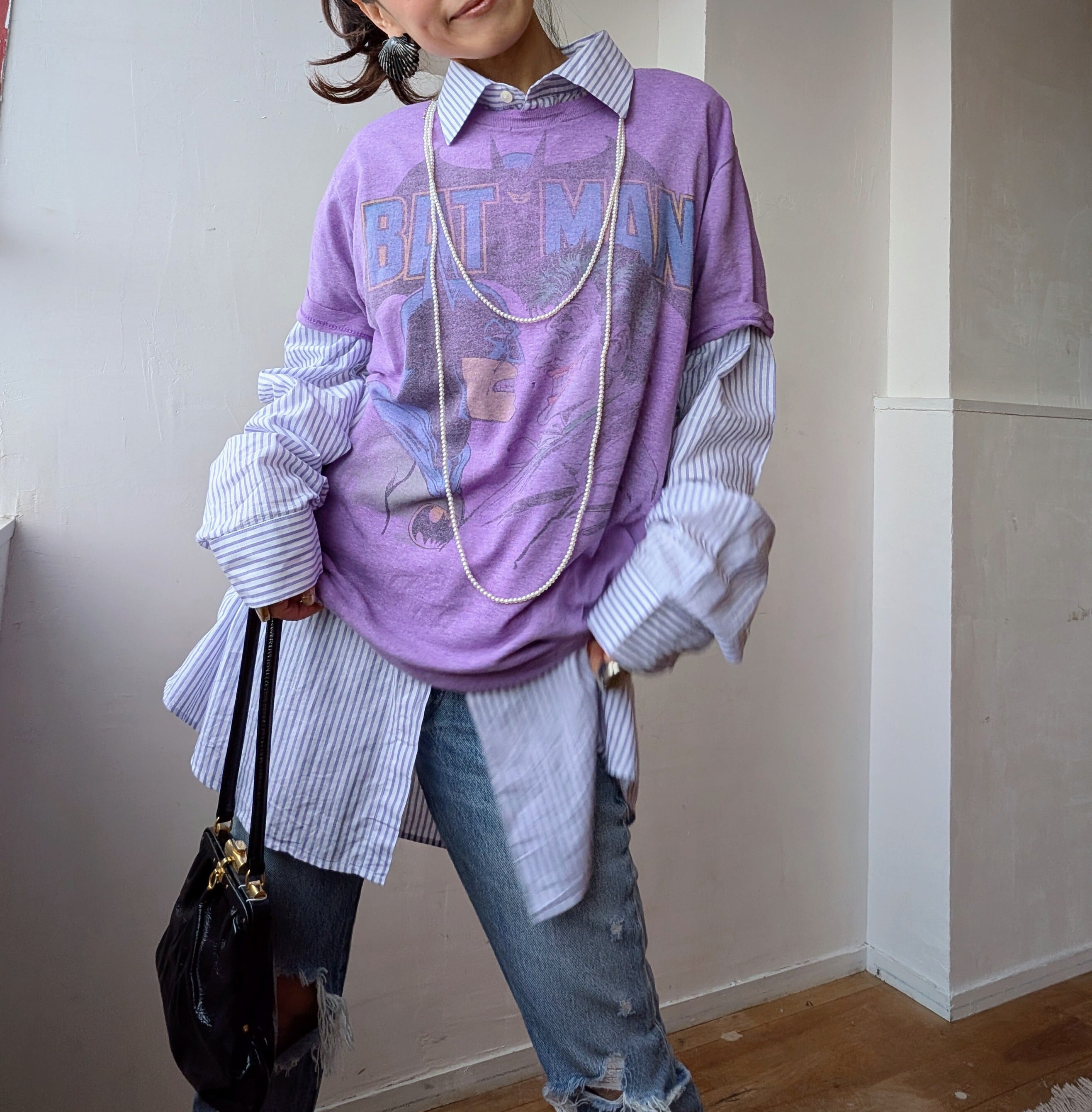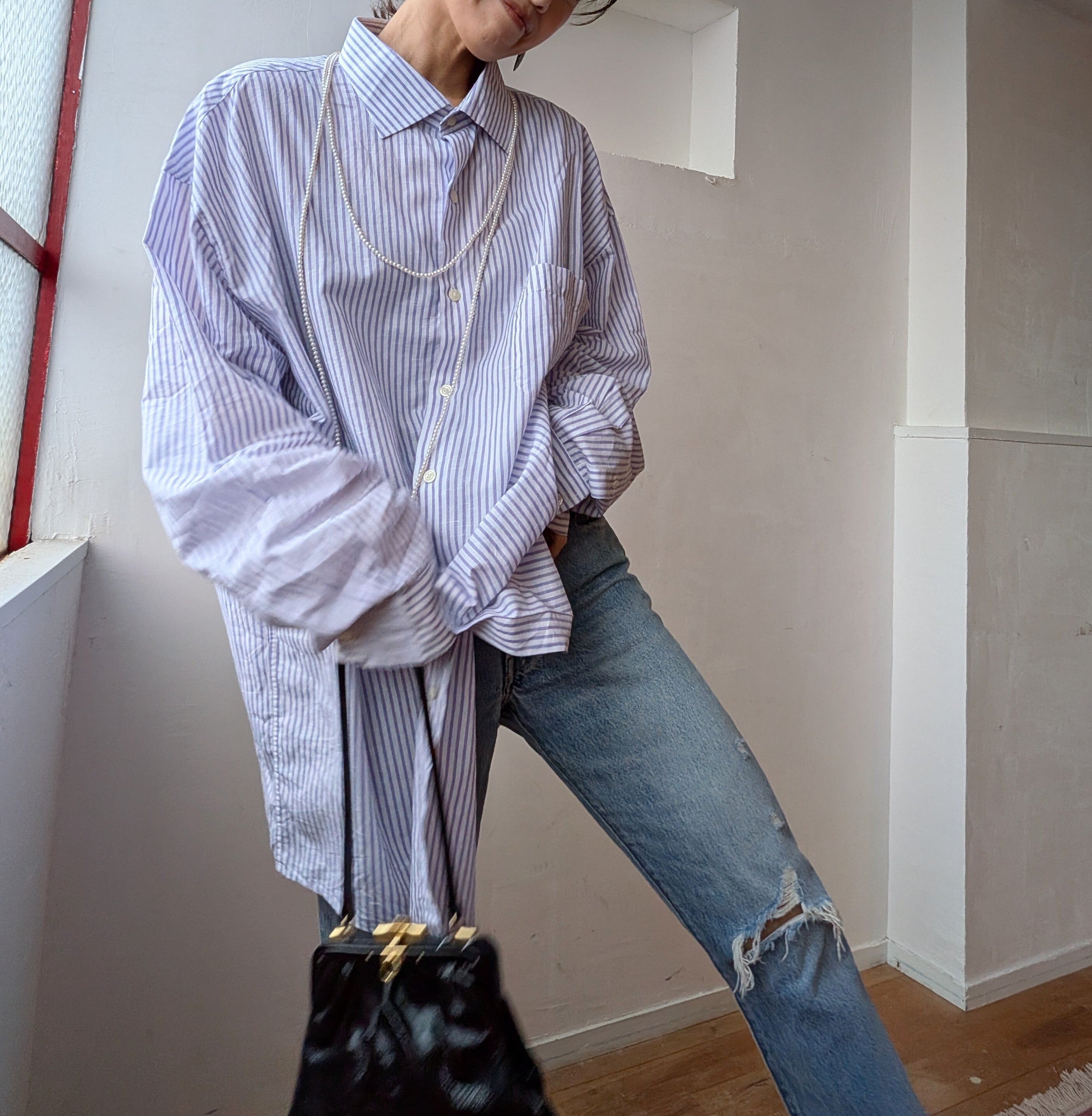ホワイトとライトパープルのストライプが春らしく爽やかな雰囲気で、さりげない個性を感じさせつつ、他のアイテムとも馴染みやすい細かなストライプデザインが普段のコーデにもおすすめ!