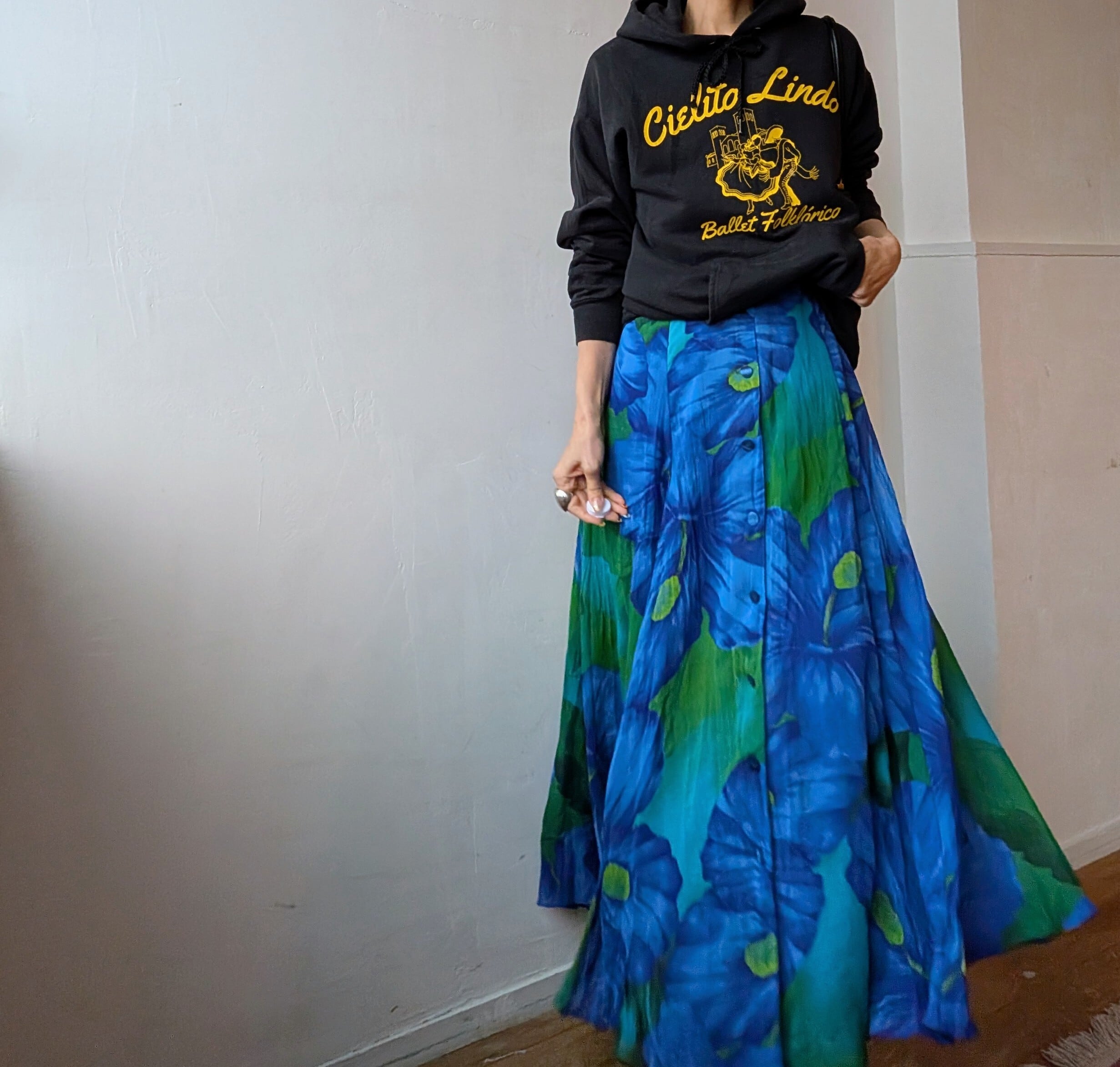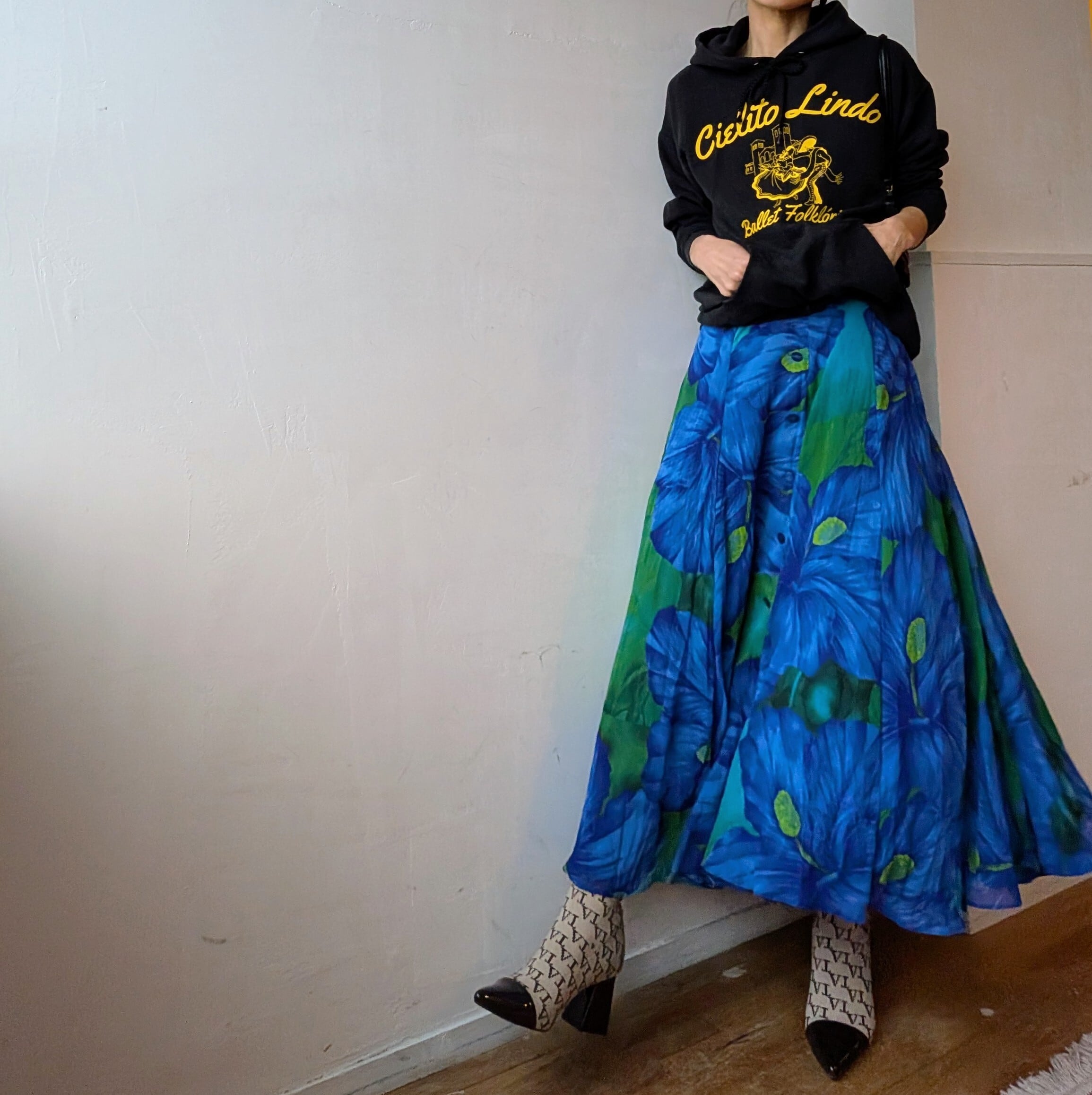 裏地付きで透け感もなく、1枚での着用はもちろん、スウェットやニット、ブーツを併せれば秋冬も素敵に着用していただけます。