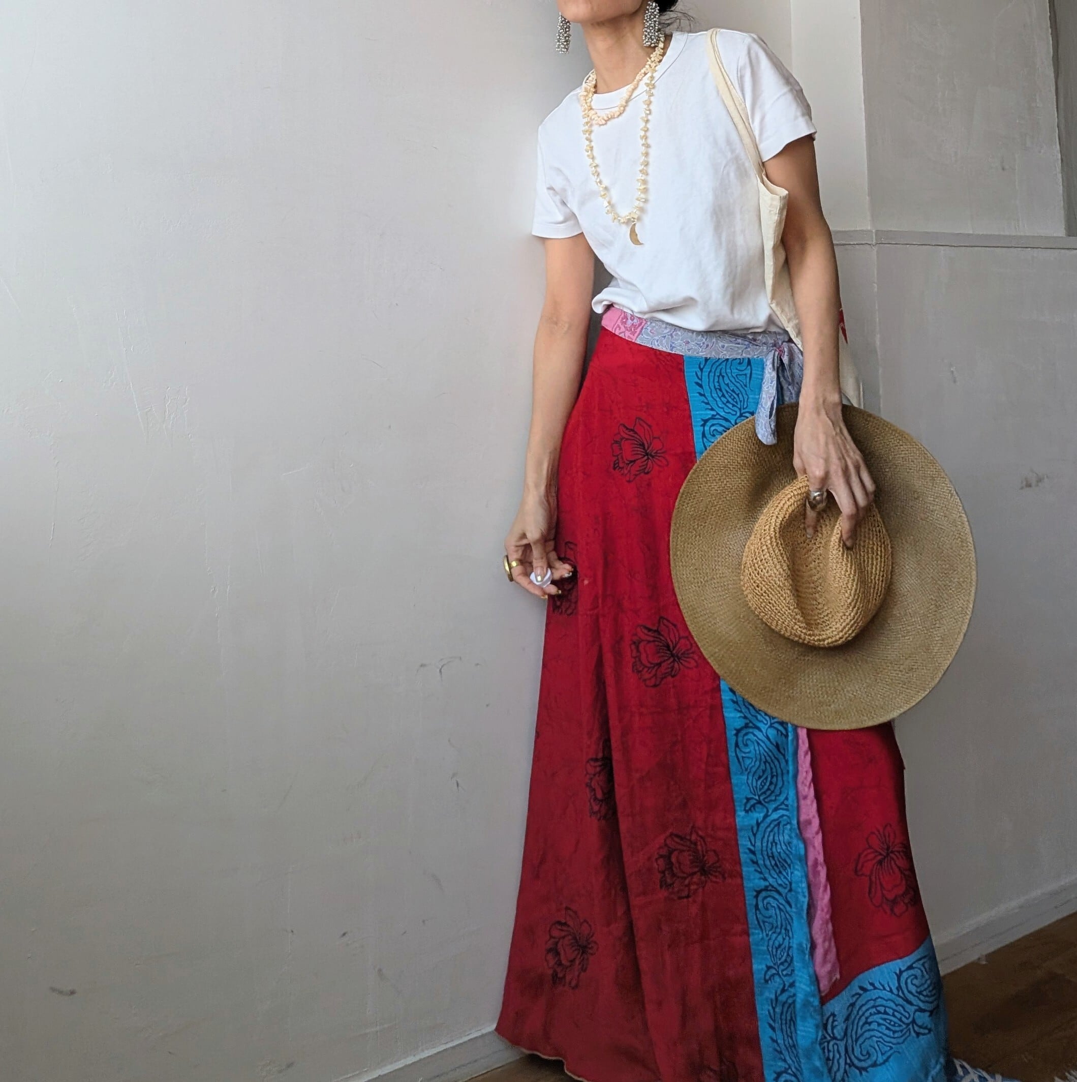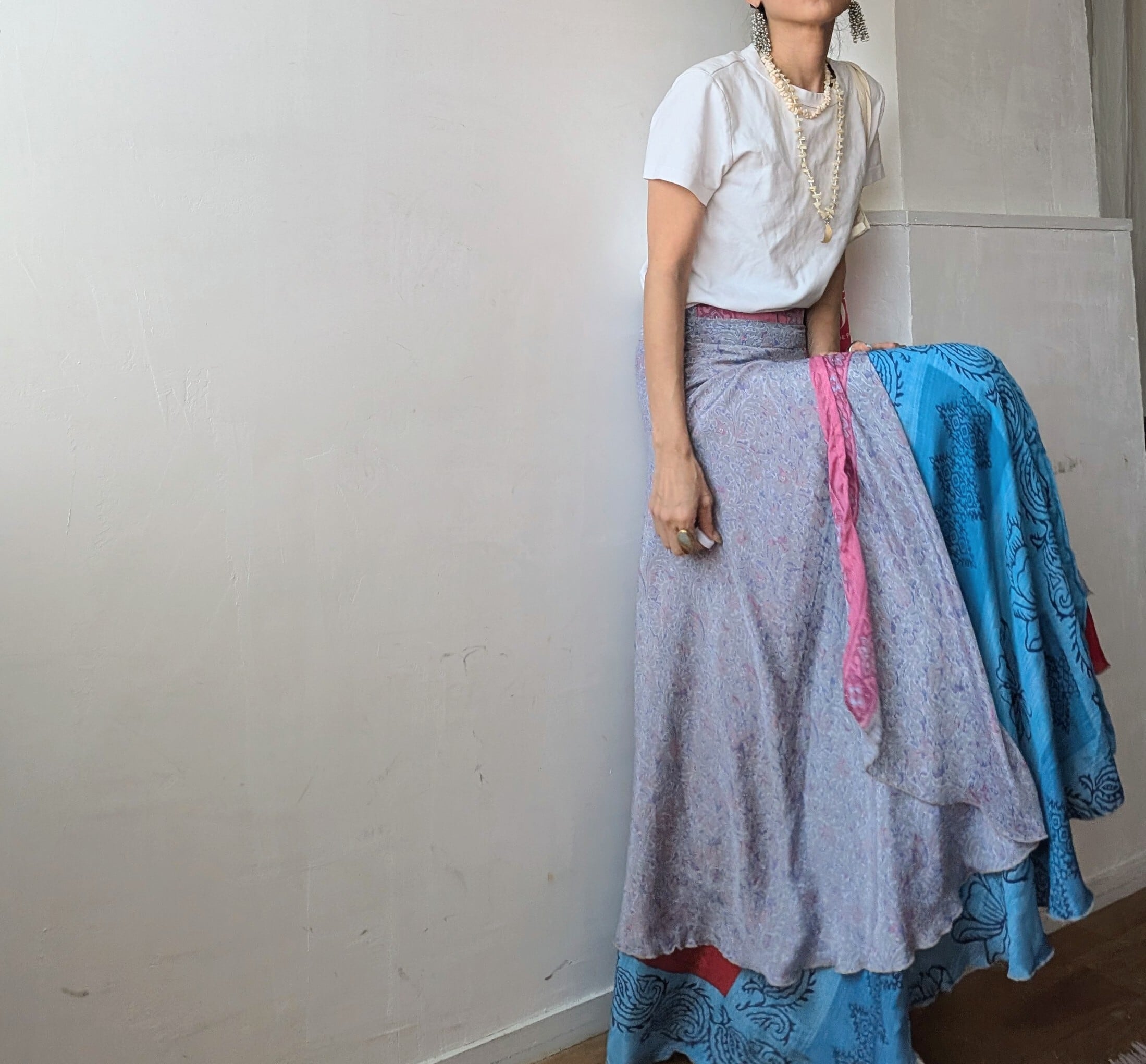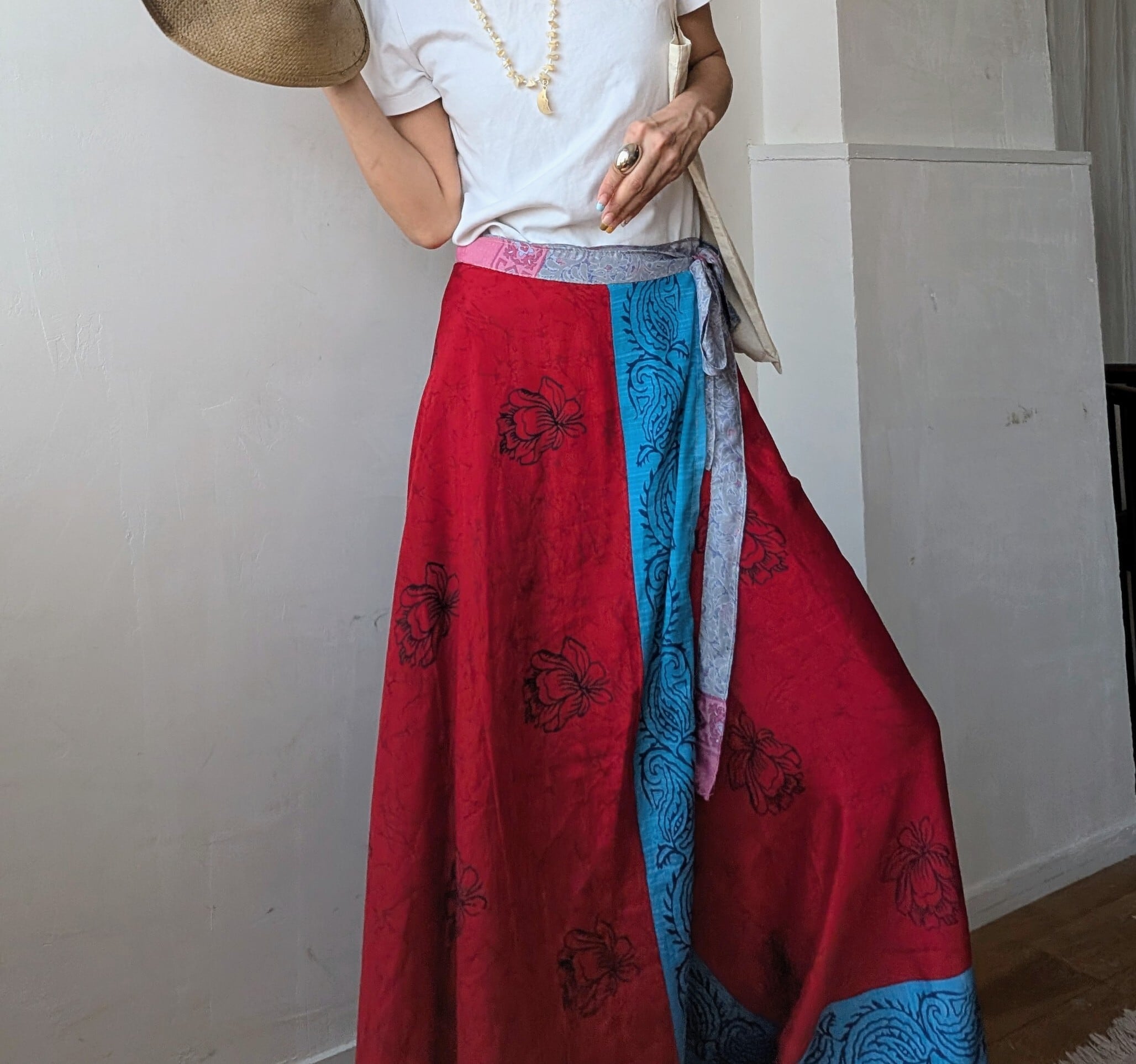 美しいインドの伝統が息づく、オールドサリーをリメイクした巻きスカートで、一枚ずつセレクトされたサリーから1点1点ハンドメイドで作られており、柄併せが個性的で、他にはない唯一無二の1点物です。