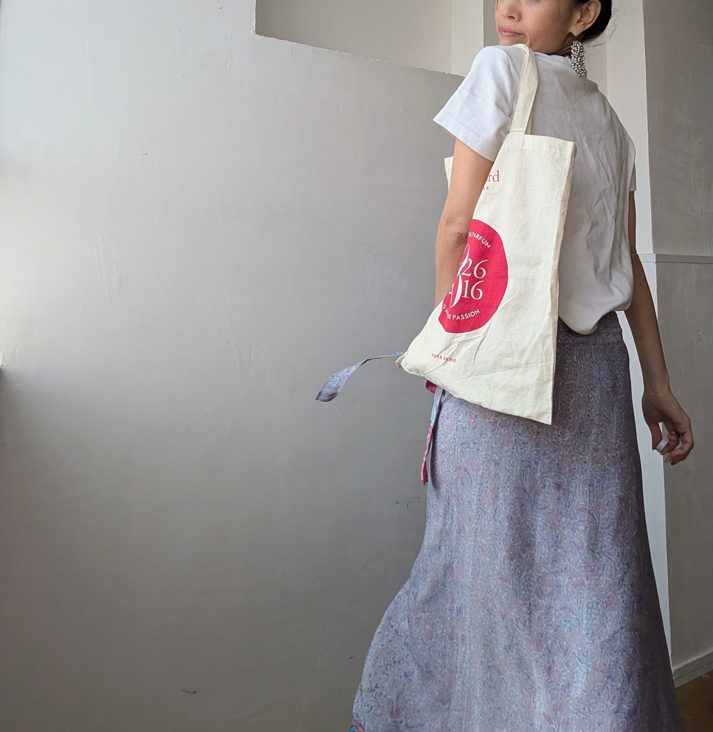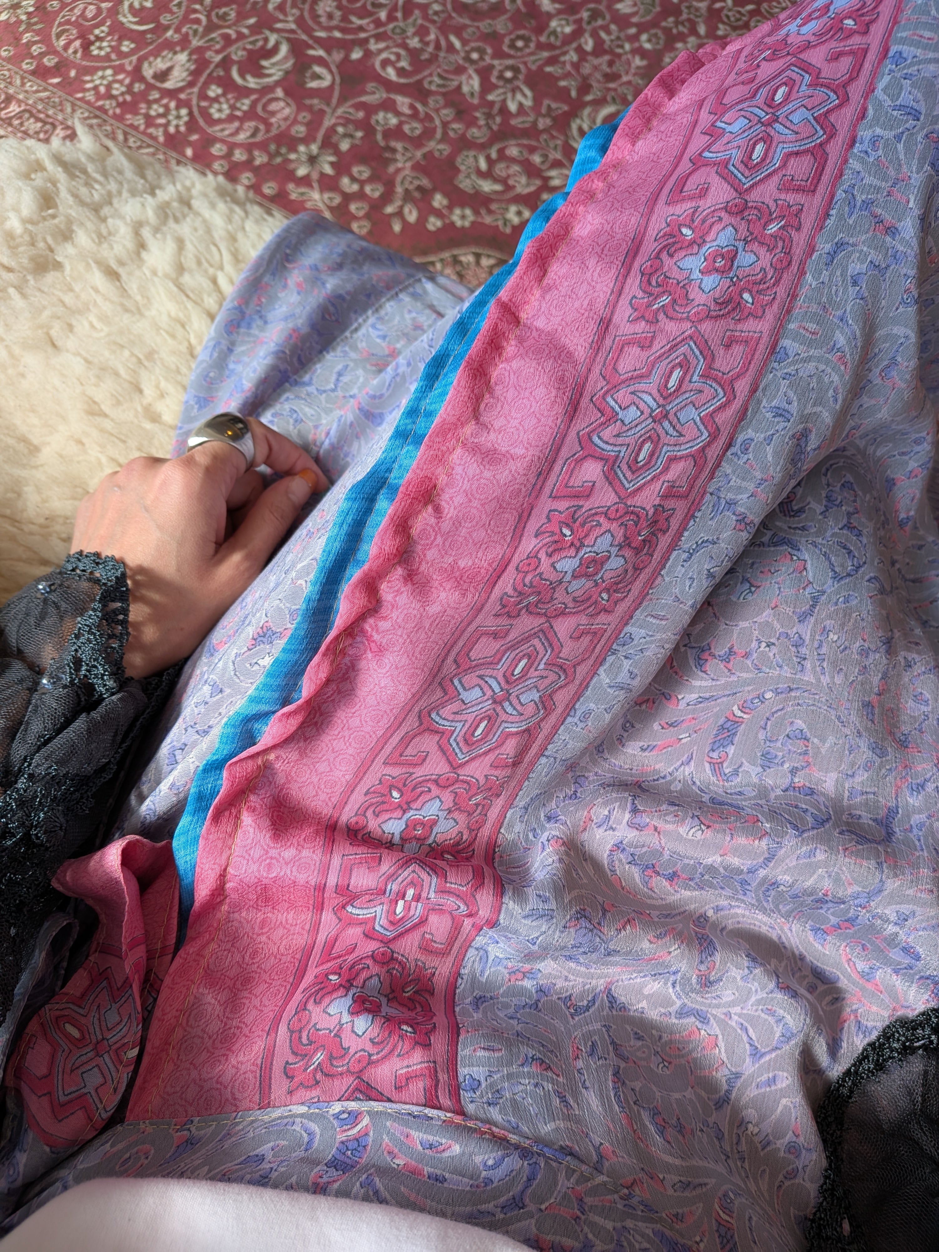 重なりあった異なる色柄のシルク布がふわっと広がり、エレガントな雰囲気と、ニットやスウェット、tshirtと併せて大人カジュアルなスタイリングにもぴったりなアイテムです。