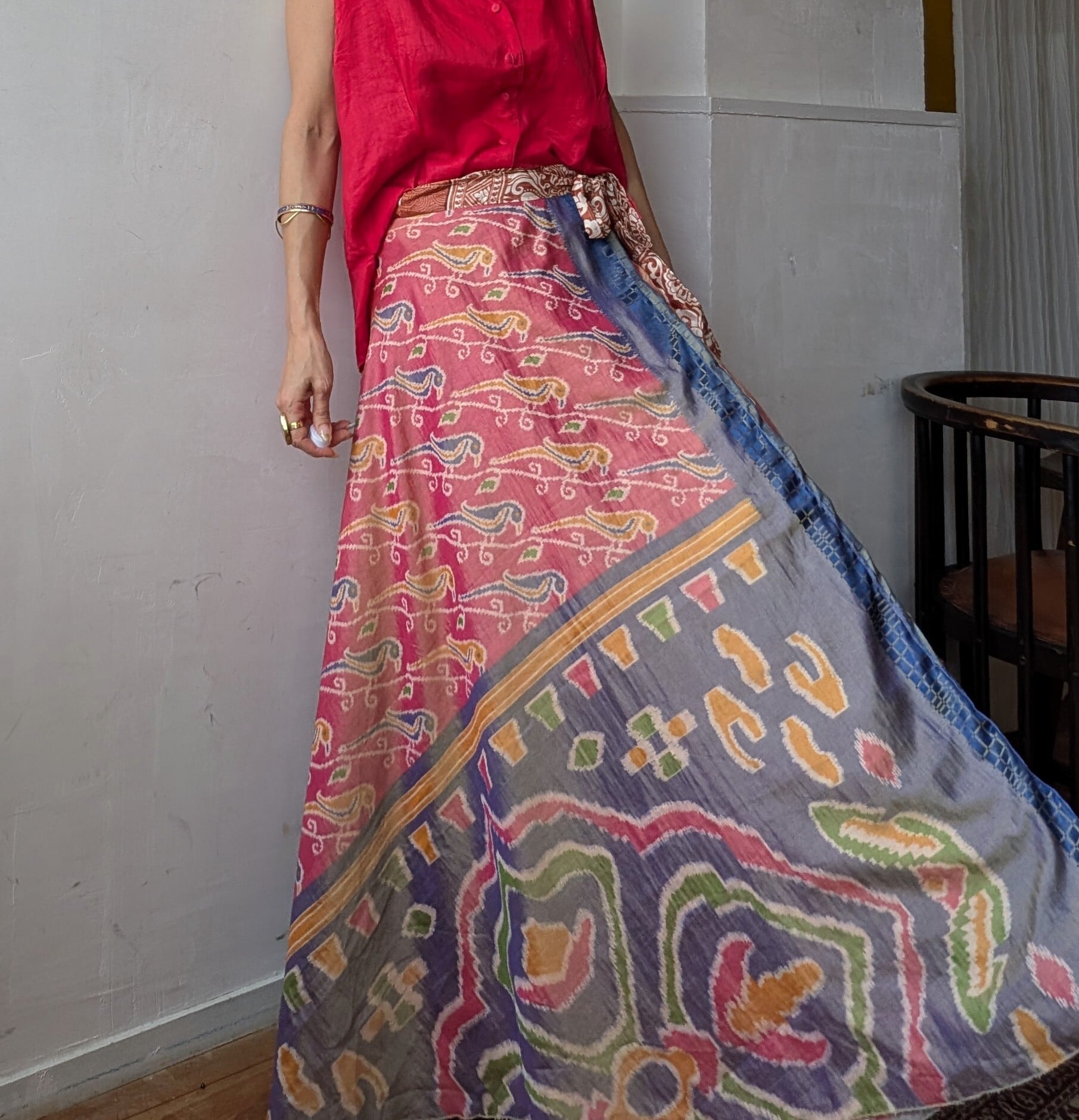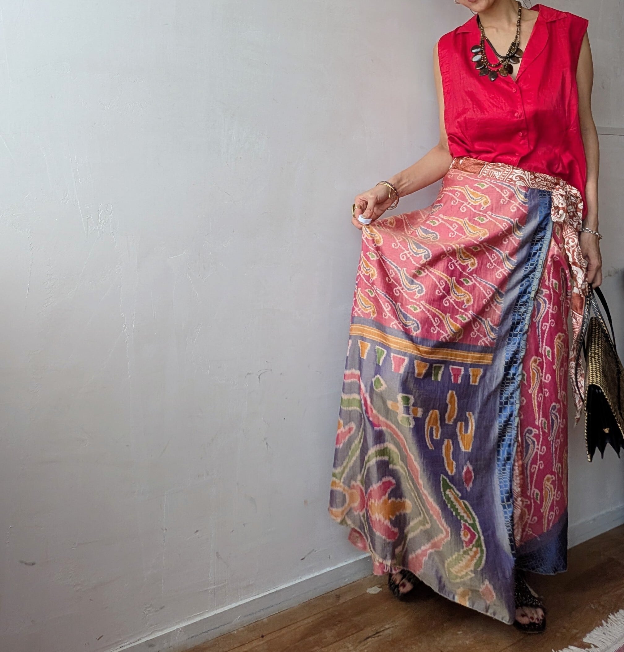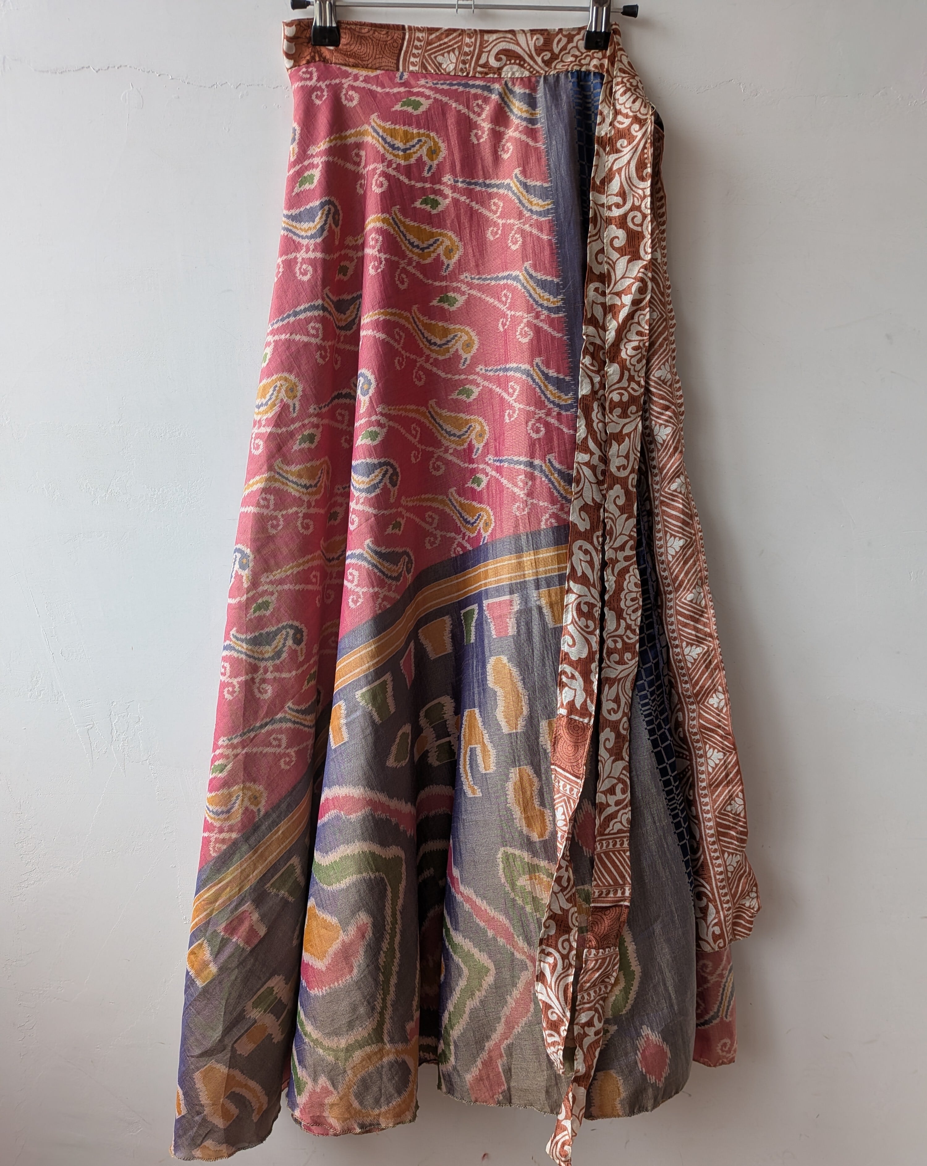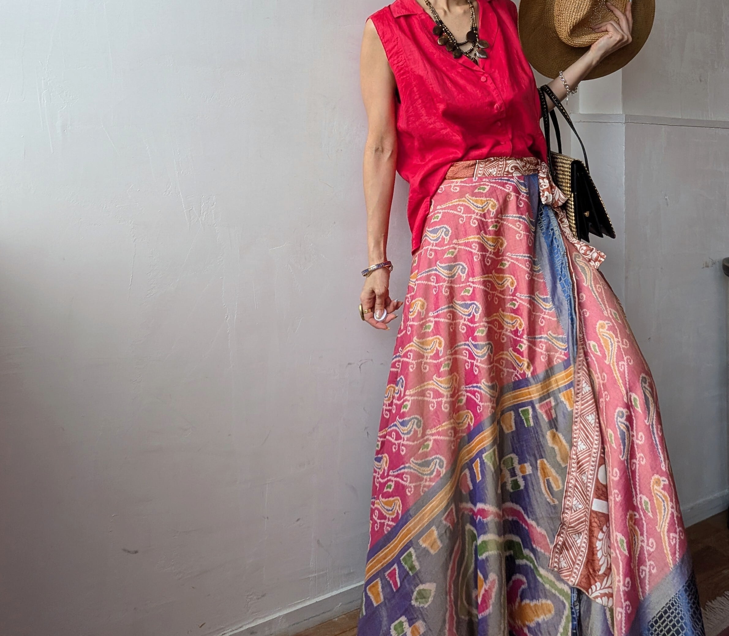 美しいインドの伝統が息づく、オールドサリーをリメイクした巻きスカートで、一枚ずつセレクトされたサリーから1点1点ハンドメイドで作られており、柄併せが個性的で、他にはない唯一無二の1点物です。